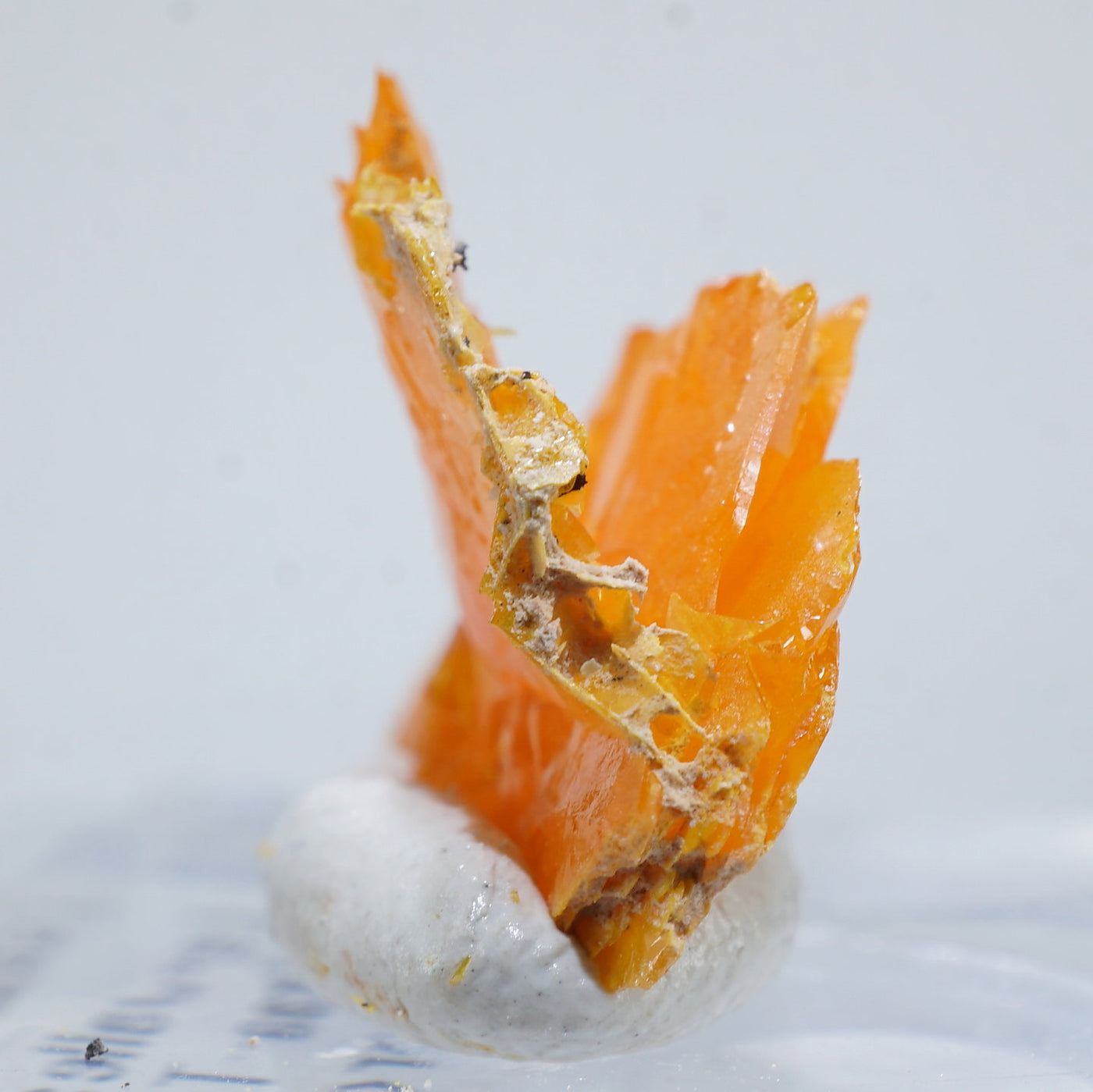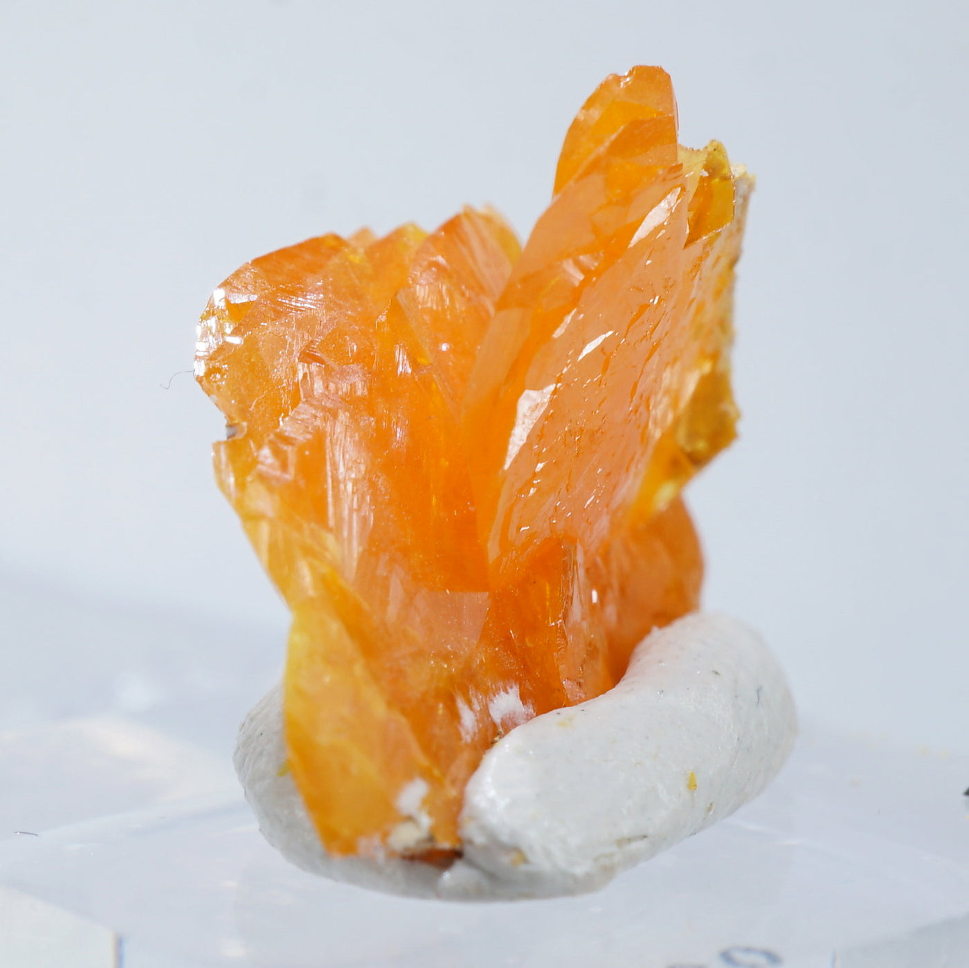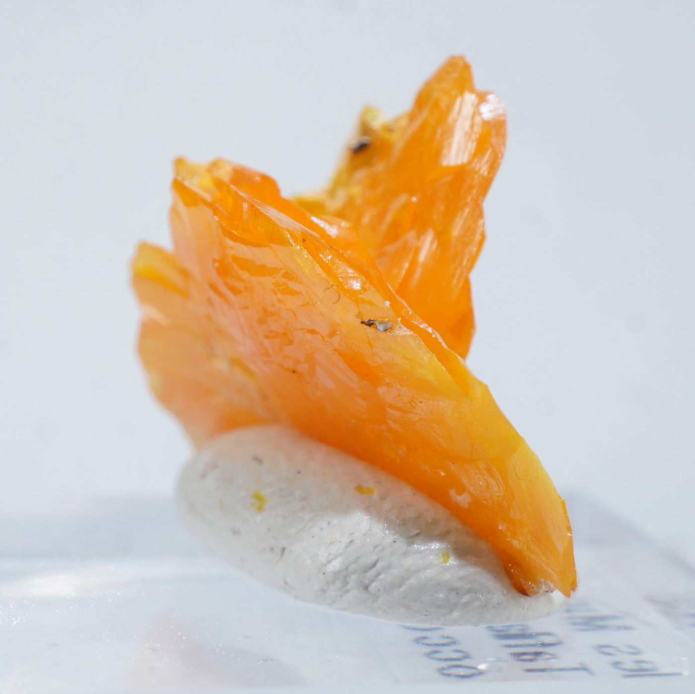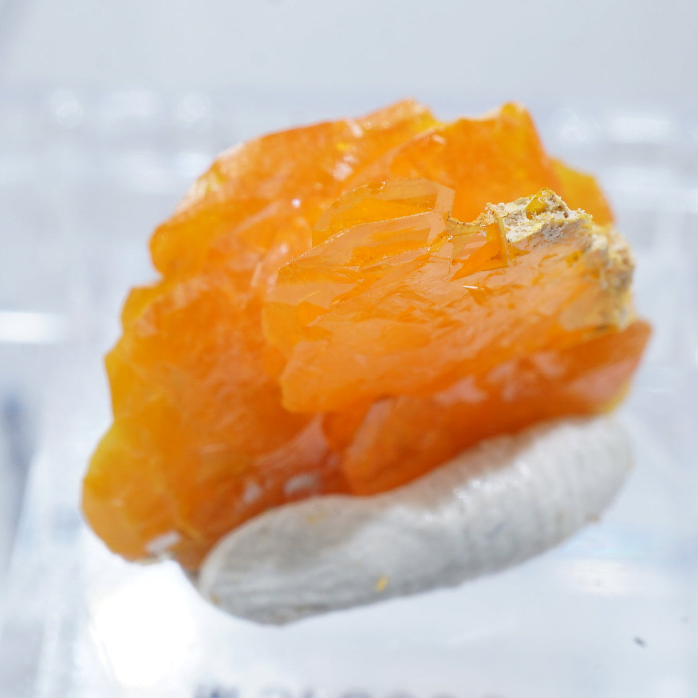 薄い板状の繊細な結晶と照りのある鮮やかなオレンジ色が特徴です。