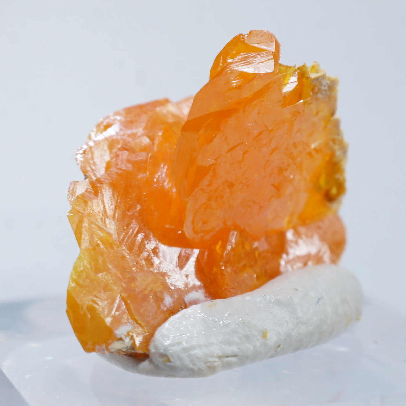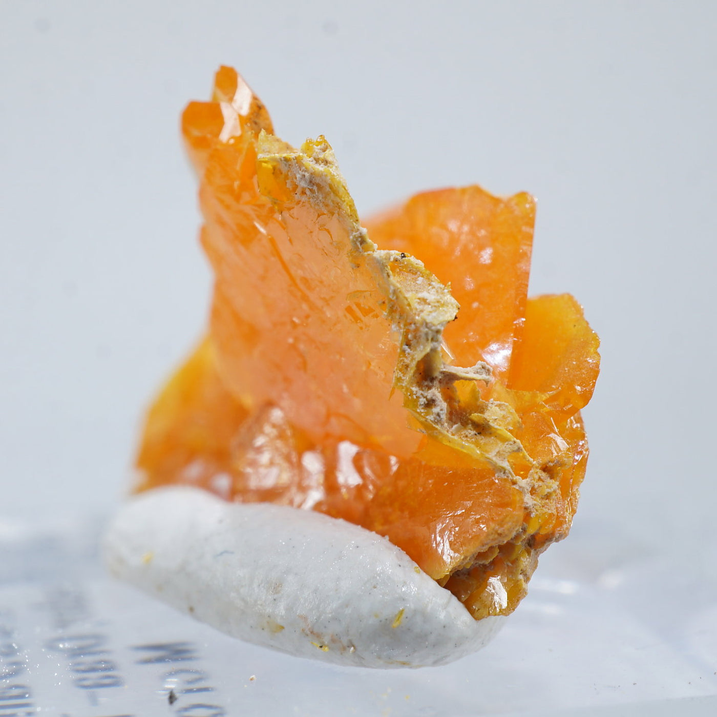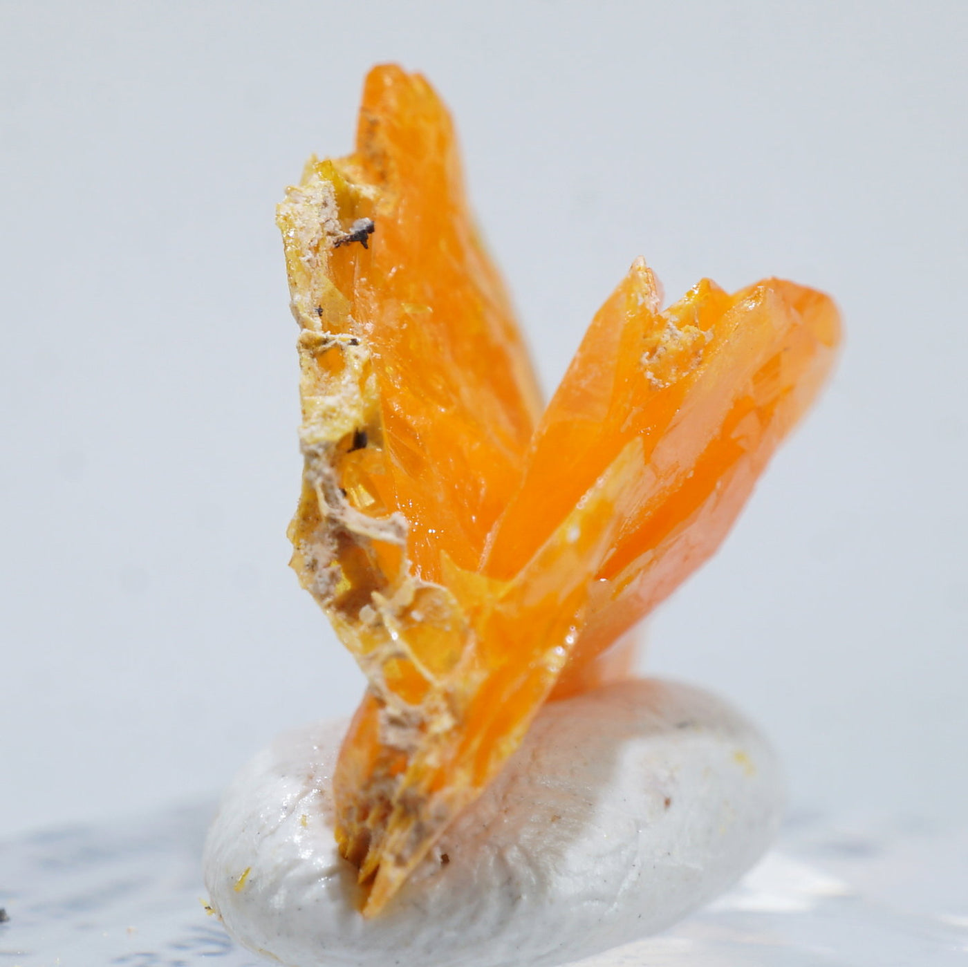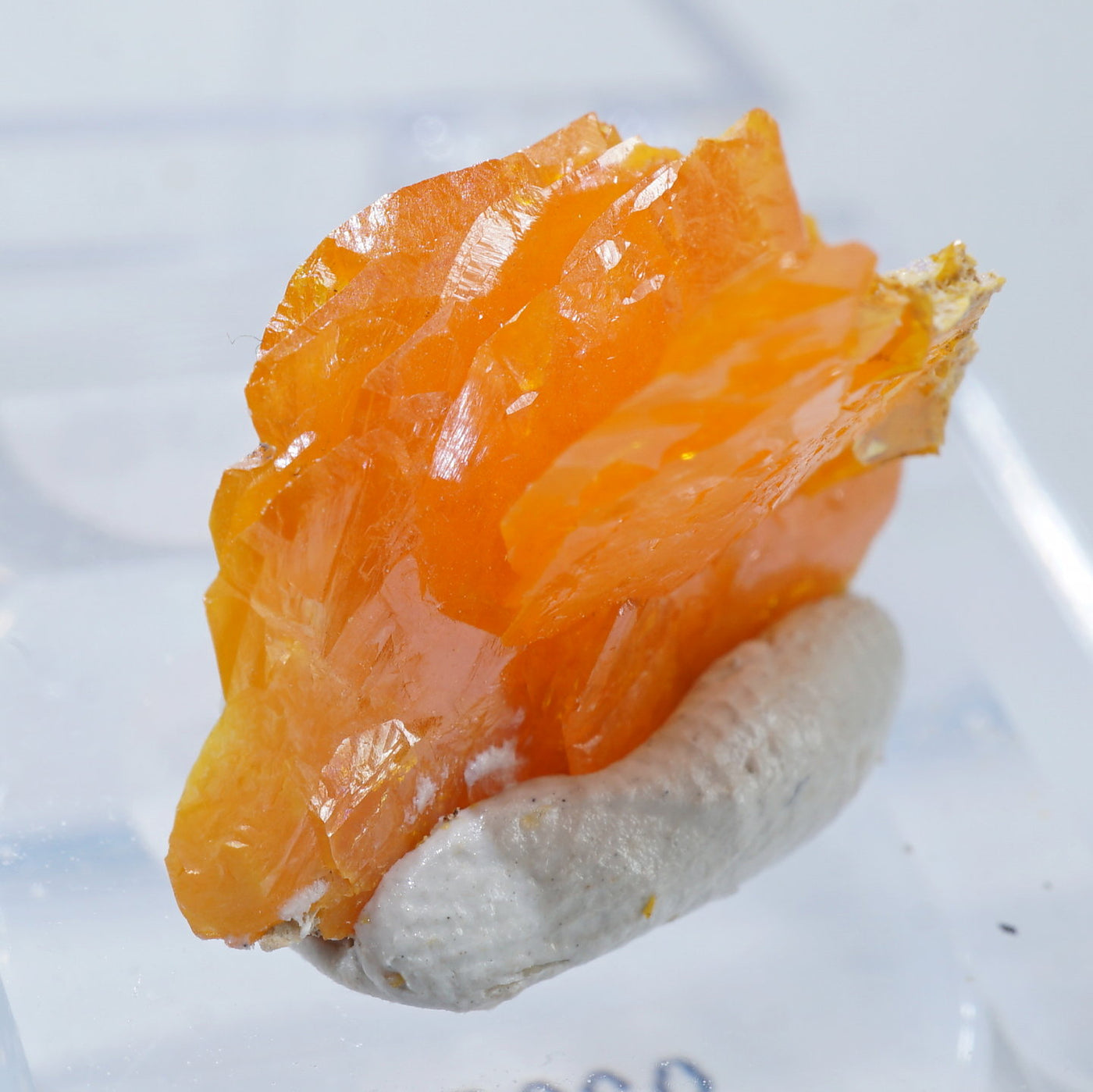 薄い板状の繊細な結晶と照りのある鮮やかなオレンジ色が特徴です。