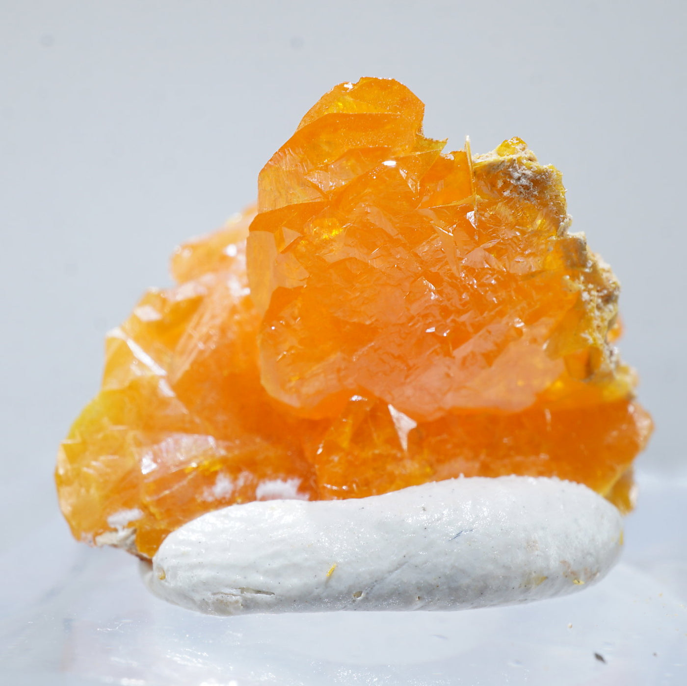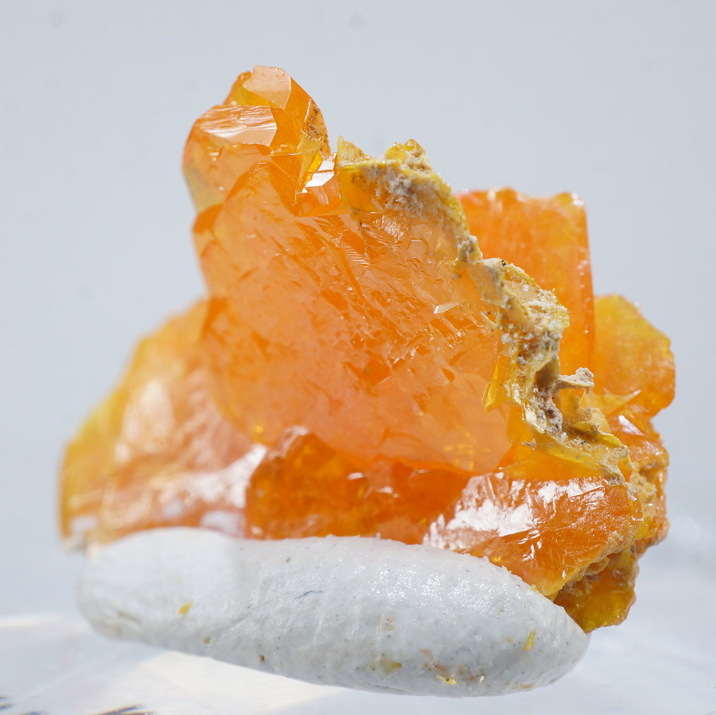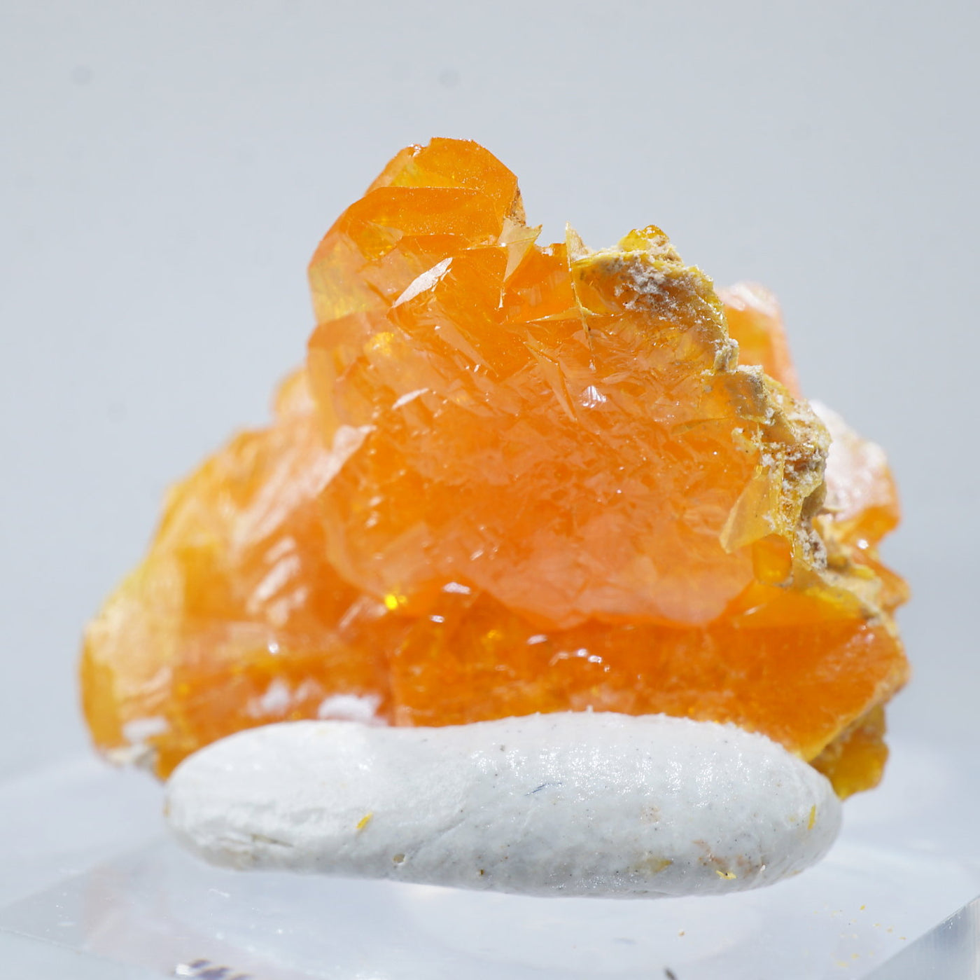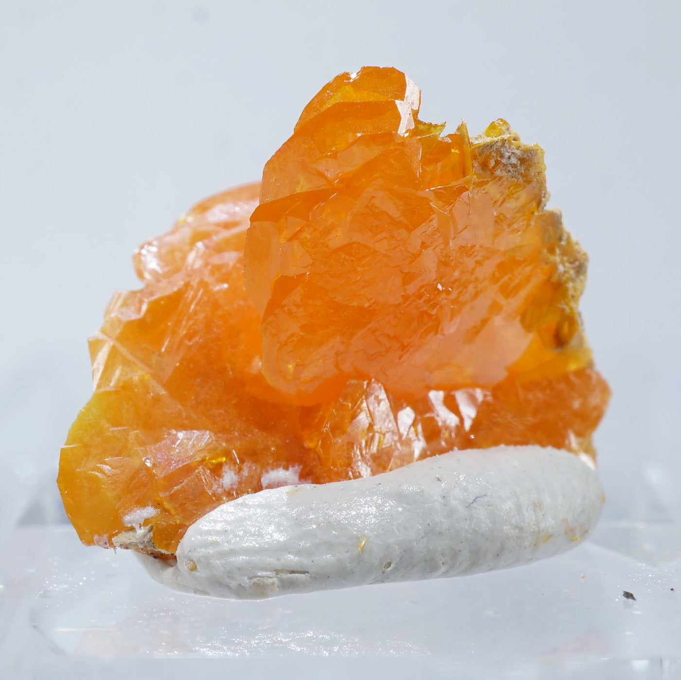 薄い板状の繊細な結晶と照りのある鮮やかなオレンジ色が特徴です。