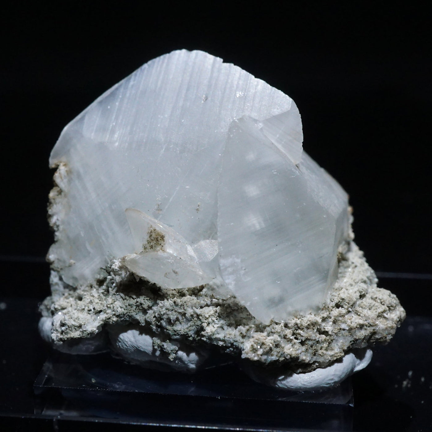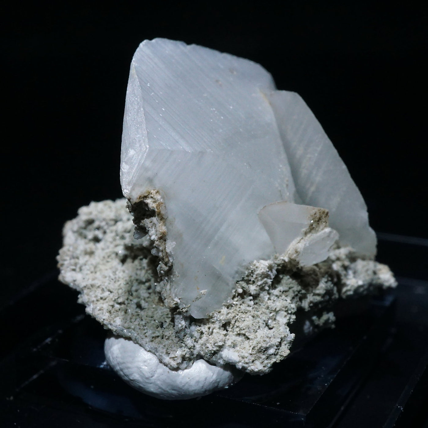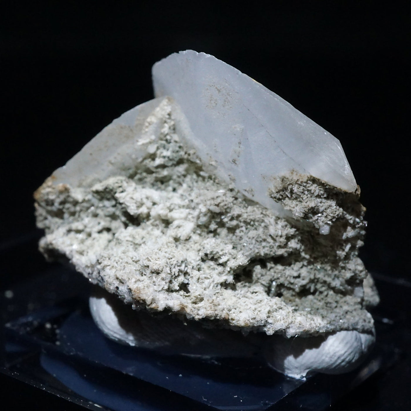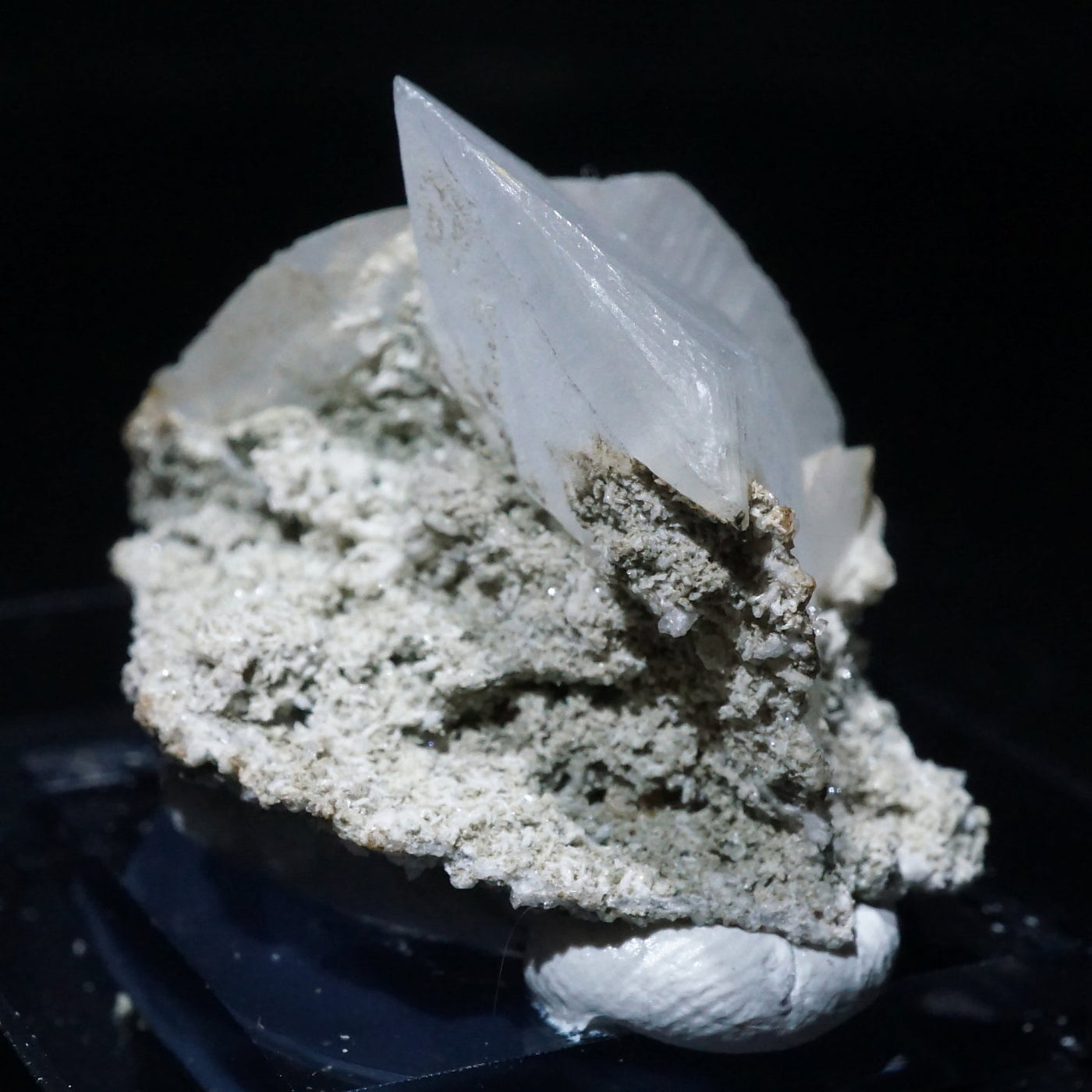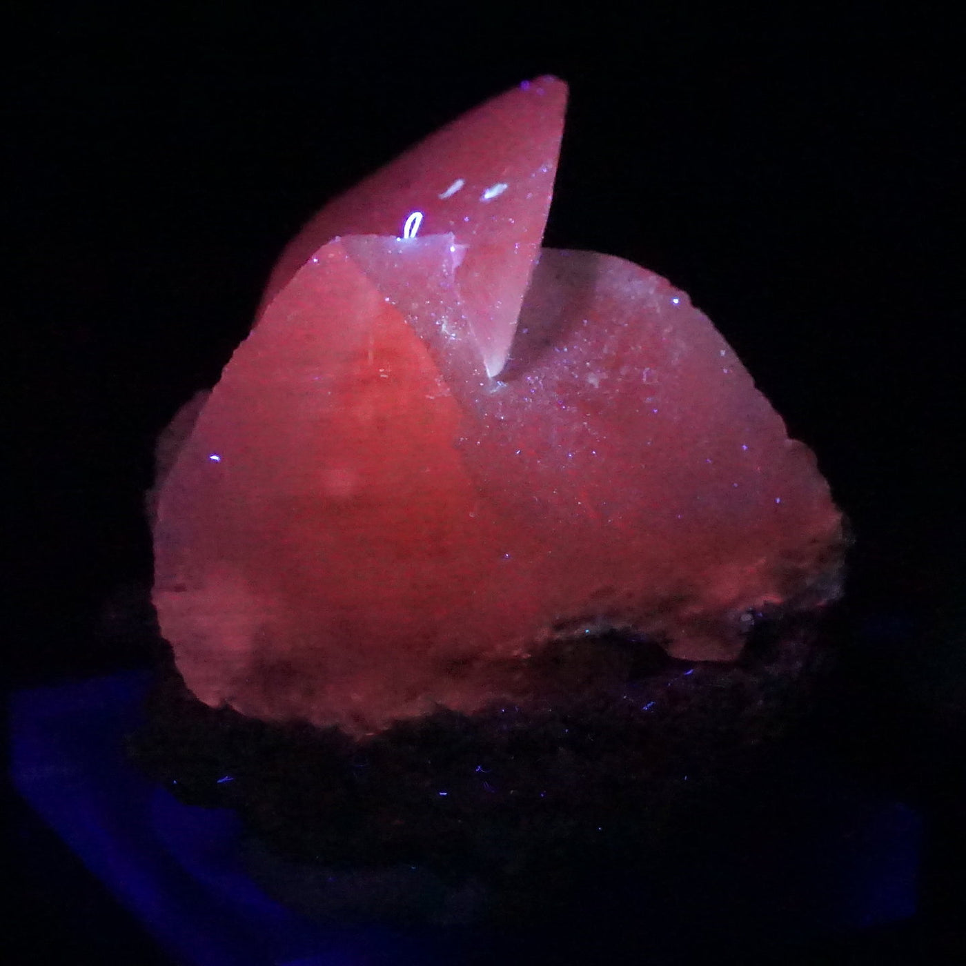 乳白色のシャープな結晶は紫外線を当てると鮮やかなピンク色に蛍光し別の表情を見せてくれます。