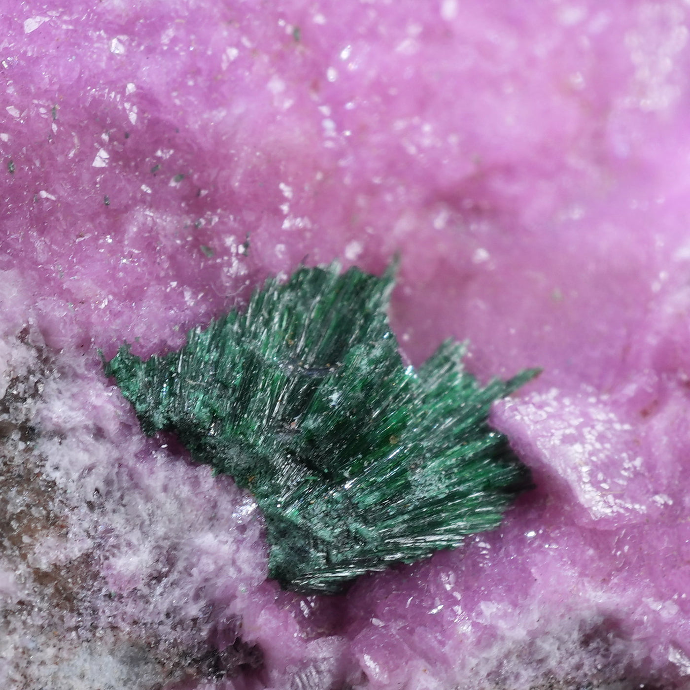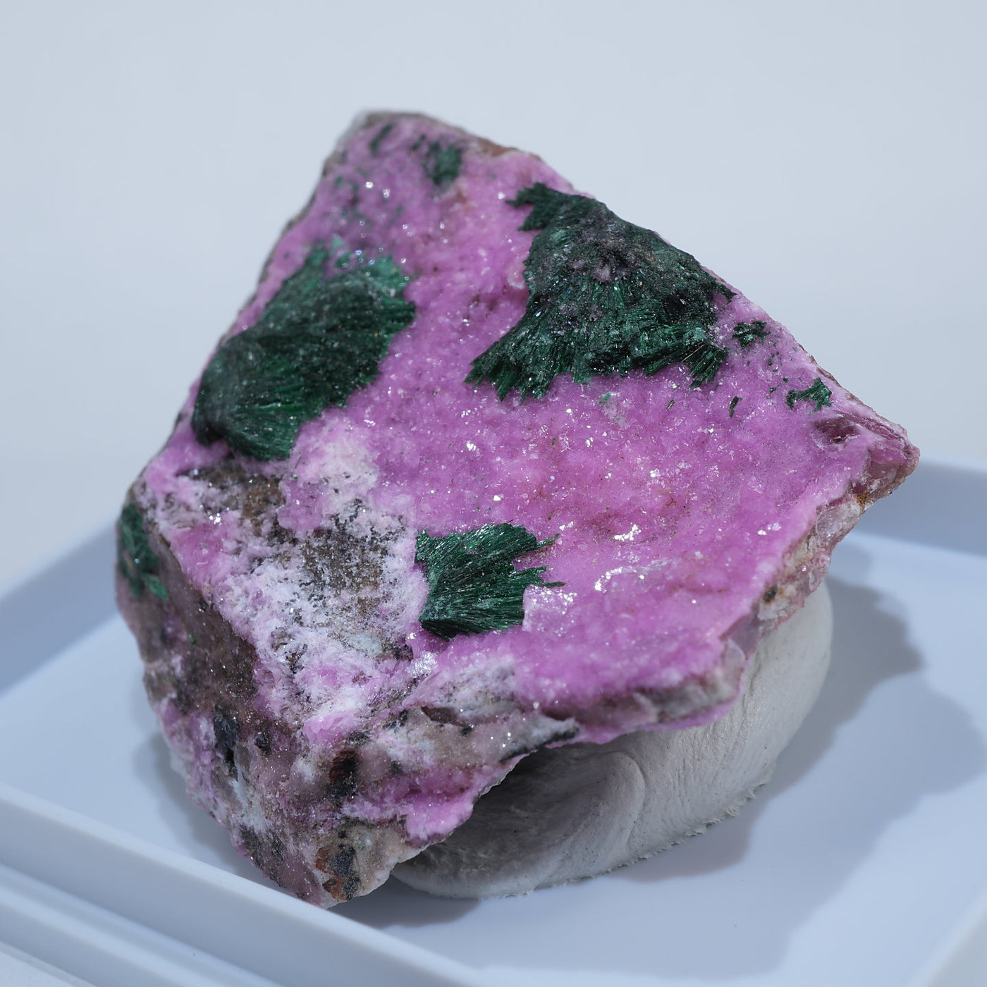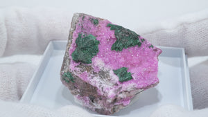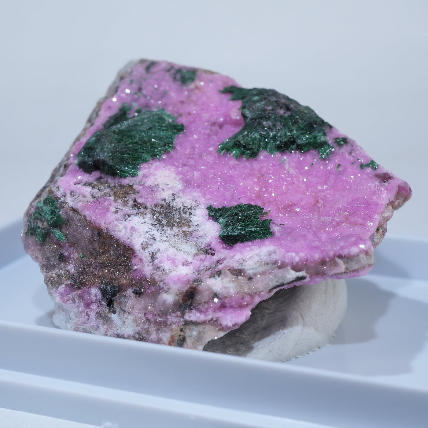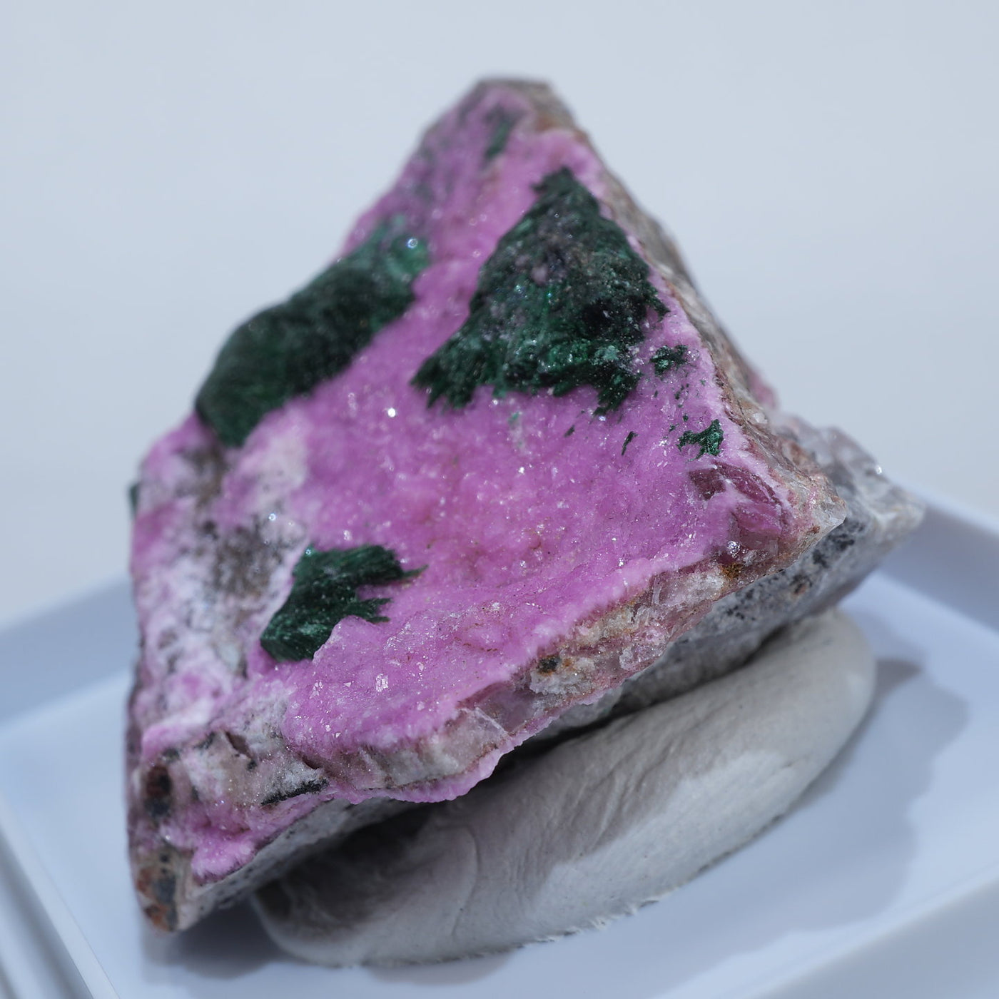 コンゴ民主共和国産のコバルトカルサイトです。紫がかったピンクが色鮮やかで、キラキラと輝く美しい標本です。マラカイトの共生も魅力です。【産地】コンゴ民主共和国 (DR Congo)