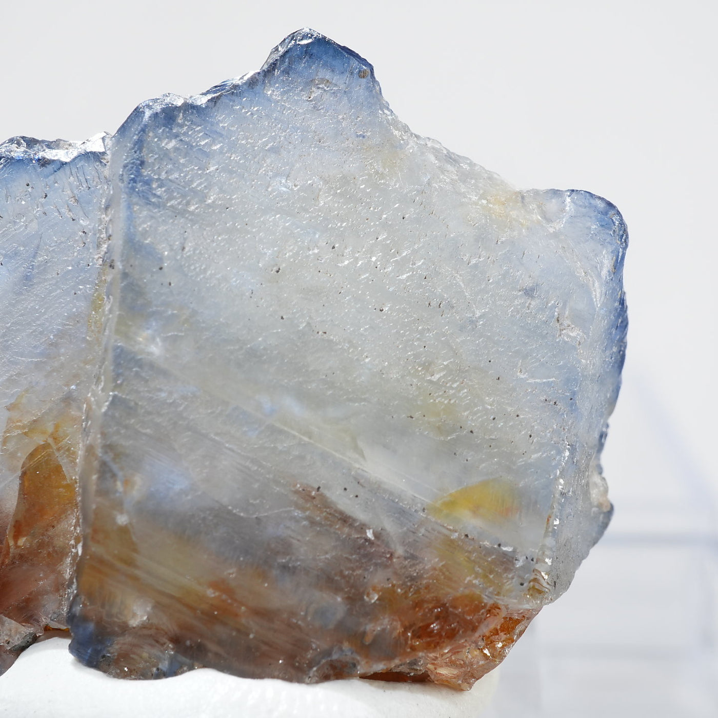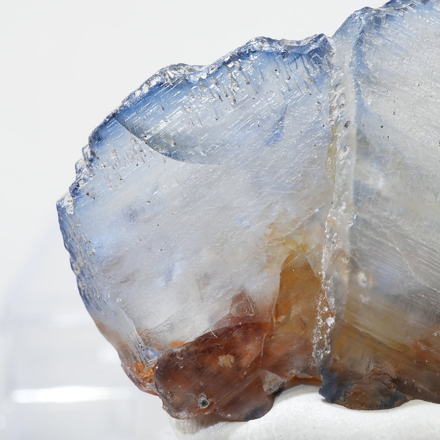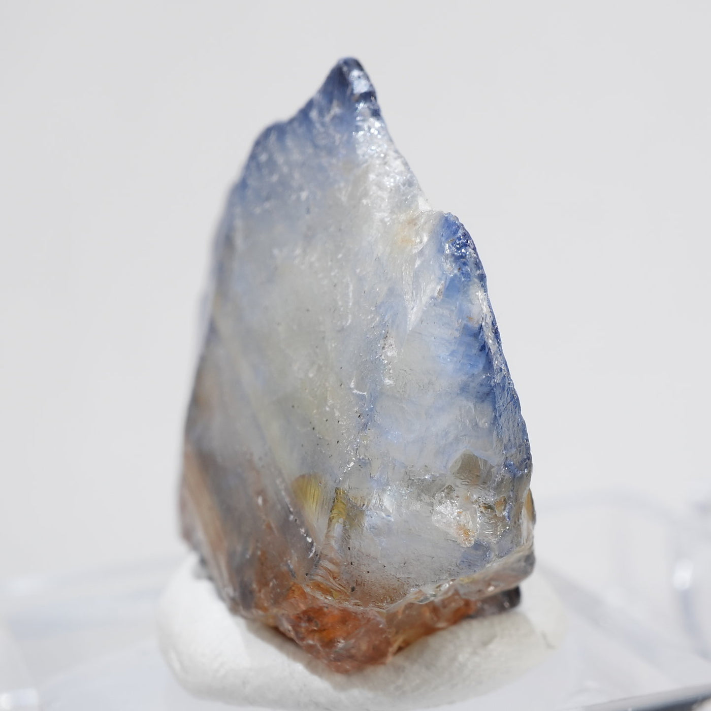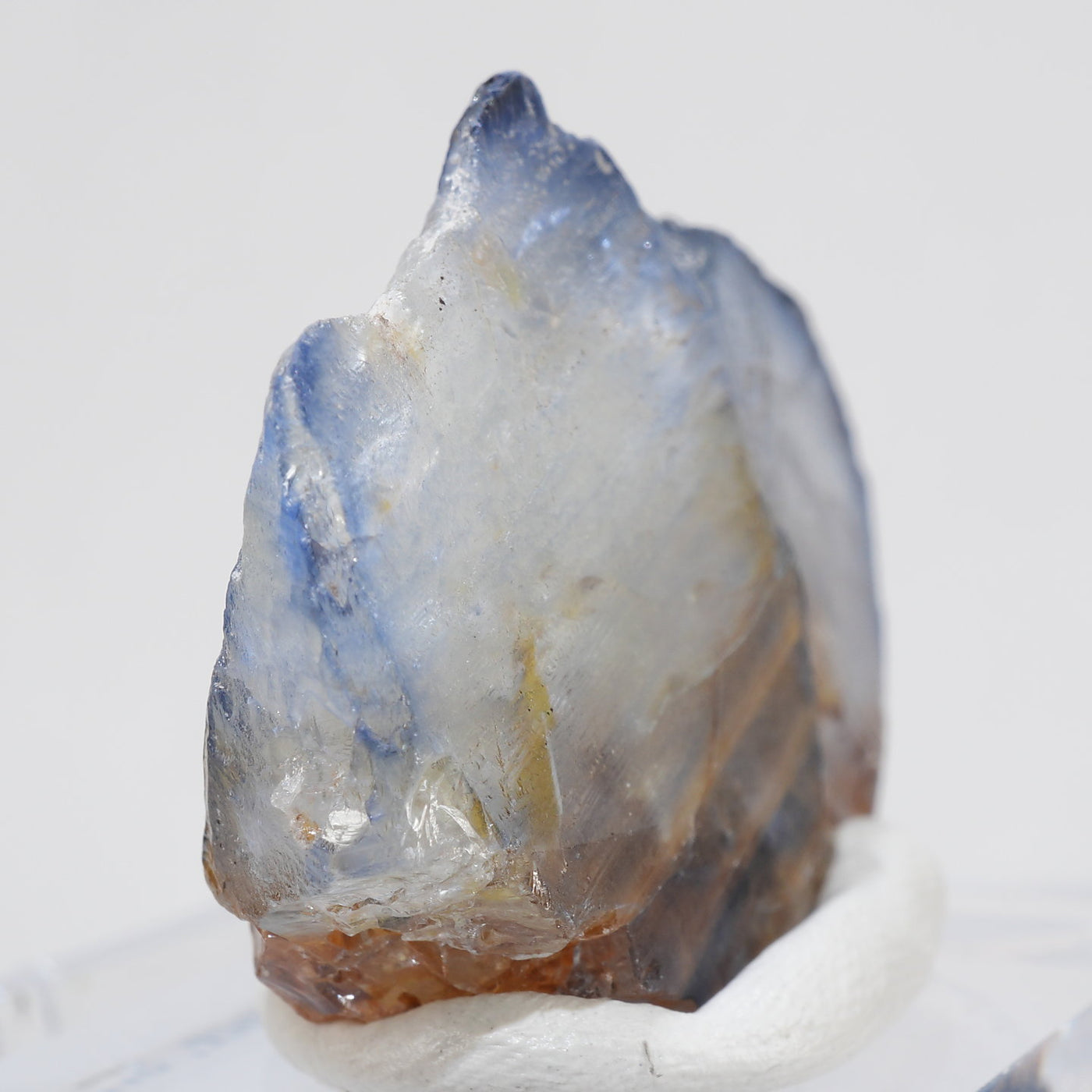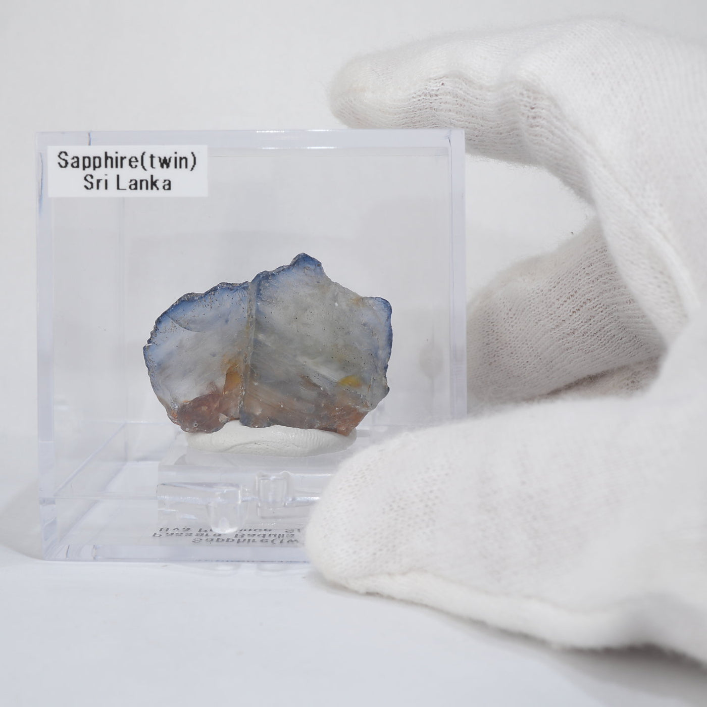 スリランカ産のSapphire(twin)です。コランダムの中で赤色のものをルビー、それ以外の色のものをサファイアと呼び分けられていますが、こちらは淡いブルーのサファイアです。紫外線ライトを鮮やかなオレンジ色に蛍光する特徴があります。※撮影に使用しているライトは、紫外線ライト365nm5wタイプです。