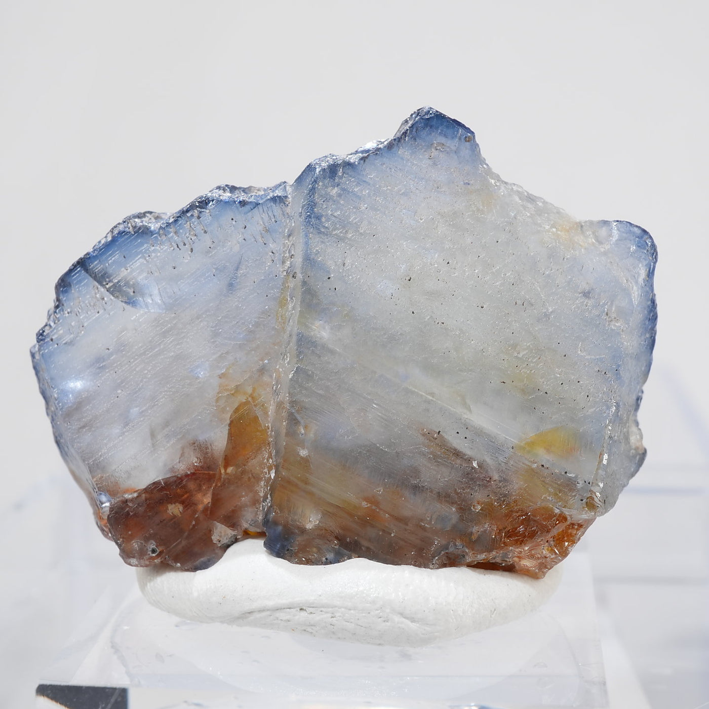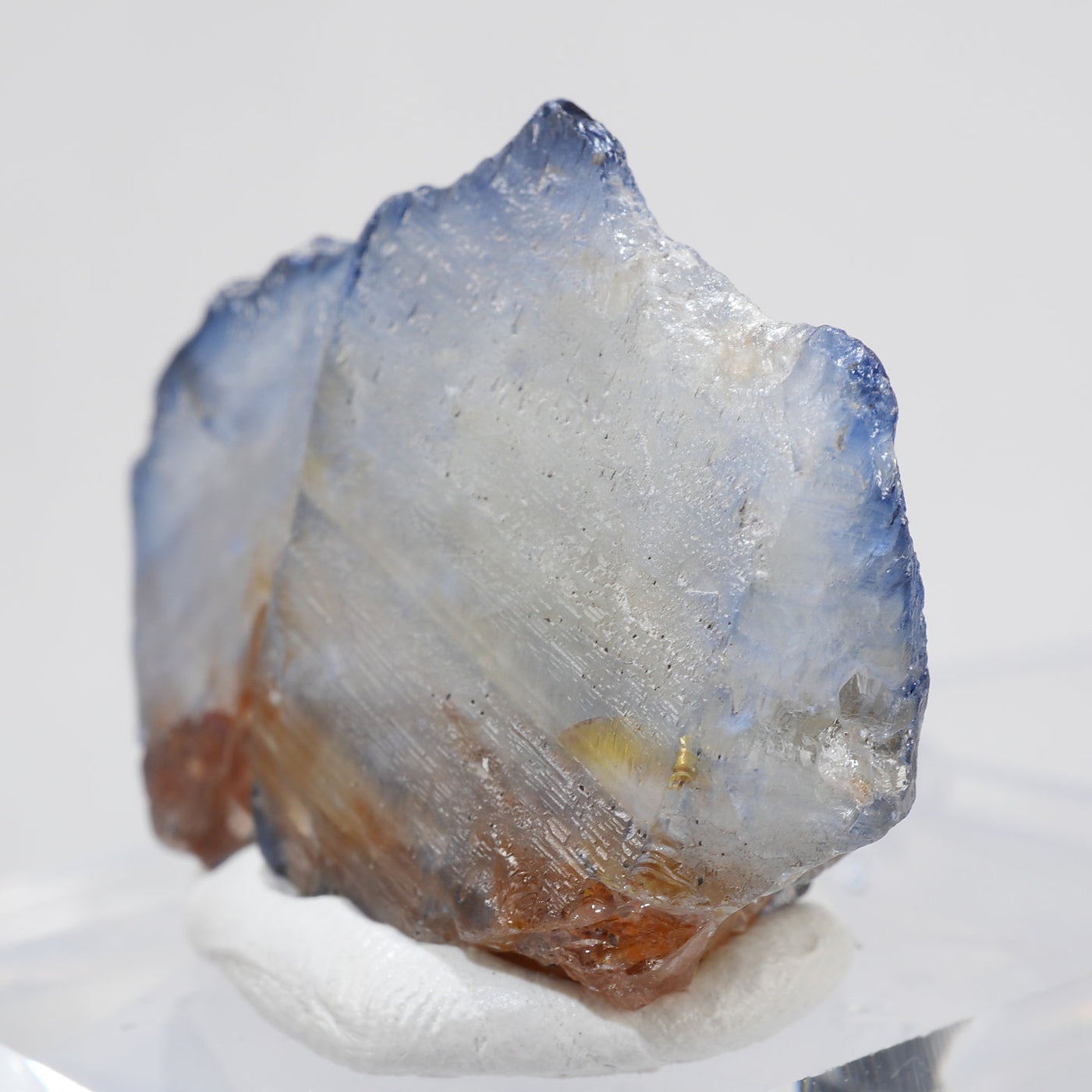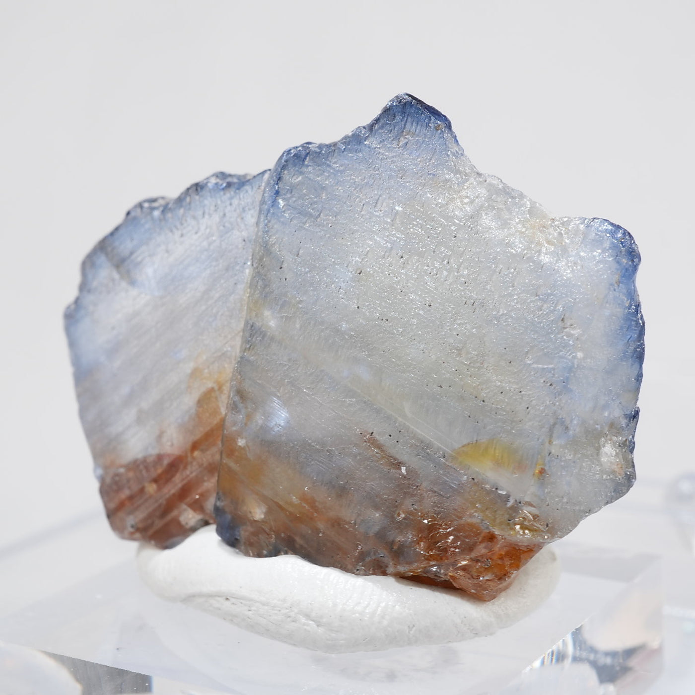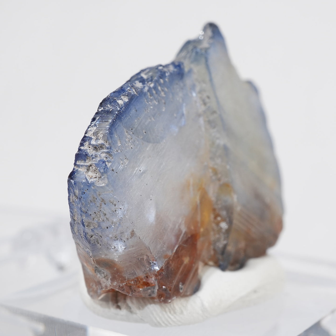 スリランカ産のSapphire(twin)です。コランダムの中で赤色のものをルビー、それ以外の色のものをサファイアと呼び分けられていますが、こちらは淡いブルーのサファイアです。紫外線ライトを鮮やかなオレンジ色に蛍光する特徴があります。※撮影に使用しているライトは、紫外線ライト365nm5wタイプです。