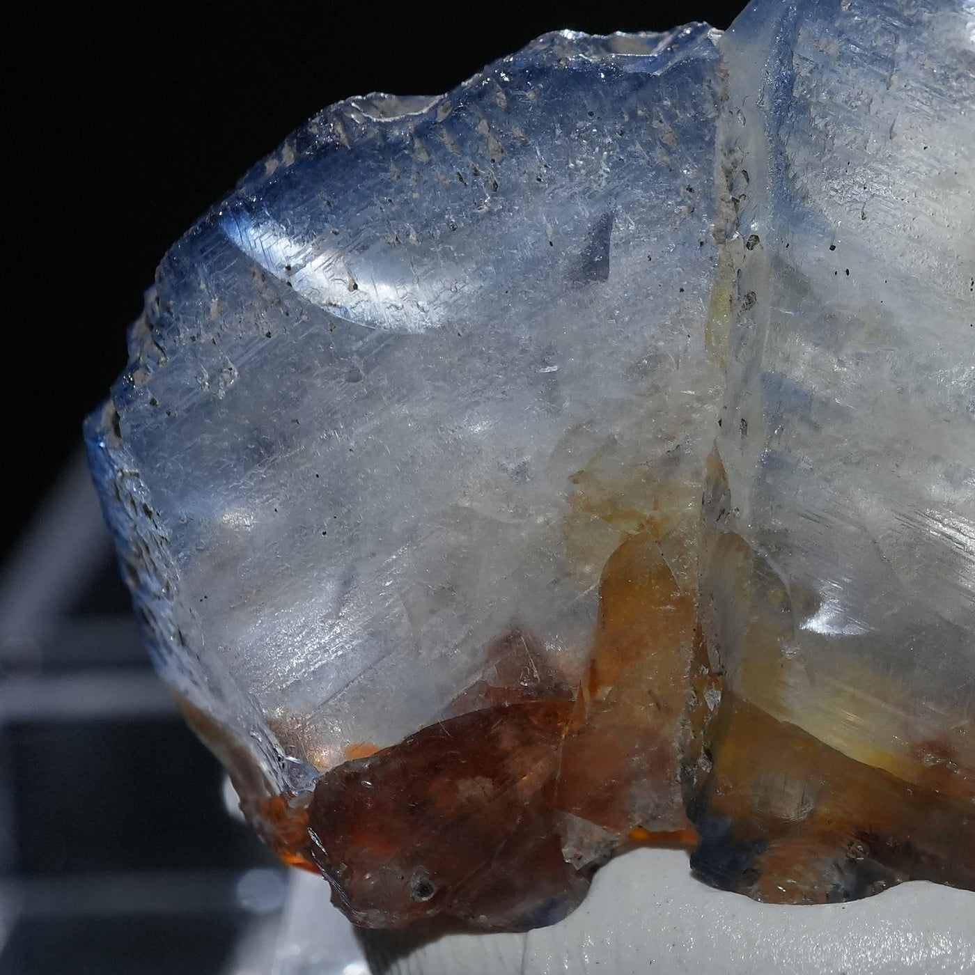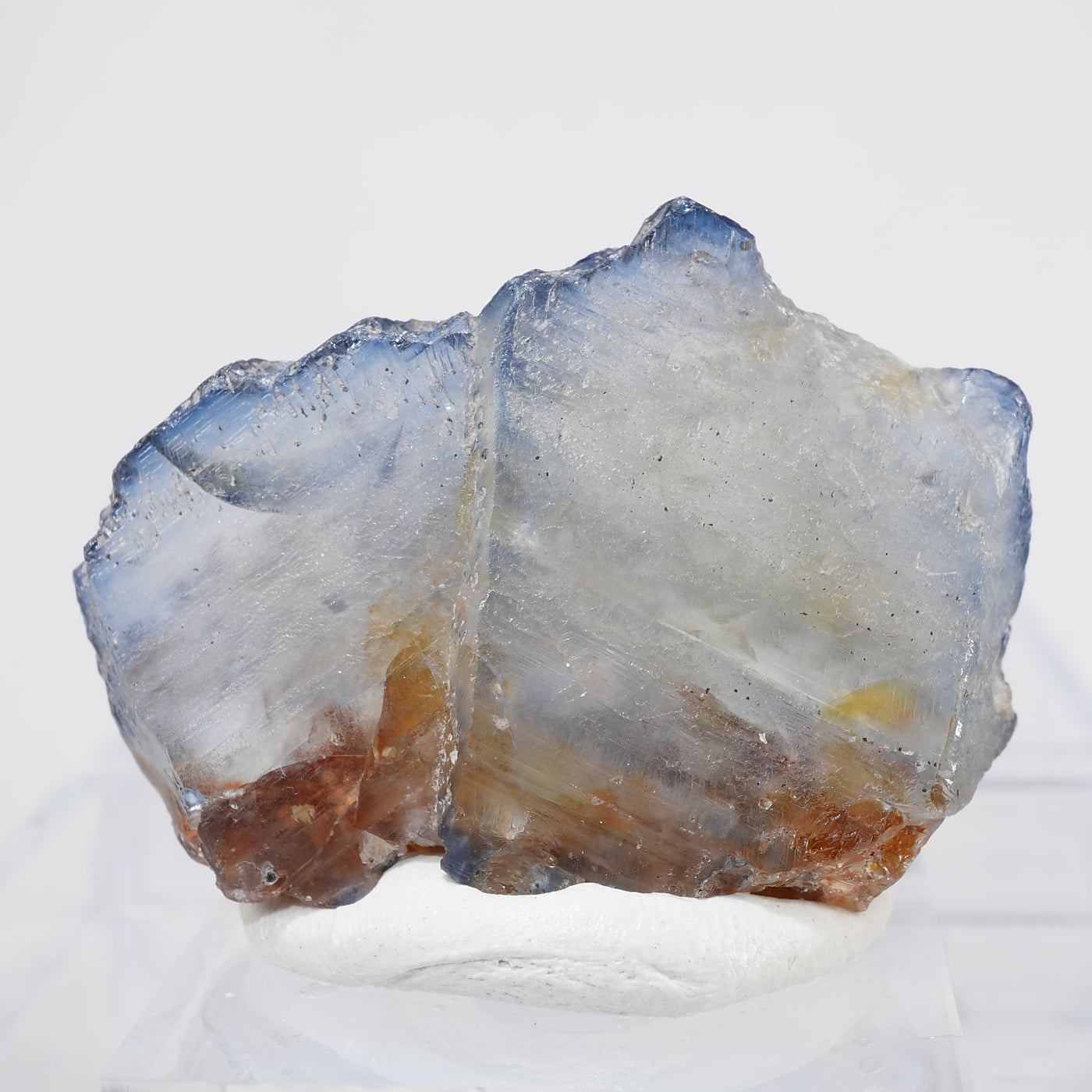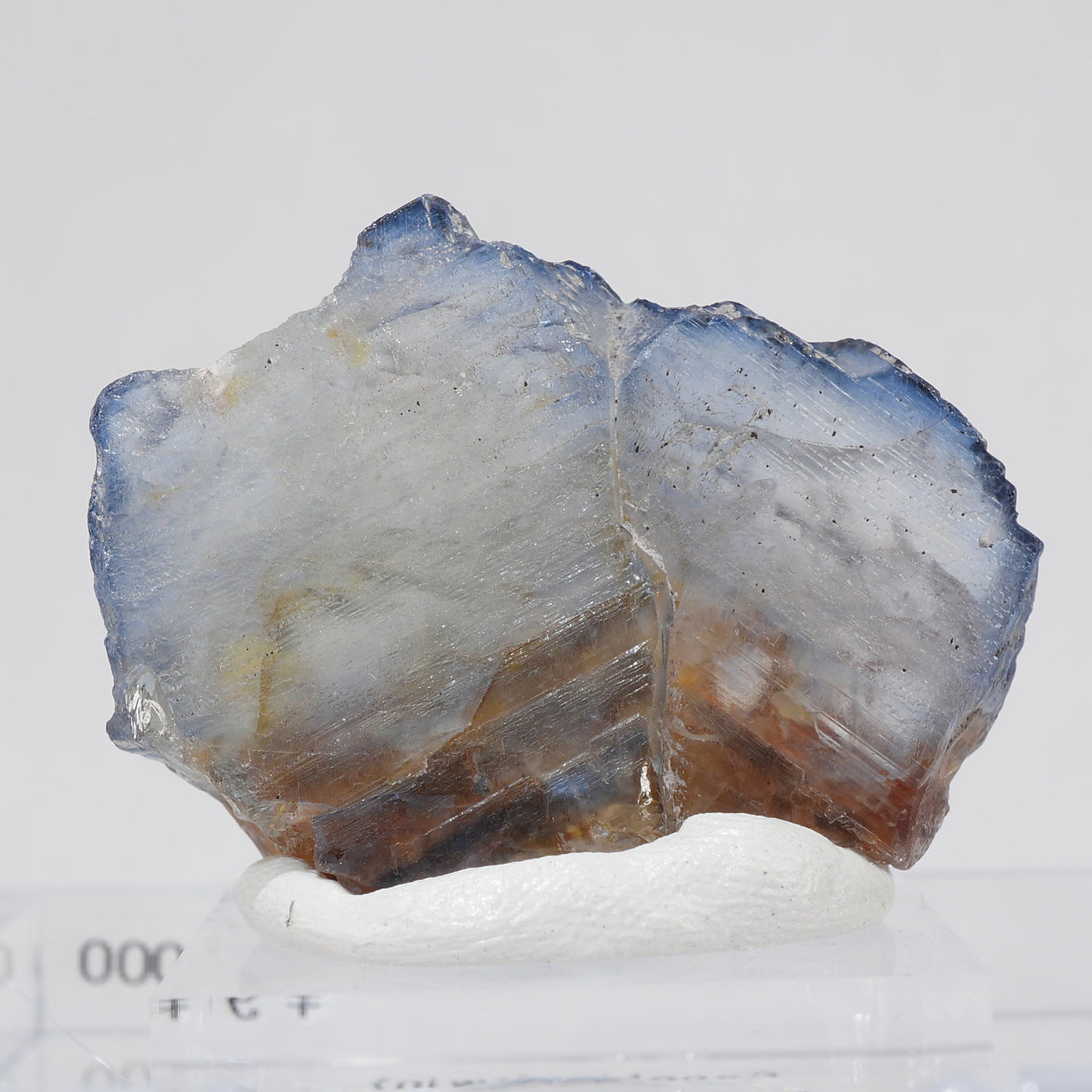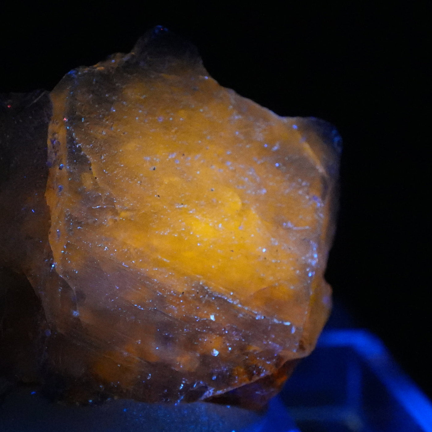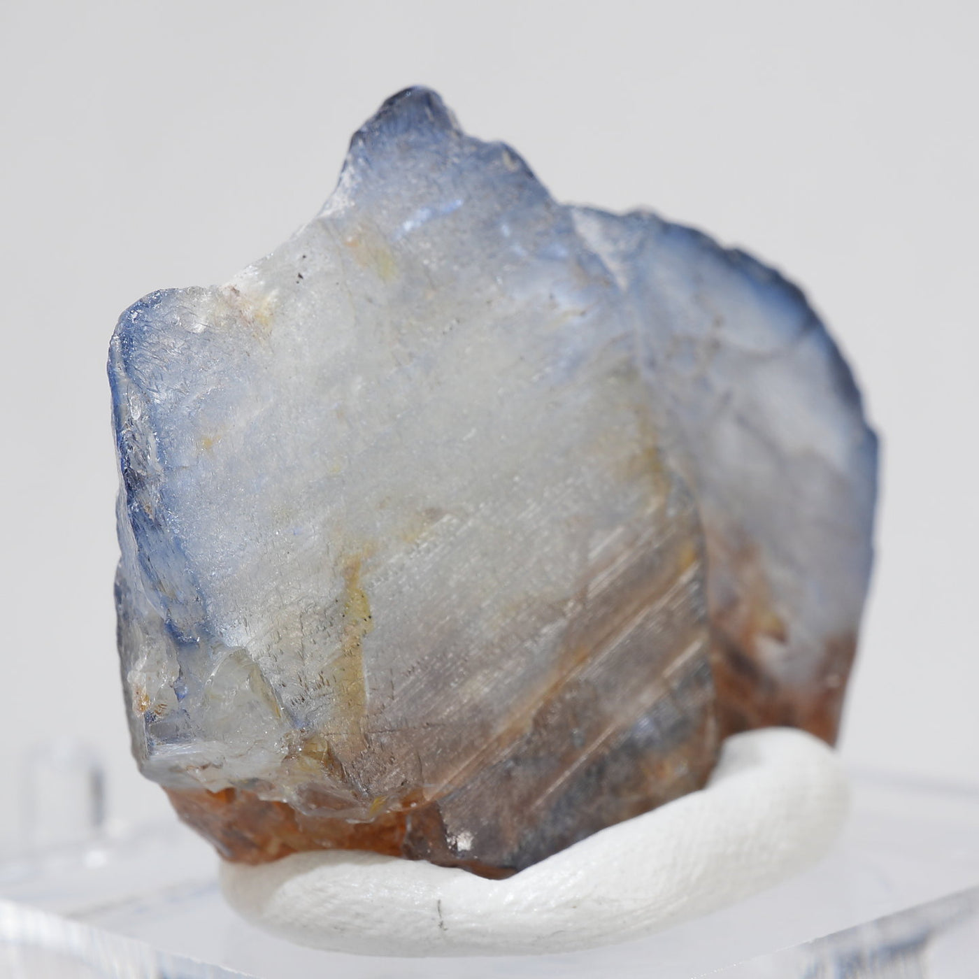 スリランカ産のSapphire(twin)です。コランダムの中で赤色のものをルビー、それ以外の色のものをサファイアと呼び分けられていますが、こちらは淡いブルーのサファイアです。紫外線ライトを鮮やかなオレンジ色に蛍光する特徴があります。※撮影に使用しているライトは、紫外線ライト365nm5wタイプです。