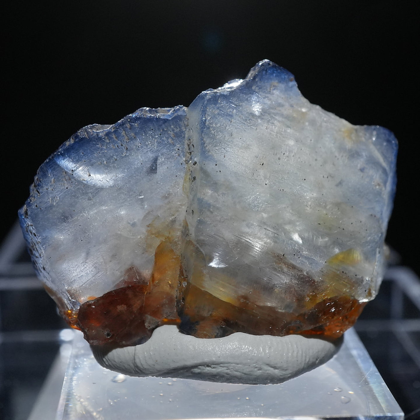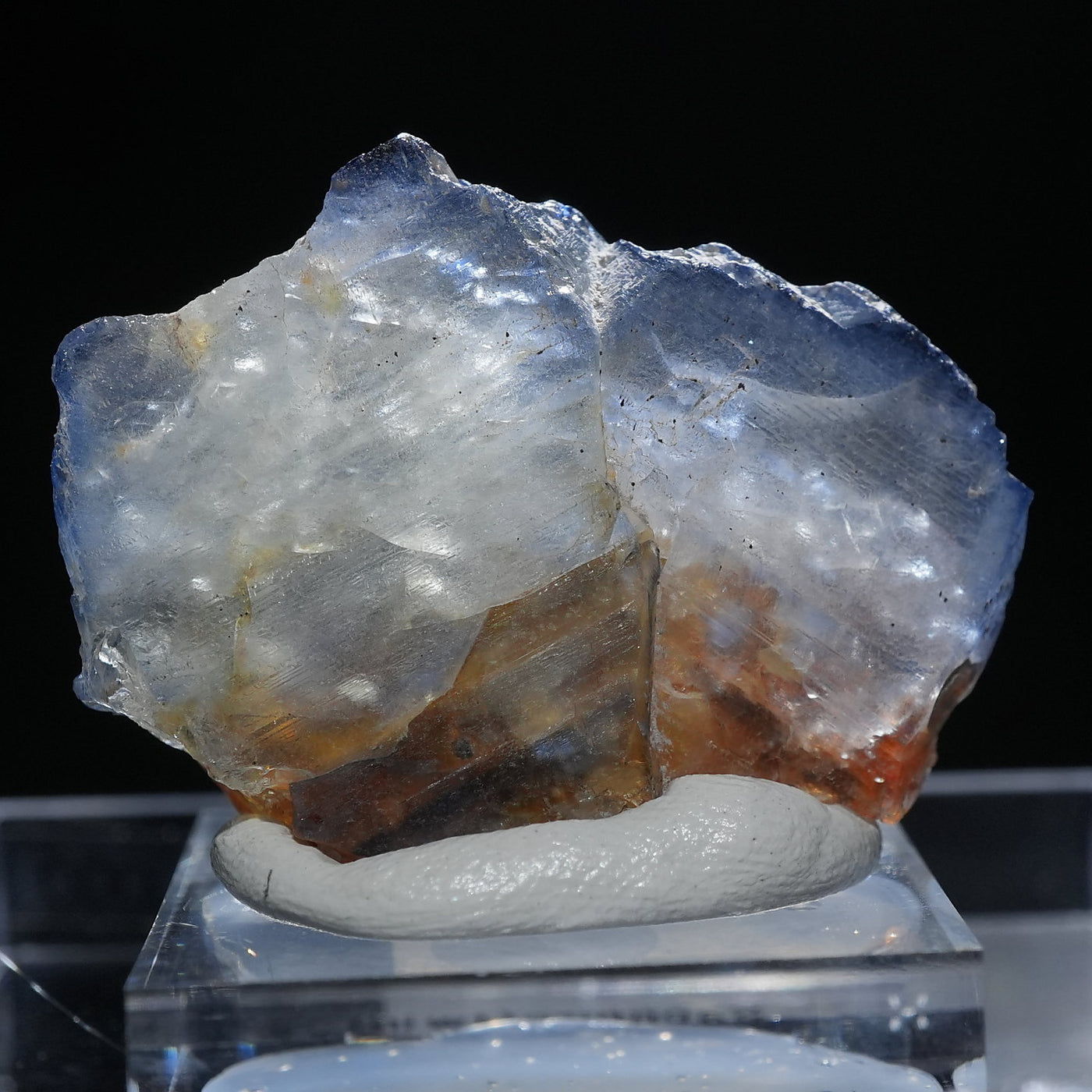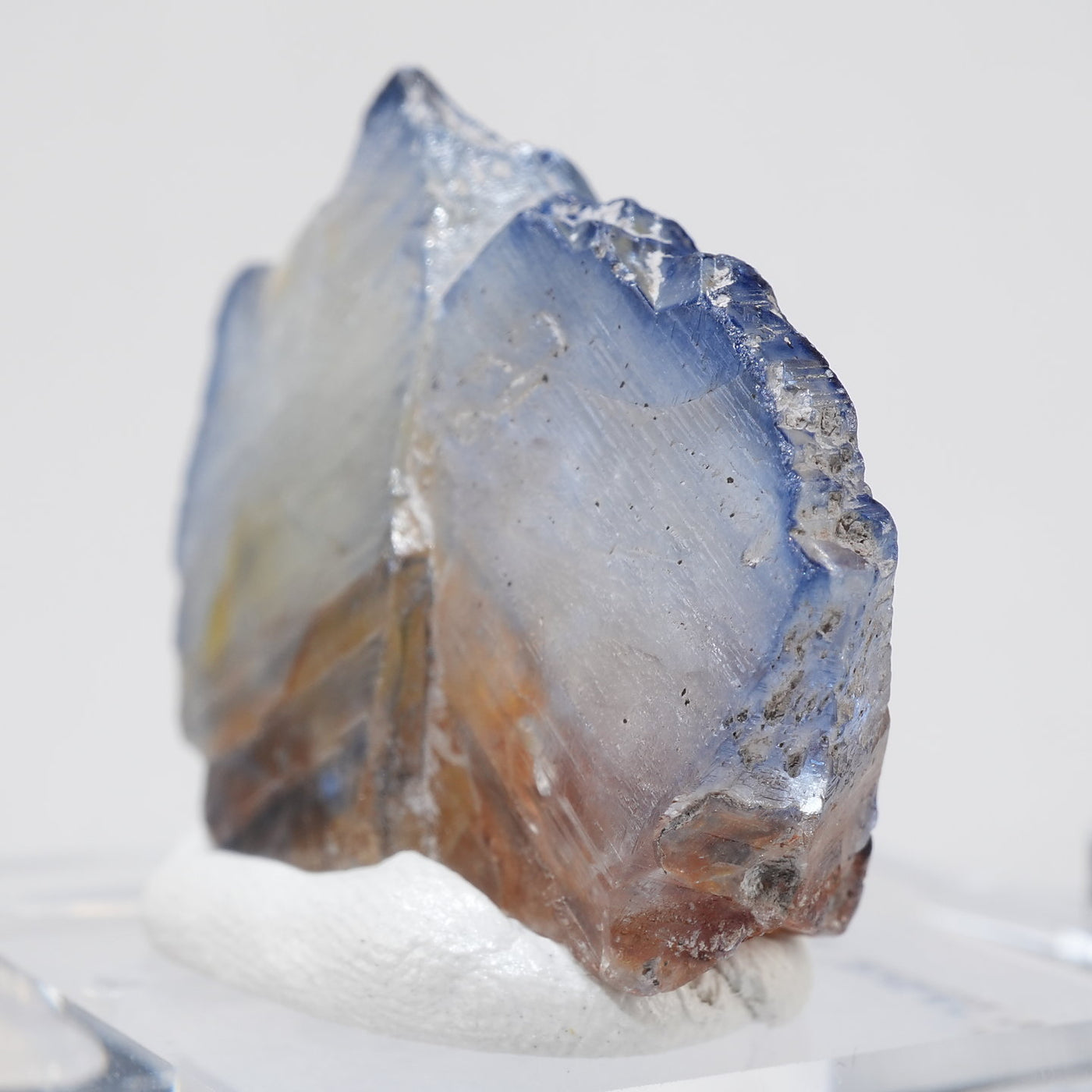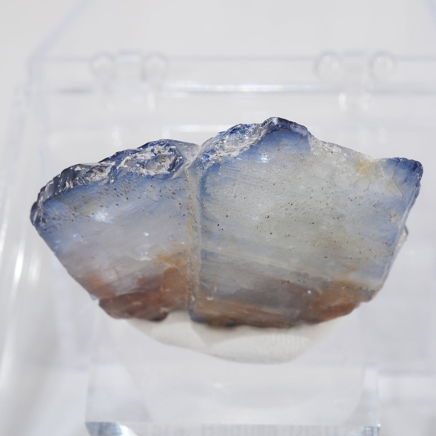 スリランカ産のSapphire(twin)です。コランダムの中で赤色のものをルビー、それ以外の色のものをサファイアと呼び分けられていますが、こちらは淡いブルーのサファイアです。紫外線ライトを鮮やかなオレンジ色に蛍光する特徴があります。※撮影に使用しているライトは、紫外線ライト365nm5wタイプです。
