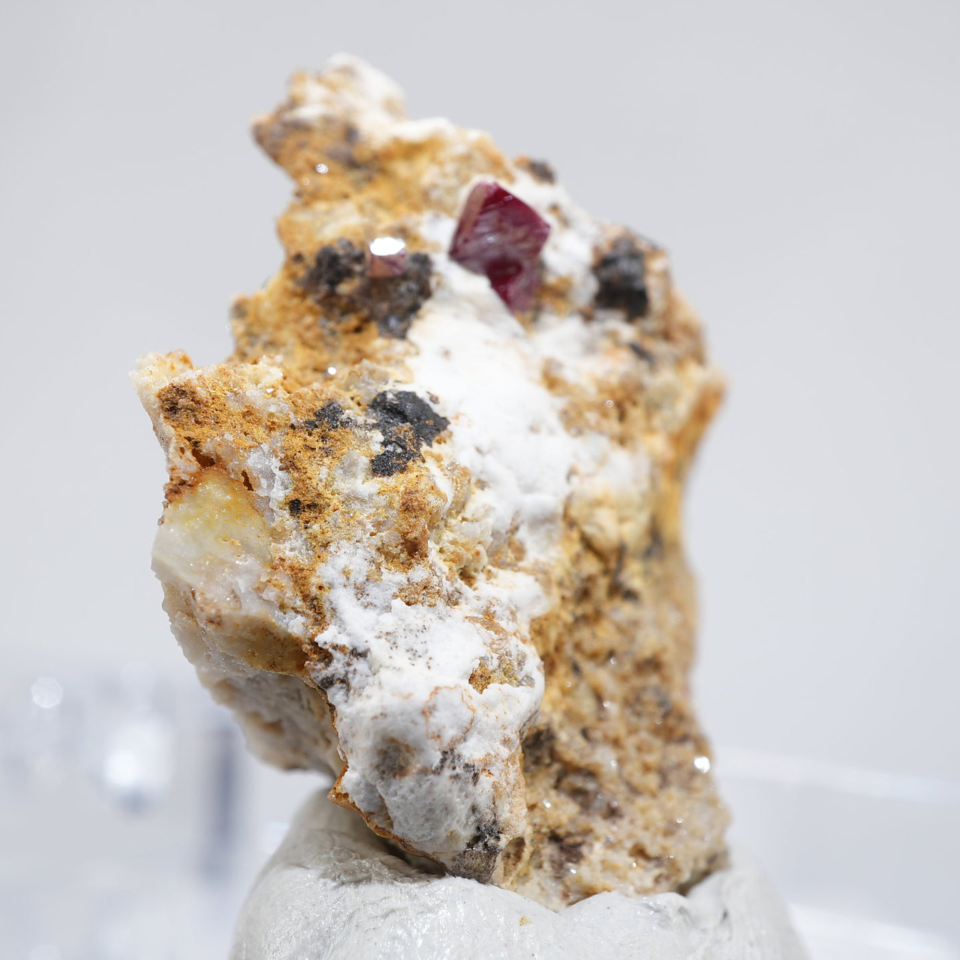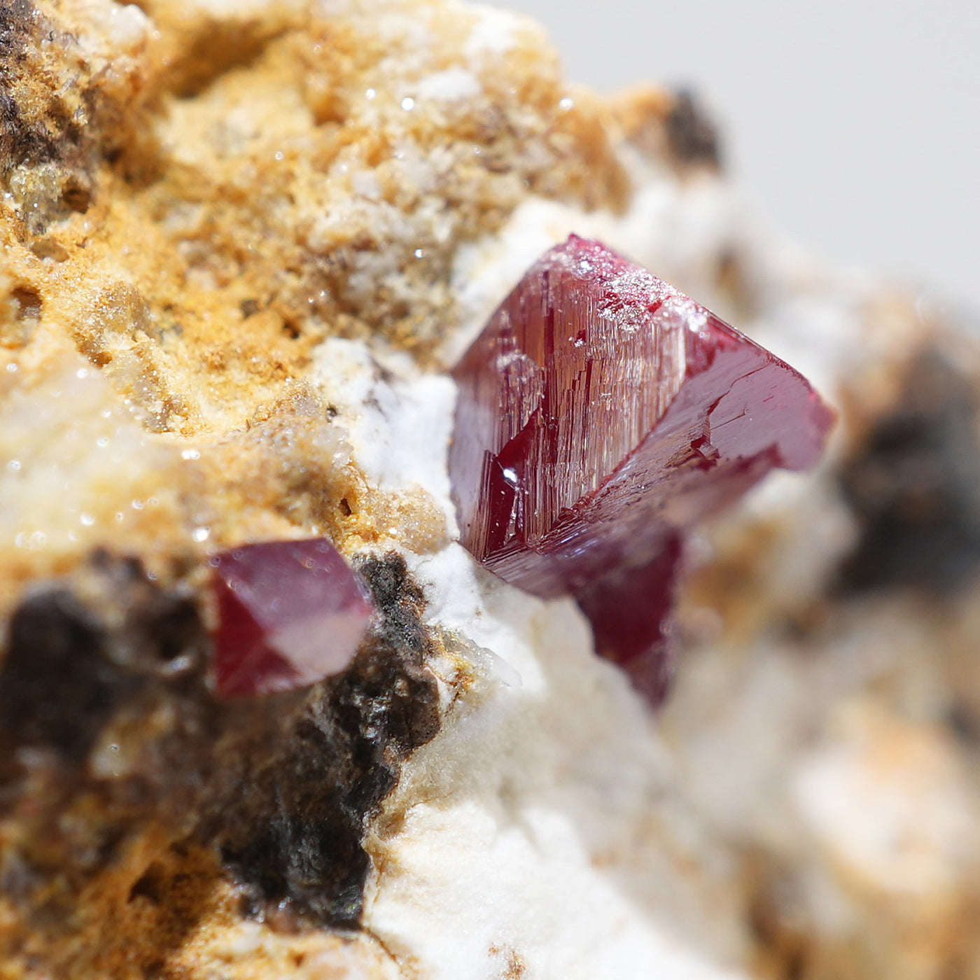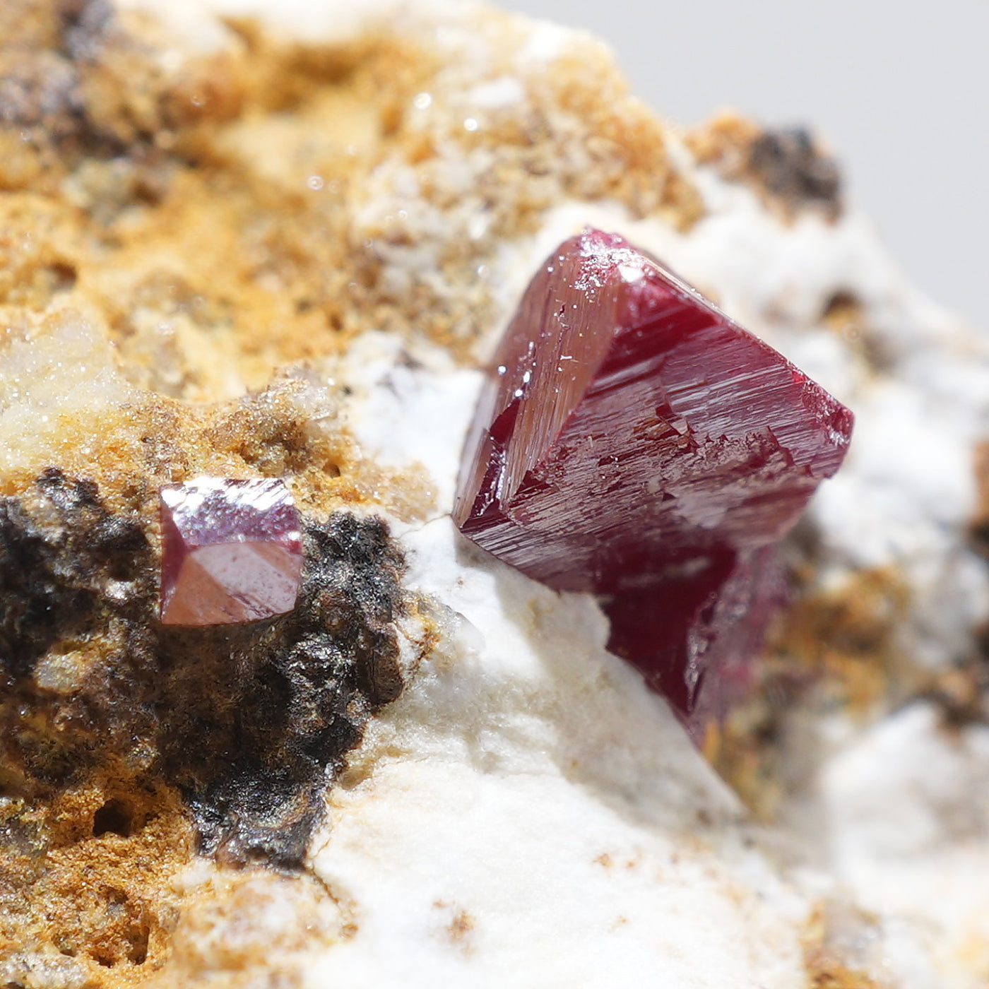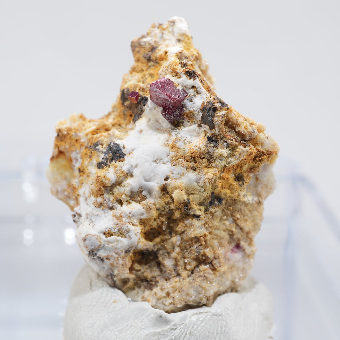 特徴的な鉛色~赤褐色の結晶が目を引く良質な標本です。希少な鉱物です。