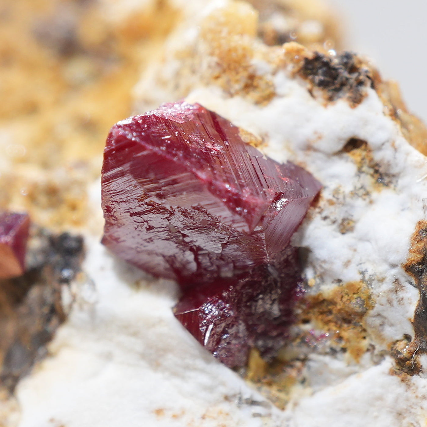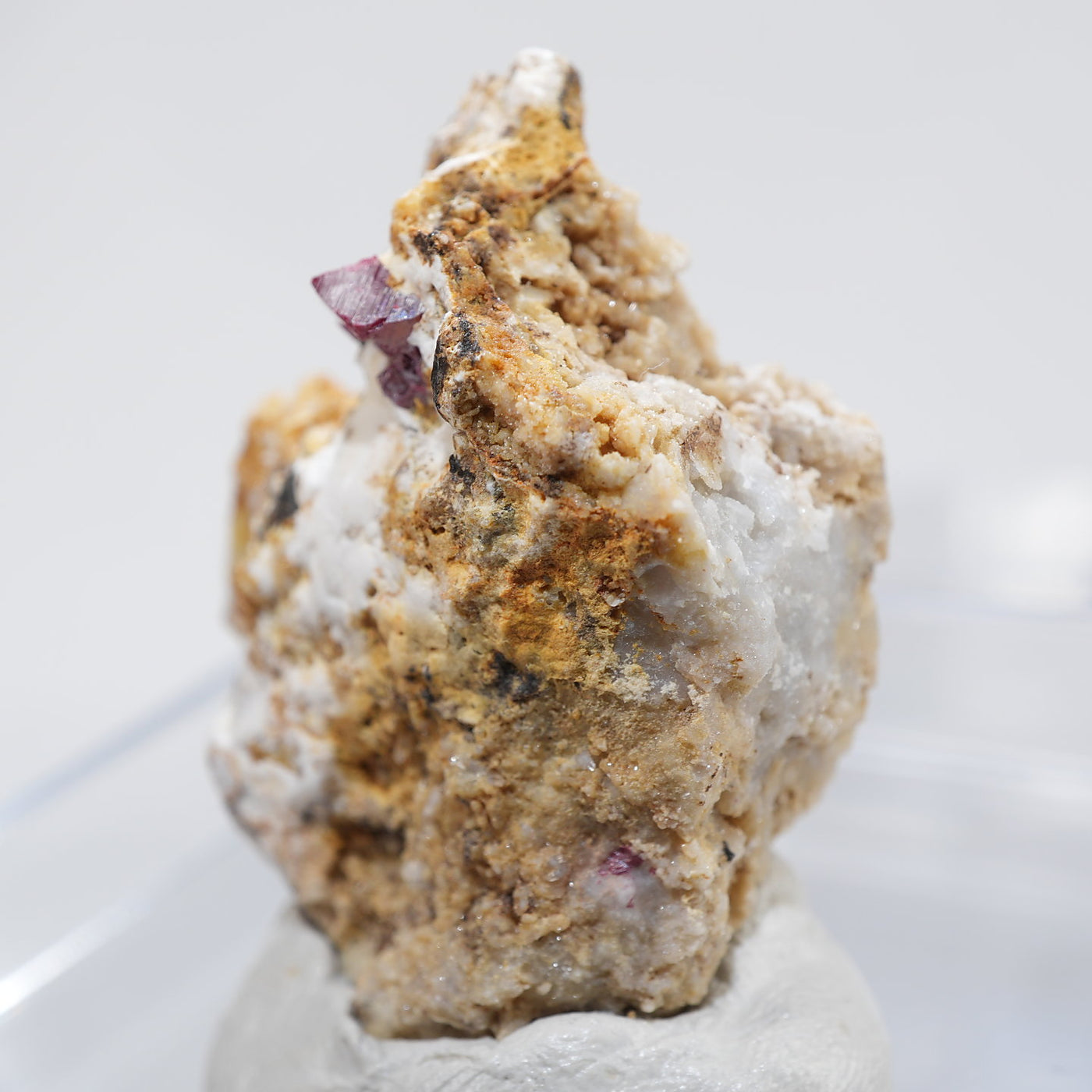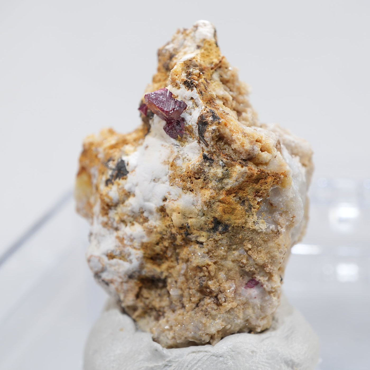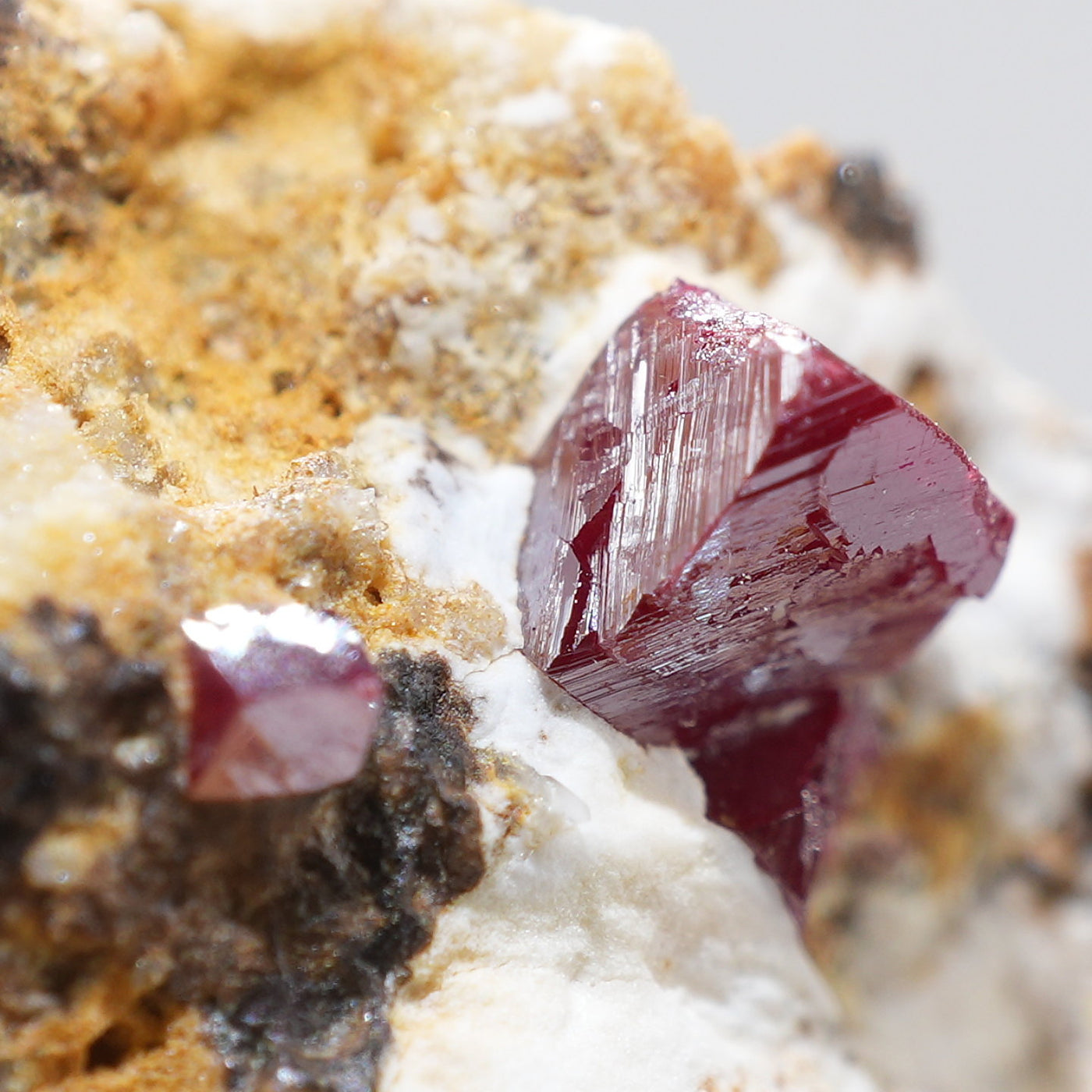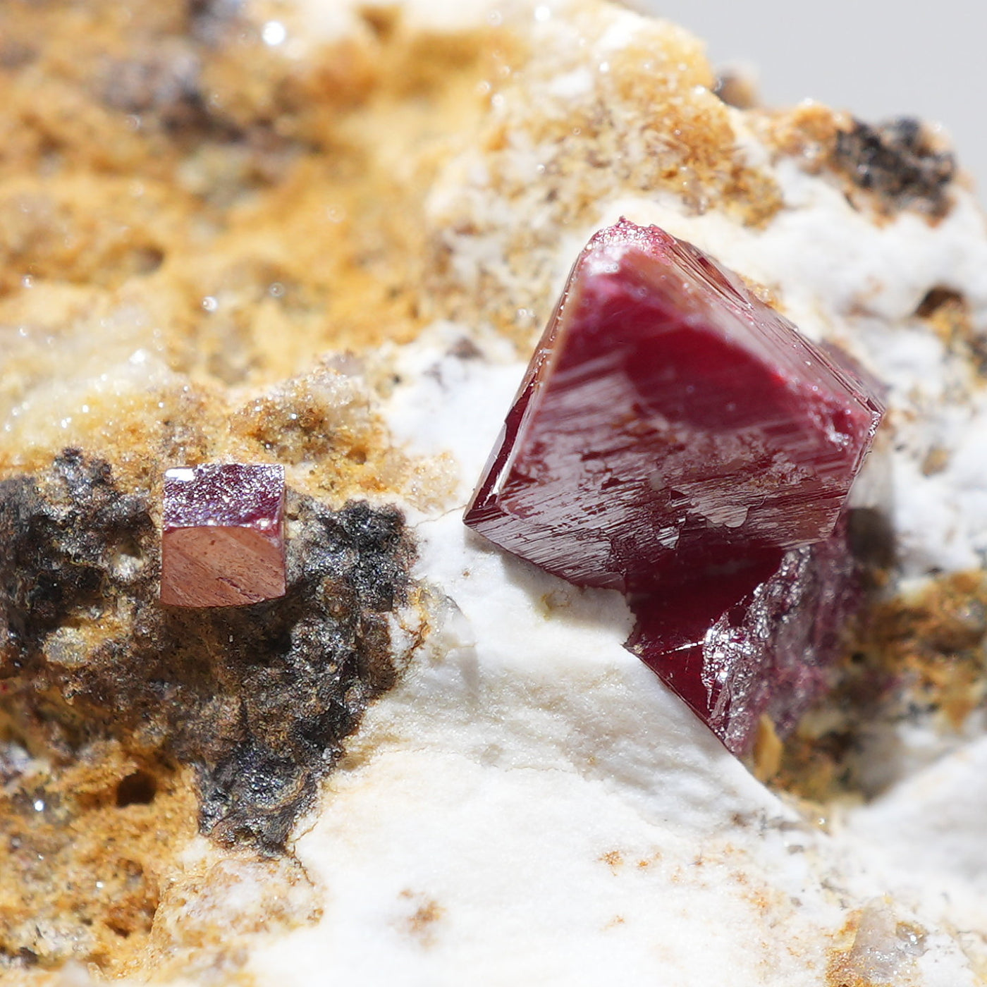 特徴的な鉛色~赤褐色の結晶が目を引く良質な標本です。希少な鉱物です。