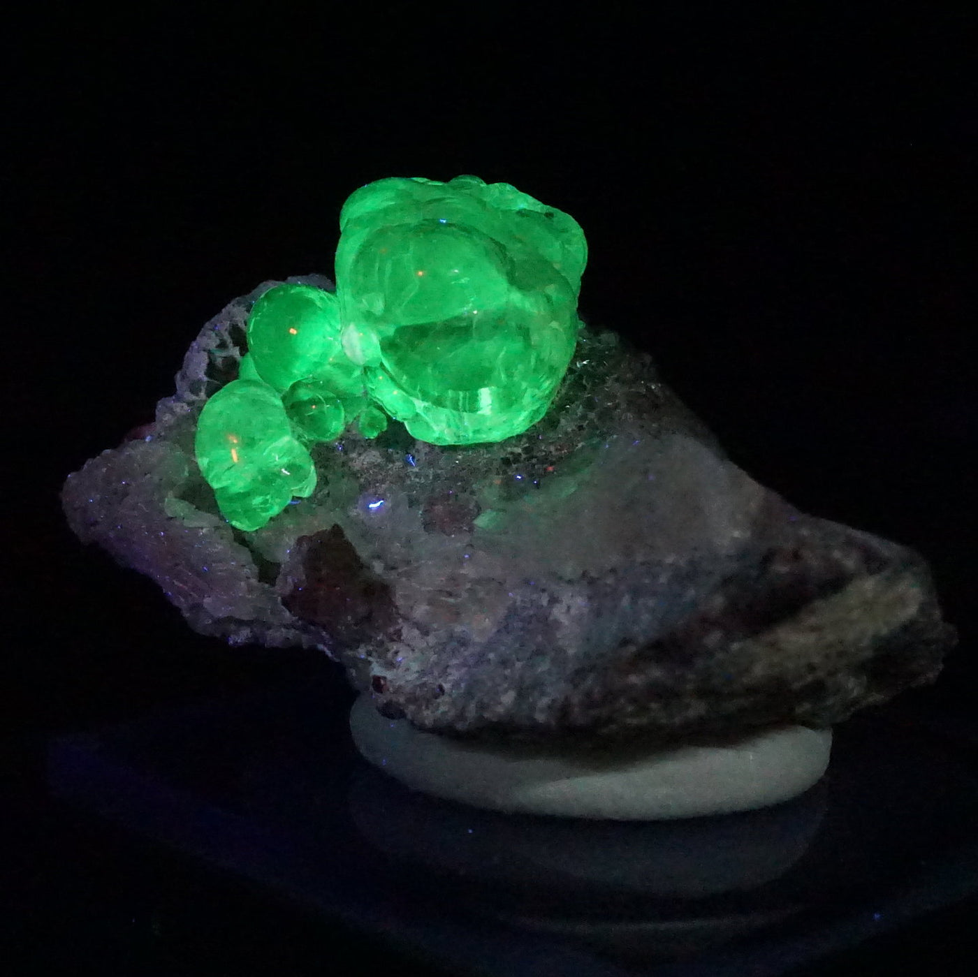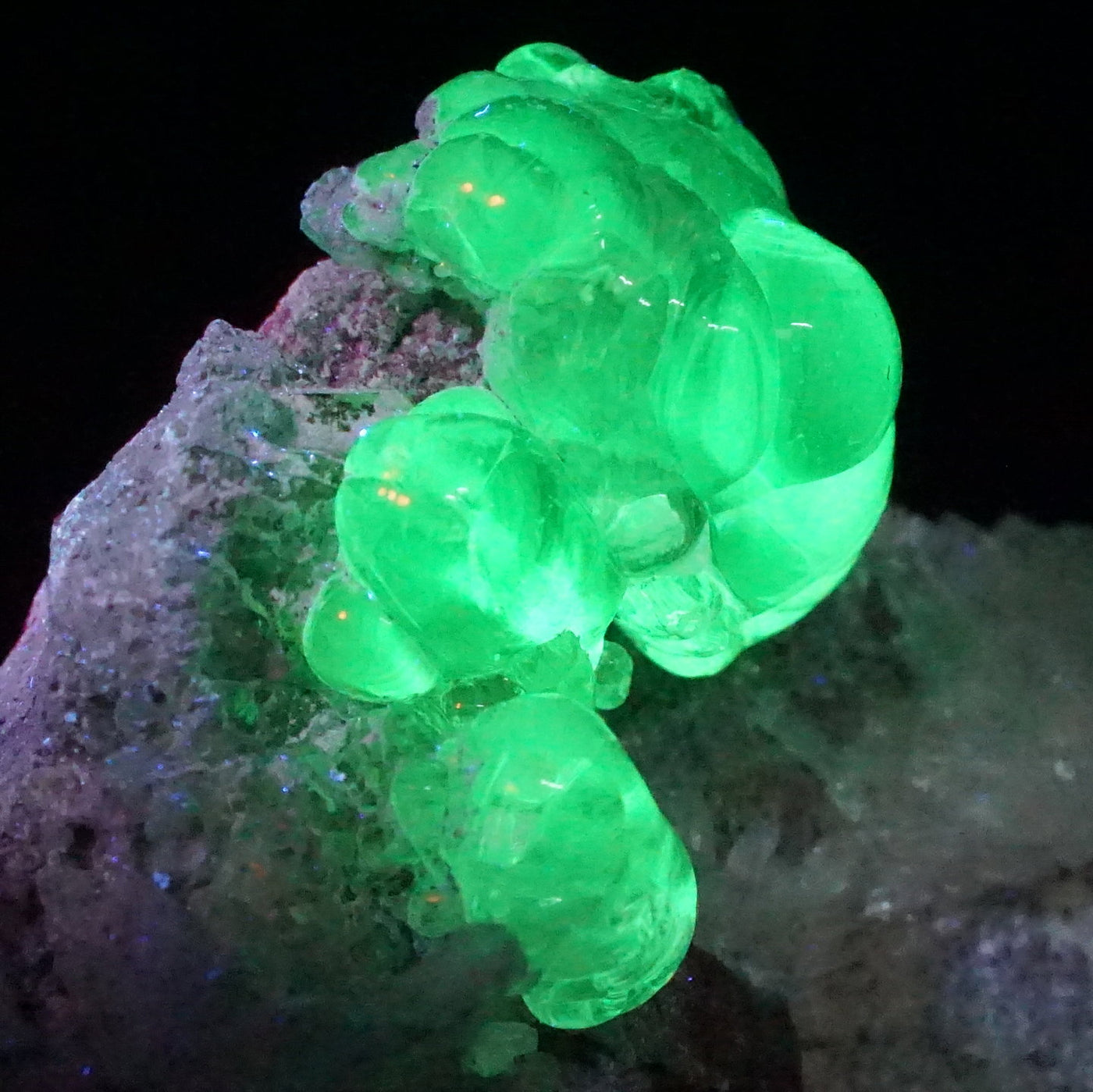 湧き出る水を閉じ込めたような透明感ともこもこした形状が印象的です。紫外線ライトを当てると鮮やかな緑色に蛍光します。