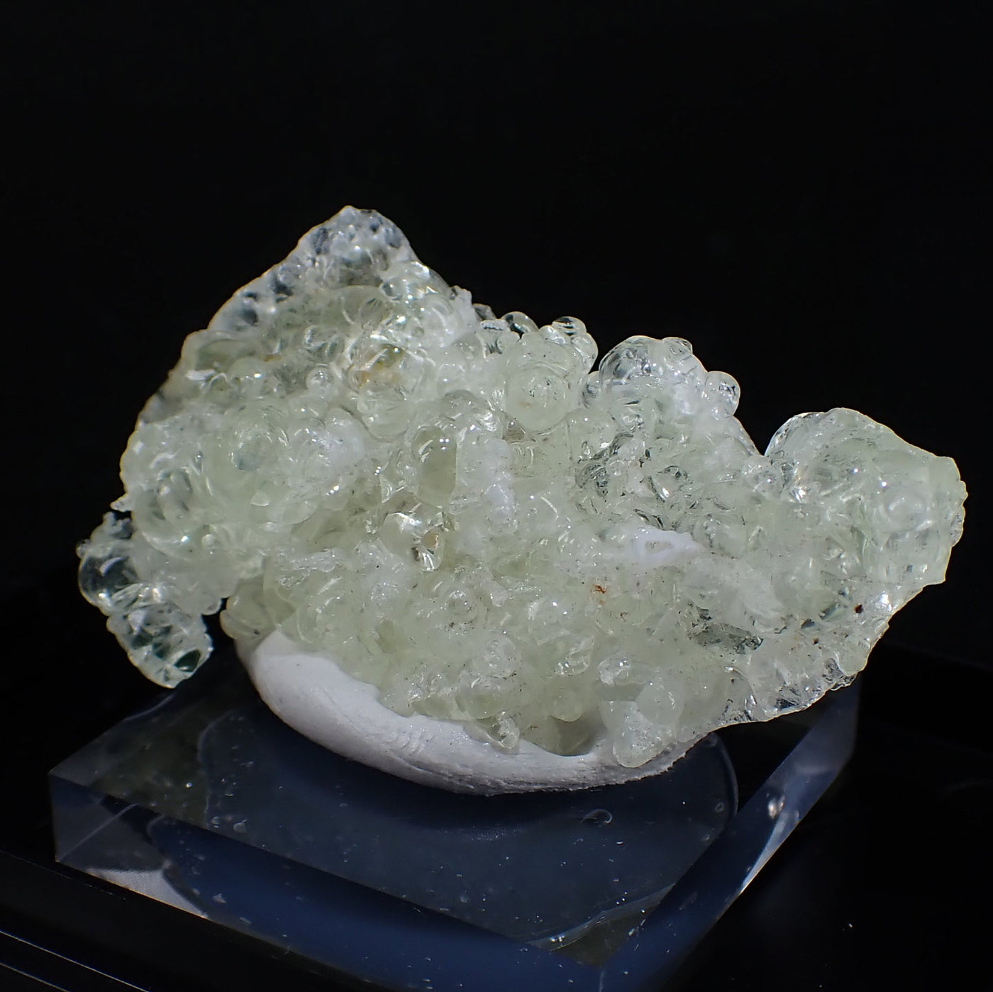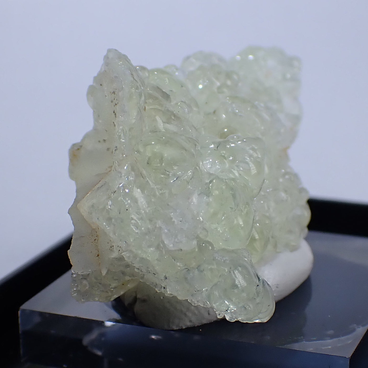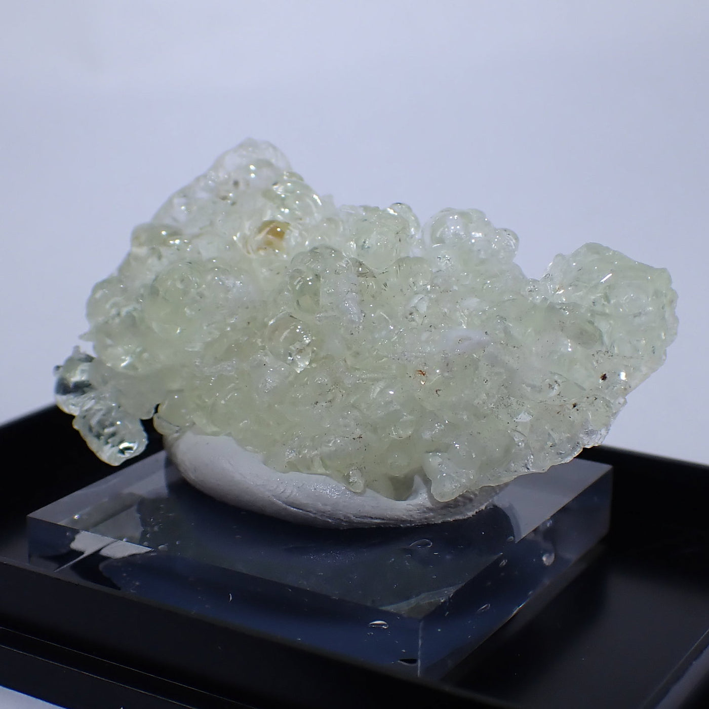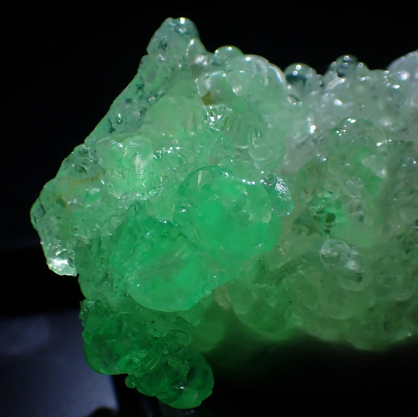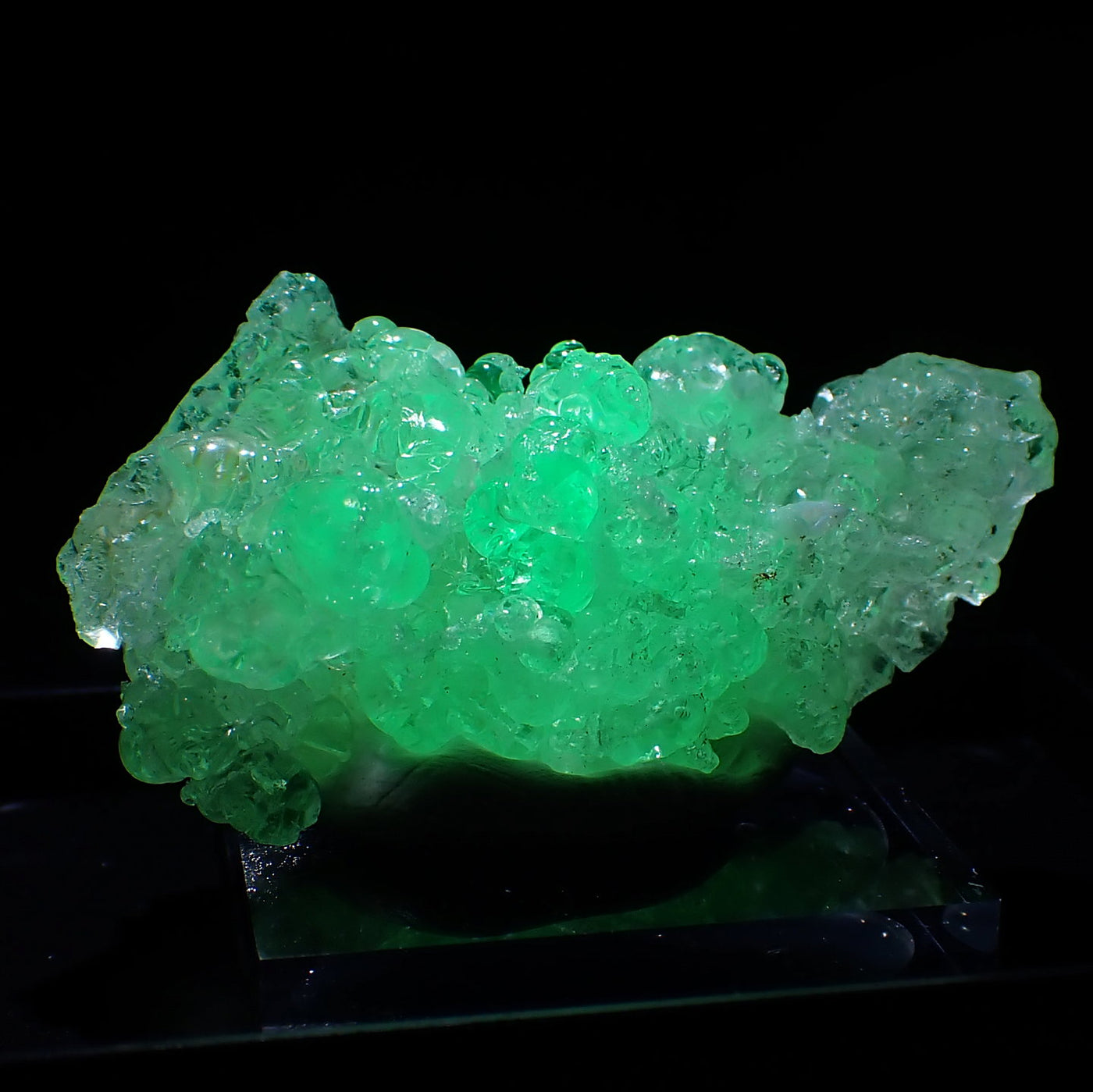 丸みを帯びた透明感のある結晶です。照りのある良質な標本です。紫外線ライトを当てると鮮やかな緑色に蛍光するのが特徴です。