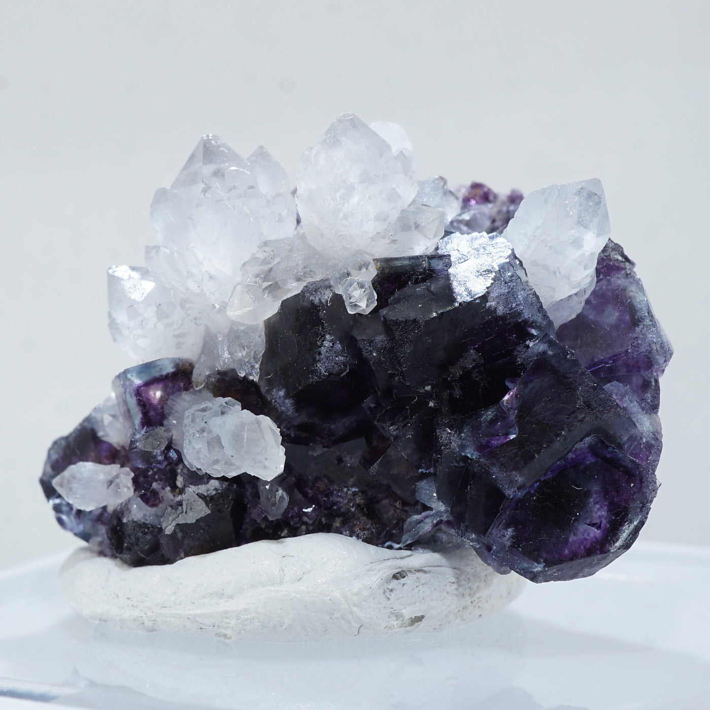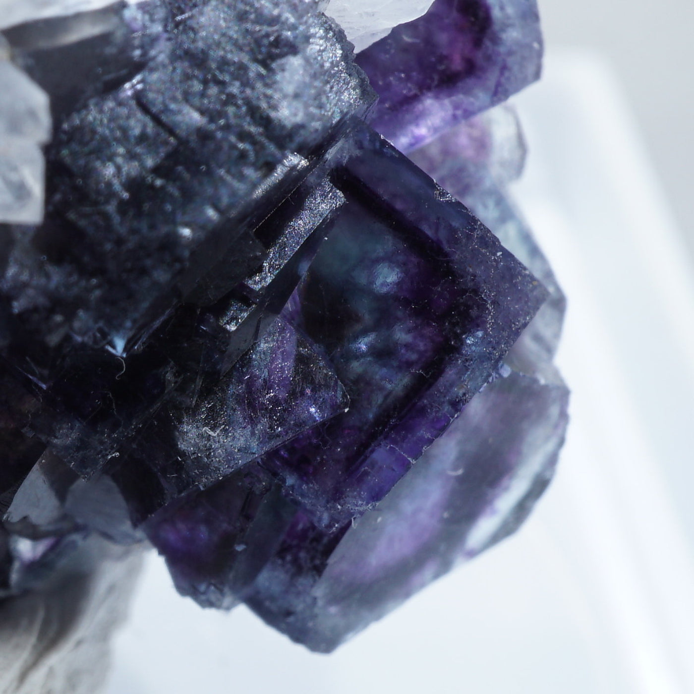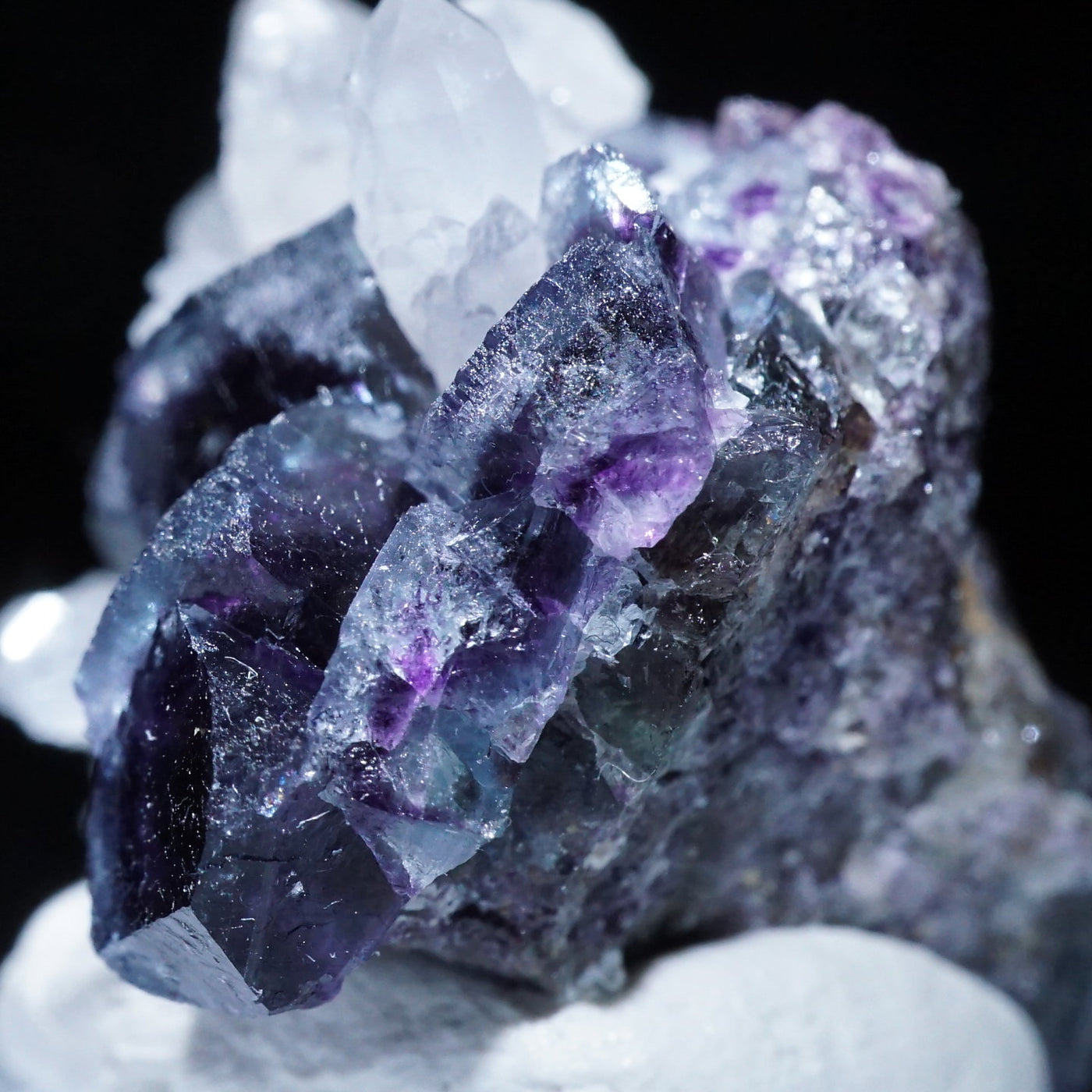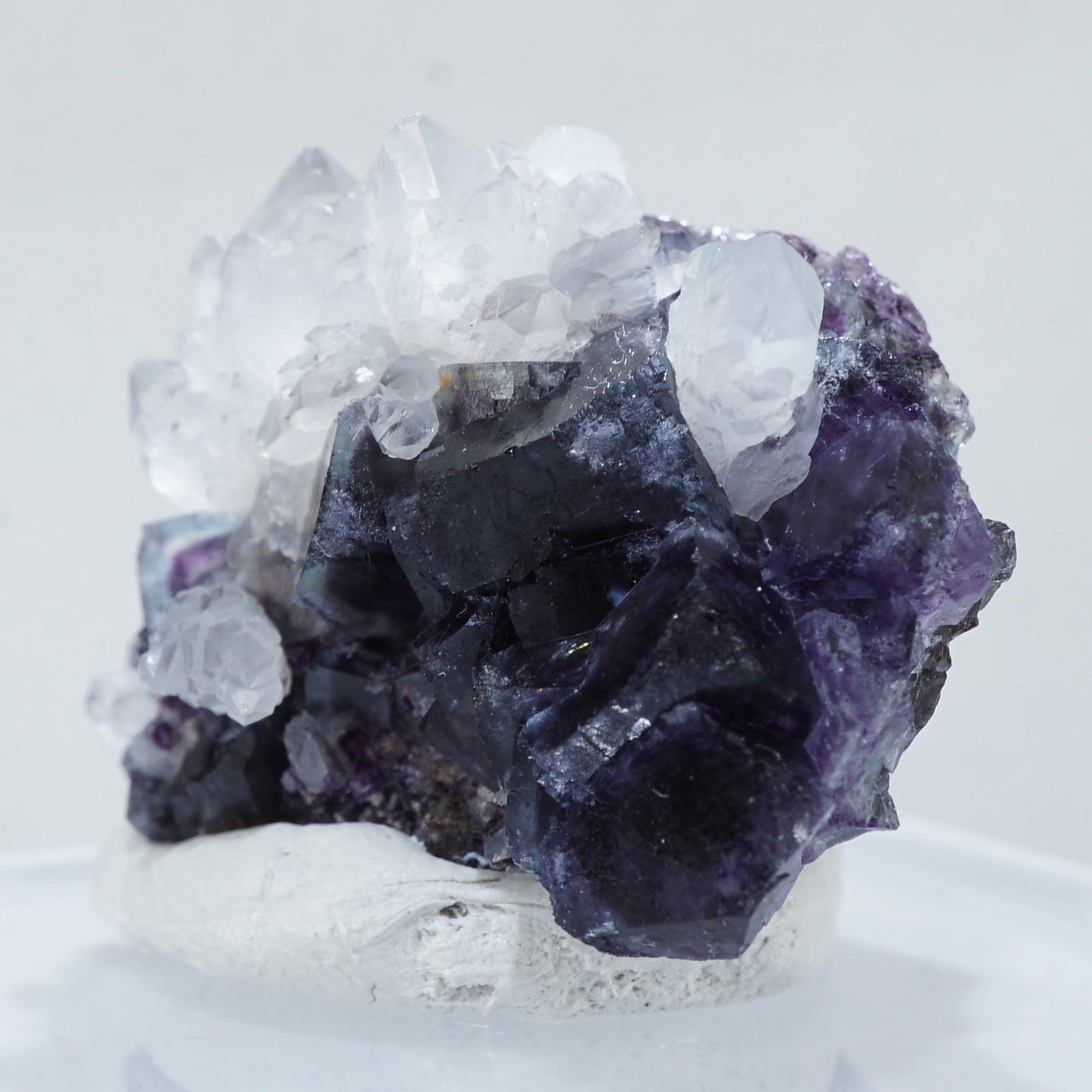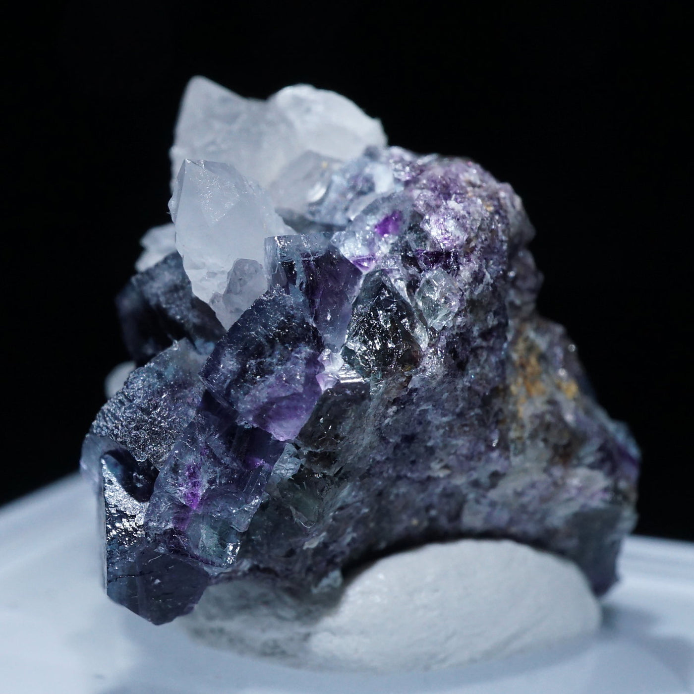内側は濃い紫色、外側は淡い水色になっています。光を透過させると色のコントラストが際立ちます。紫外線ライトを当てると蛍光します。