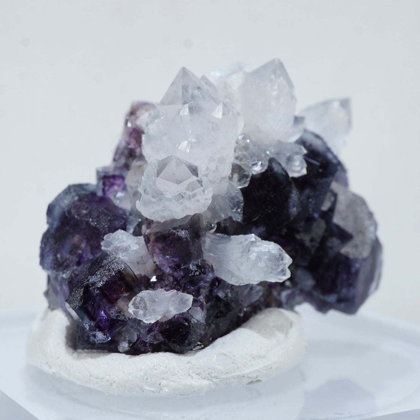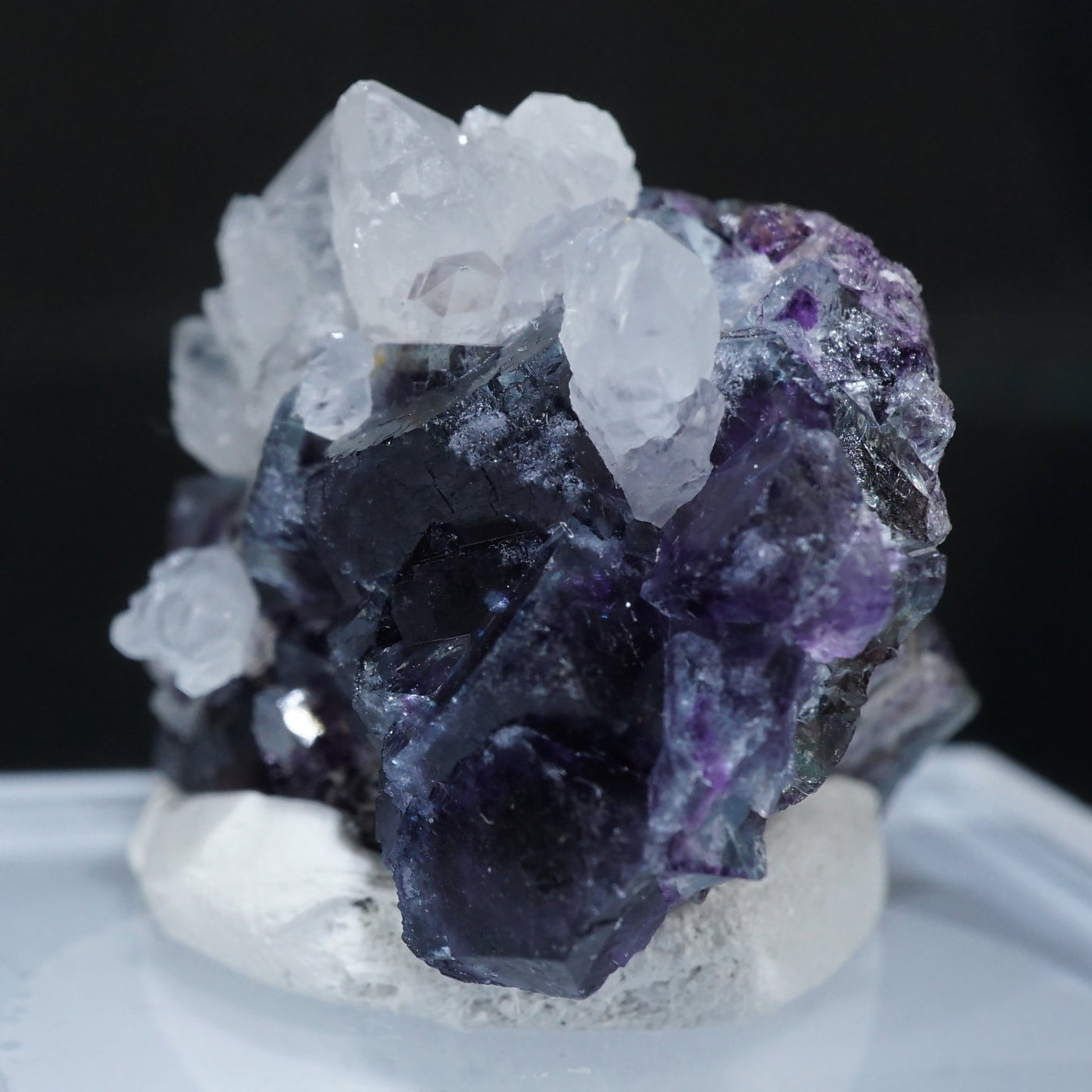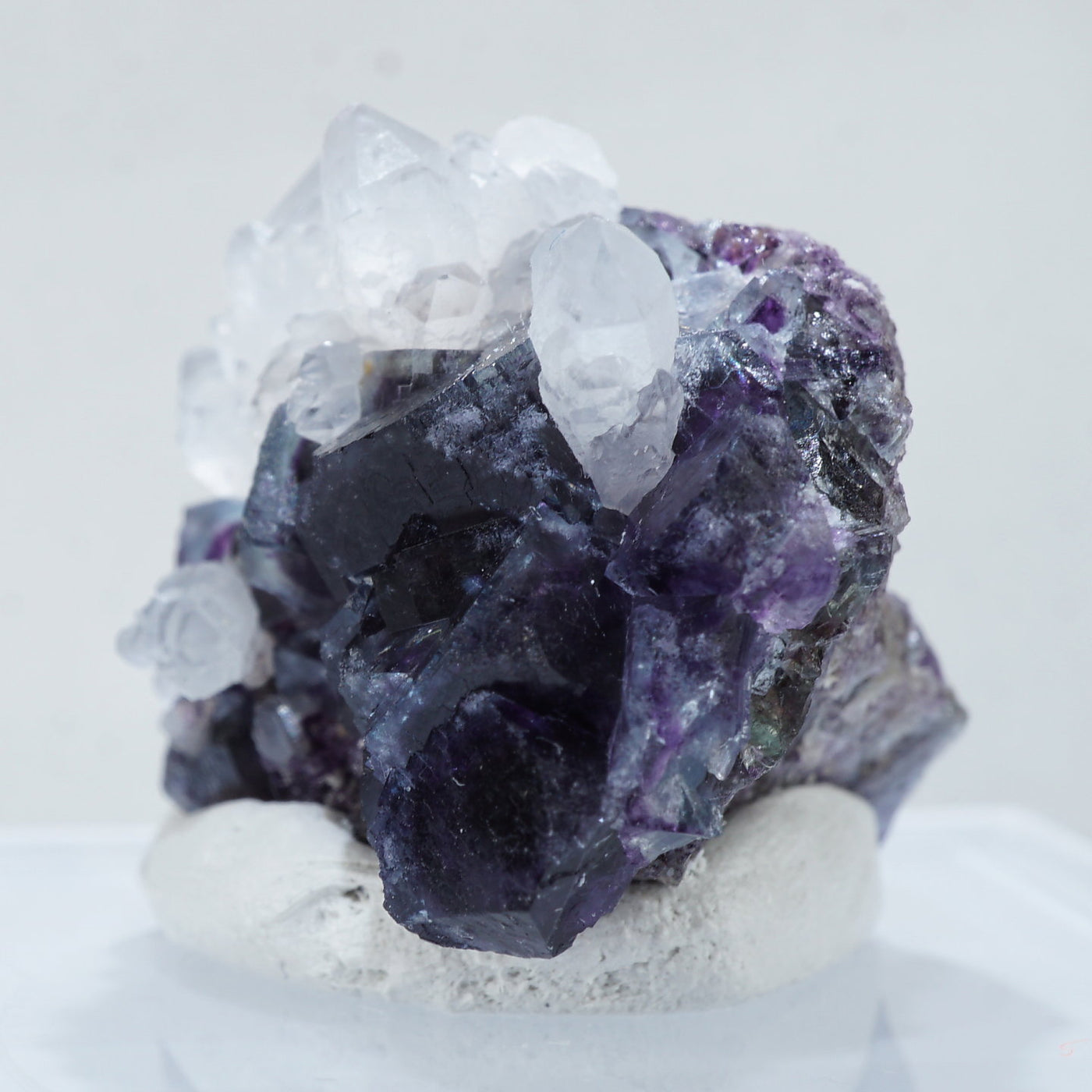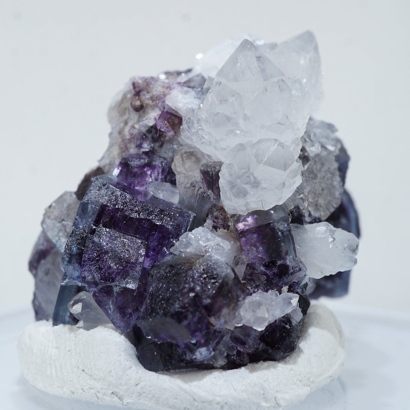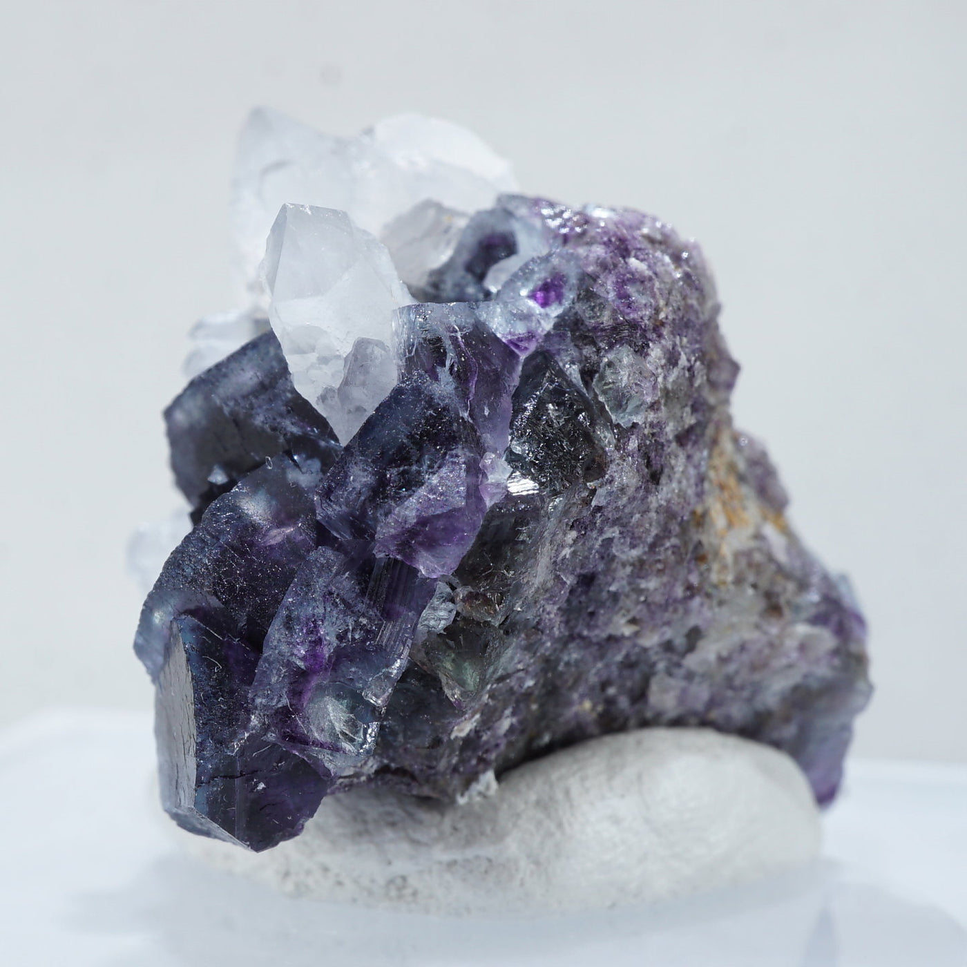 内側は濃い紫色、外側は淡い水色になっています。光を透過させると色のコントラストが際立ちます。紫外線ライトを当てると蛍光します。