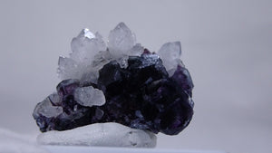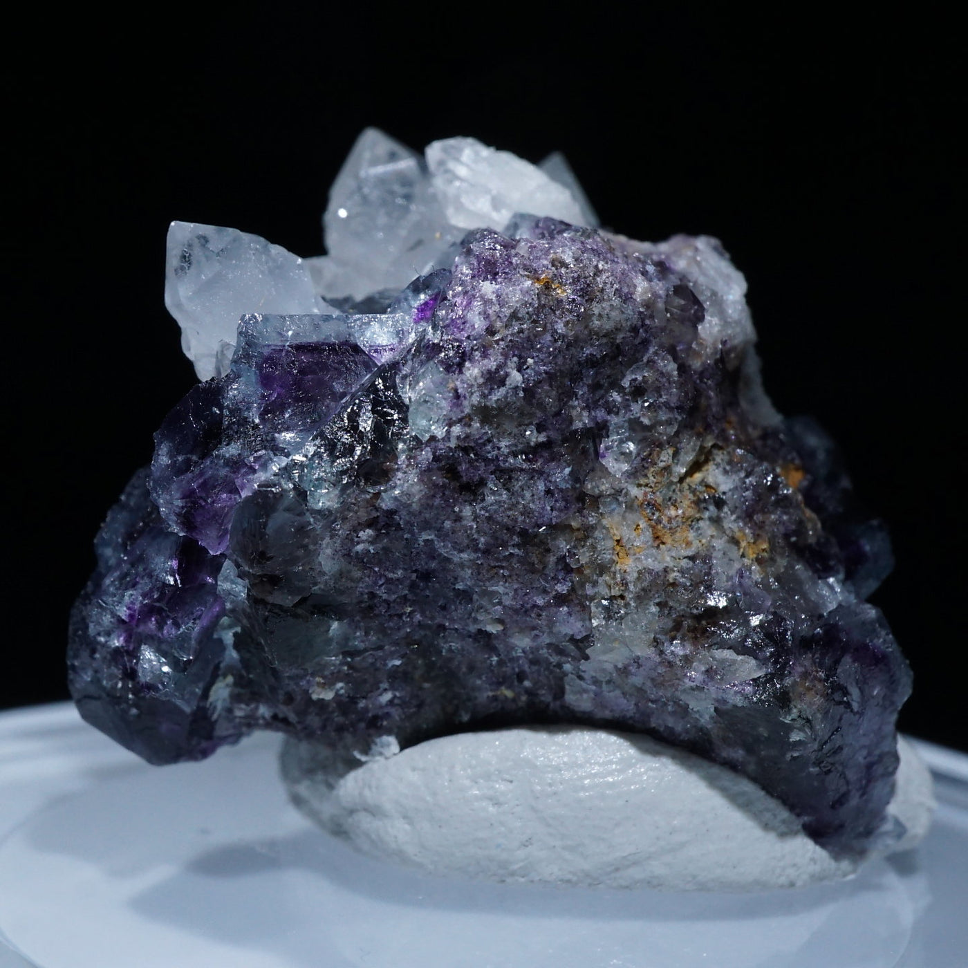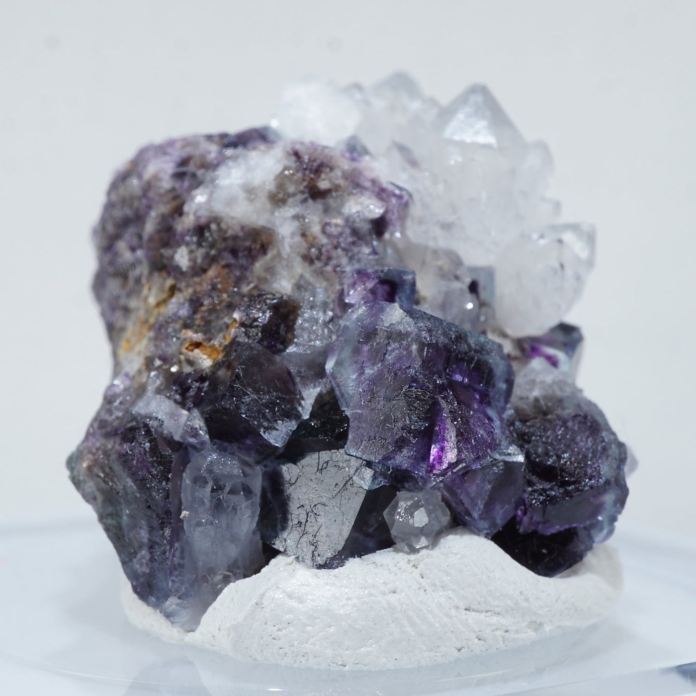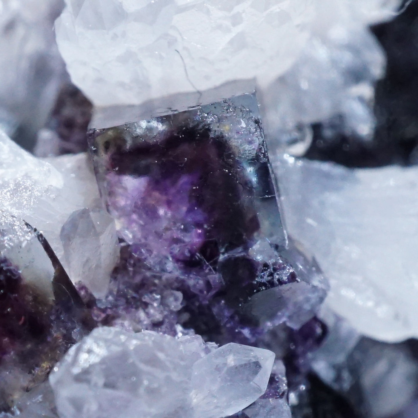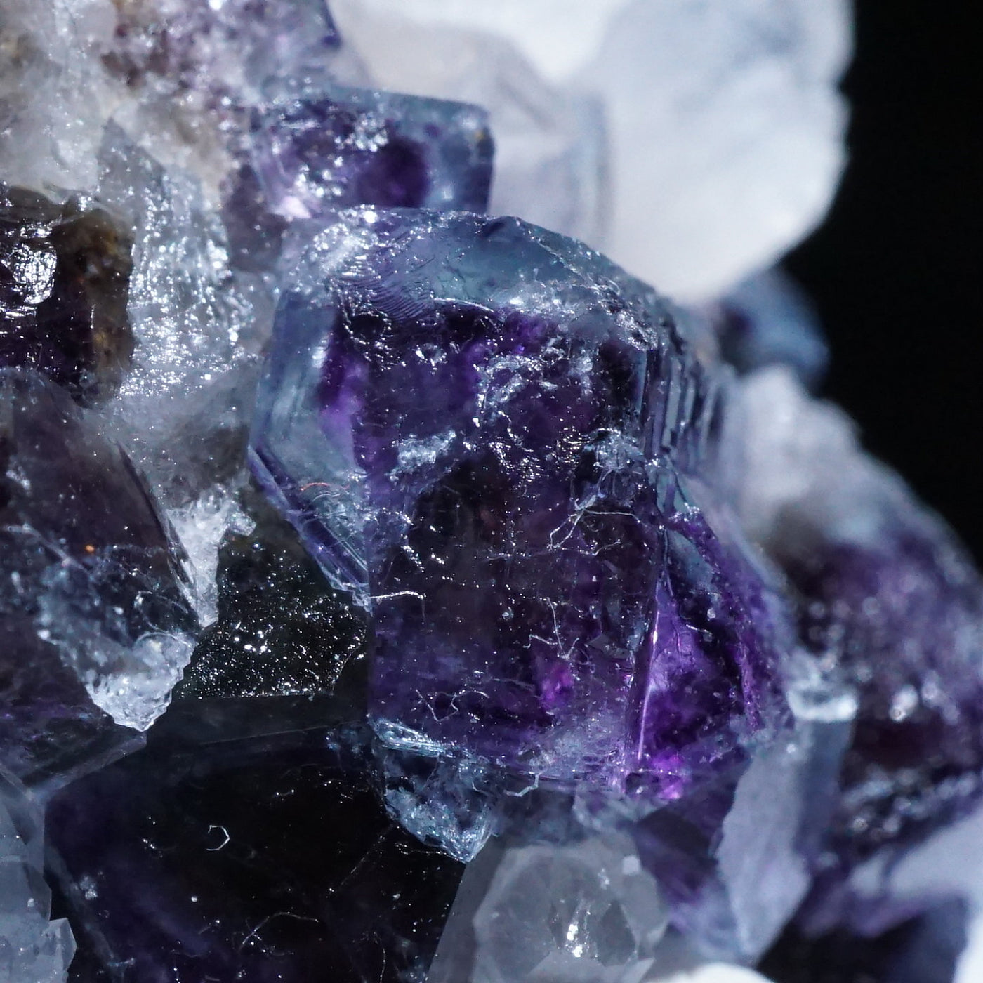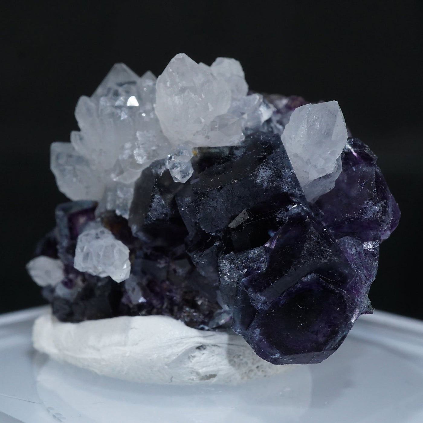 内側は濃い紫色、外側は淡い水色になっています。光を透過させると色のコントラストが際立ちます。紫外線ライトを当てると蛍光します。