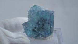 曇りガラスの様な表面で、淡い水色の美しい標本です。インクを垂らしたかのような紫色が特徴的です。紫外線ライトを当てると蛍光します。