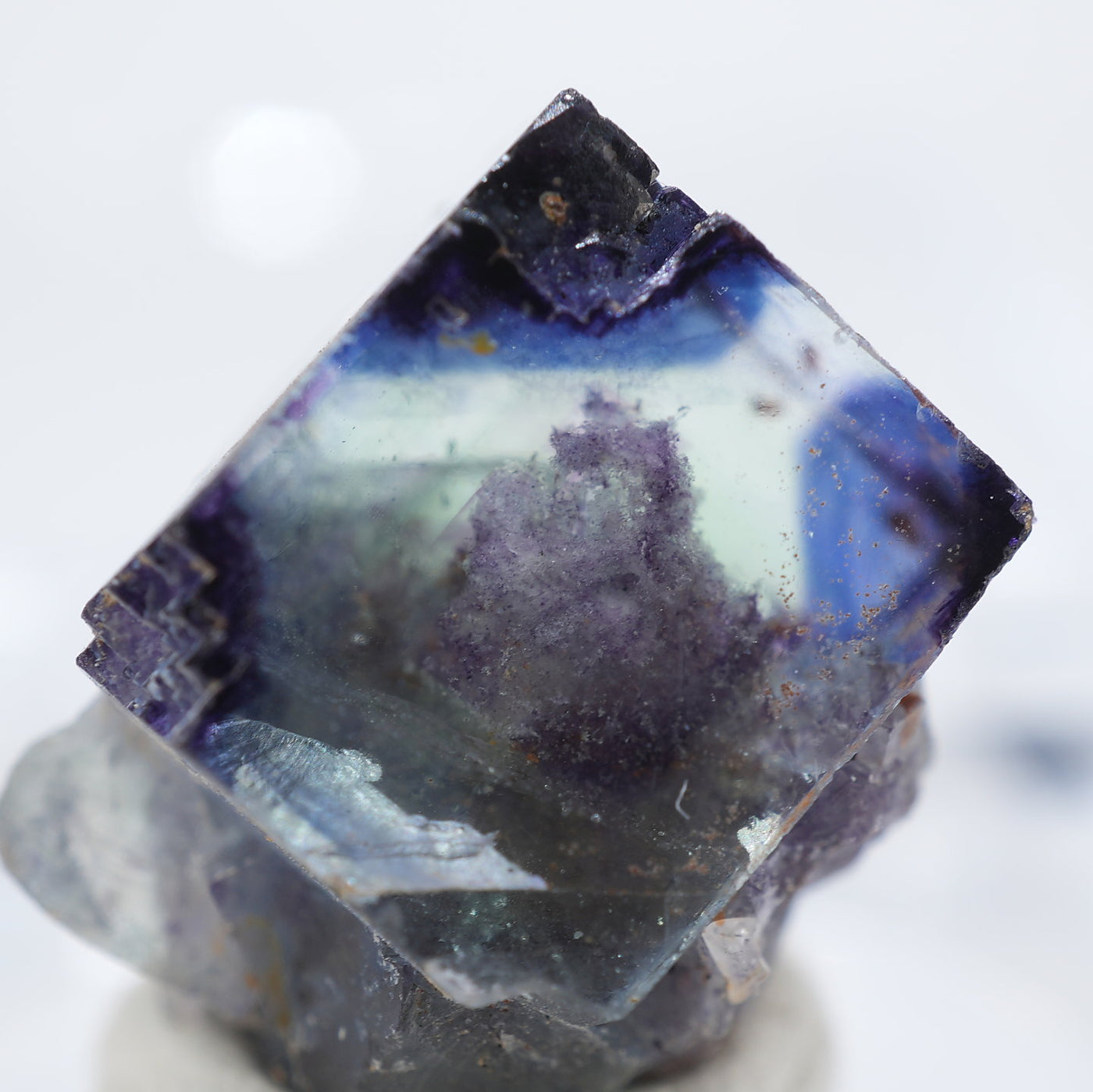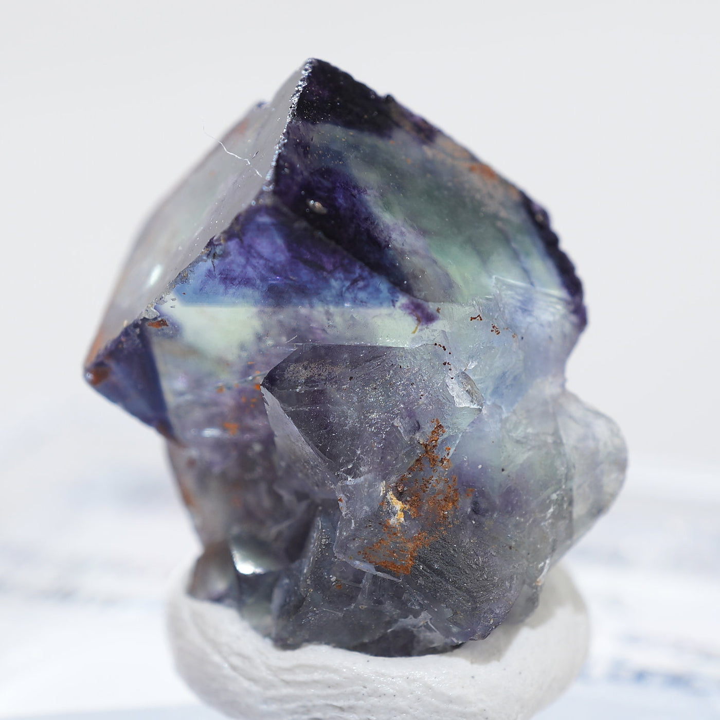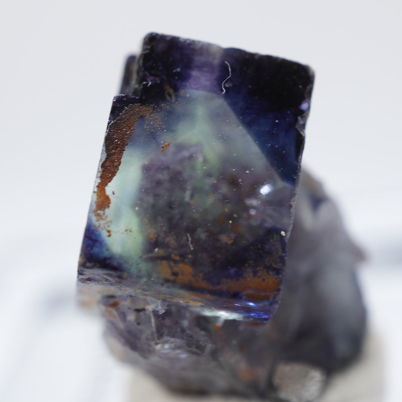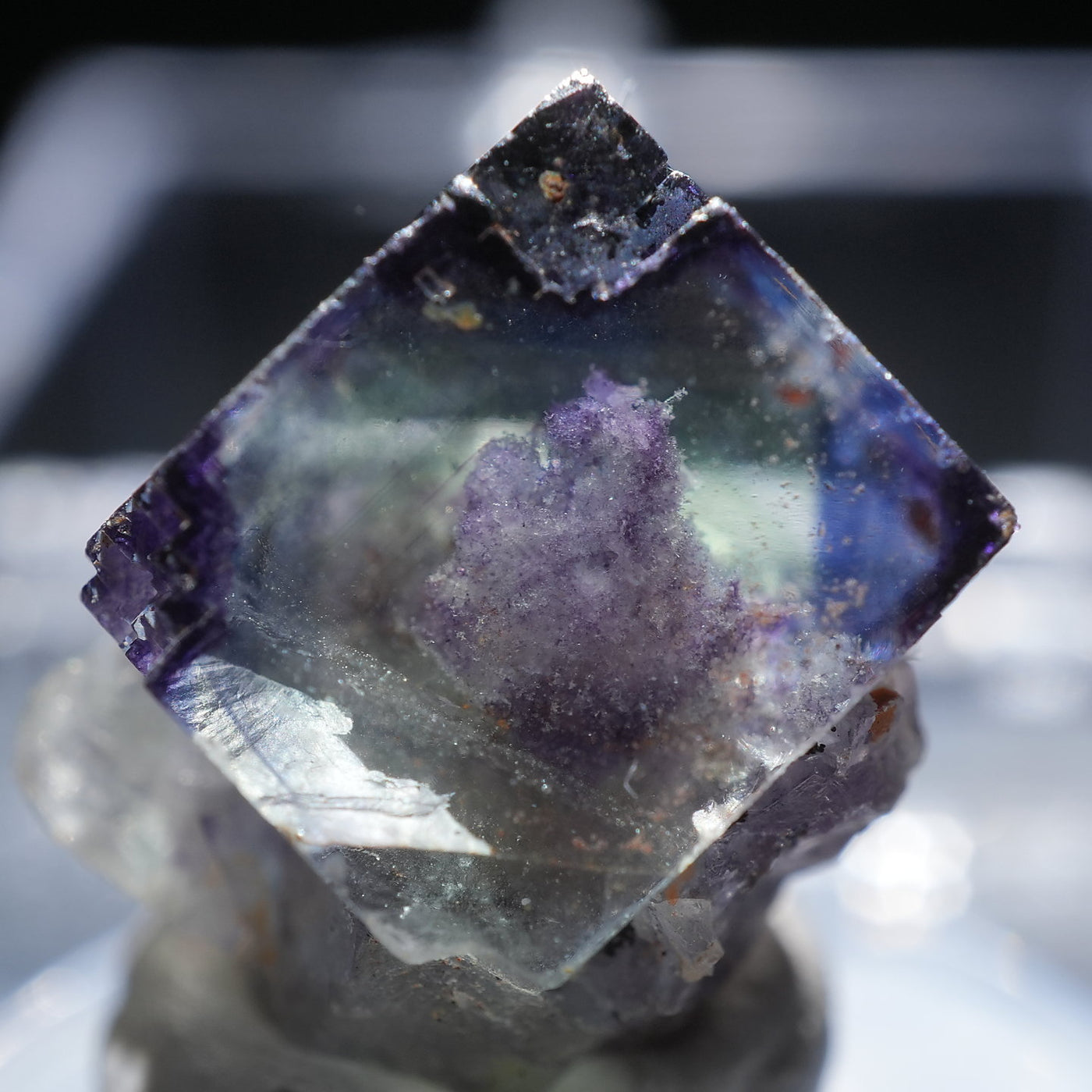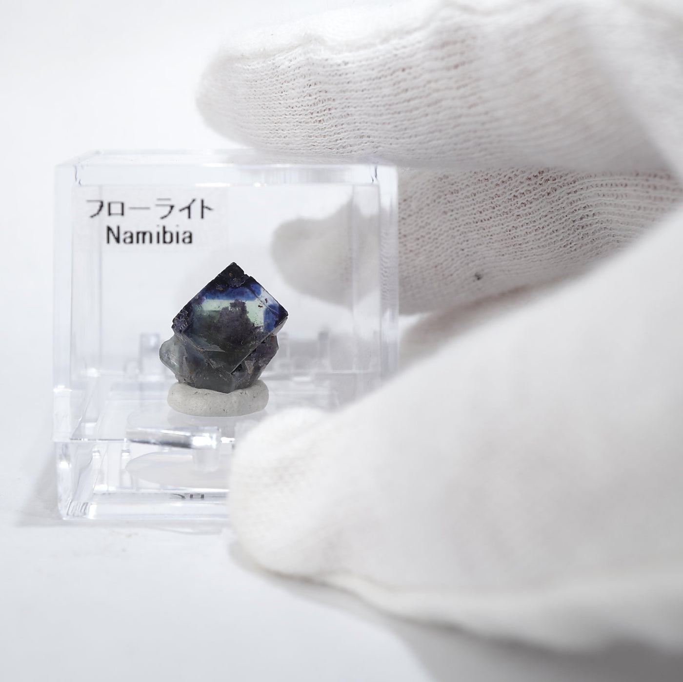 人気のナミビア産のフローライトです。淡いグリーンを縁取るように四隅が濃紫色~紺色になっています。光を透過させると色のコントラストがより一層際立ち綺麗です。紫外線ライトを当てると蛍光します。※撮影に使用しているライトは、紫外線ライト365nm5wタイプです。
