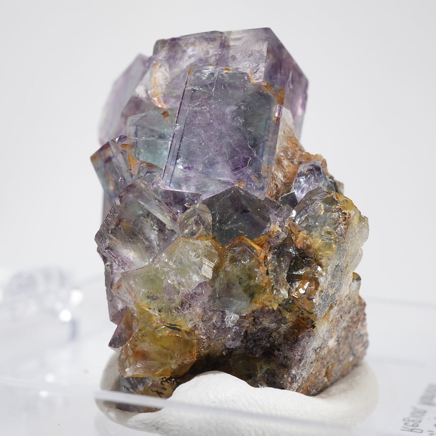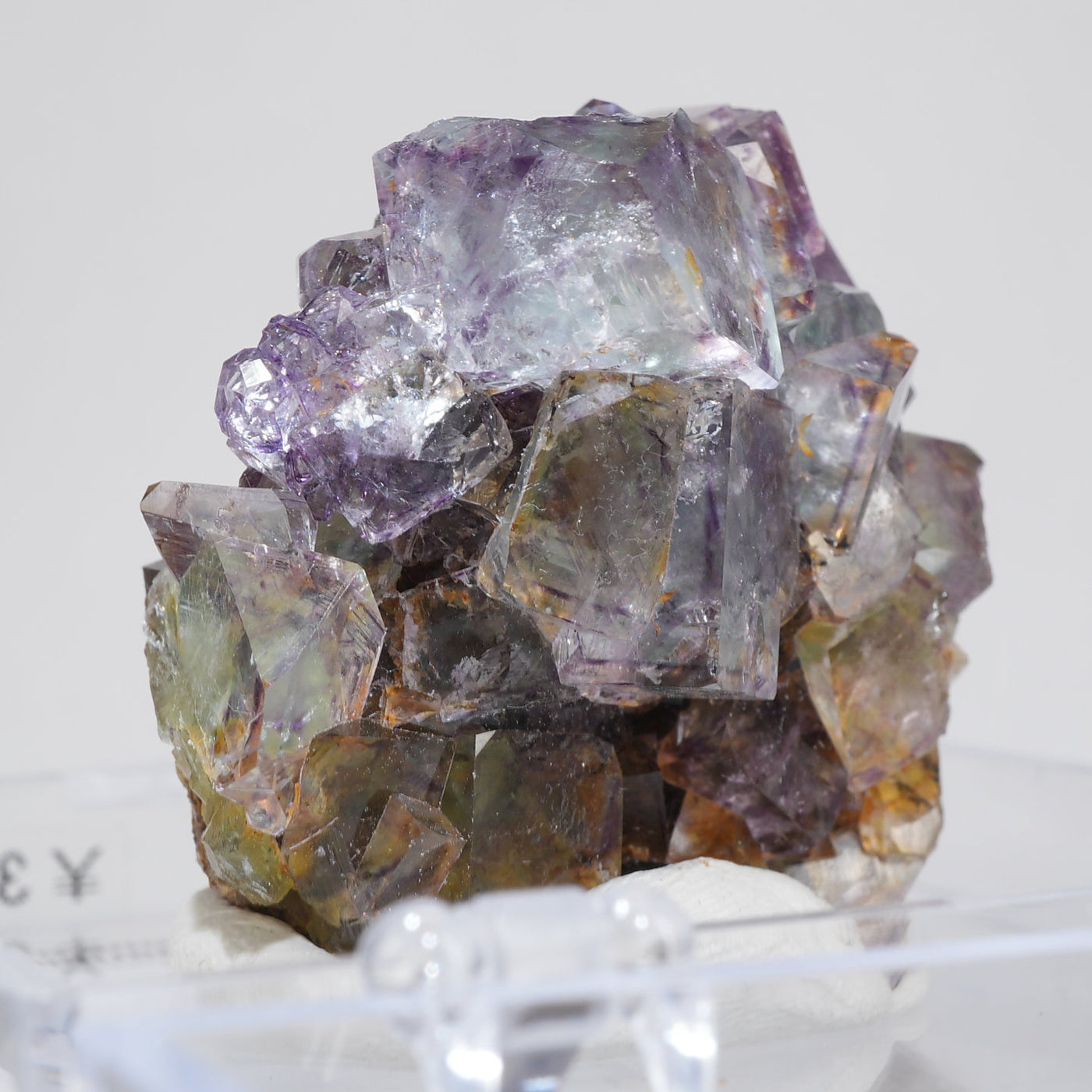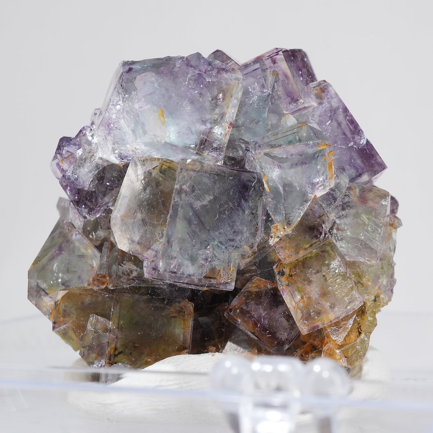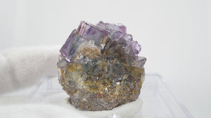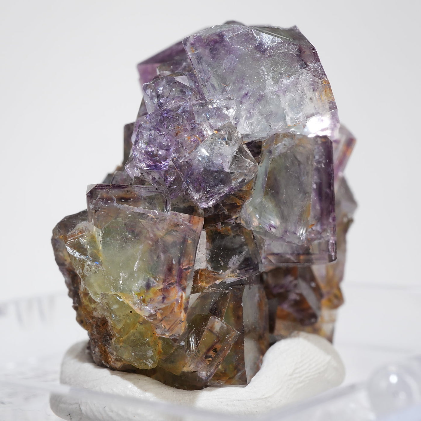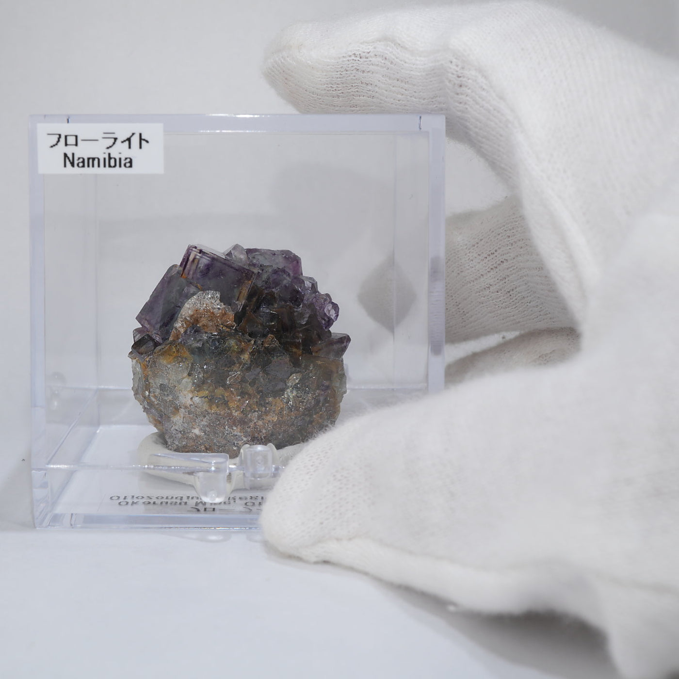 人気のナミビア産のフローライト結晶です。照りのある表面、淡いグリーンを縁取るようにみられるパープルのゾーニング、部分的にみられるイエローの色合いが綺麗です。光を透過させると色のコントラストがより一層際立ちます。紫外線ライトを当てると蛍光します。※撮影に使用しているライトは、紫外線ライト365nm5wタイプです。