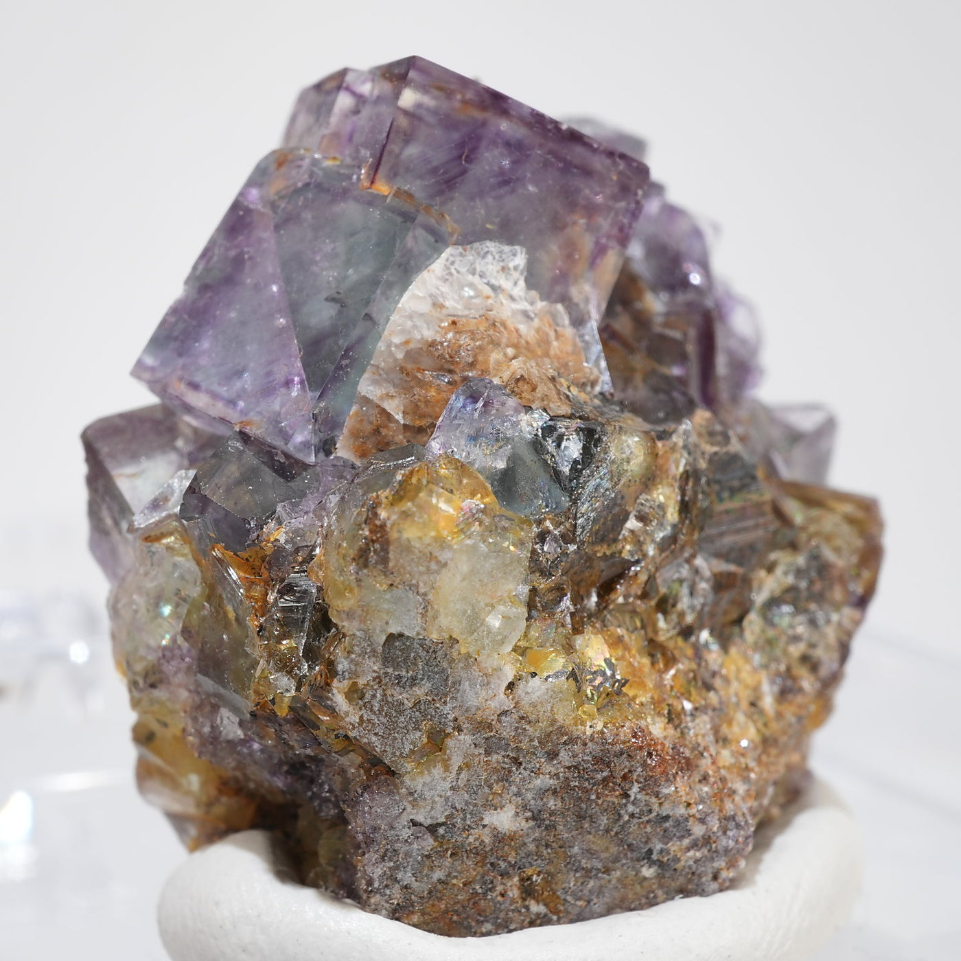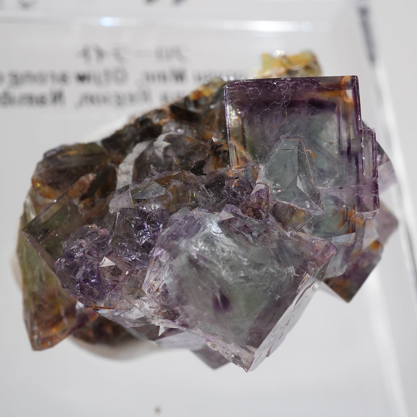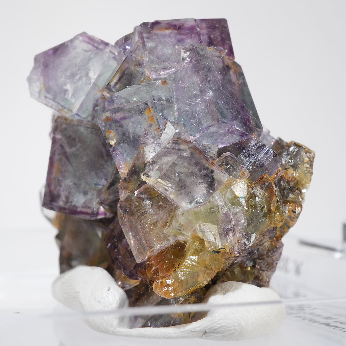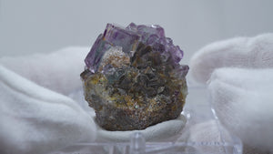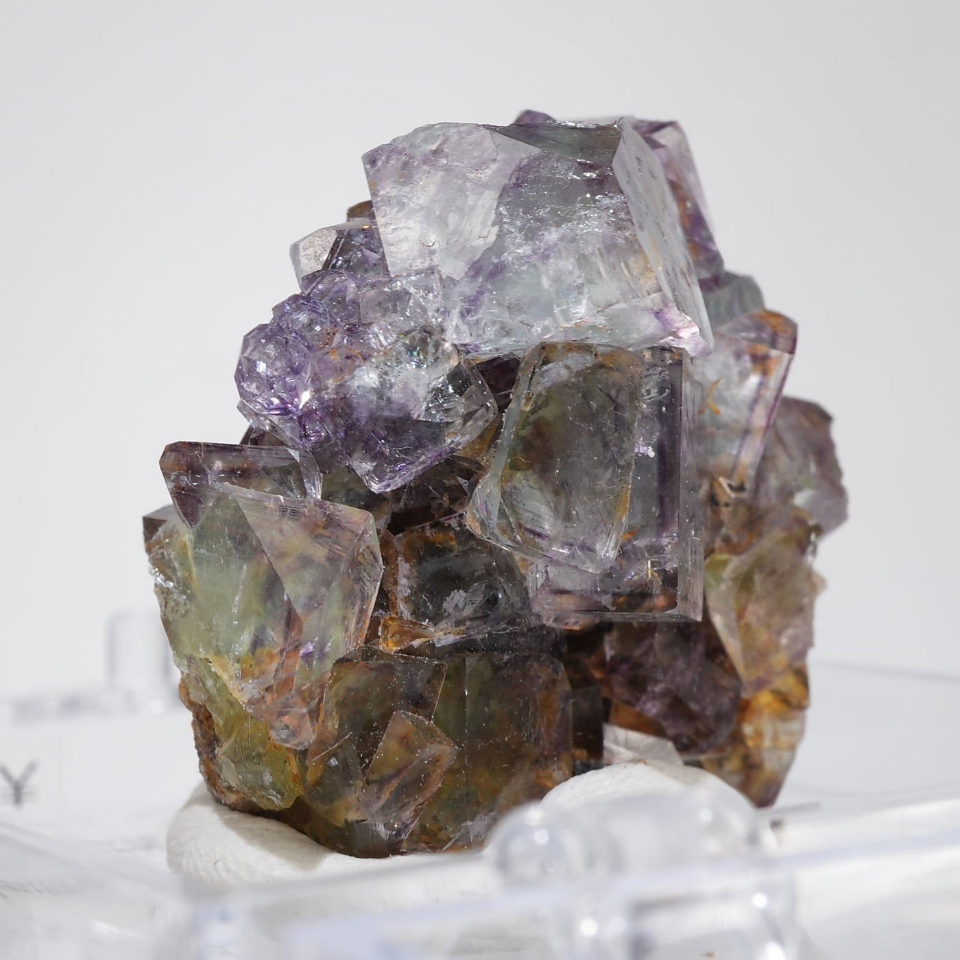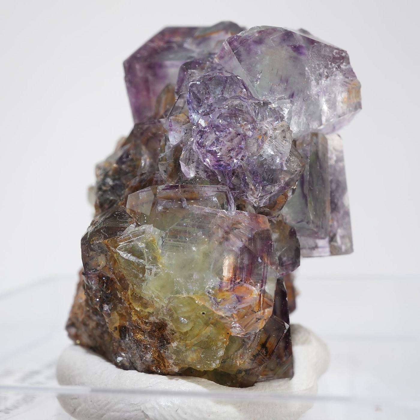 人気のナミビア産のフローライト結晶です。照りのある表面、淡いグリーンを縁取るようにみられるパープルのゾーニング、部分的にみられるイエローの色合いが綺麗です。光を透過させると色のコントラストがより一層際立ちます。紫外線ライトを当てると蛍光します。※撮影に使用しているライトは、紫外線ライト365nm5wタイプです。