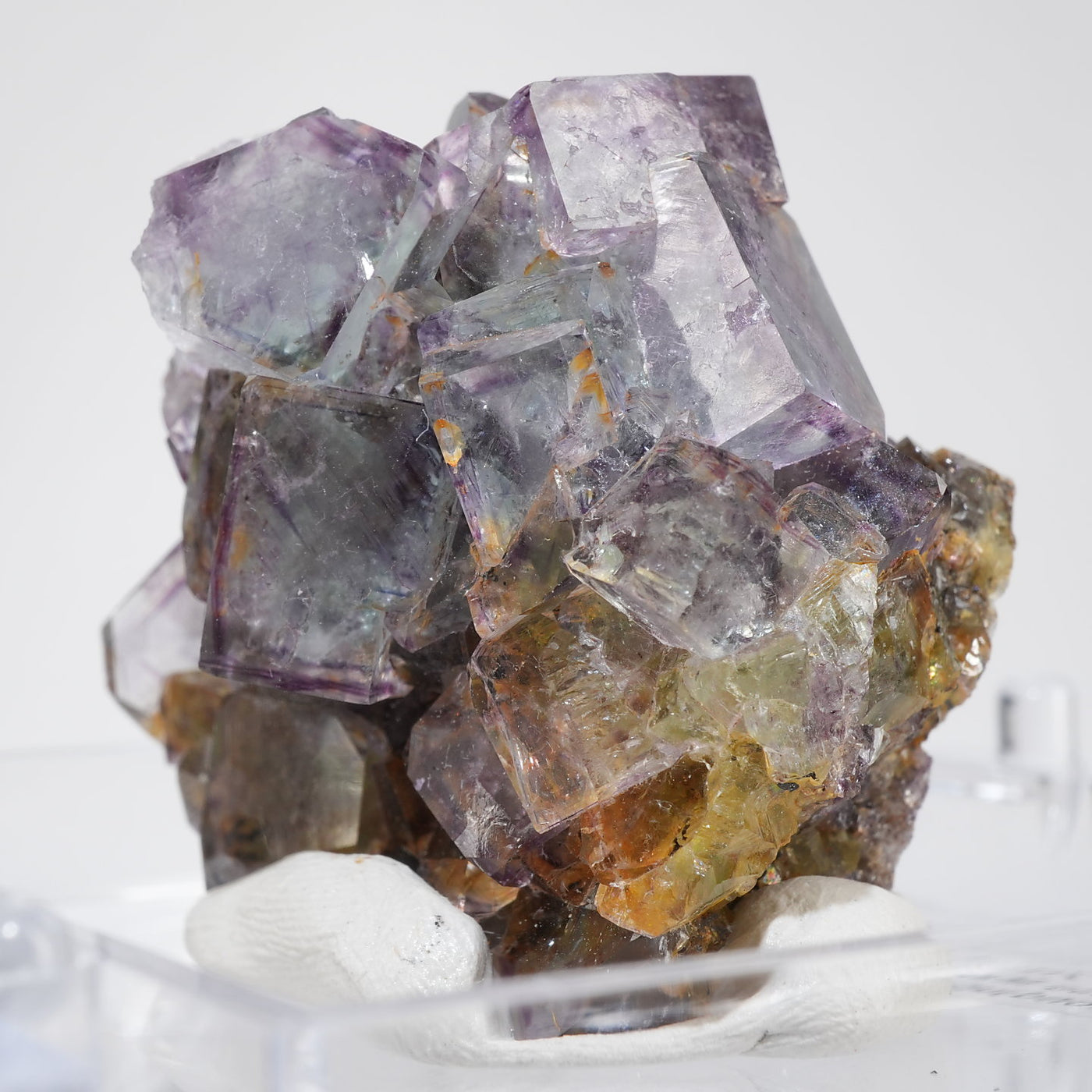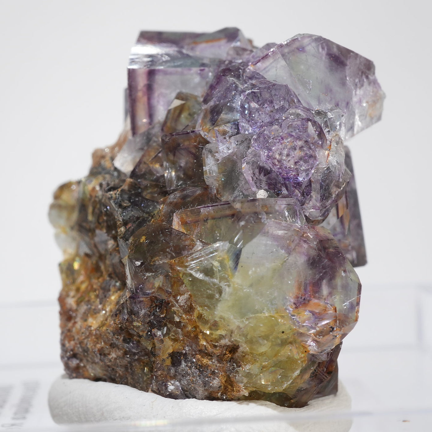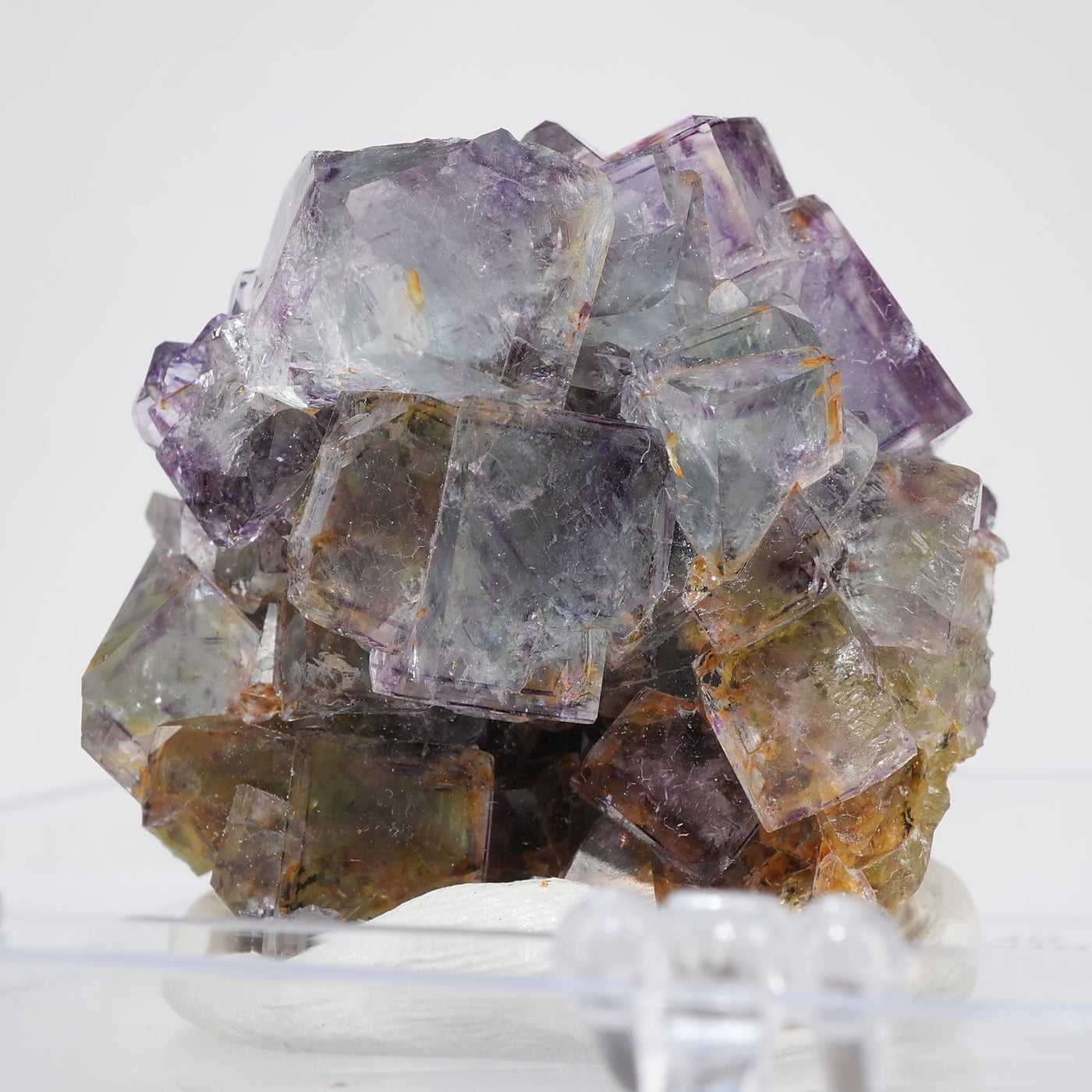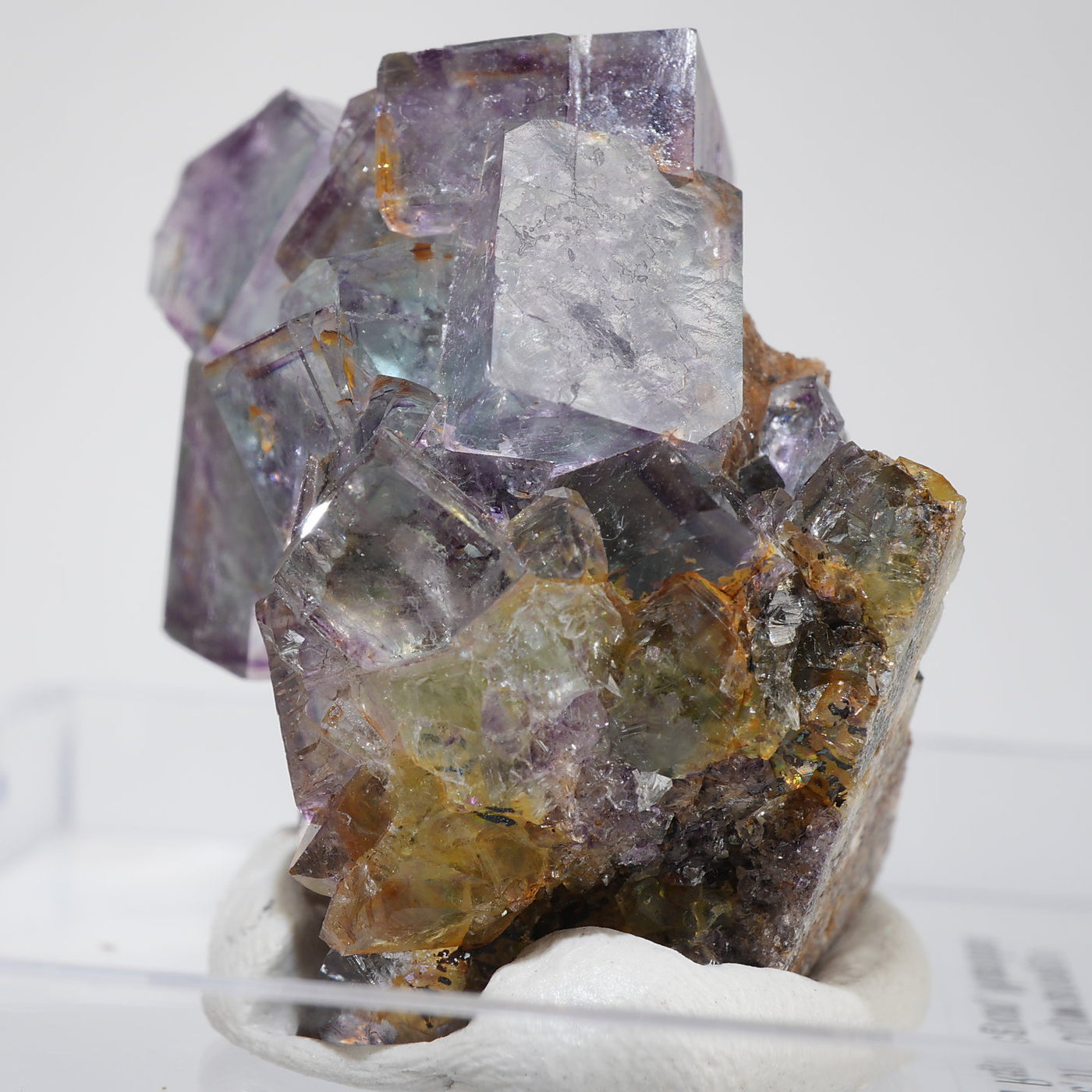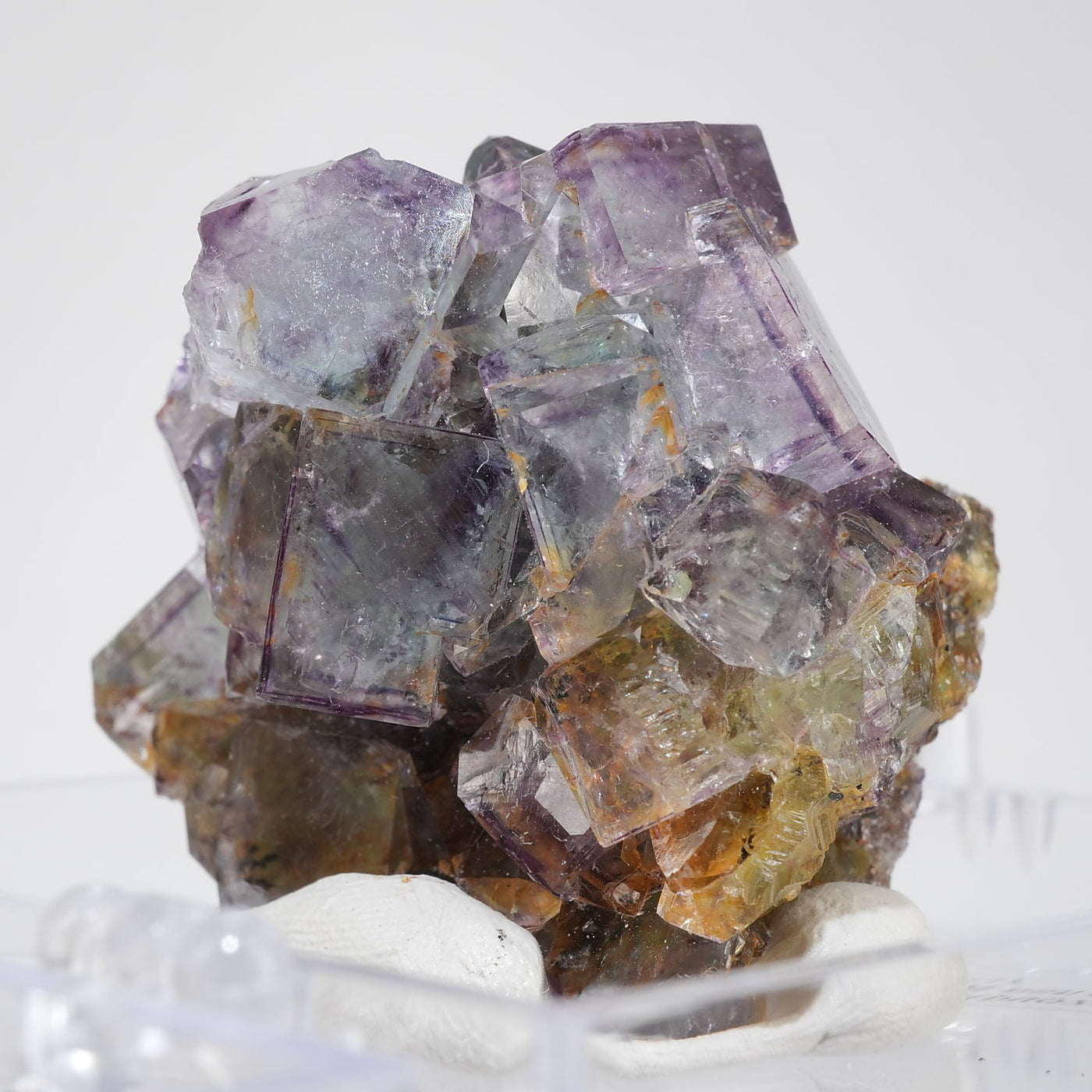 人気のナミビア産のフローライト結晶です。照りのある表面、淡いグリーンを縁取るようにみられるパープルのゾーニング、部分的にみられるイエローの色合いが綺麗です。光を透過させると色のコントラストがより一層際立ちます。紫外線ライトを当てると蛍光します。※撮影に使用しているライトは、紫外線ライト365nm5wタイプです。