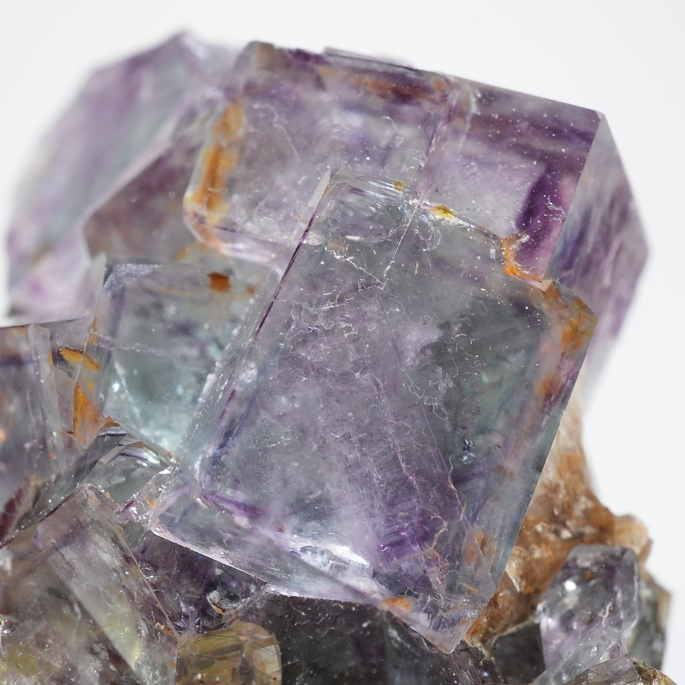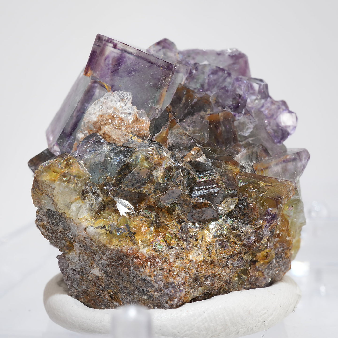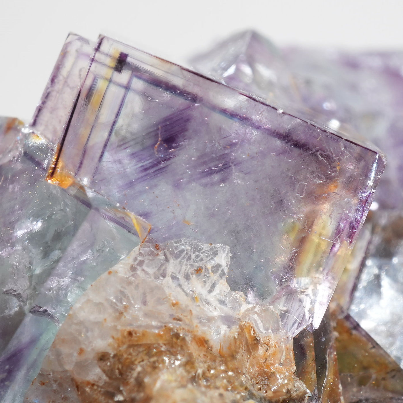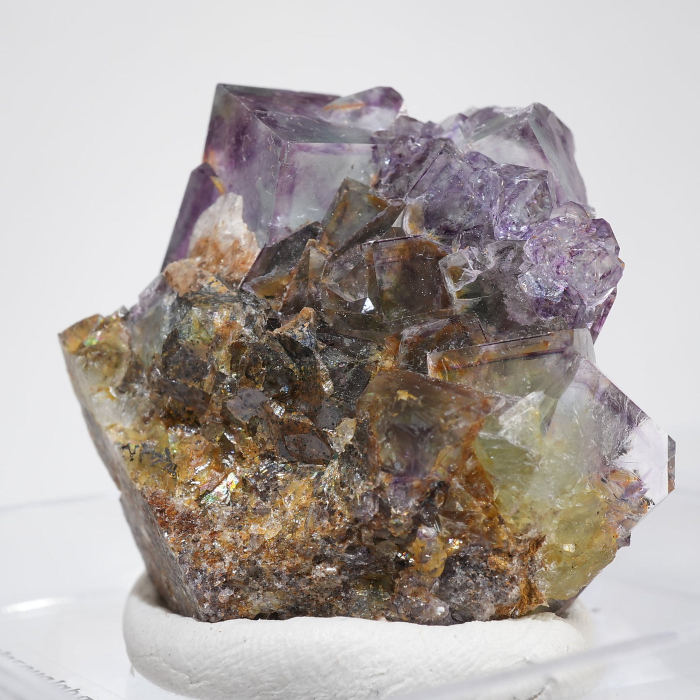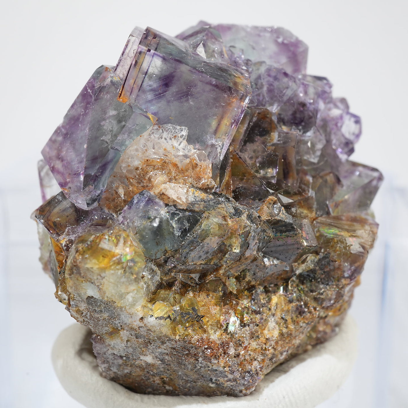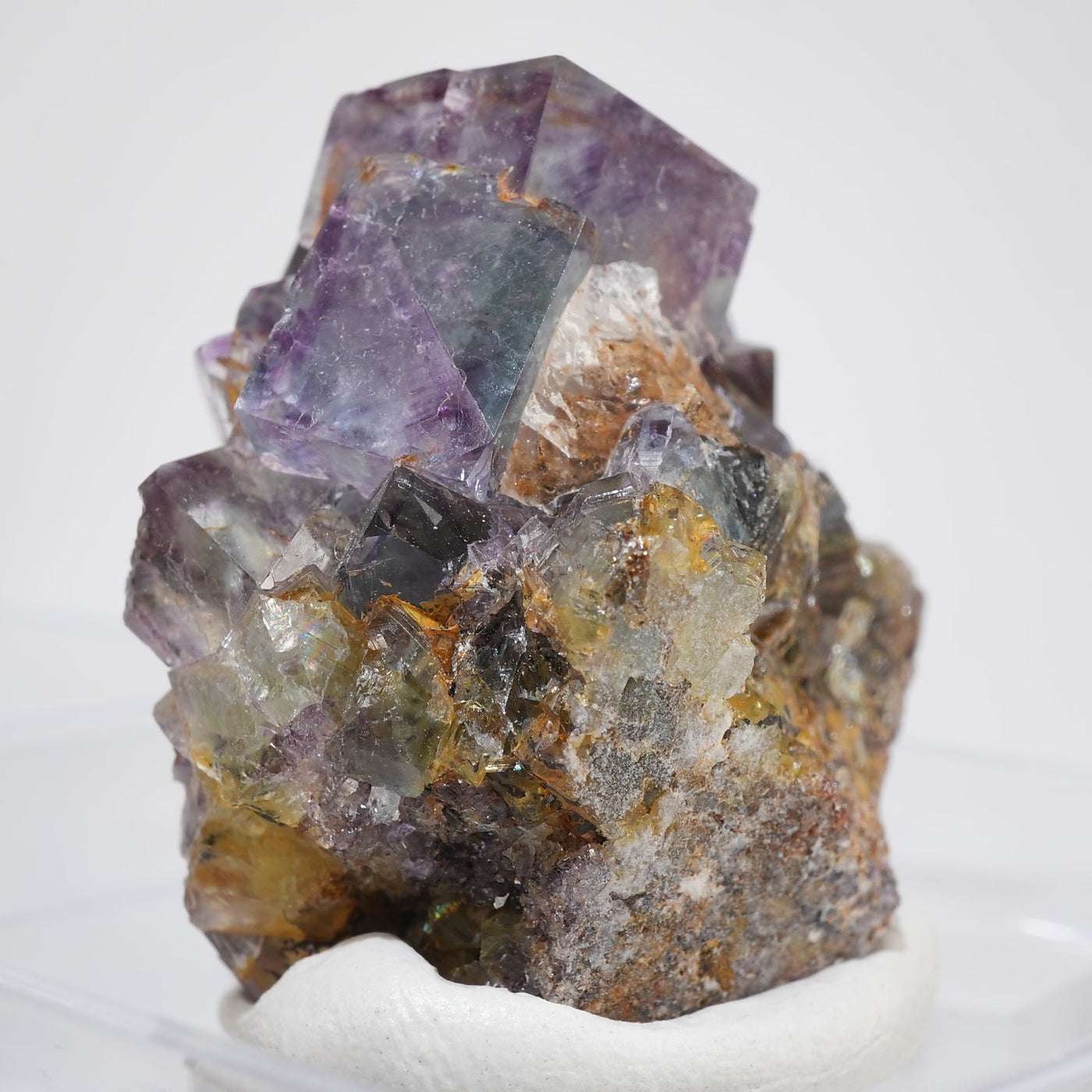 人気のナミビア産のフローライト結晶です。照りのある表面、淡いグリーンを縁取るようにみられるパープルのゾーニング、部分的にみられるイエローの色合いが綺麗です。光を透過させると色のコントラストがより一層際立ちます。紫外線ライトを当てると蛍光します。※撮影に使用しているライトは、紫外線ライト365nm5wタイプです。