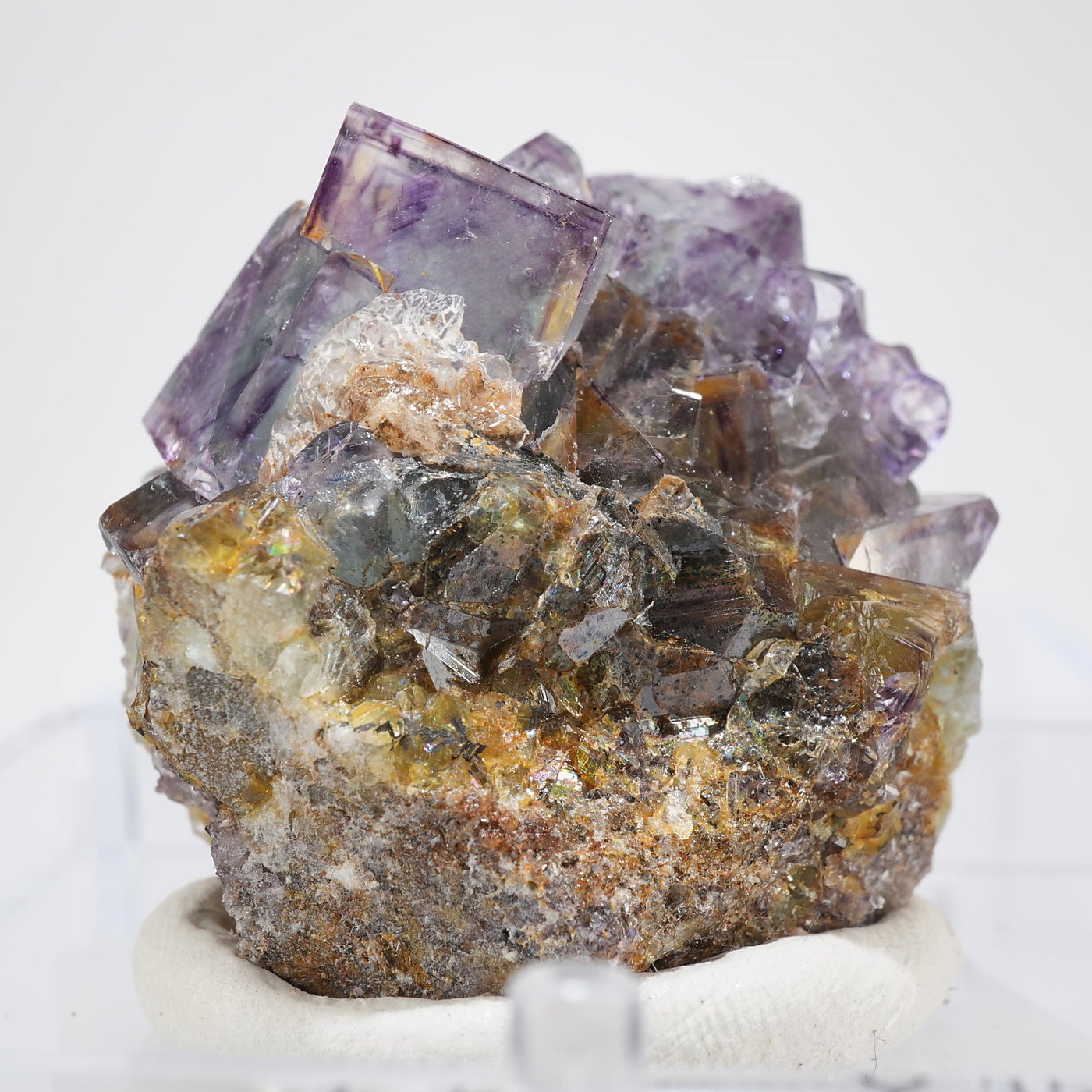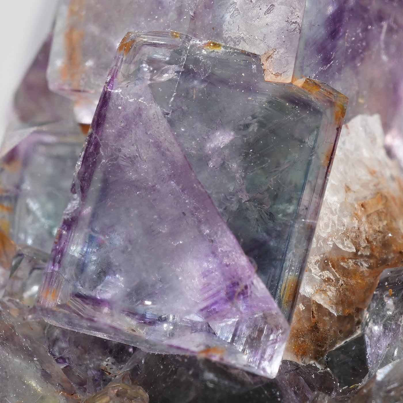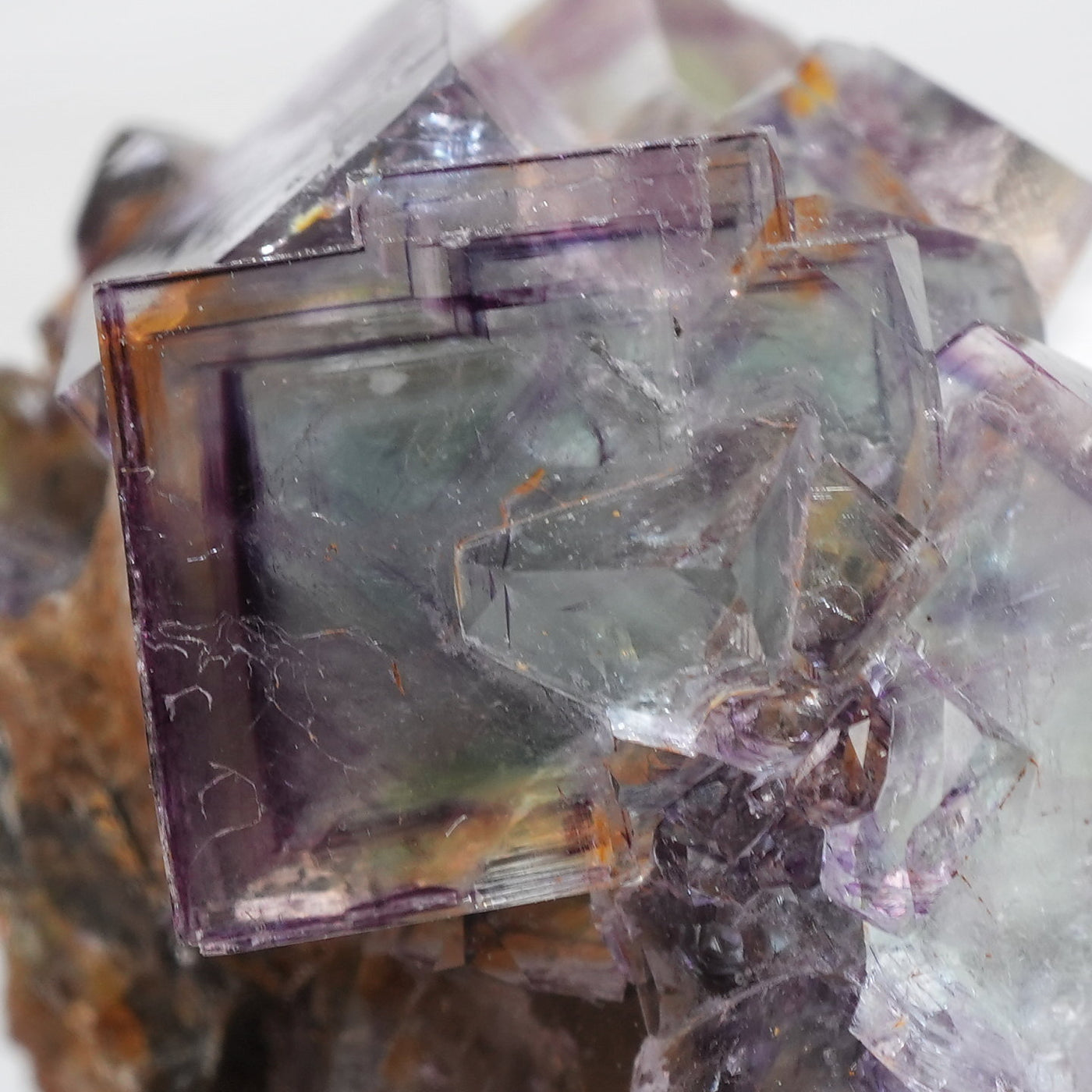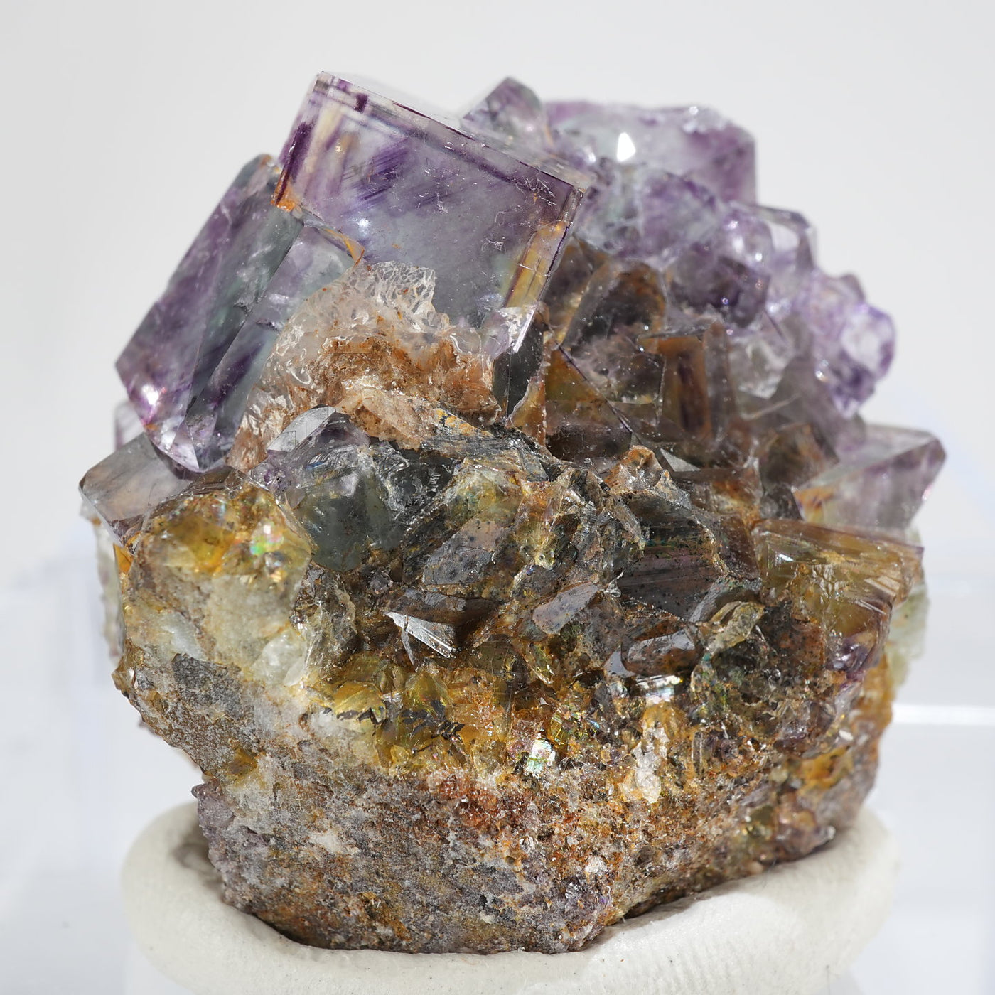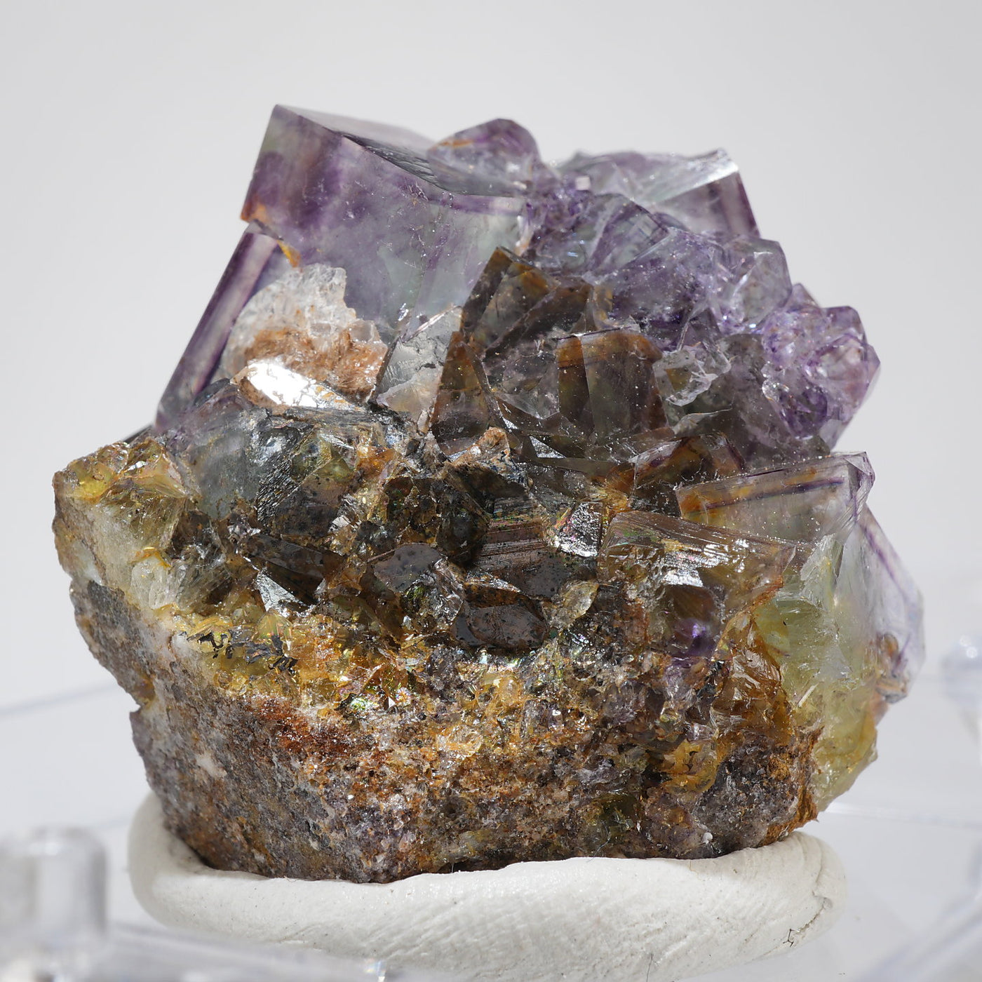 人気のナミビア産のフローライト結晶です。照りのある表面、淡いグリーンを縁取るようにみられるパープルのゾーニング、部分的にみられるイエローの色合いが綺麗です。光を透過させると色のコントラストがより一層際立ちます。紫外線ライトを当てると蛍光します。※撮影に使用しているライトは、紫外線ライト365nm5wタイプです。