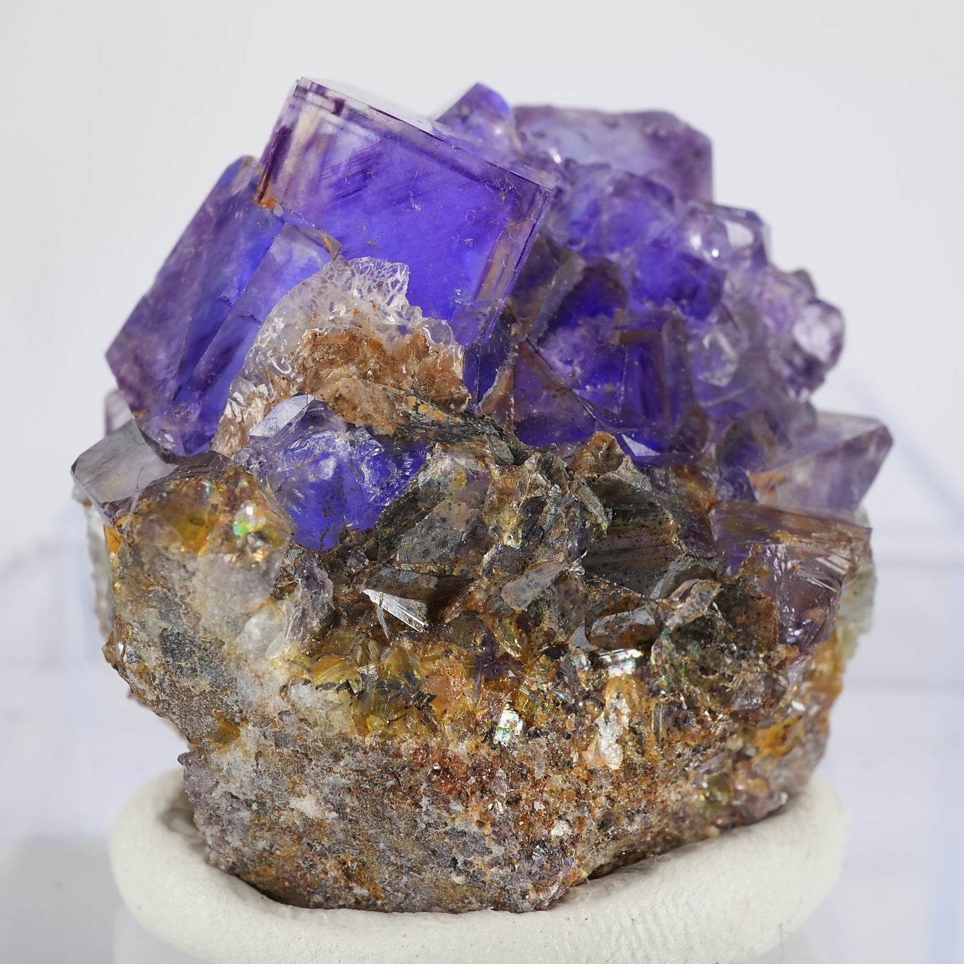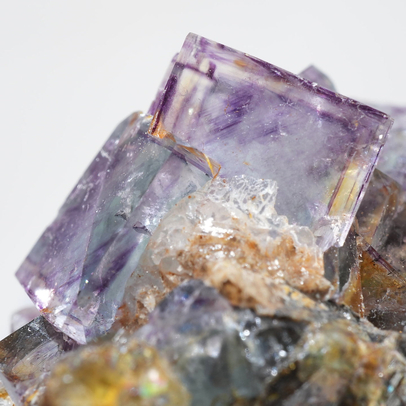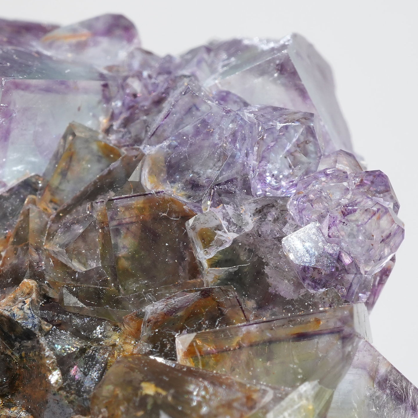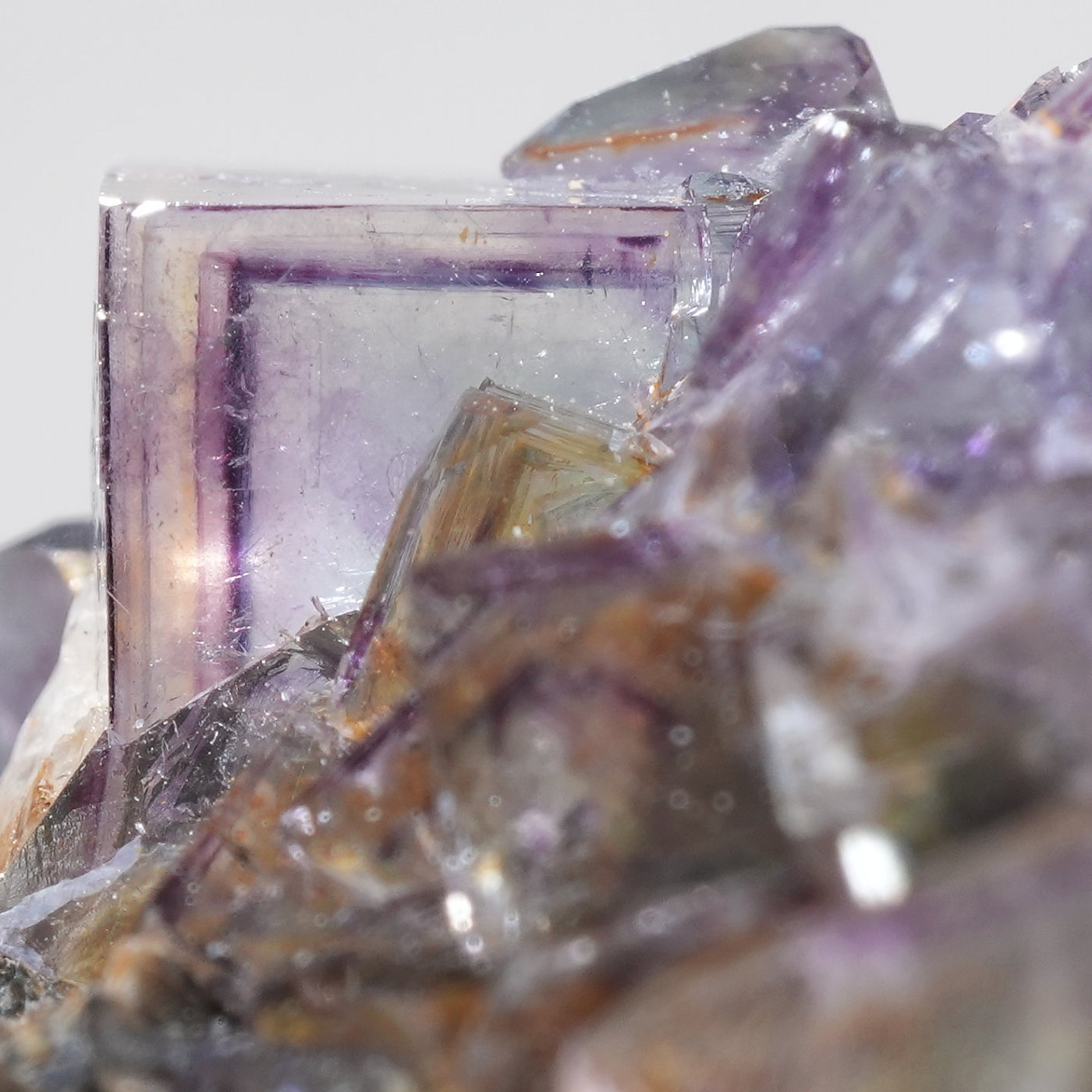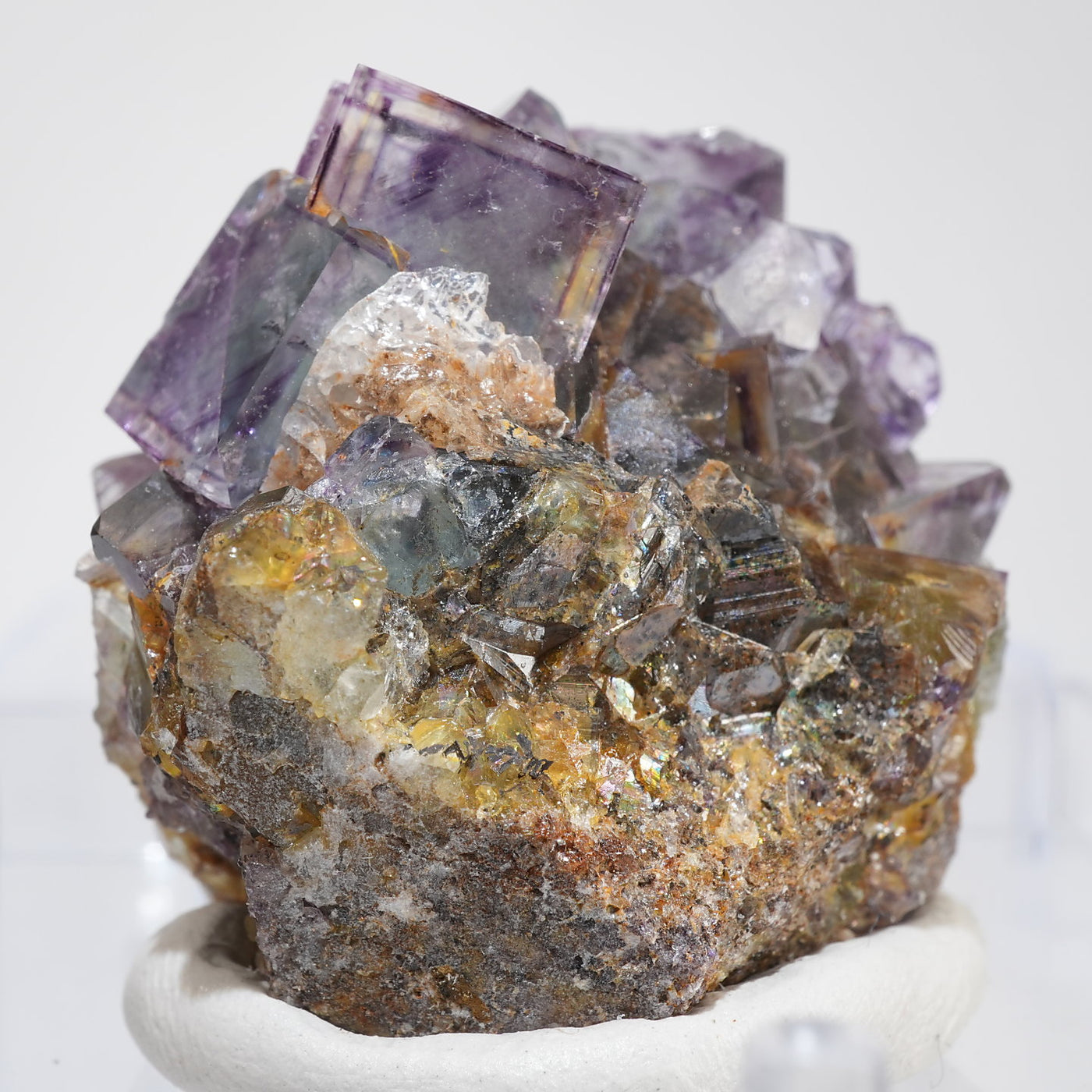 人気のナミビア産のフローライト結晶です。照りのある表面、淡いグリーンを縁取るようにみられるパープルのゾーニング、部分的にみられるイエローの色合いが綺麗です。光を透過させると色のコントラストがより一層際立ちます。紫外線ライトを当てると蛍光します。※撮影に使用しているライトは、紫外線ライト365nm5wタイプです。