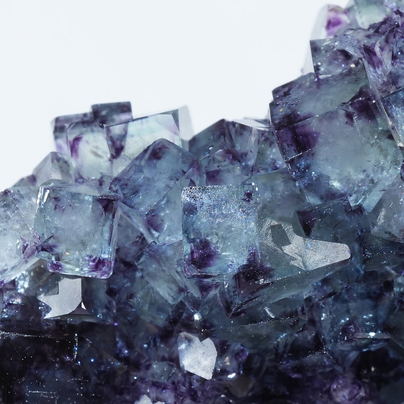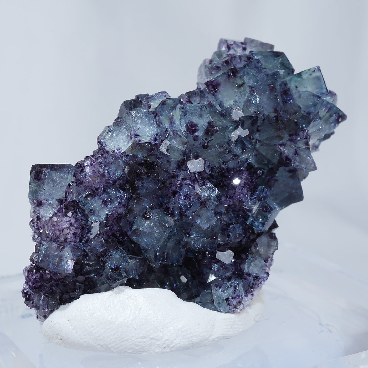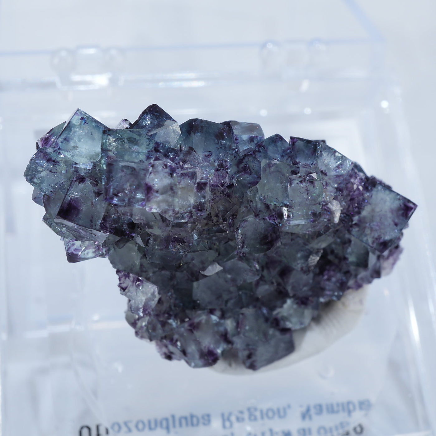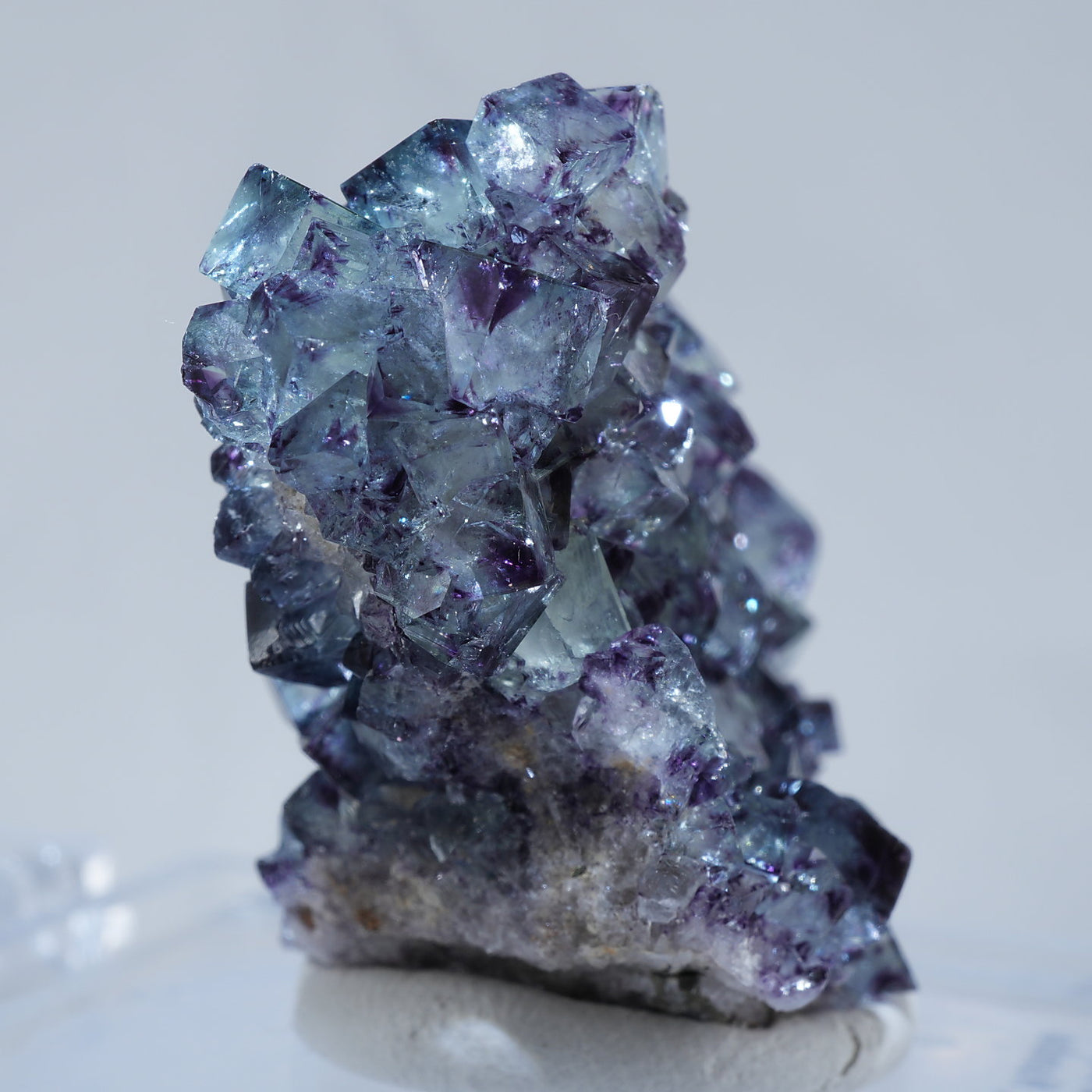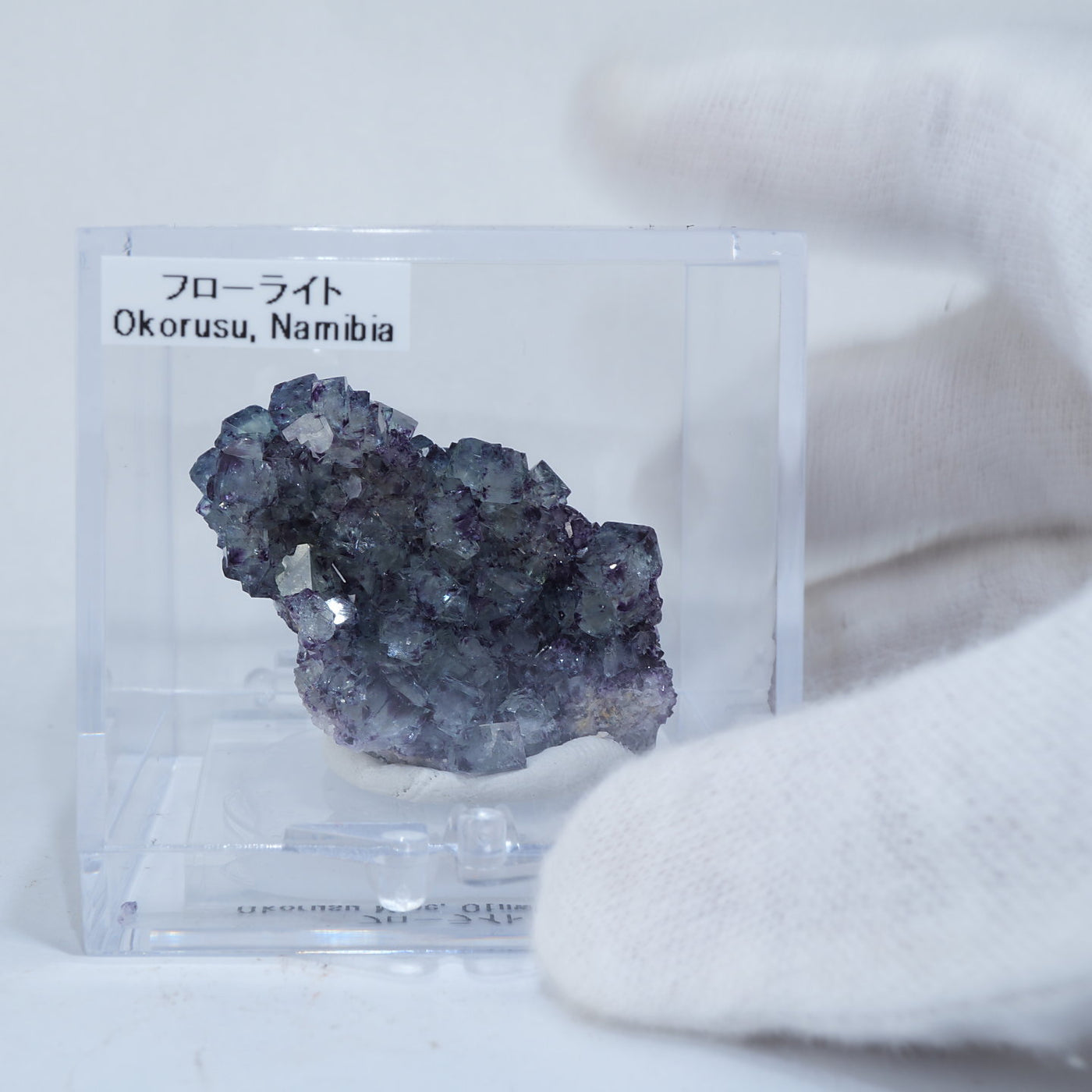 人気のナミビア産のフローライトです。照りと透明感のある美しい標本です。淡いグリーンを縁取るように四隅が濃紫色~紺色になっています。光を透過させると色のコントラストがより一層際立ち綺麗です。表裏両面に結晶がみられ、見ごたえがあります。紫外線ライトを当てると蛍光します。※撮影に使用しているライトは、紫外線ライト365nm5wタイプです。