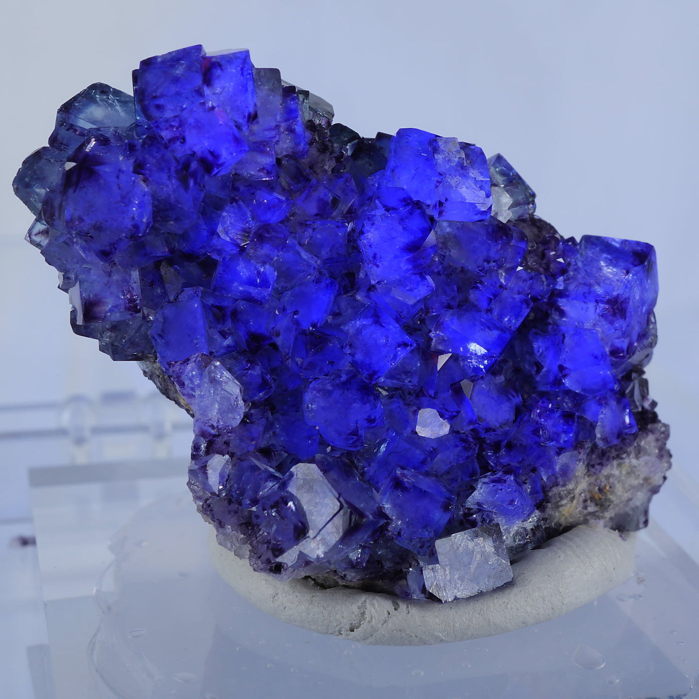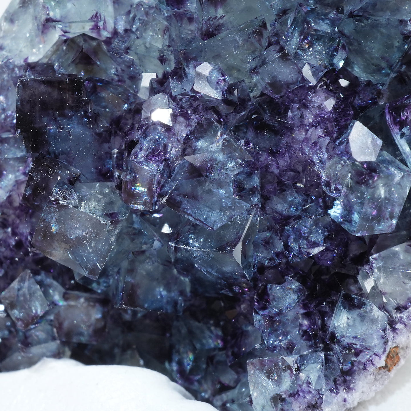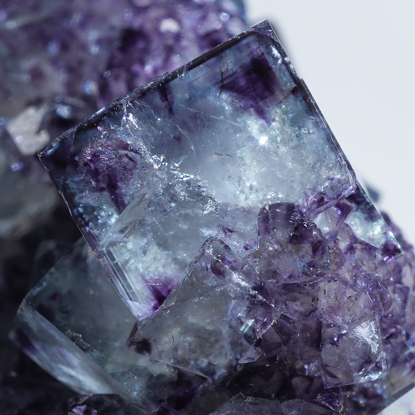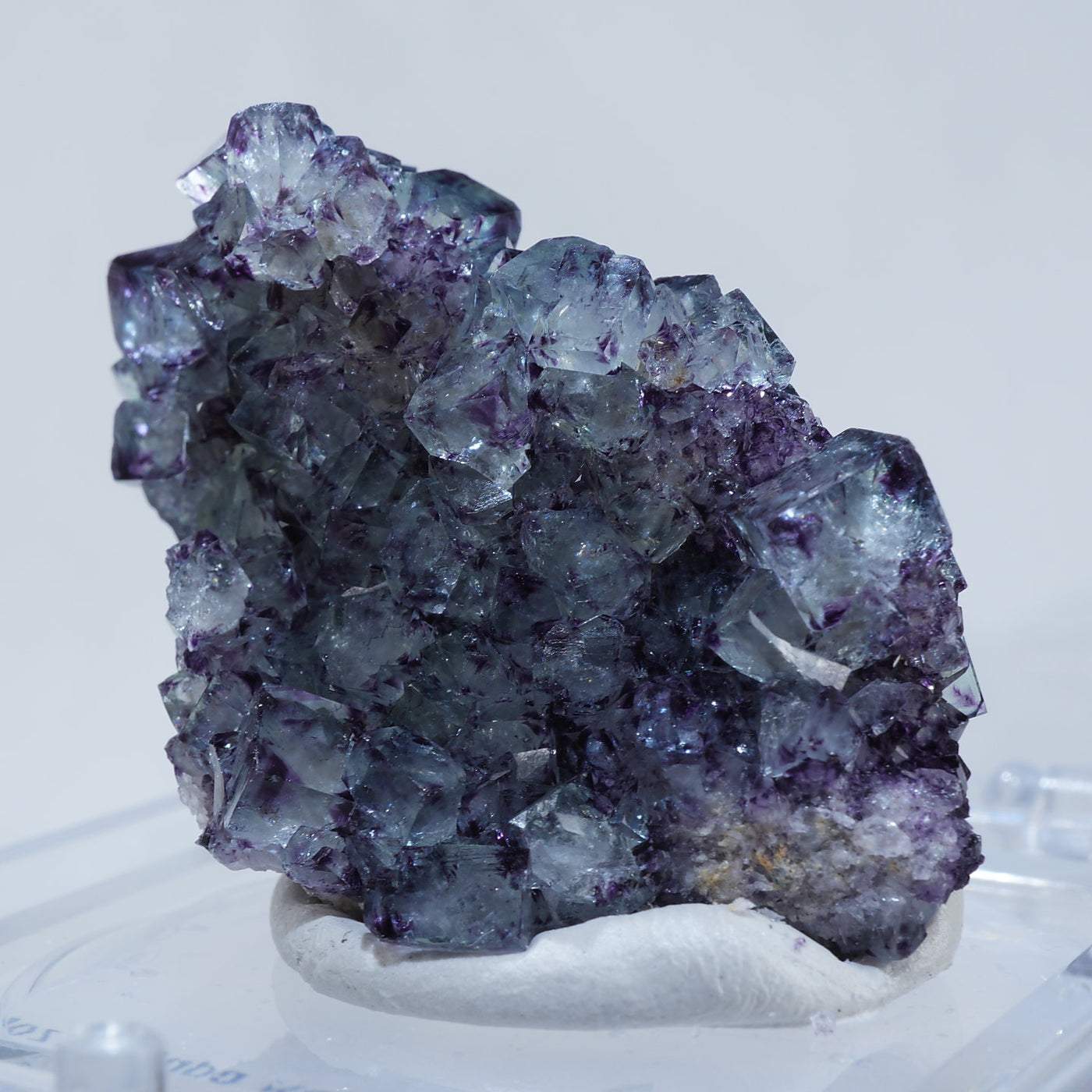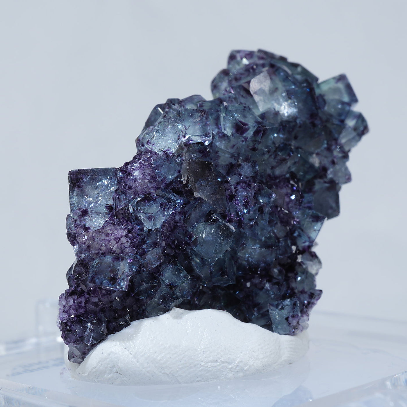 人気のナミビア産のフローライトです。照りと透明感のある美しい標本です。淡いグリーンを縁取るように四隅が濃紫色~紺色になっています。光を透過させると色のコントラストがより一層際立ち綺麗です。表裏両面に結晶がみられ、見ごたえがあります。紫外線ライトを当てると蛍光します。※撮影に使用しているライトは、紫外線ライト365nm5wタイプです。