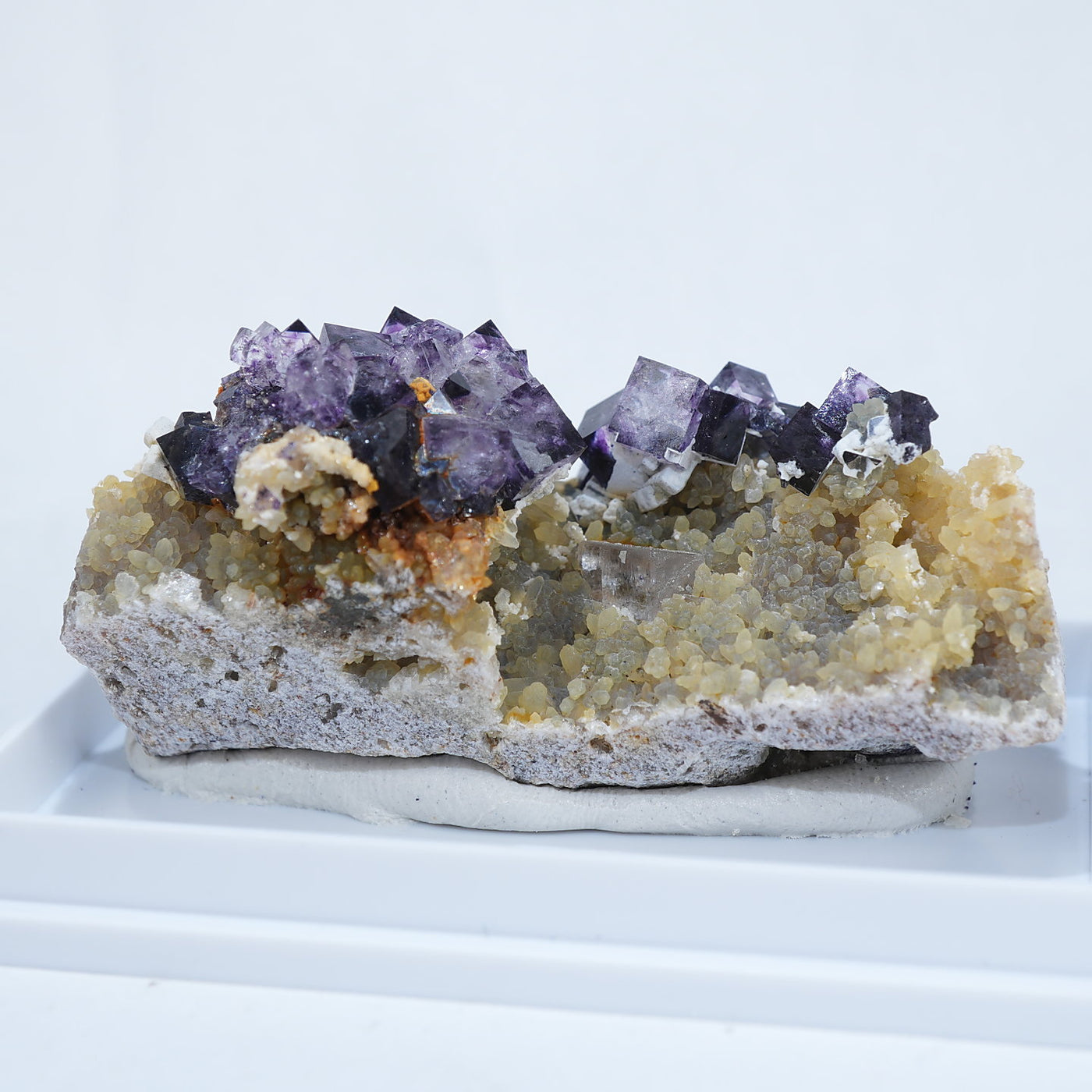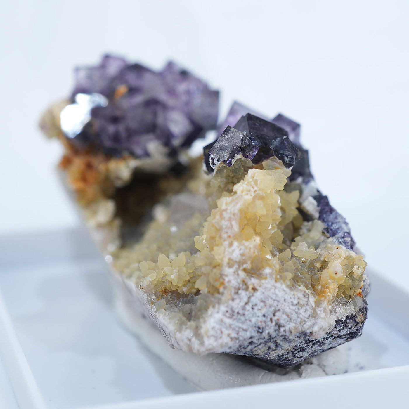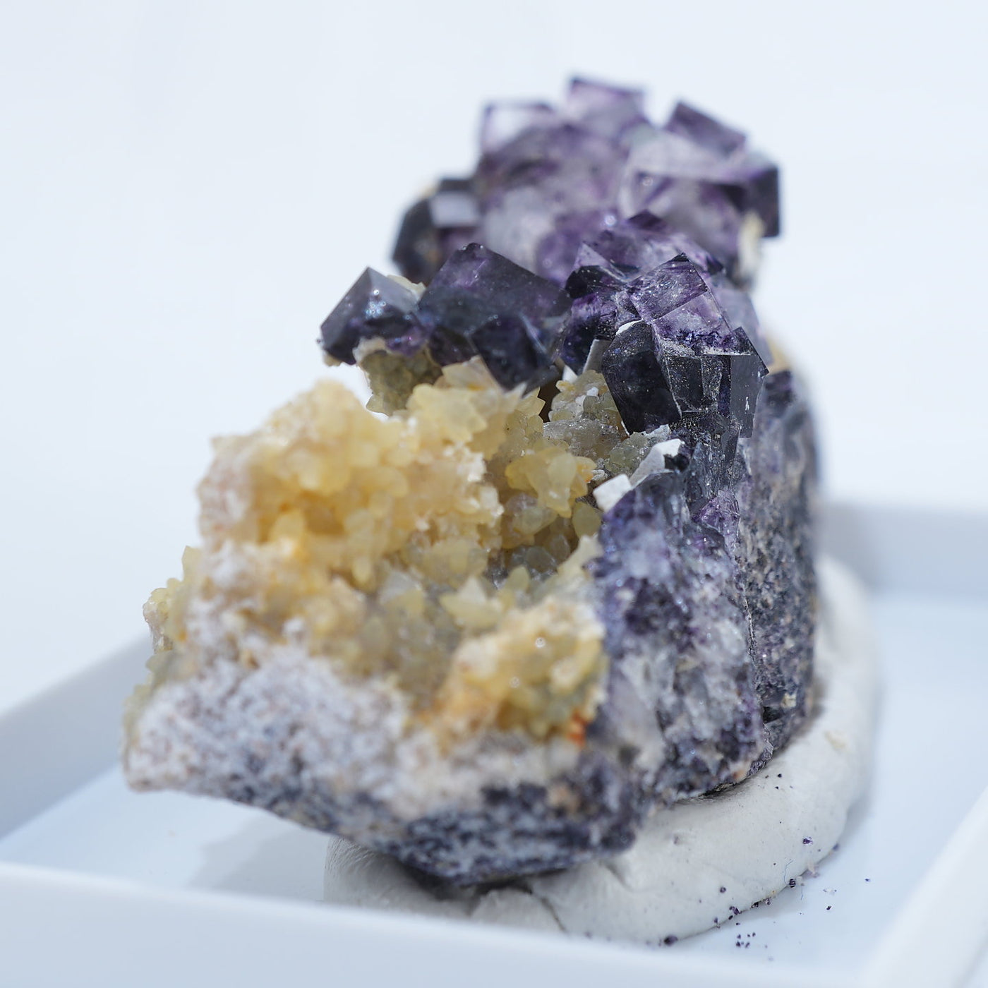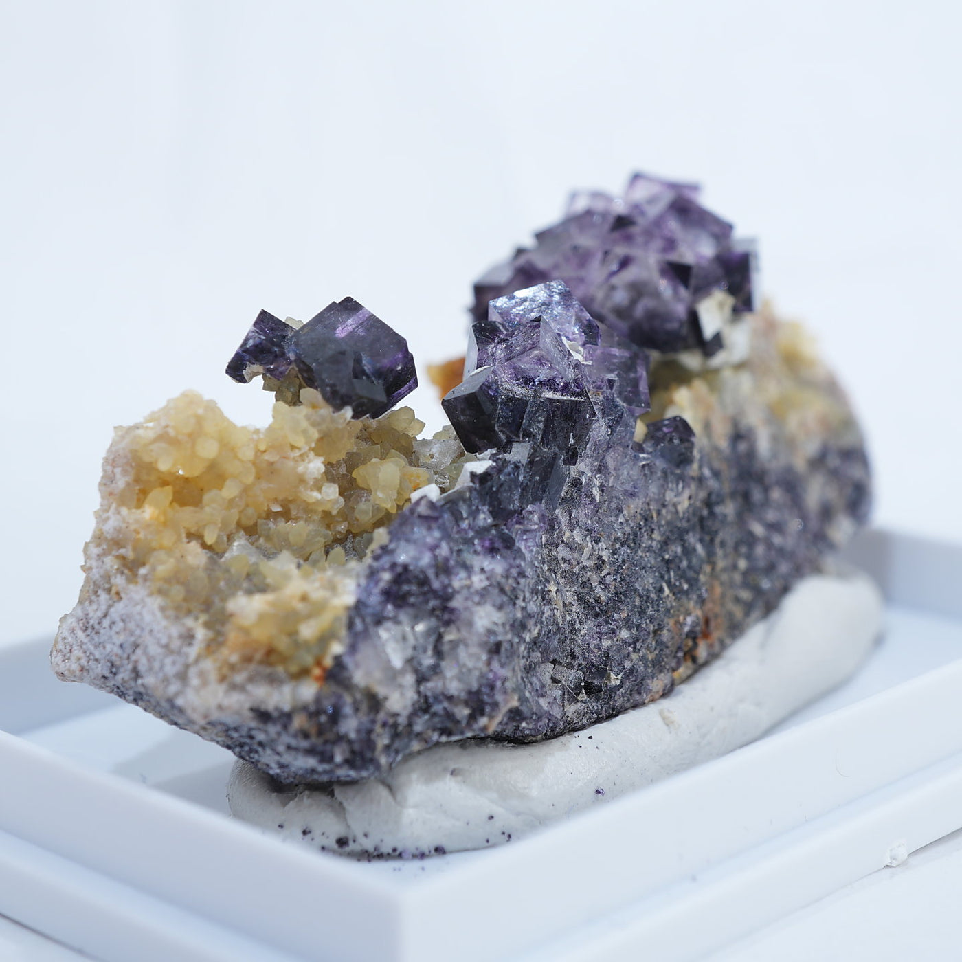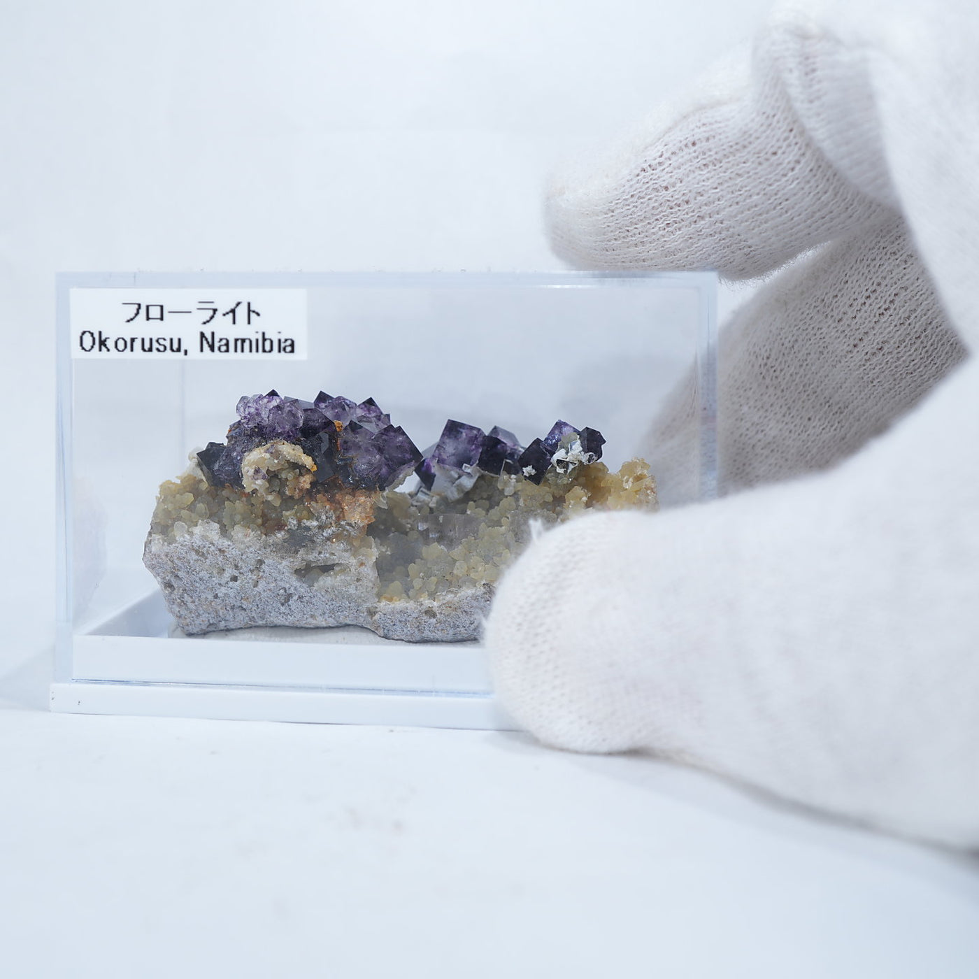 人気のナミビア産のフローライトです。シャープなスクエアの結晶が印象的です。全体が濃いパープルのものと、四隅が濃い紫色になっているものがみられます。紫外線ライトを当てると蛍光します。※撮影に使用しているライトは、紫外線ライト365nm5wタイプです。