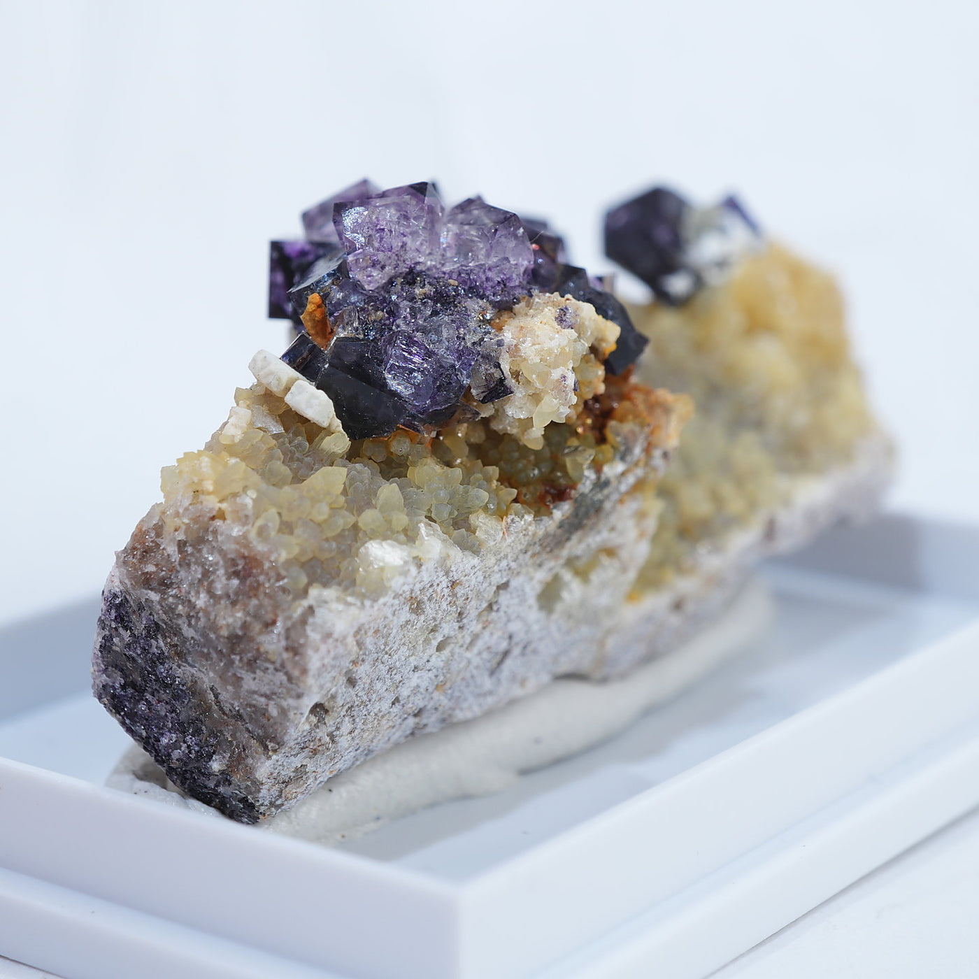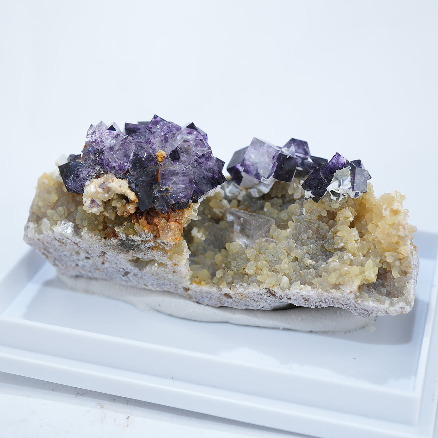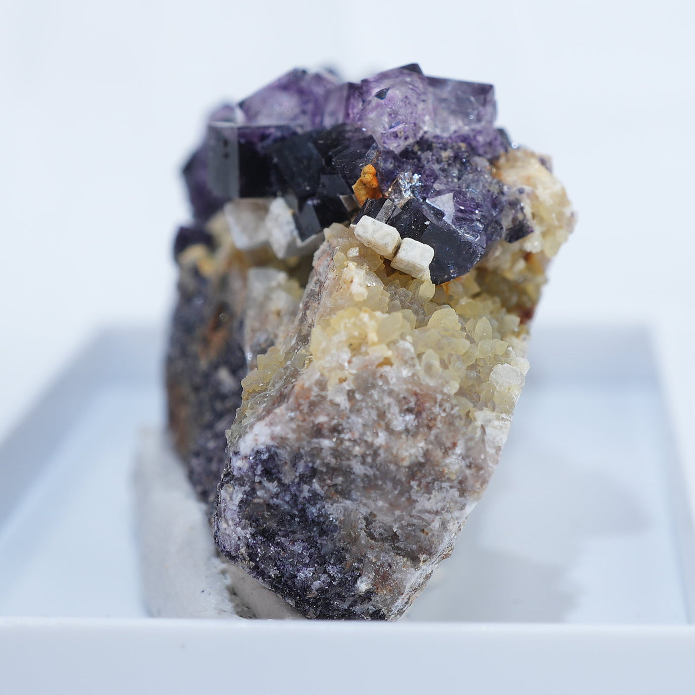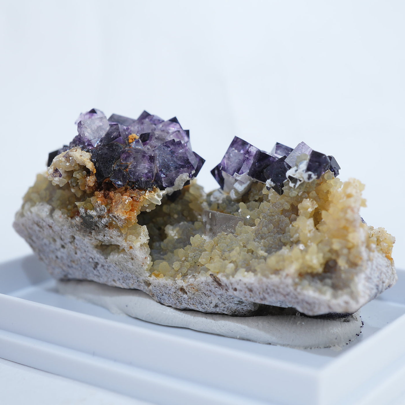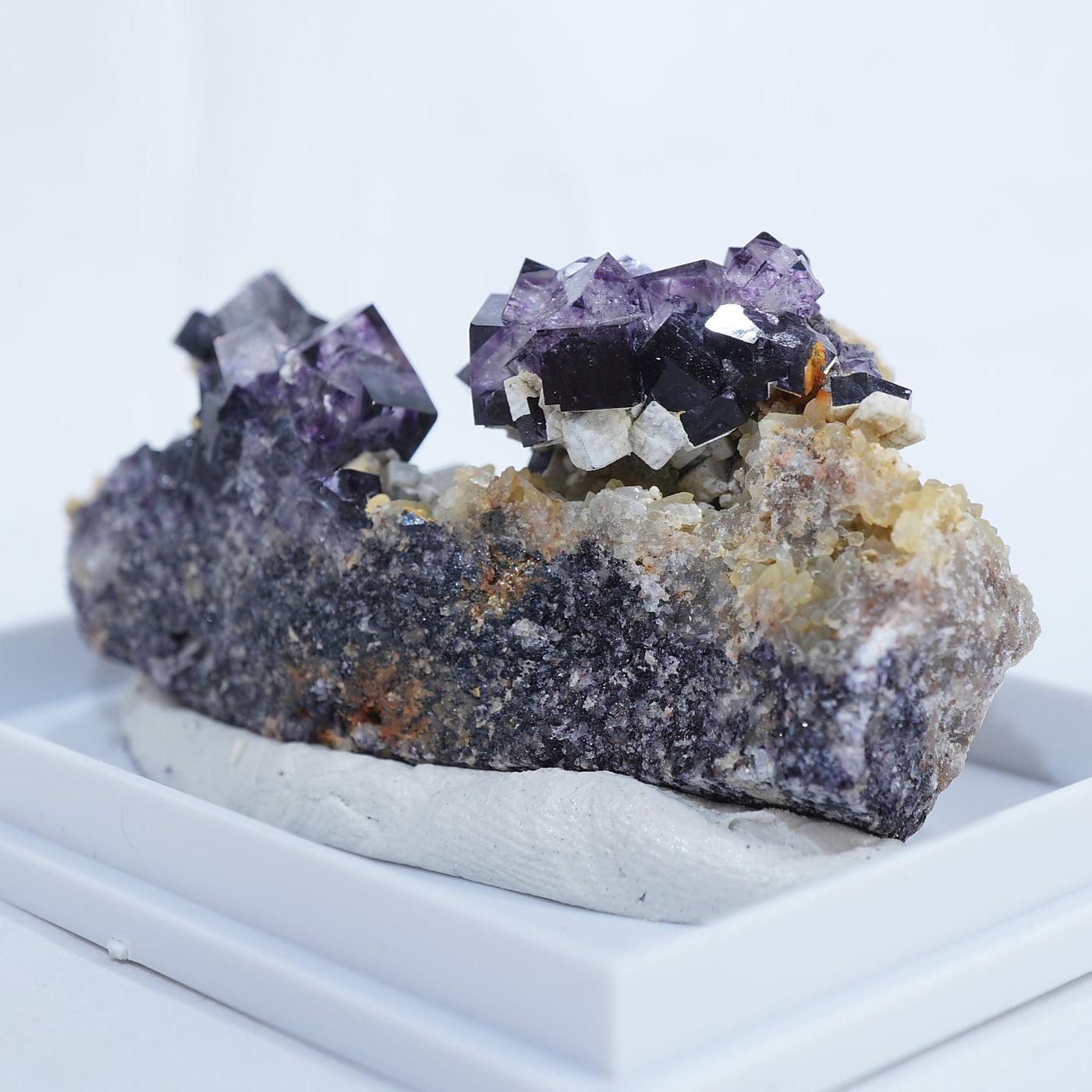 人気のナミビア産のフローライトです。シャープなスクエアの結晶が印象的です。全体が濃いパープルのものと、四隅が濃い紫色になっているものがみられます。紫外線ライトを当てると蛍光します。※撮影に使用しているライトは、紫外線ライト365nm5wタイプです。
