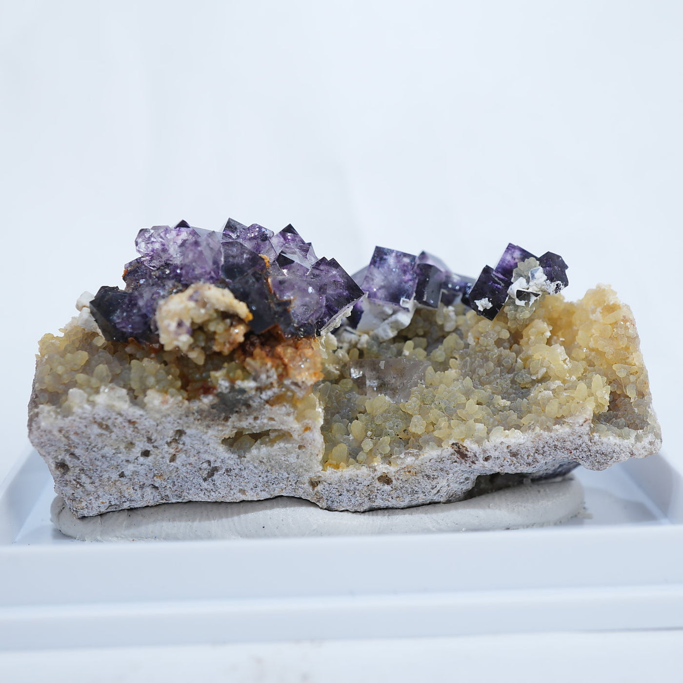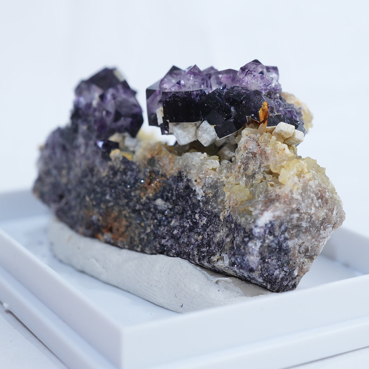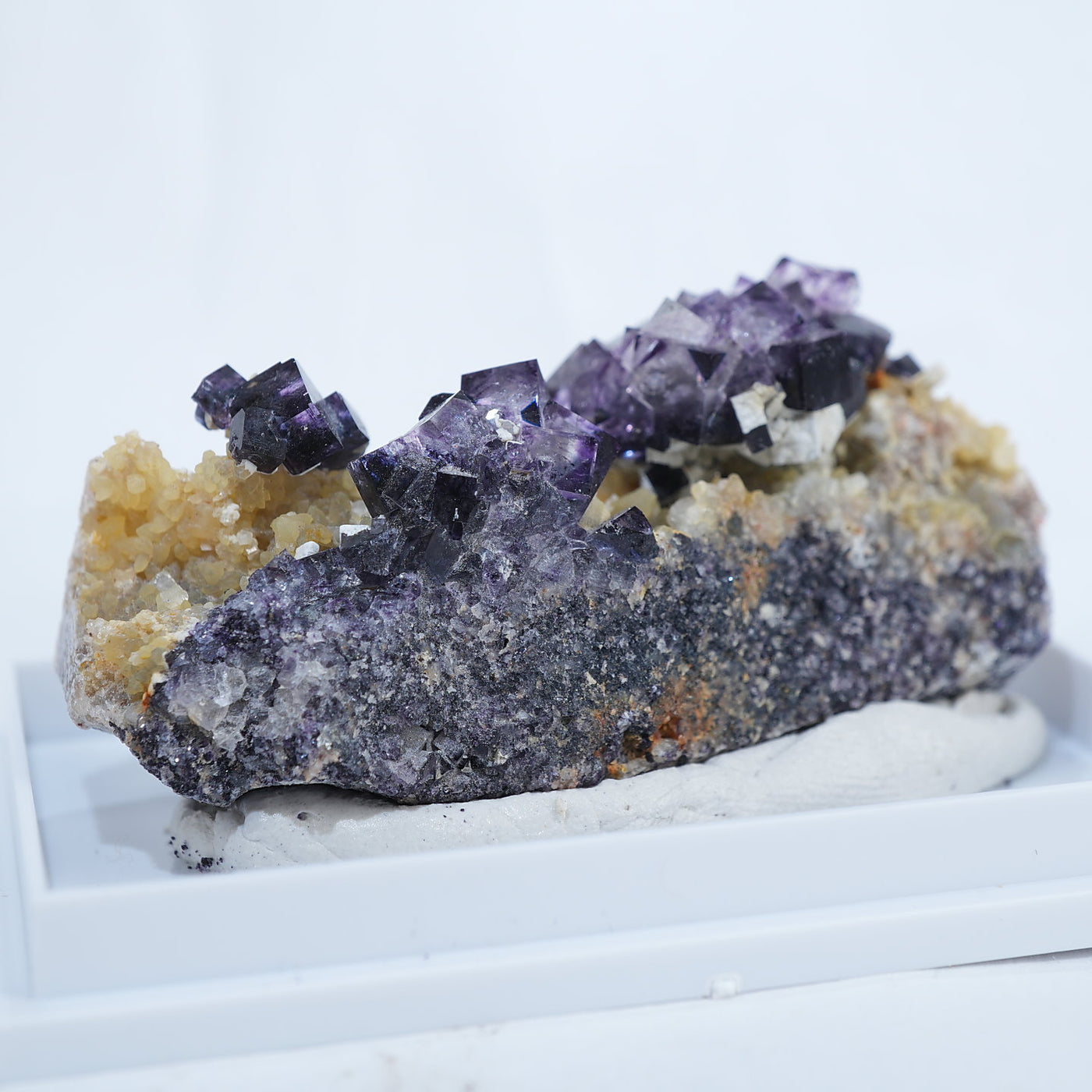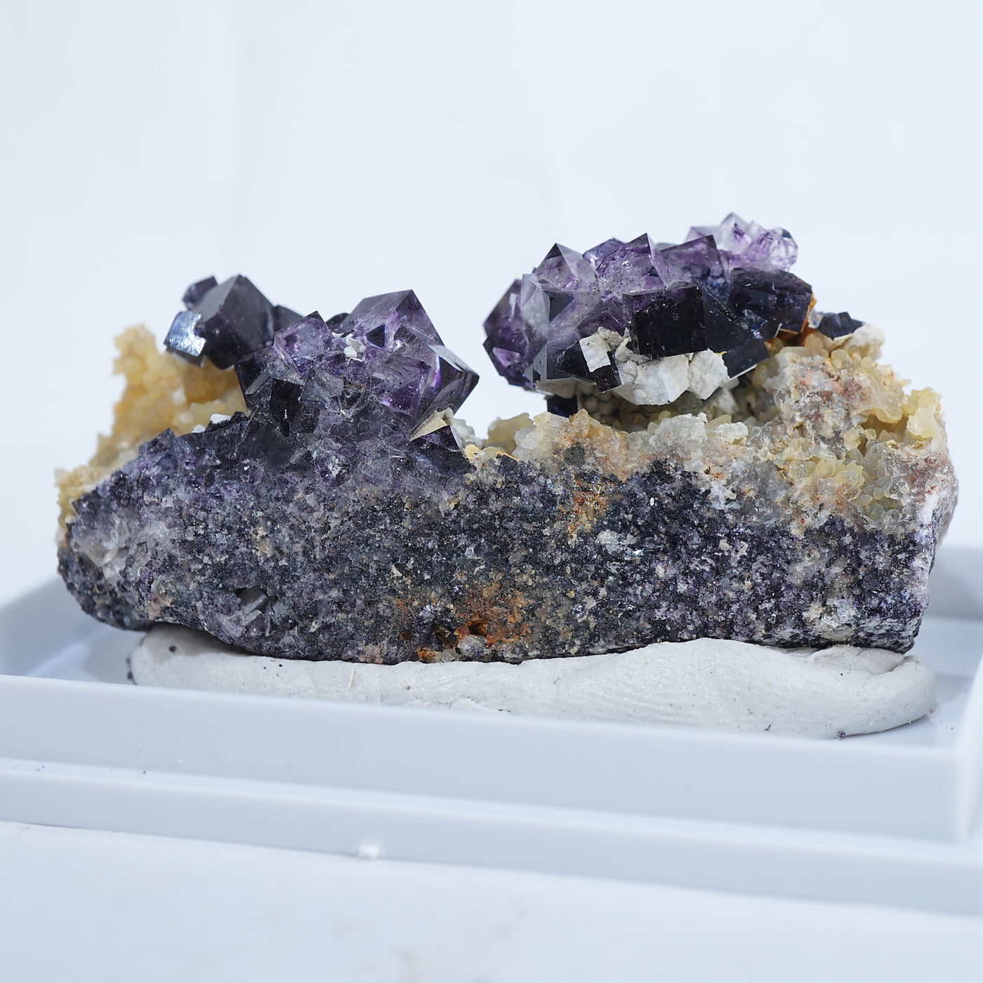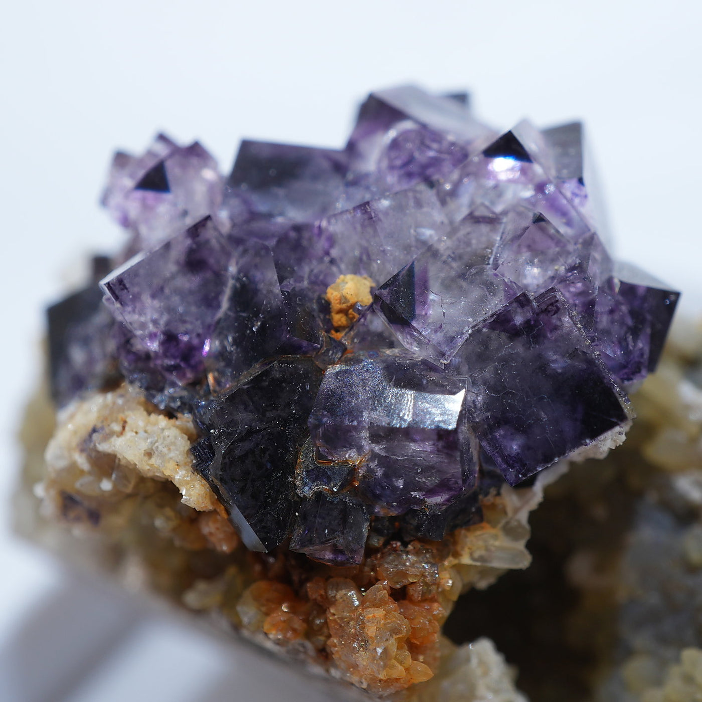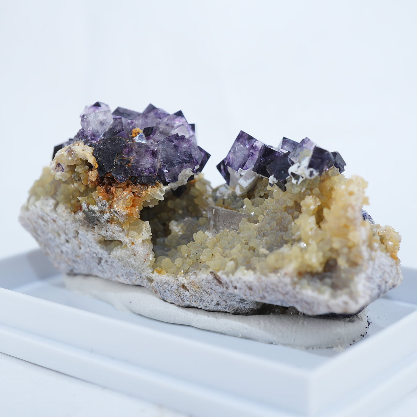 人気のナミビア産のフローライトです。シャープなスクエアの結晶が印象的です。全体が濃いパープルのものと、四隅が濃い紫色になっているものがみられます。紫外線ライトを当てると蛍光します。※撮影に使用しているライトは、紫外線ライト365nm5wタイプです。