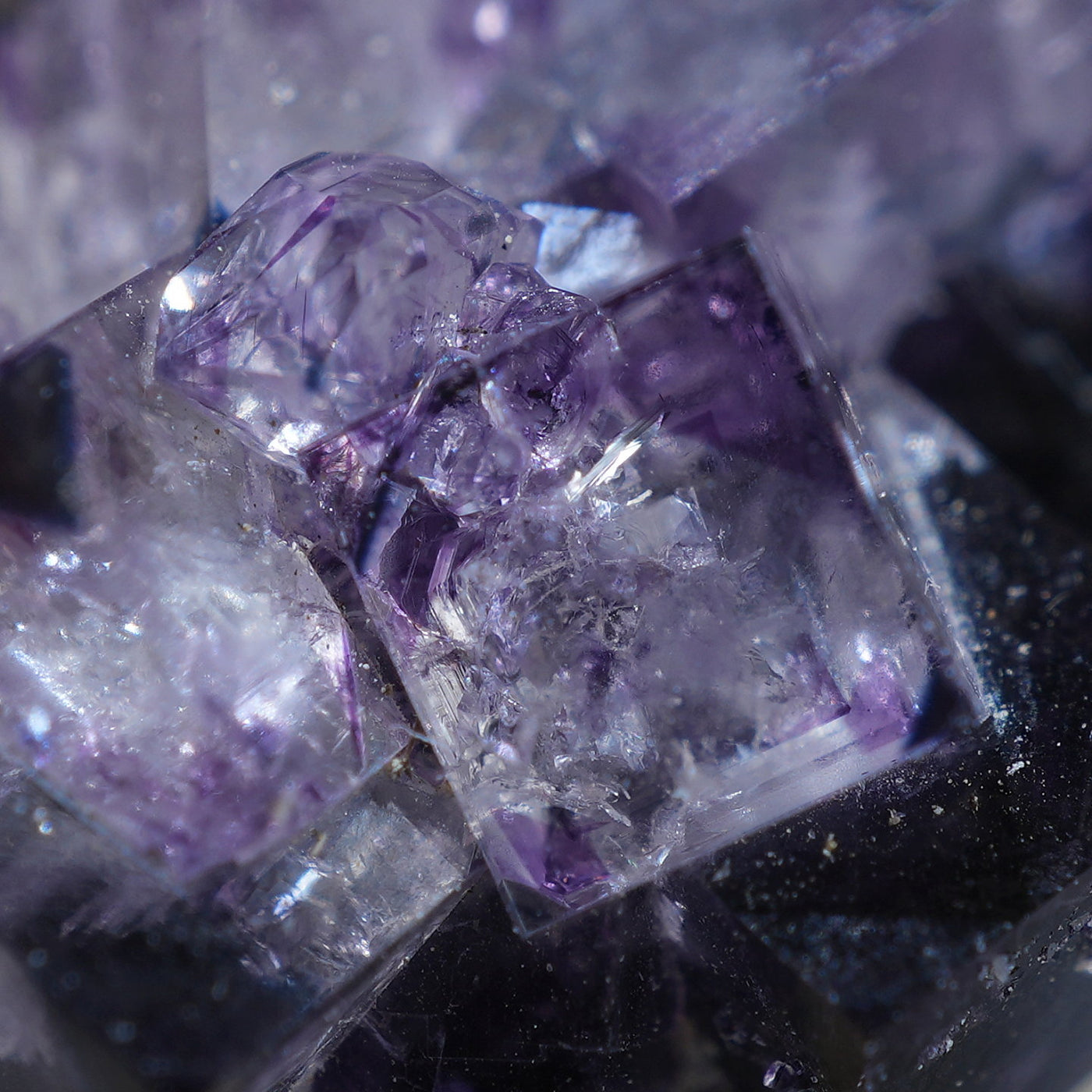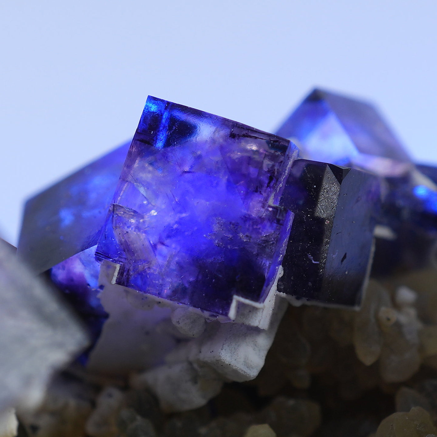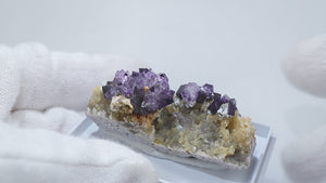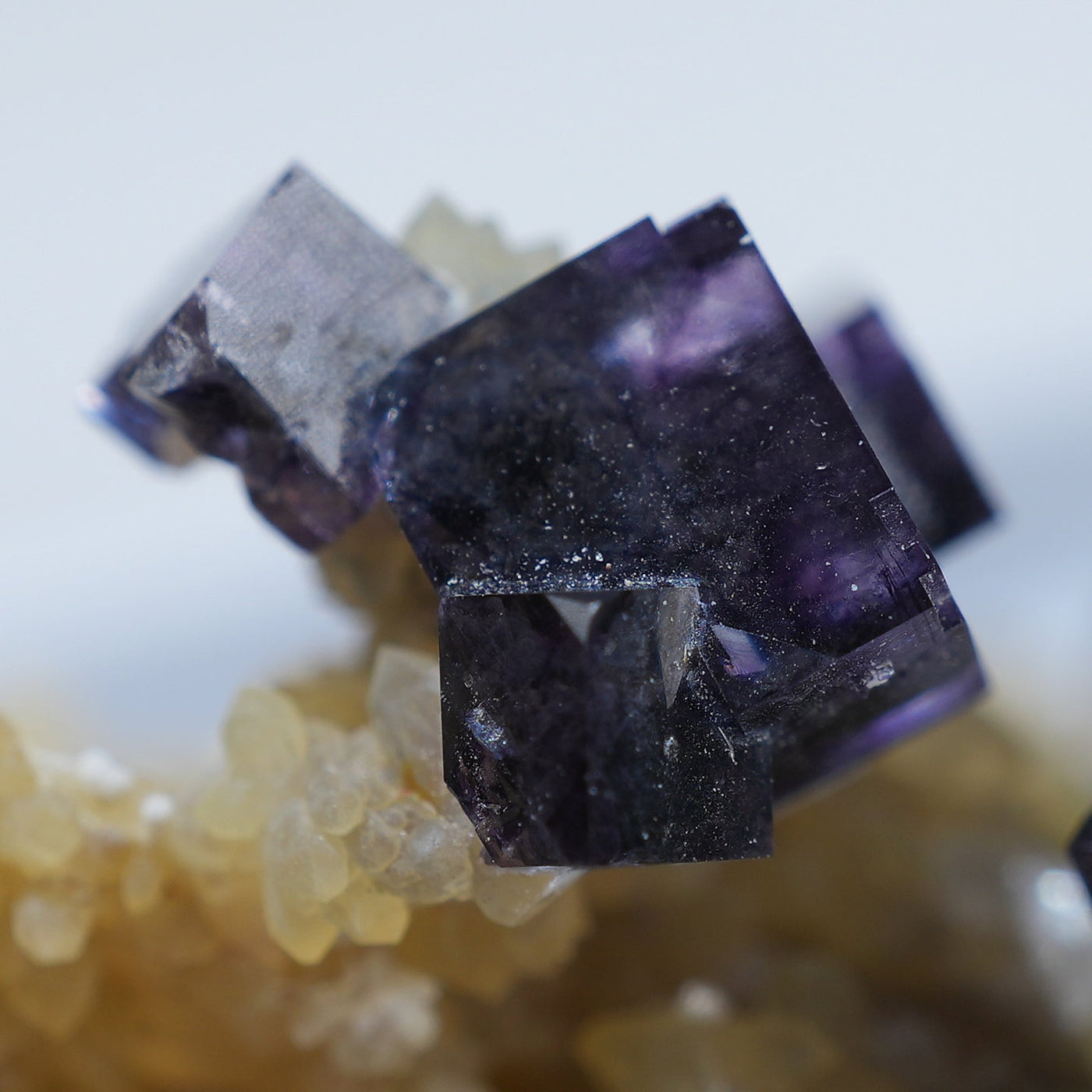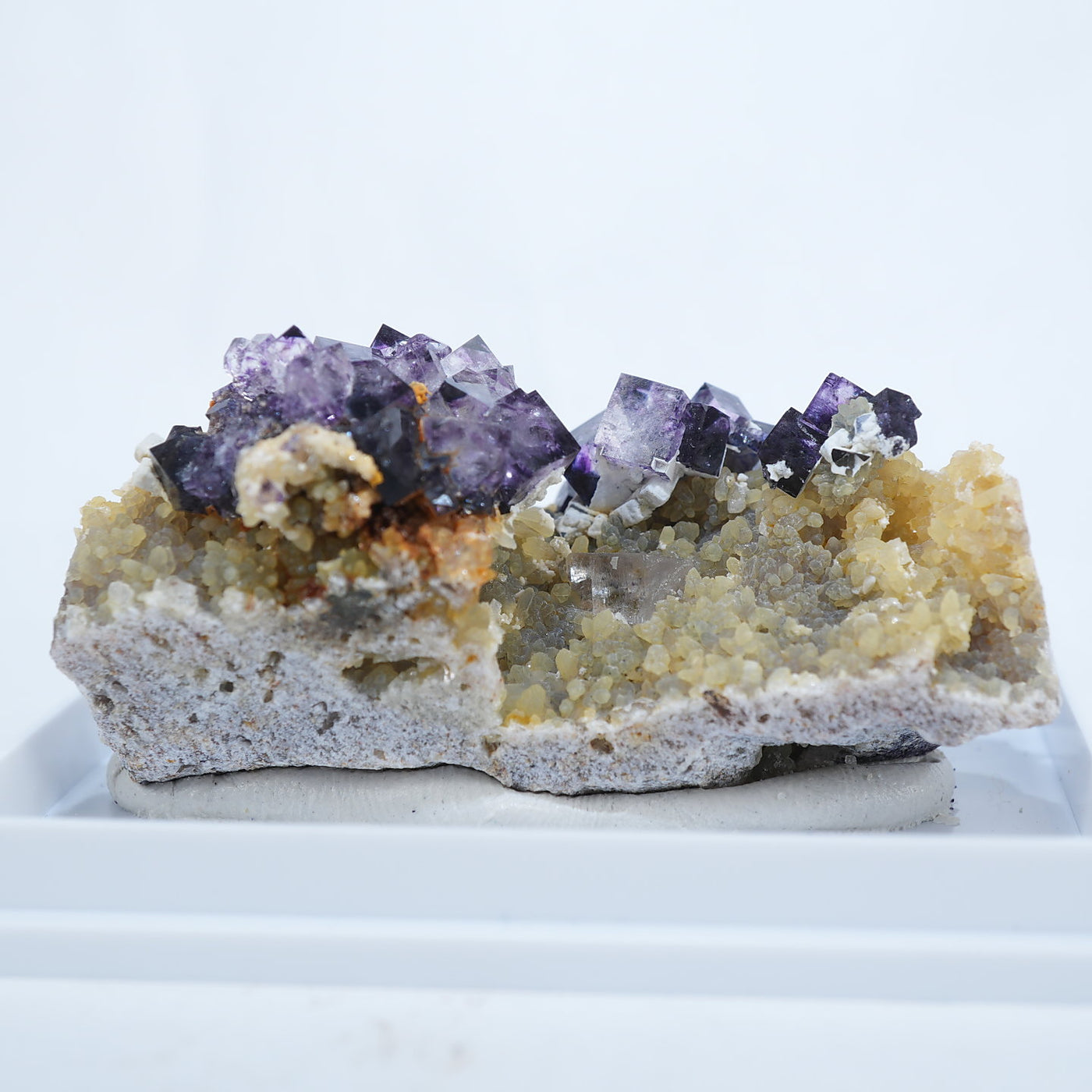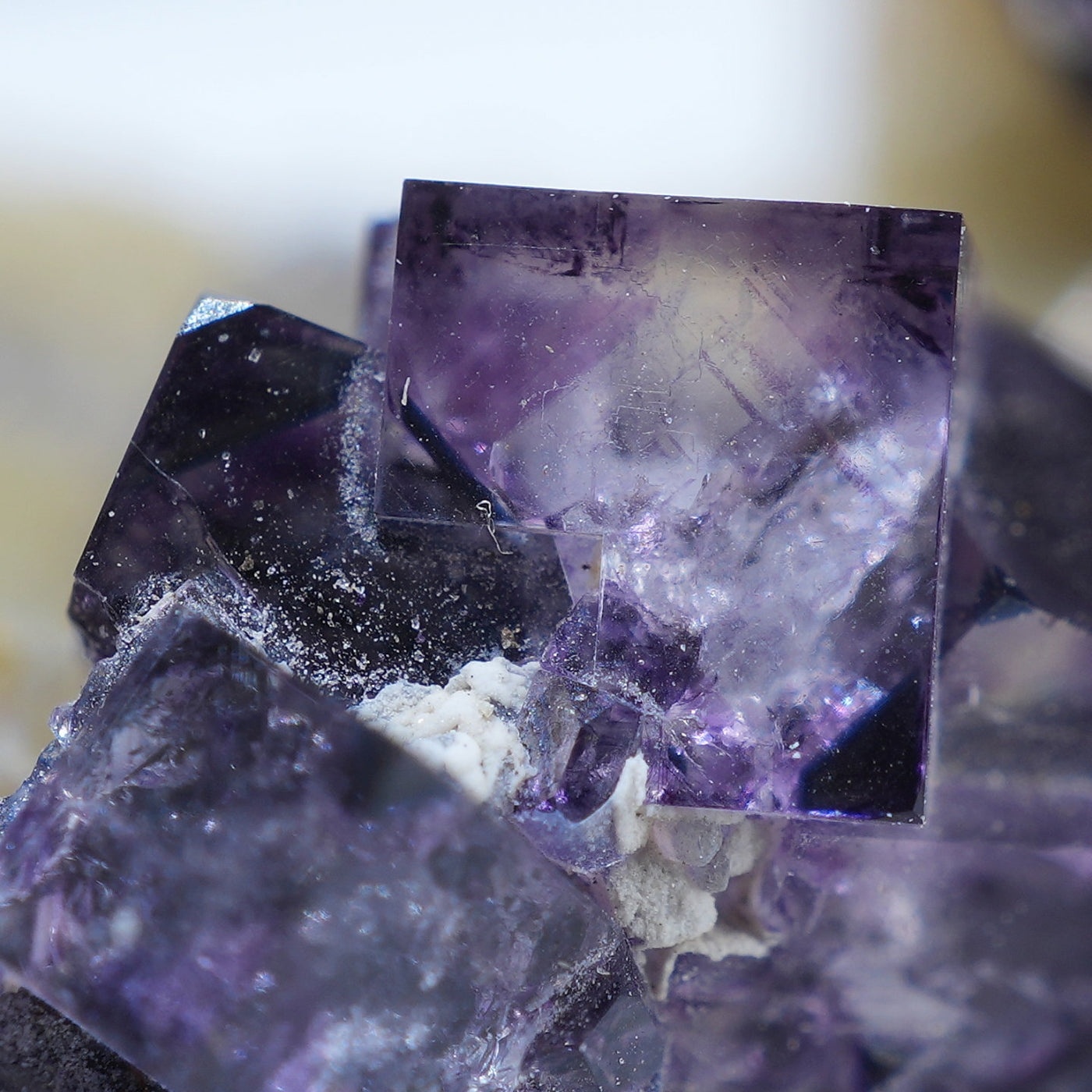 人気のナミビア産のフローライトです。シャープなスクエアの結晶が印象的です。全体が濃いパープルのものと、四隅が濃い紫色になっているものがみられます。紫外線ライトを当てると蛍光します。※撮影に使用しているライトは、紫外線ライト365nm5wタイプです。