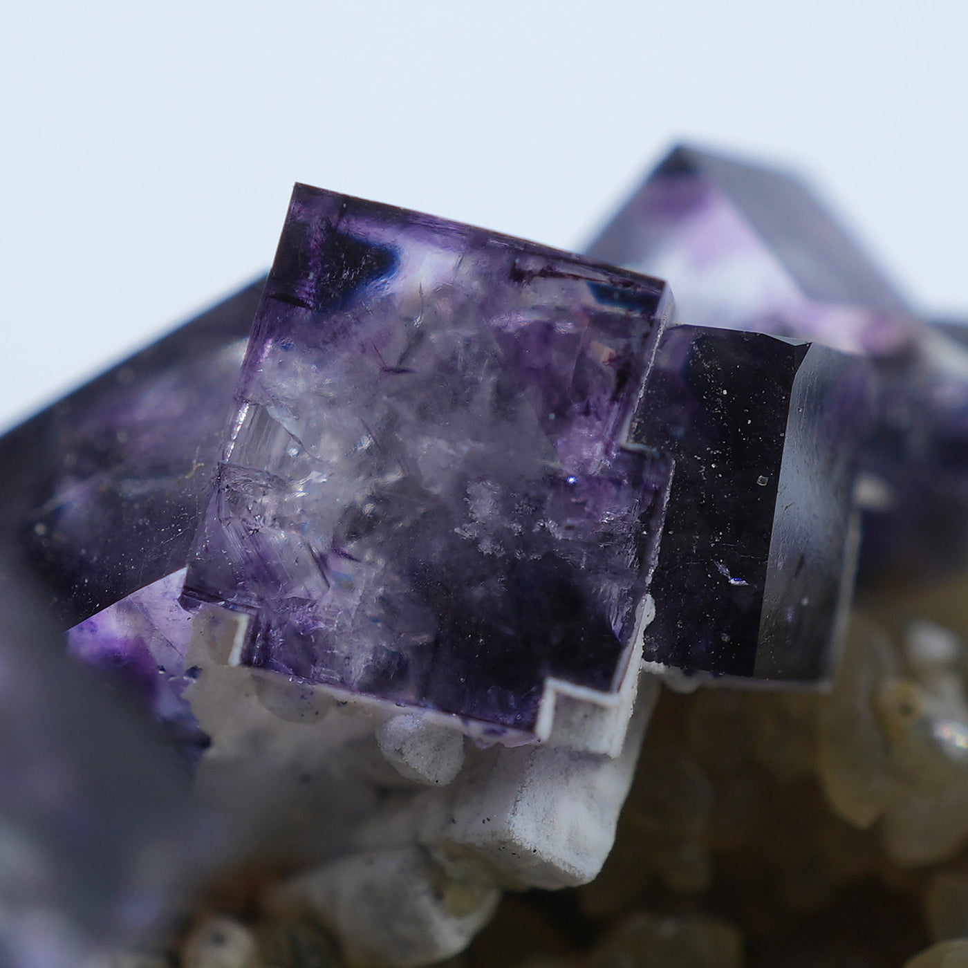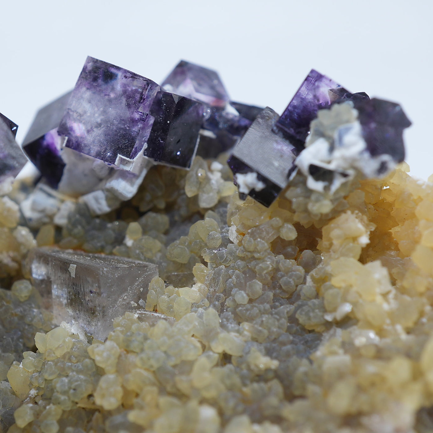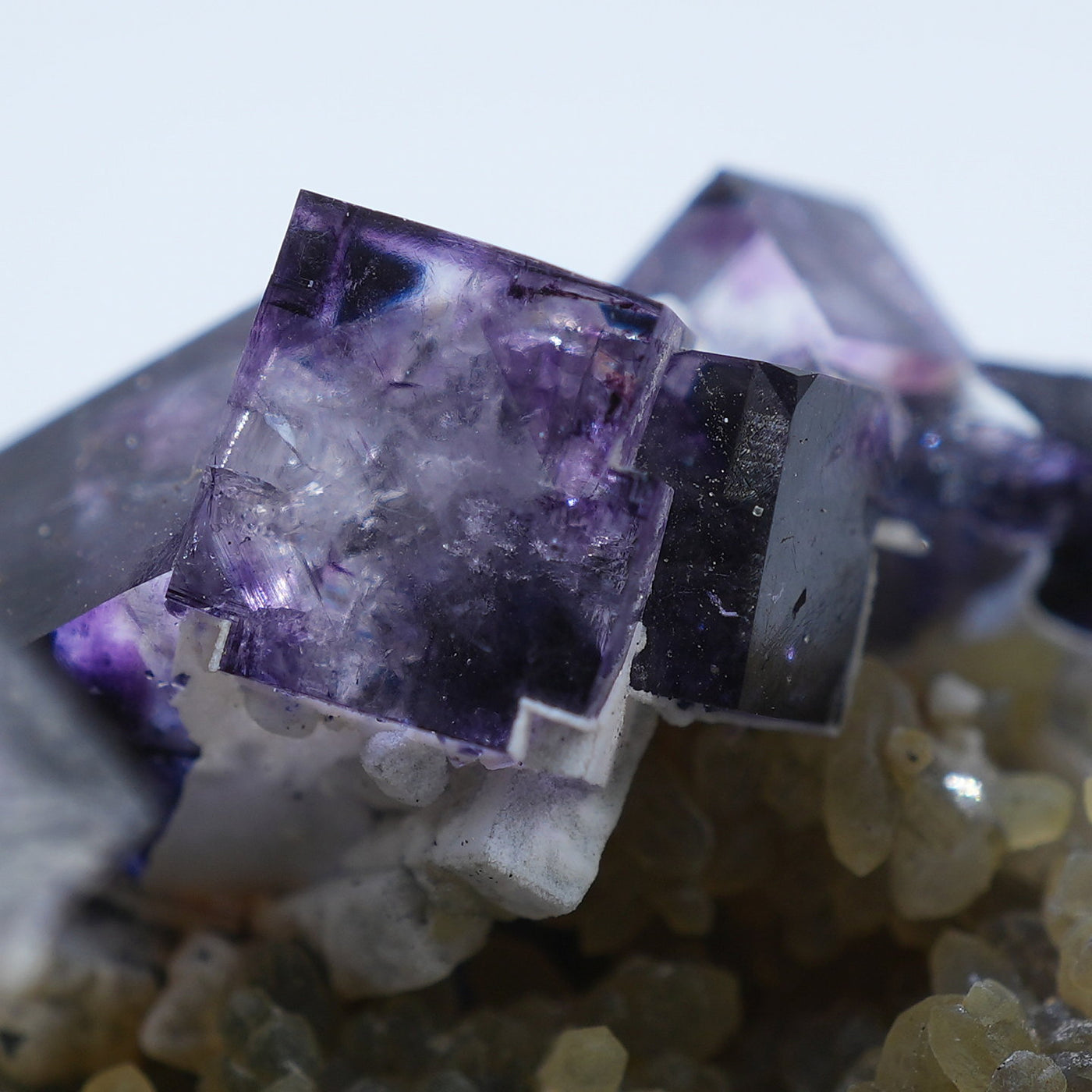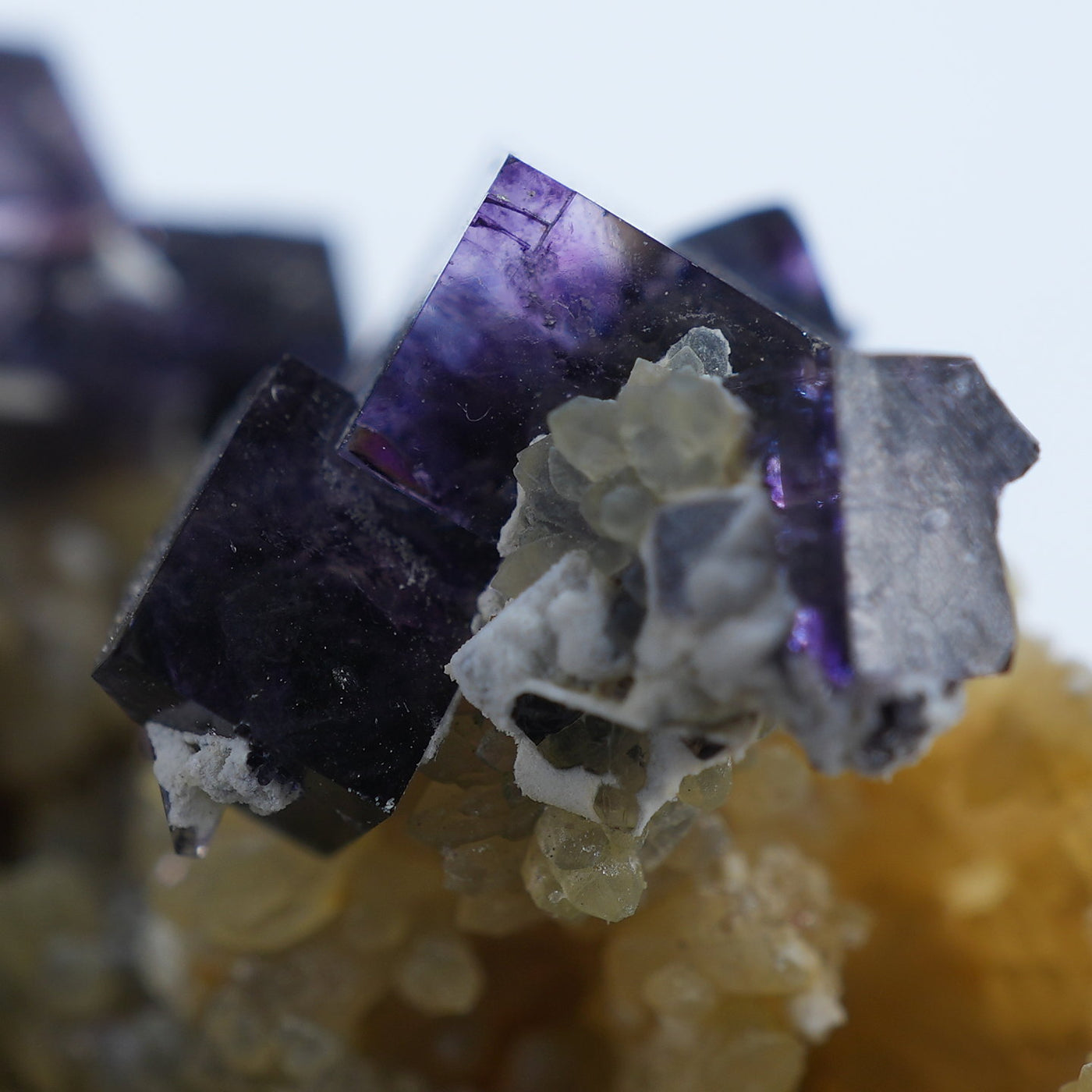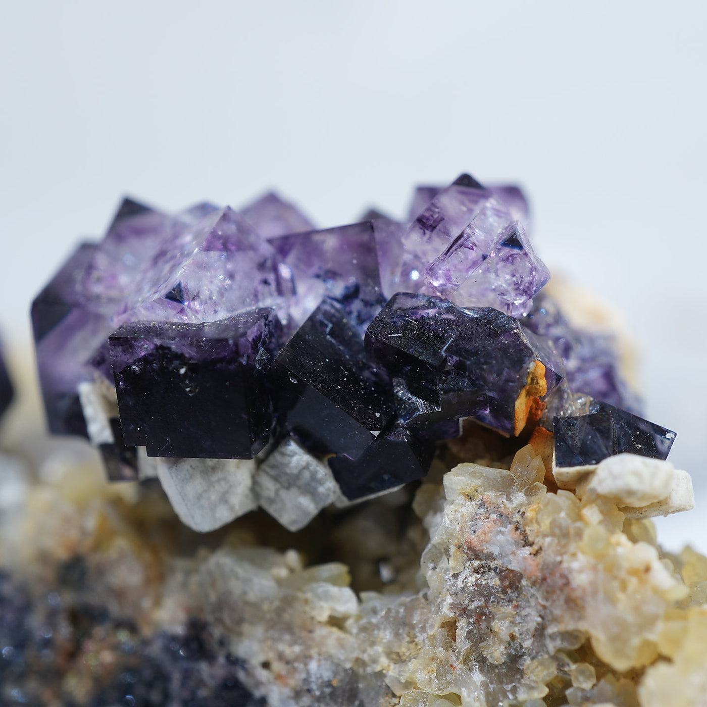 人気のナミビア産のフローライトです。シャープなスクエアの結晶が印象的です。全体が濃いパープルのものと、四隅が濃い紫色になっているものがみられます。紫外線ライトを当てると蛍光します。※撮影に使用しているライトは、紫外線ライト365nm5wタイプです。