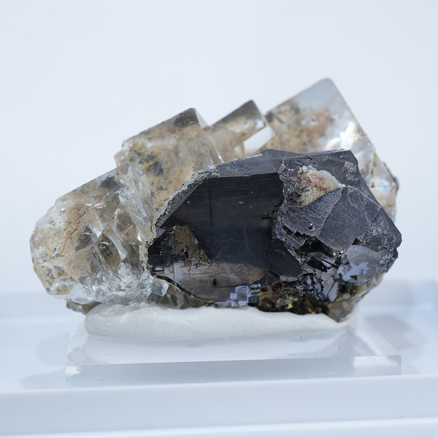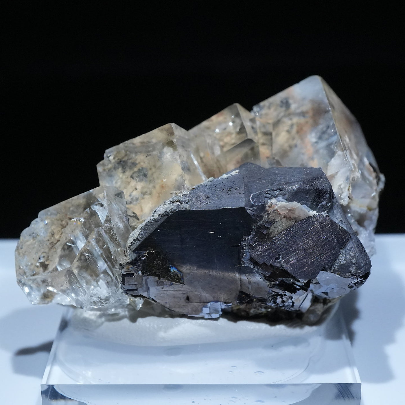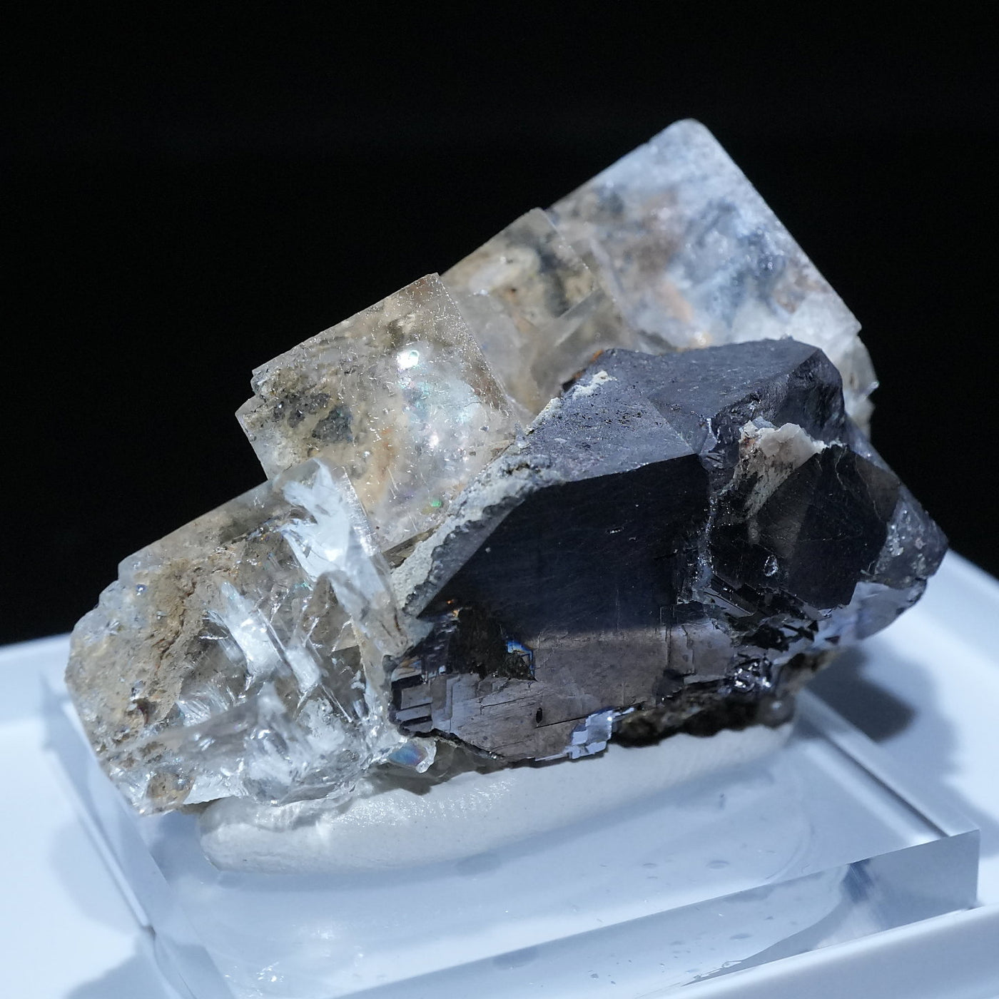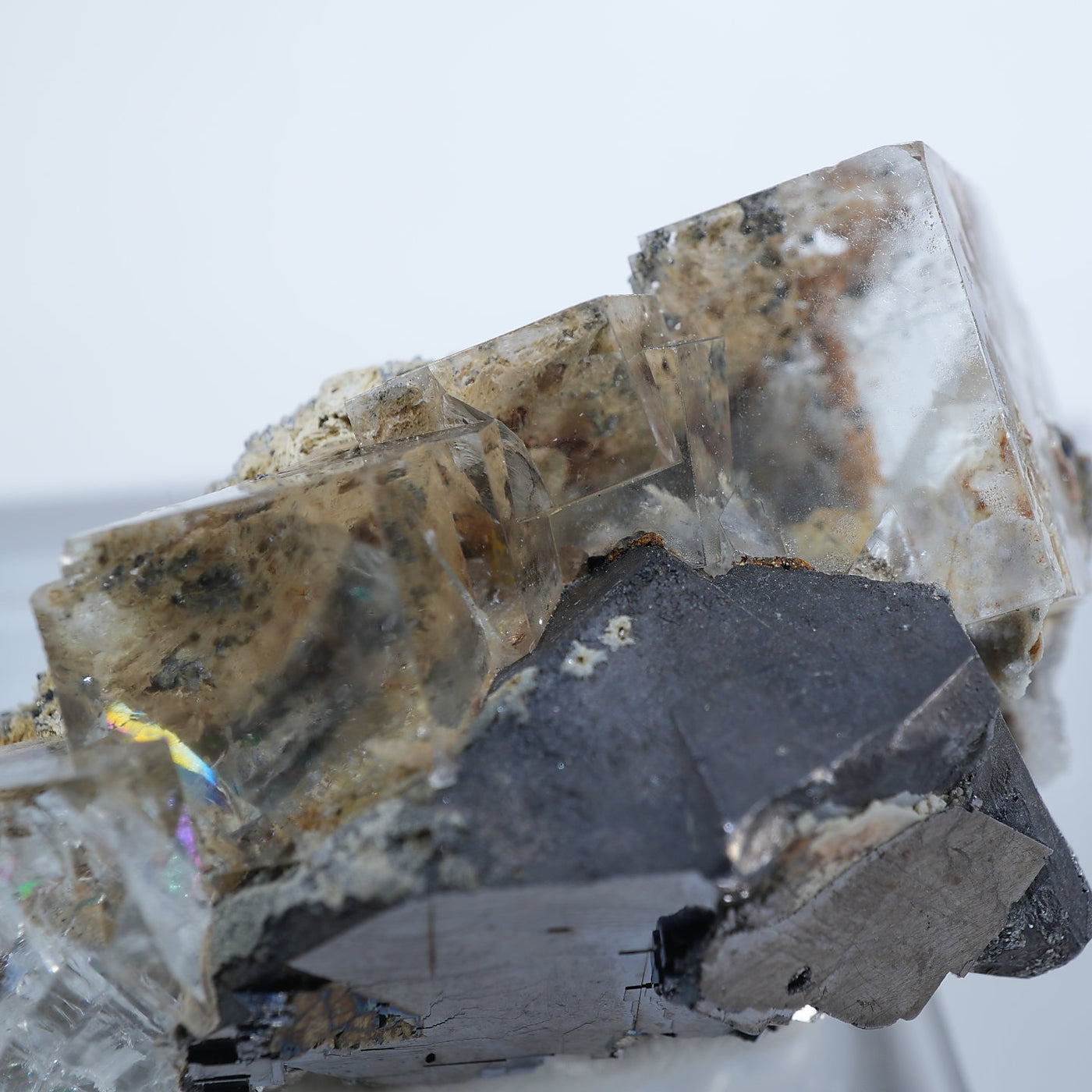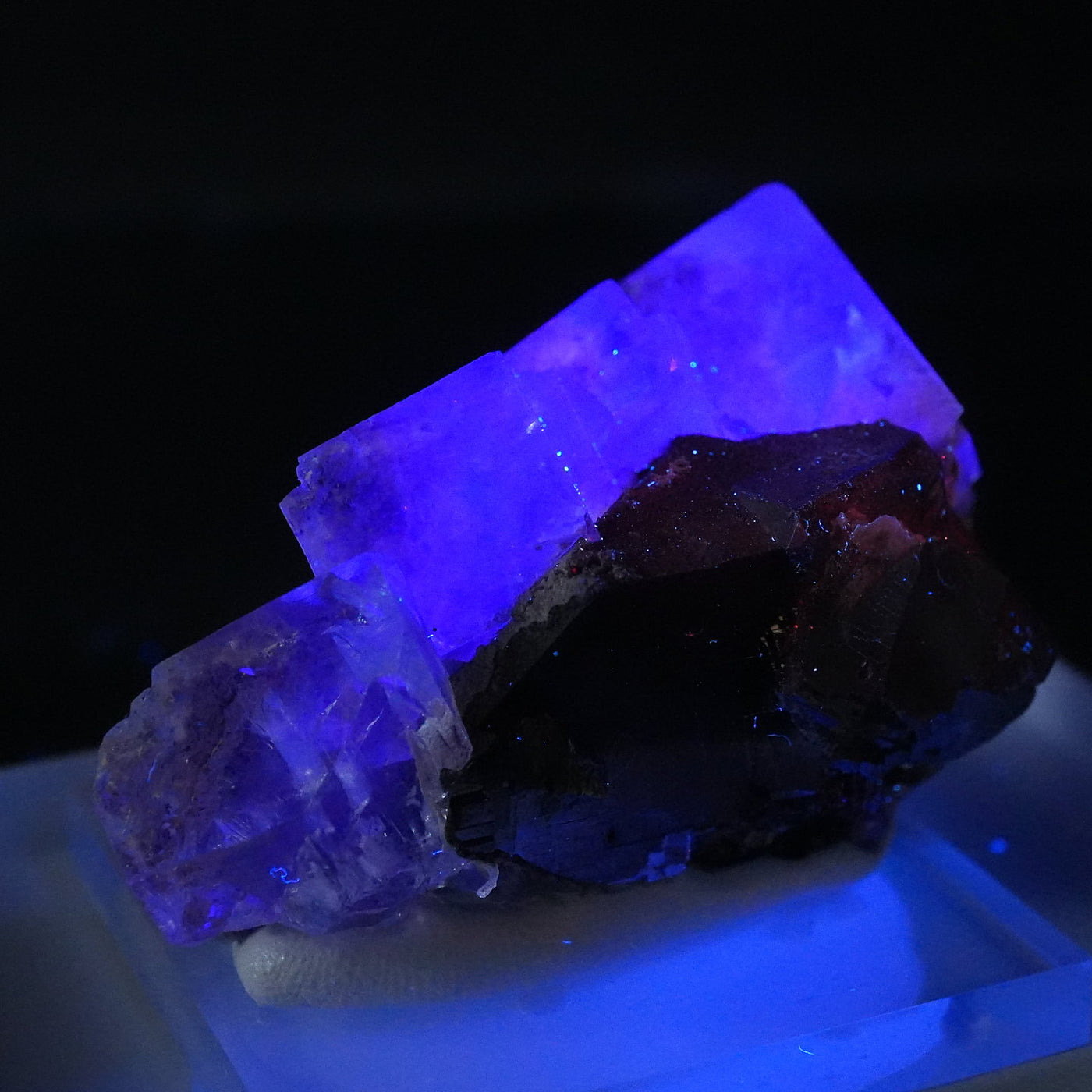透明感のあるクリアカラーが目を引くフローライトにガレナが共生しています。フローライトは紫外線ライトを当てると蛍光します。※撮影に使用しているライトは、紫外線ライト365nm5wタイプです。