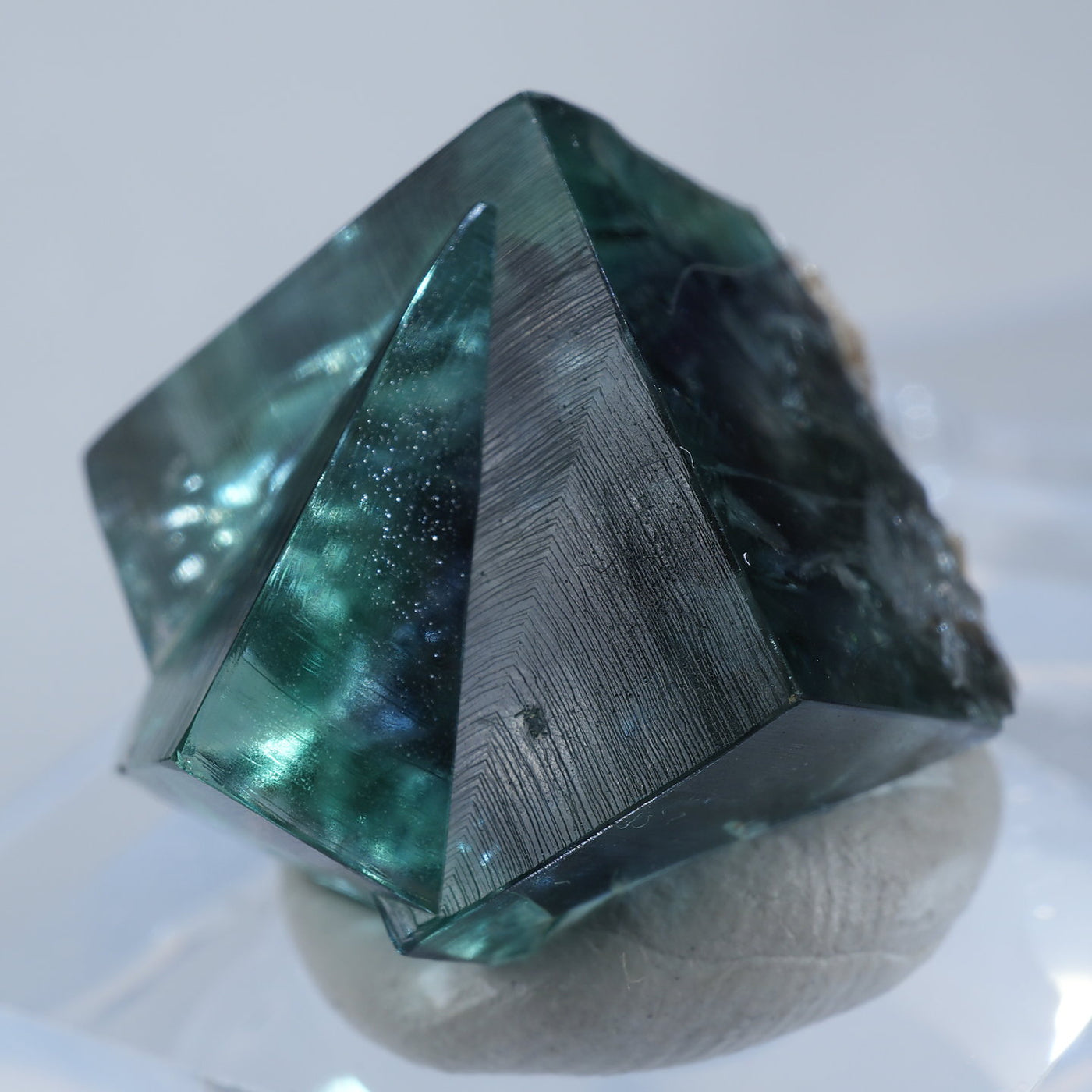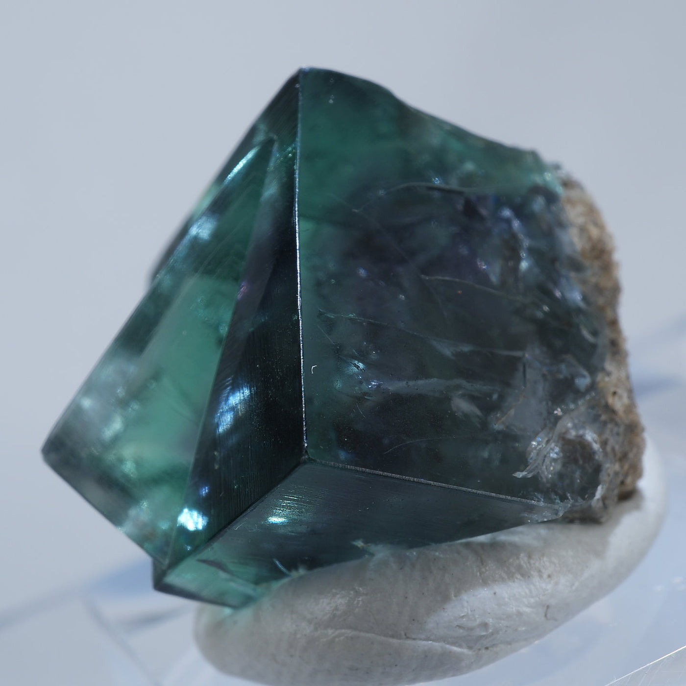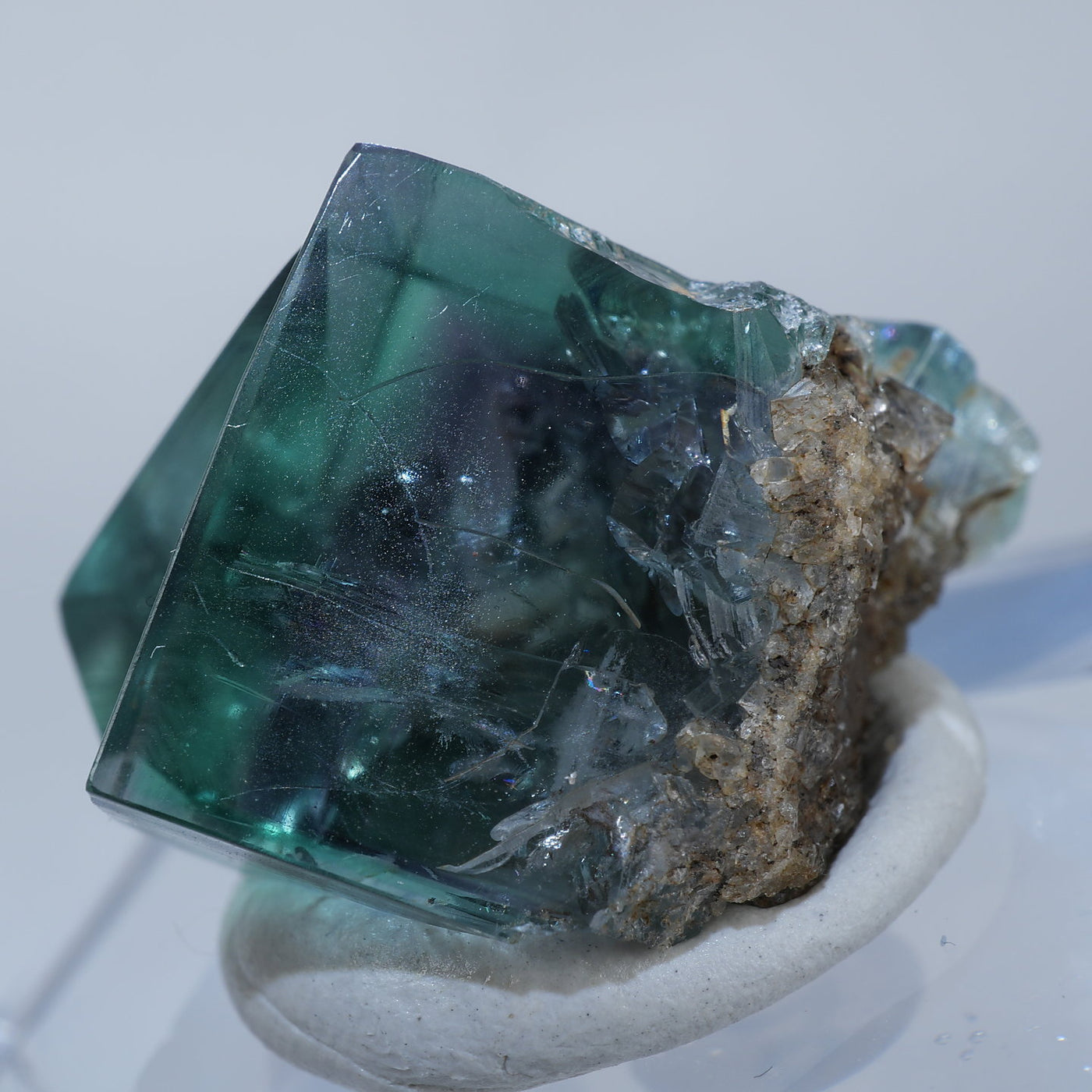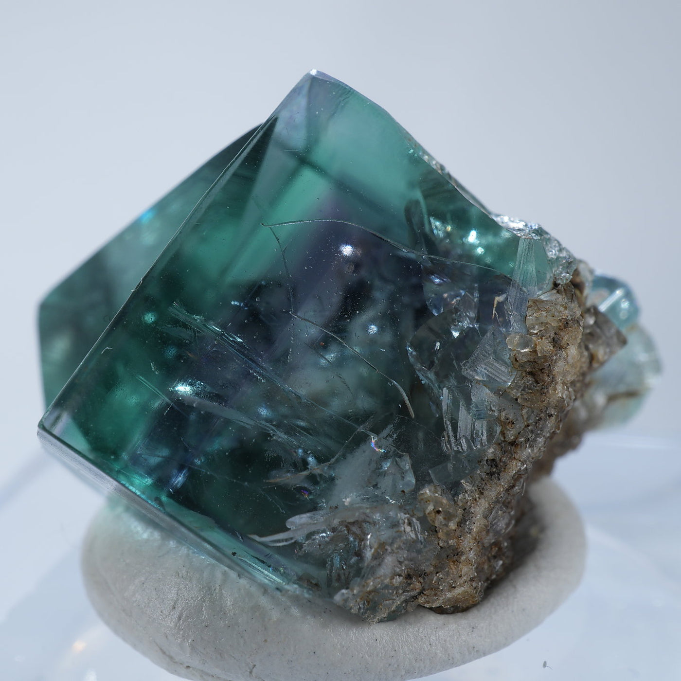 艶やかで透明感があります。深みのあるグリーンが美しい良質な標本です。光を透過させるとパープルのゾーニングが際立ちます。紫外線ライトを当てると強く蛍光します。※撮影に使用しているライトは、紫外線ライト365nm5wタイプです。