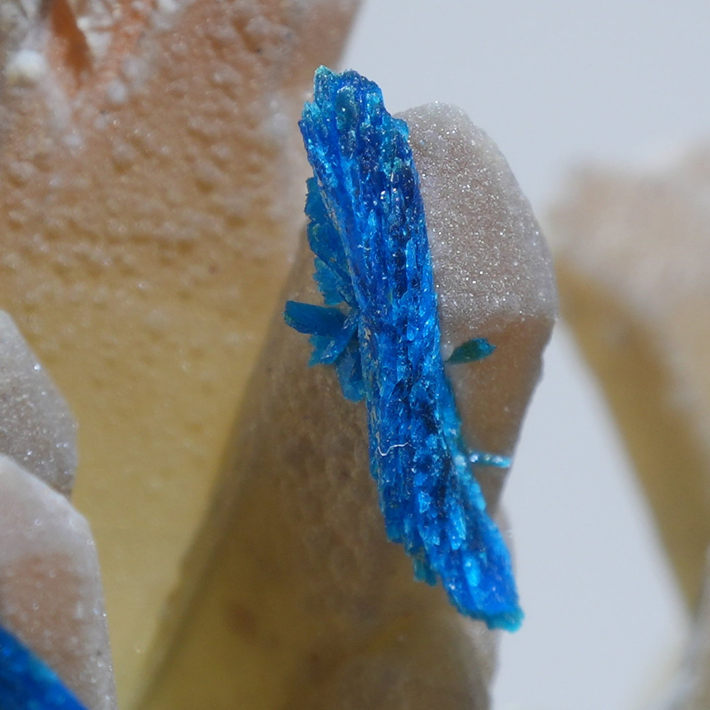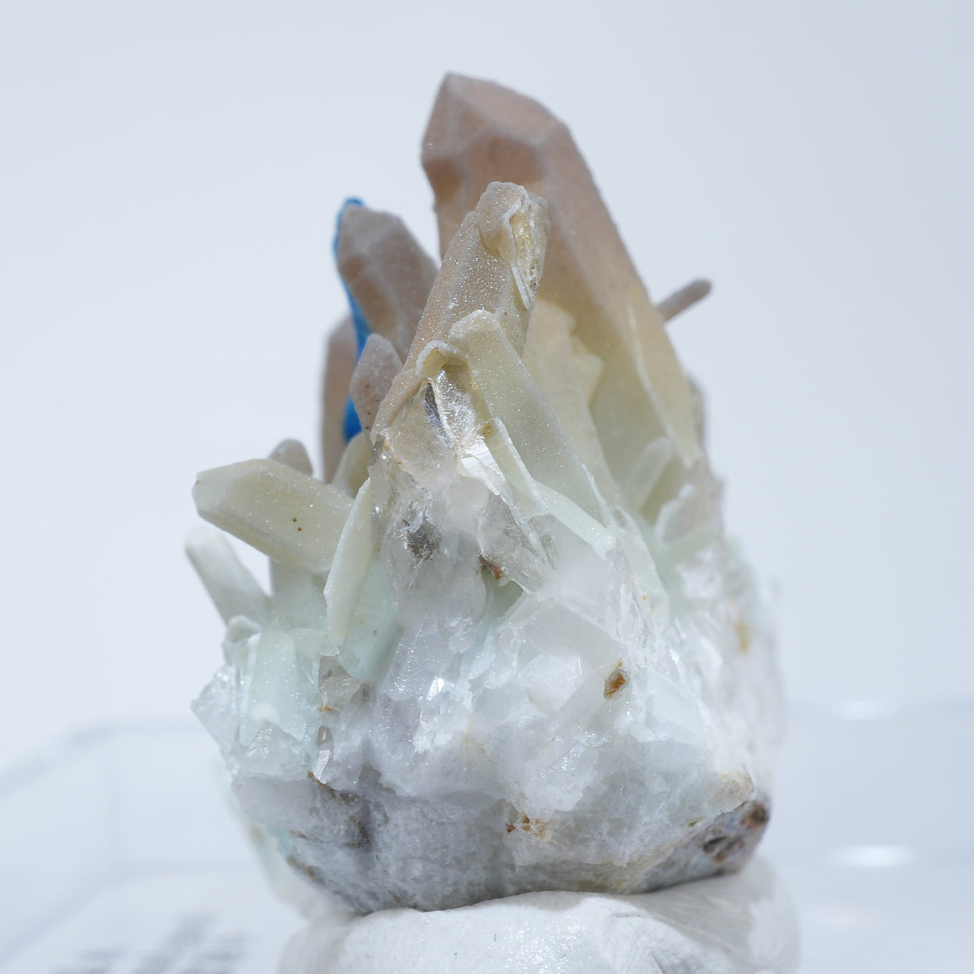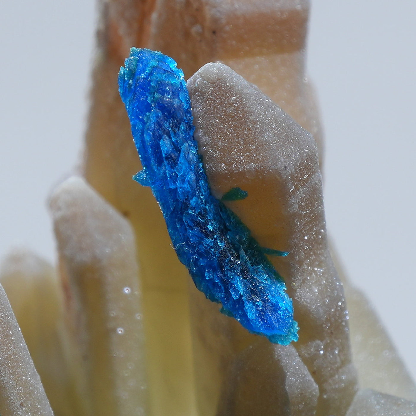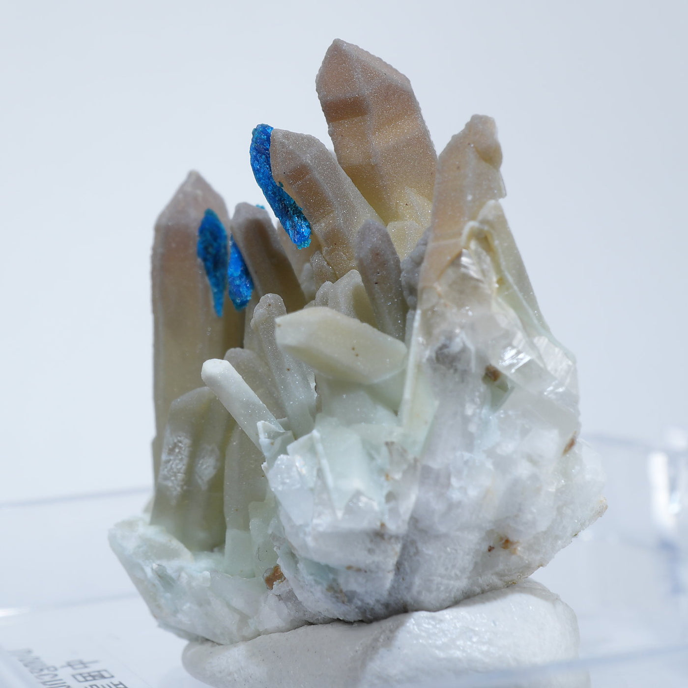 中国雲南省産の水晶・ベゼライトです。鮮やかな青緑色のベゼライトの結晶と水晶との美しい共生が魅力です。■ベゼライト(ベゼリ石:Veszelyite)銅の二次鉱物として生成され、銅や亜鉛が含まれる鉱床の酸化帯から産出する。最初の発見者であるハンガリーの鉱山技師ベゼリA. Veszelyi(1820―1888)に因んで命名される。鮮やかな青緑色の結晶が美しい鉱物で、産出量が少なく世界的にも珍しい鉱物とされ、結晶の大きさにより希少性が高まる。 【産地】 Dongchuan, Yunnan, China 中国雲南省東川区【サイズ】約28mm×32mm×20mm【ご注意】パソコン、モニターの環境によって若干色合いなどが変わることがございます。商品は天然ゆえ、わずかな凹みや歪み、内包物が入る物もございます。多少のイメージの違いに関しての返品は受付が出来かねますのでご了承ください。【その他】価格は税込表示です、送料は全国一律全て無料です。宅配便またはポスト投函便(ヤマト運輸ネコポス)にて配送いたします。発送方法の指定はできません。