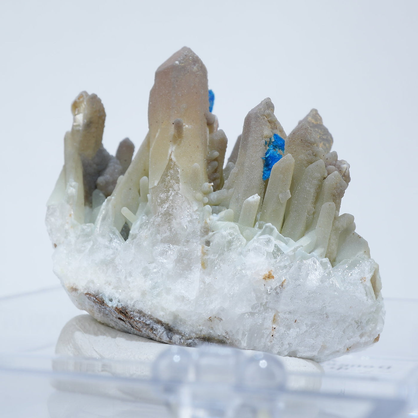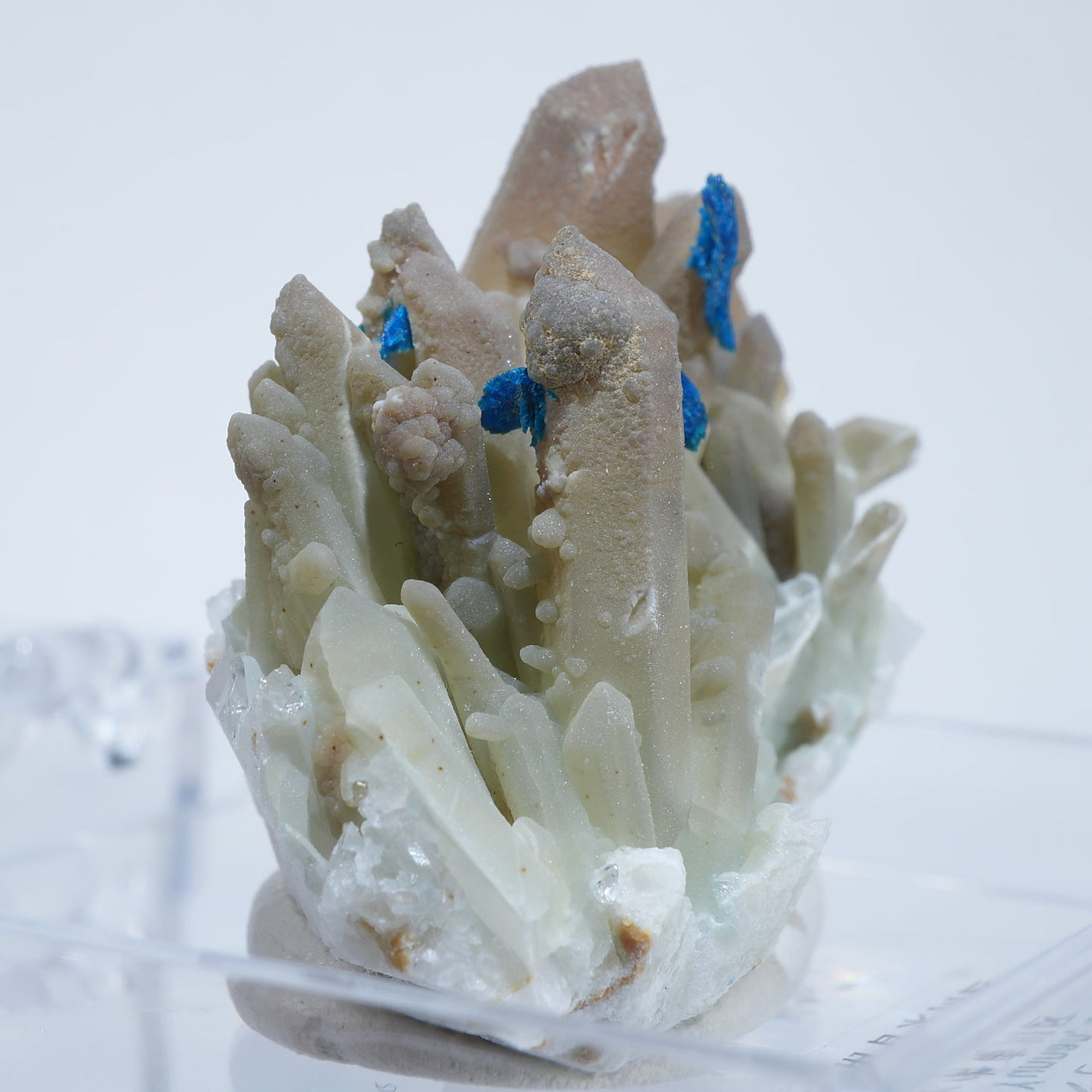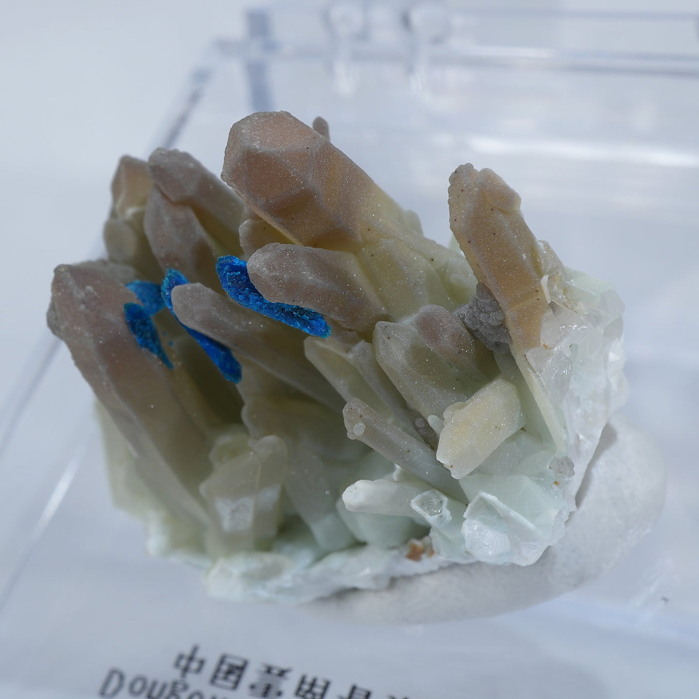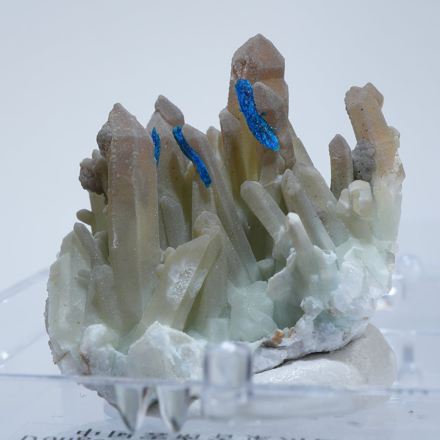 中国雲南省産の水晶・ベゼライトです。鮮やかな青緑色のベゼライトの結晶と水晶との美しい共生が魅力です。■ベゼライト(ベゼリ石:Veszelyite)銅の二次鉱物として生成され、銅や亜鉛が含まれる鉱床の酸化帯から産出する。最初の発見者であるハンガリーの鉱山技師ベゼリA. Veszelyi(1820―1888)に因んで命名される。鮮やかな青緑色の結晶が美しい鉱物で、産出量が少なく世界的にも珍しい鉱物とされ、結晶の大きさにより希少性が高まる。 【産地】 Dongchuan, Yunnan, China 中国雲南省東川区【サイズ】約28mm×32mm×20mm【ご注意】パソコン、モニターの環境によって若干色合いなどが変わることがございます。商品は天然ゆえ、わずかな凹みや歪み、内包物が入る物もございます。多少のイメージの違いに関しての返品は受付が出来かねますのでご了承ください。【その他】価格は税込表示です、送料は全国一律全て無料です。宅配便またはポスト投函便(ヤマト運輸ネコポス)にて配送いたします。発送方法の指定はできません。