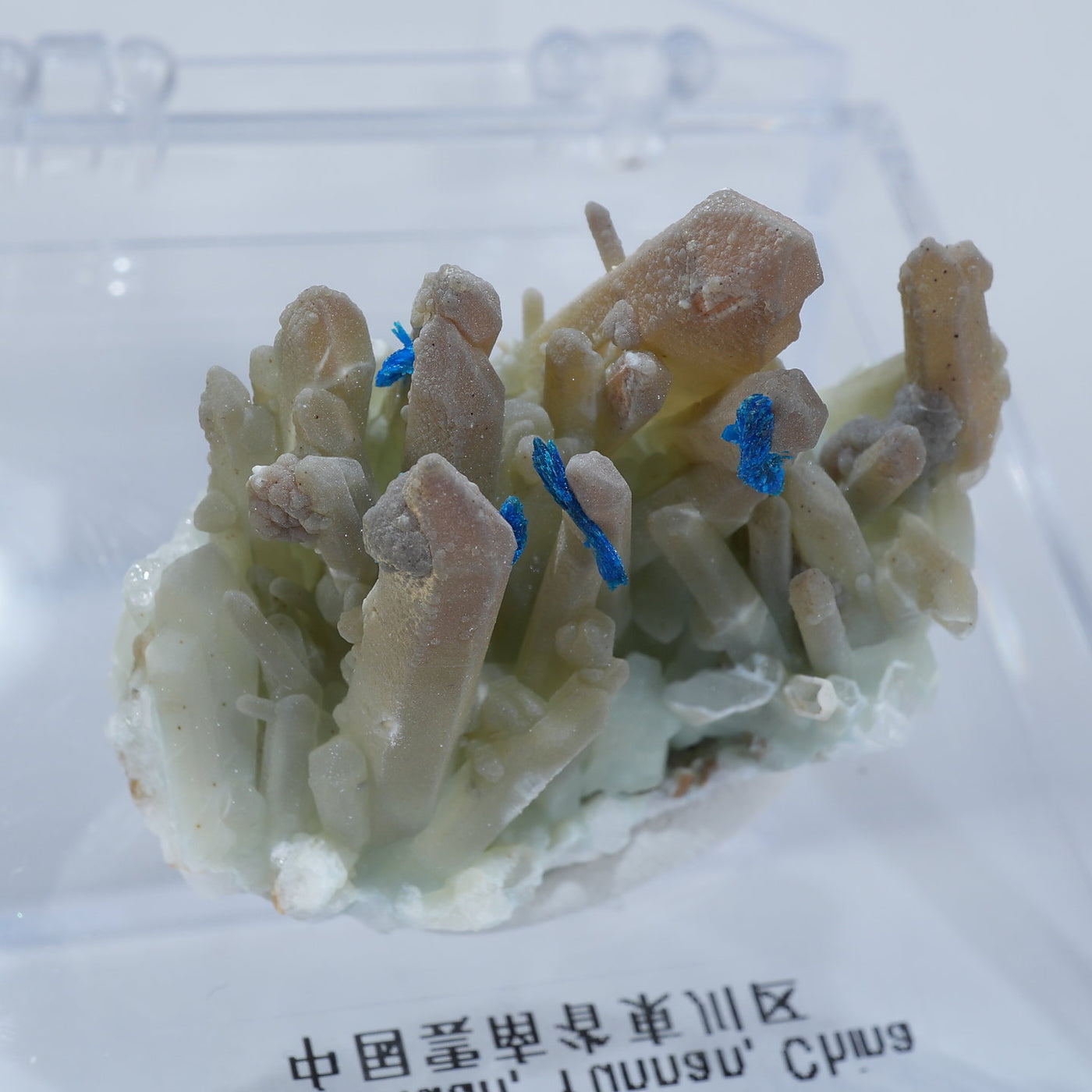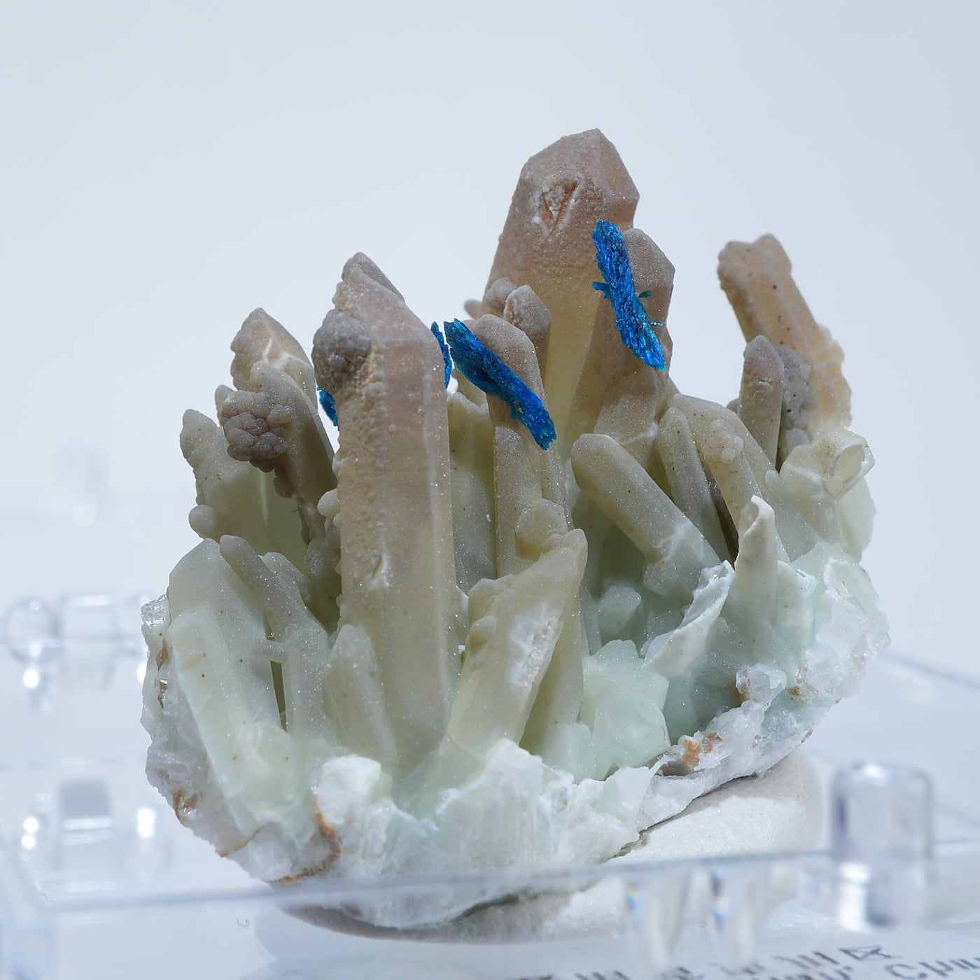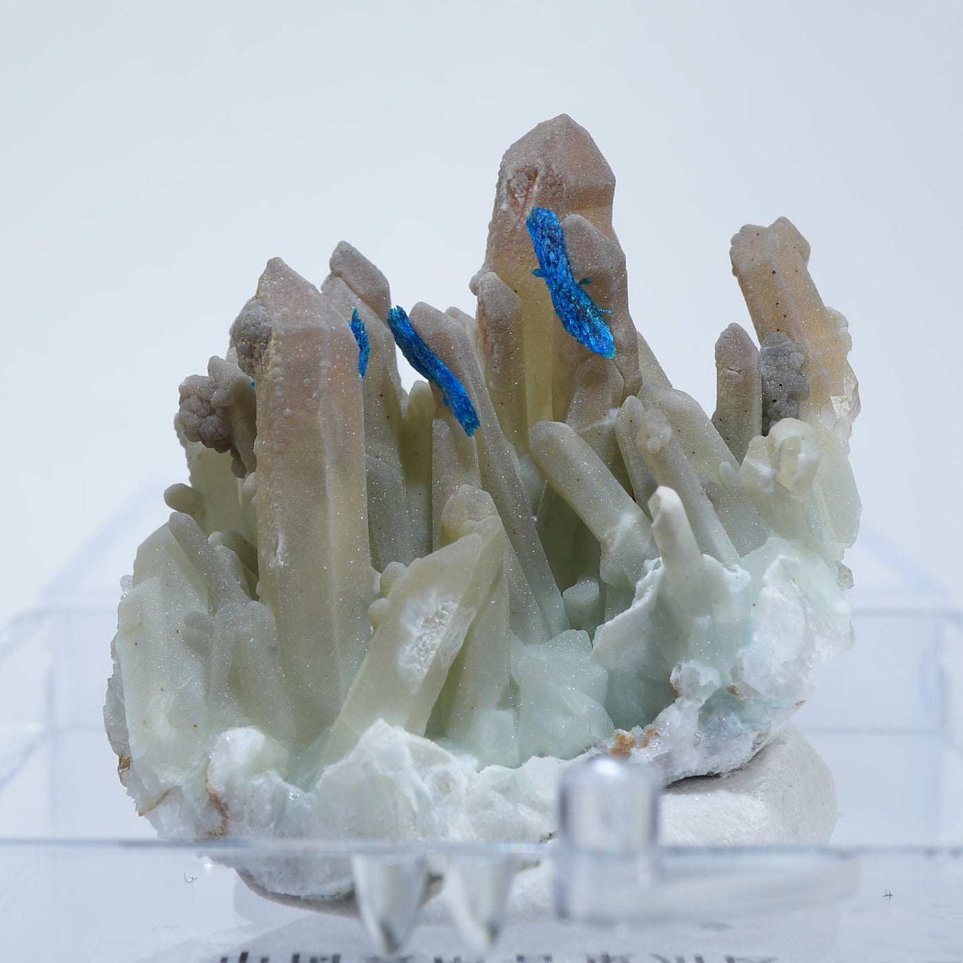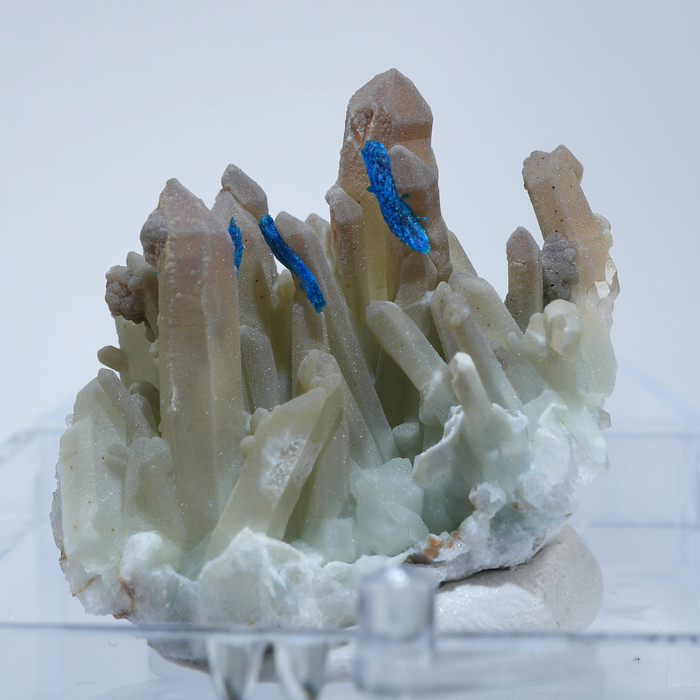 中国雲南省産の水晶・ベゼライトです。鮮やかな青緑色のベゼライトの結晶と水晶との美しい共生が魅力です。■ベゼライト(ベゼリ石:Veszelyite)銅の二次鉱物として生成され、銅や亜鉛が含まれる鉱床の酸化帯から産出する。最初の発見者であるハンガリーの鉱山技師ベゼリA. Veszelyi(1820―1888)に因んで命名される。鮮やかな青緑色の結晶が美しい鉱物で、産出量が少なく世界的にも珍しい鉱物とされ、結晶の大きさにより希少性が高まる。 【産地】 Dongchuan, Yunnan, China 中国雲南省東川区【サイズ】約28mm×32mm×20mm【ご注意】パソコン、モニターの環境によって若干色合いなどが変わることがございます。商品は天然ゆえ、わずかな凹みや歪み、内包物が入る物もございます。多少のイメージの違いに関しての返品は受付が出来かねますのでご了承ください。【その他】価格は税込表示です、送料は全国一律全て無料です。宅配便またはポスト投函便(ヤマト運輸ネコポス)にて配送いたします。発送方法の指定はできません。