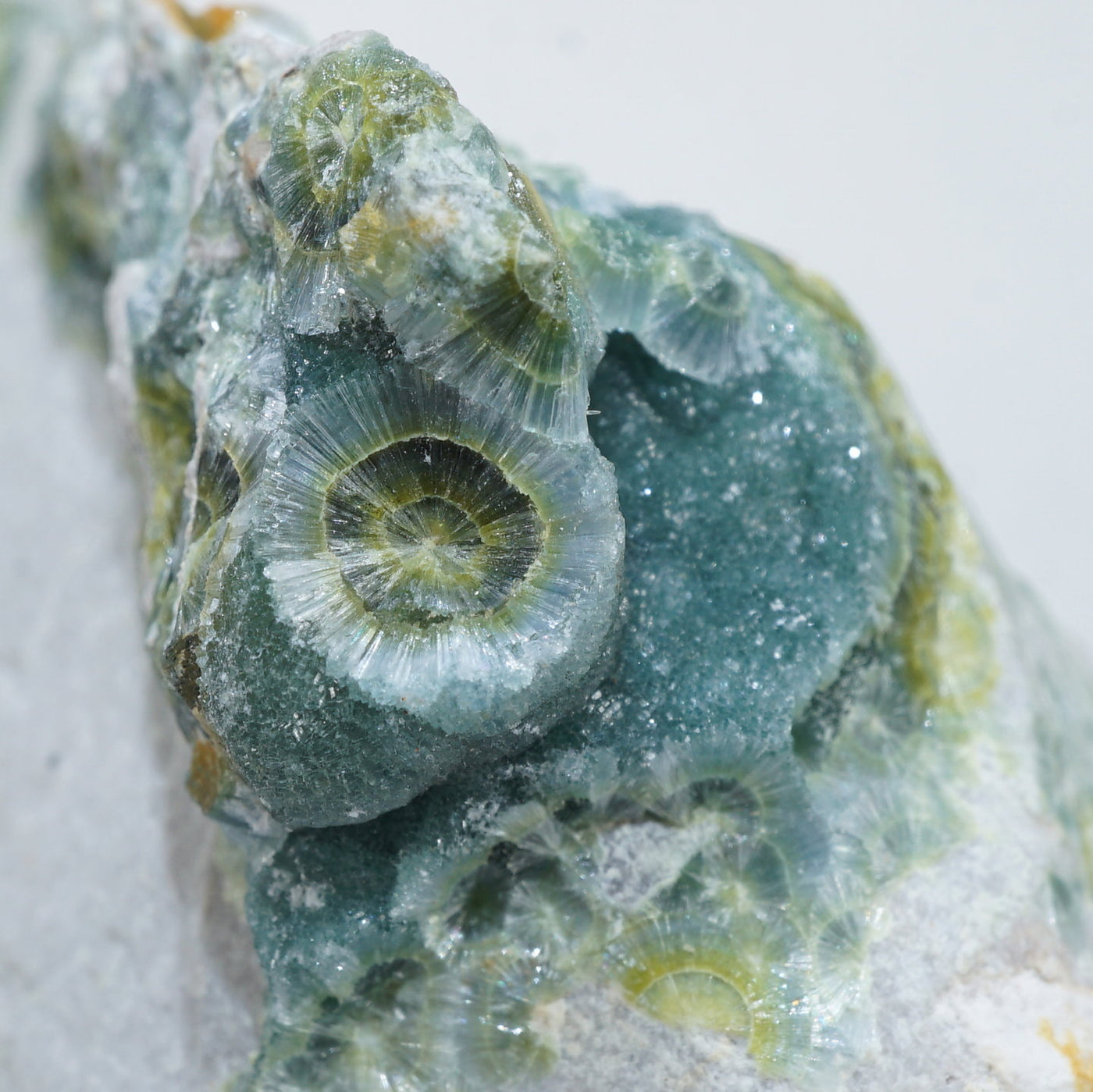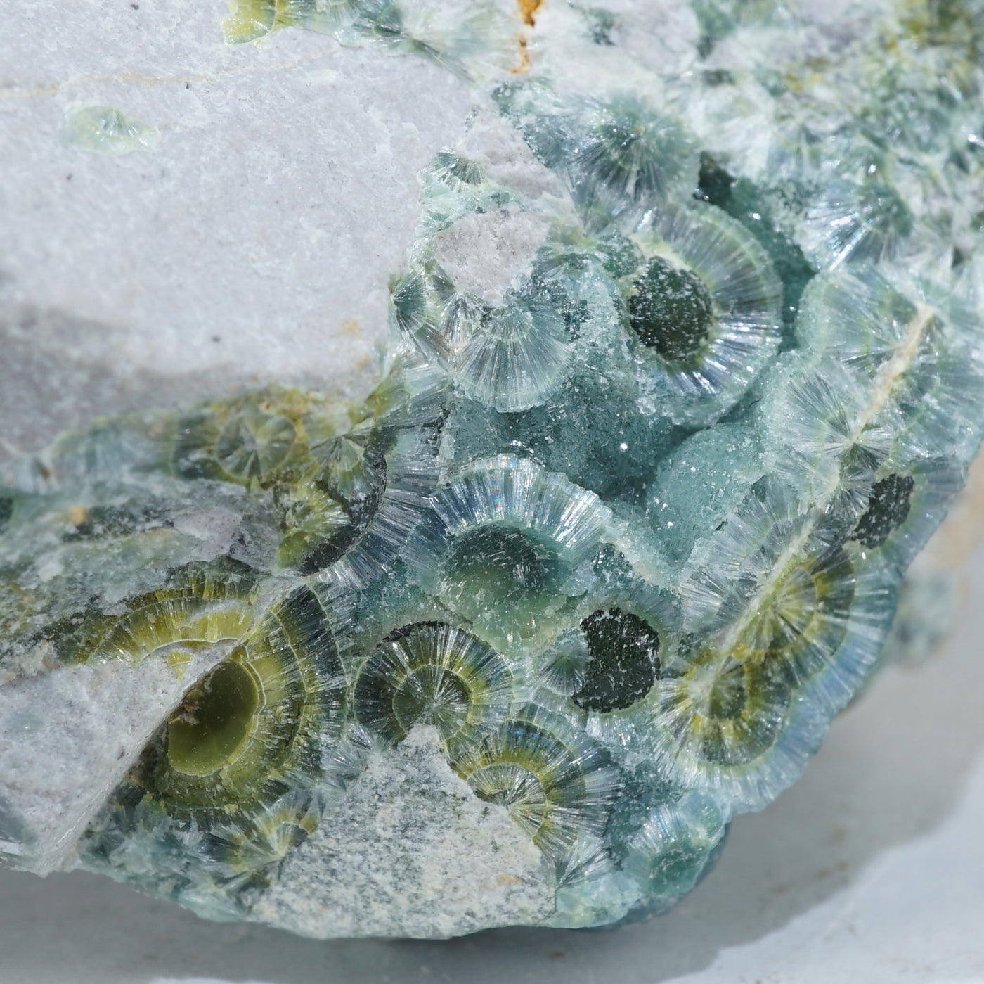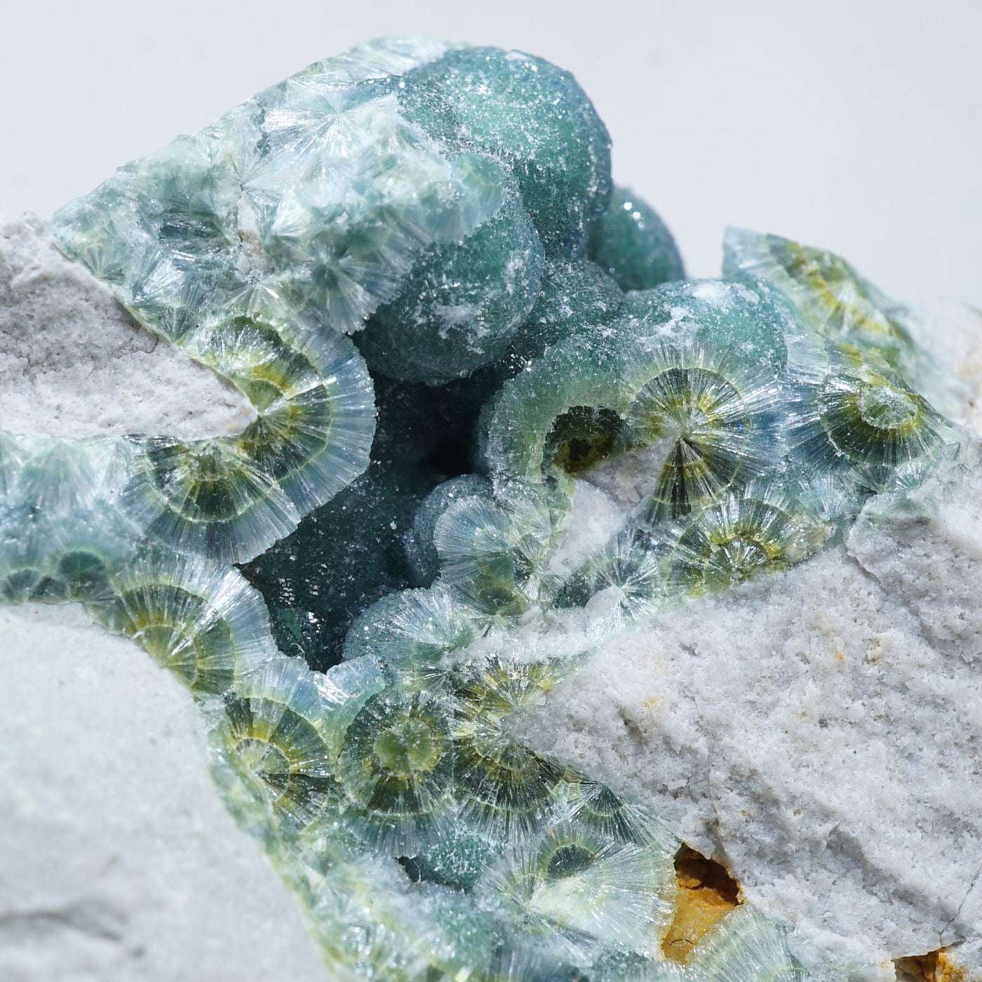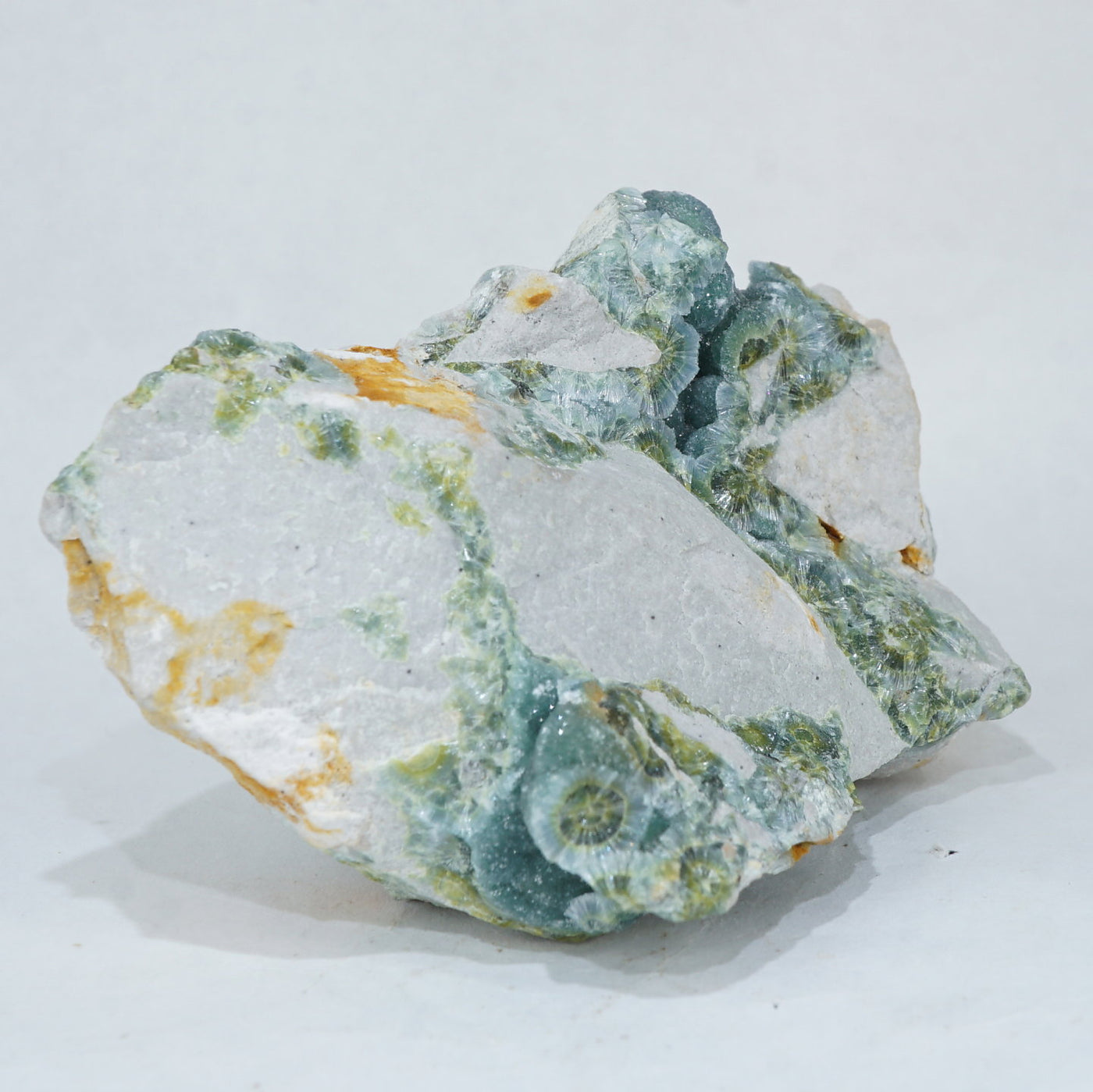 グリーンの球状の結晶が特徴です。結晶の断面はグリーンとイエローの色合いが美しく、放射状に広がっているのが特徴です。