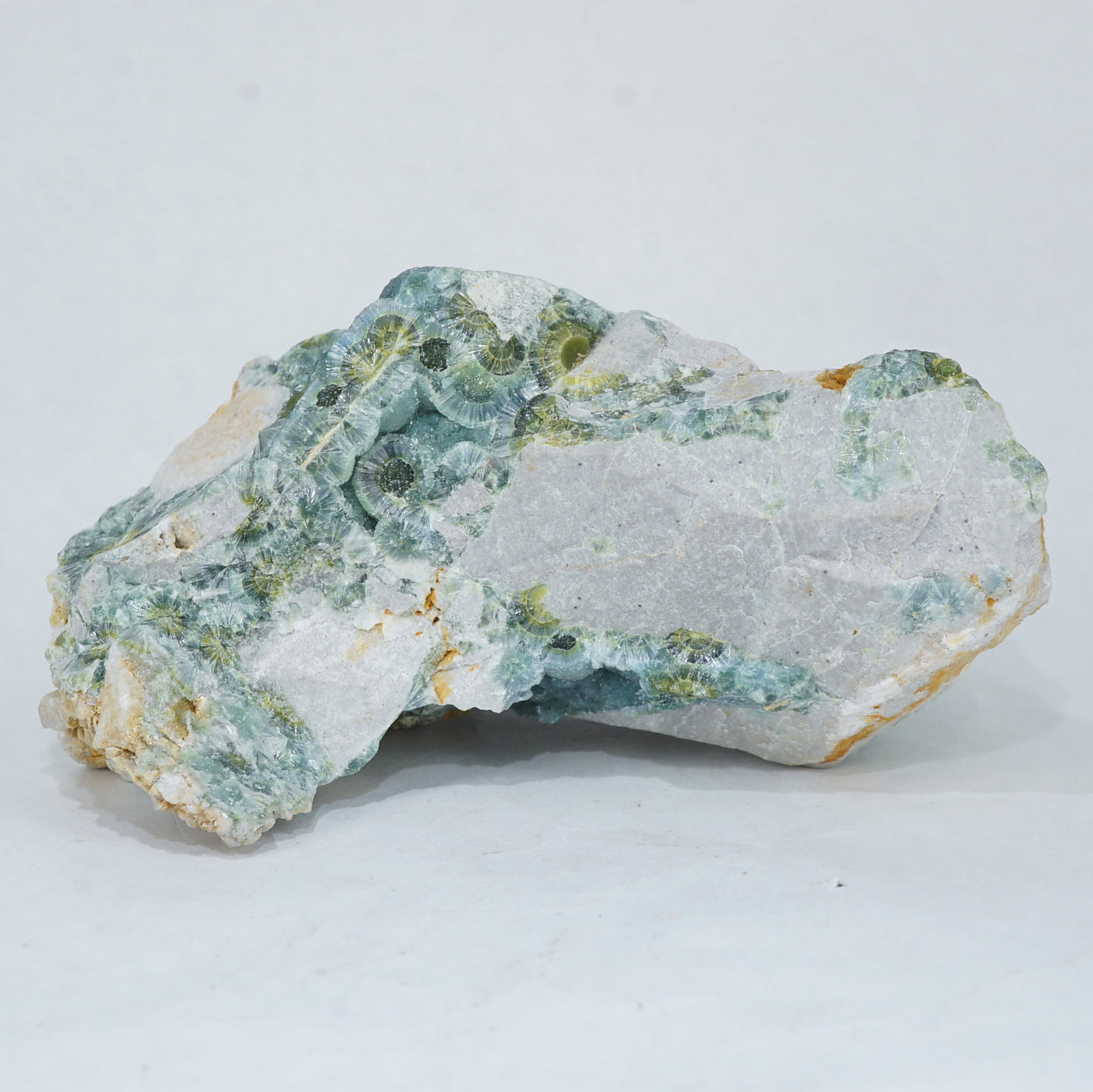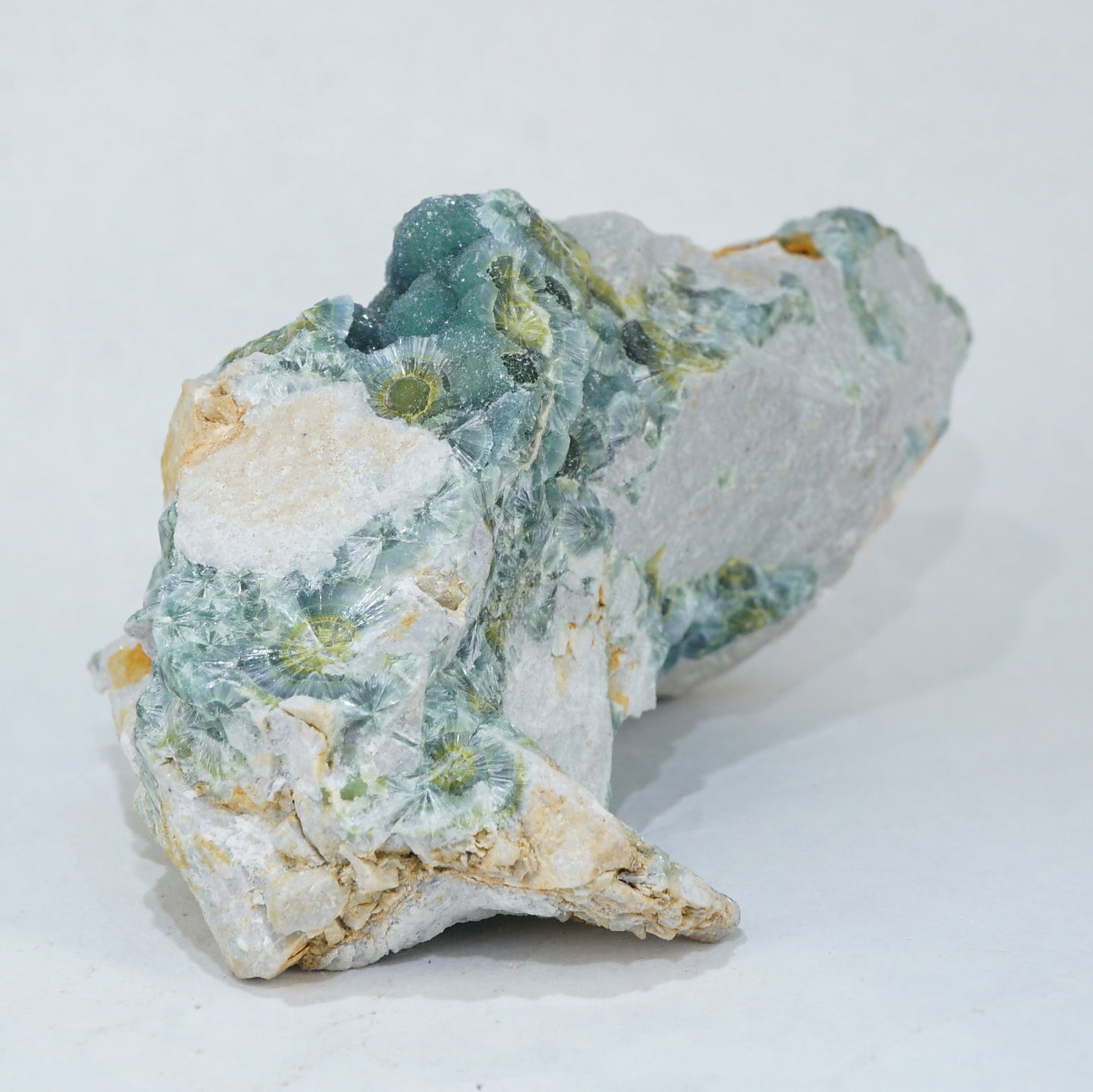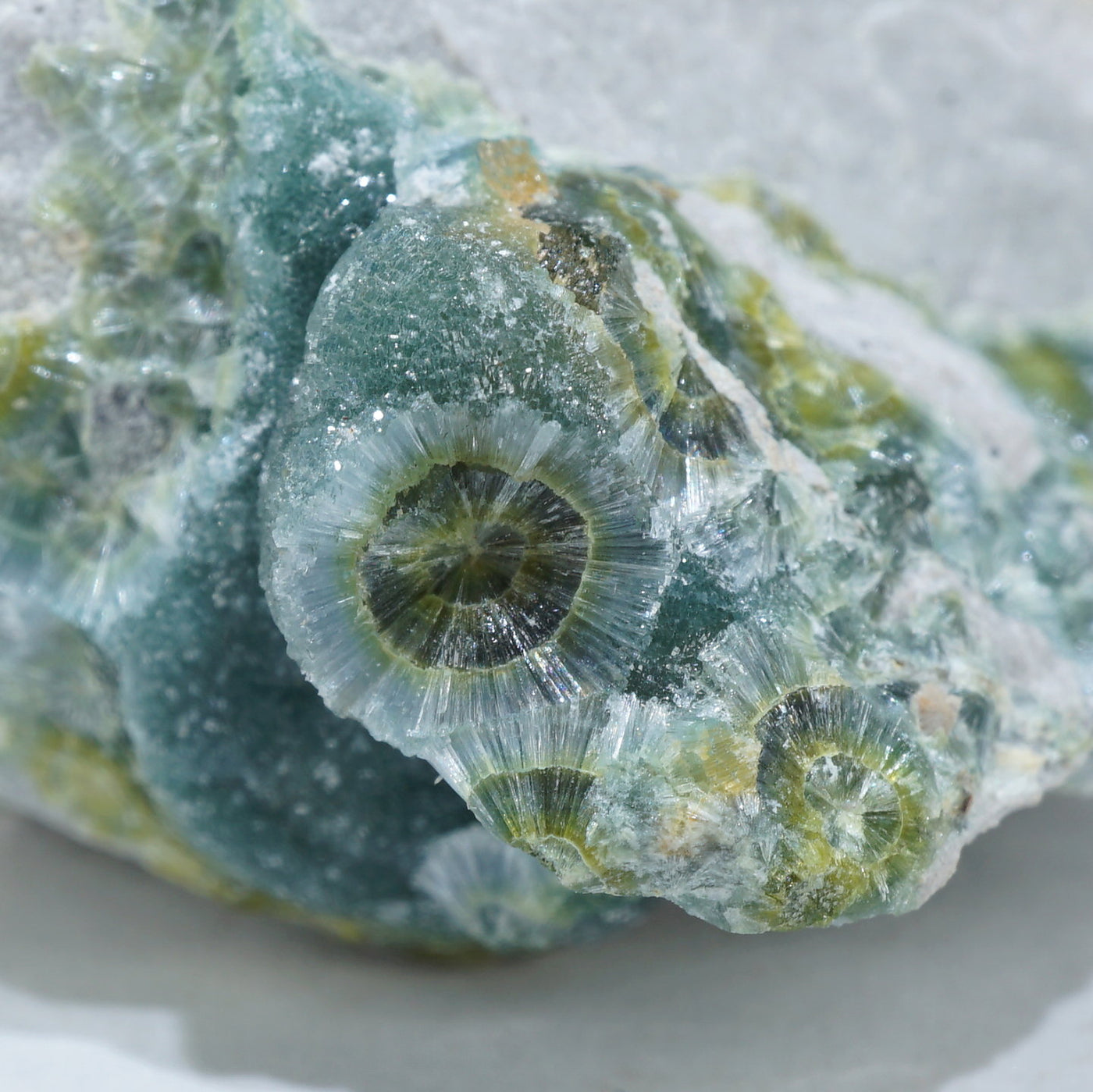 グリーンの球状の結晶が特徴です。結晶の断面はグリーンとイエローの色合いが美しく、放射状に広がっているのが特徴です。