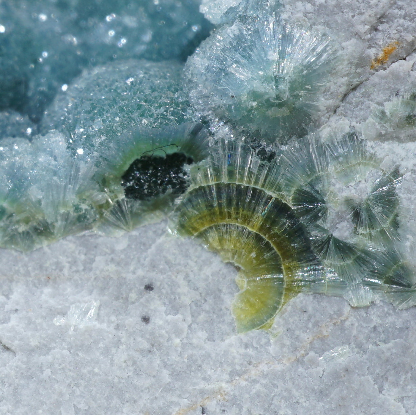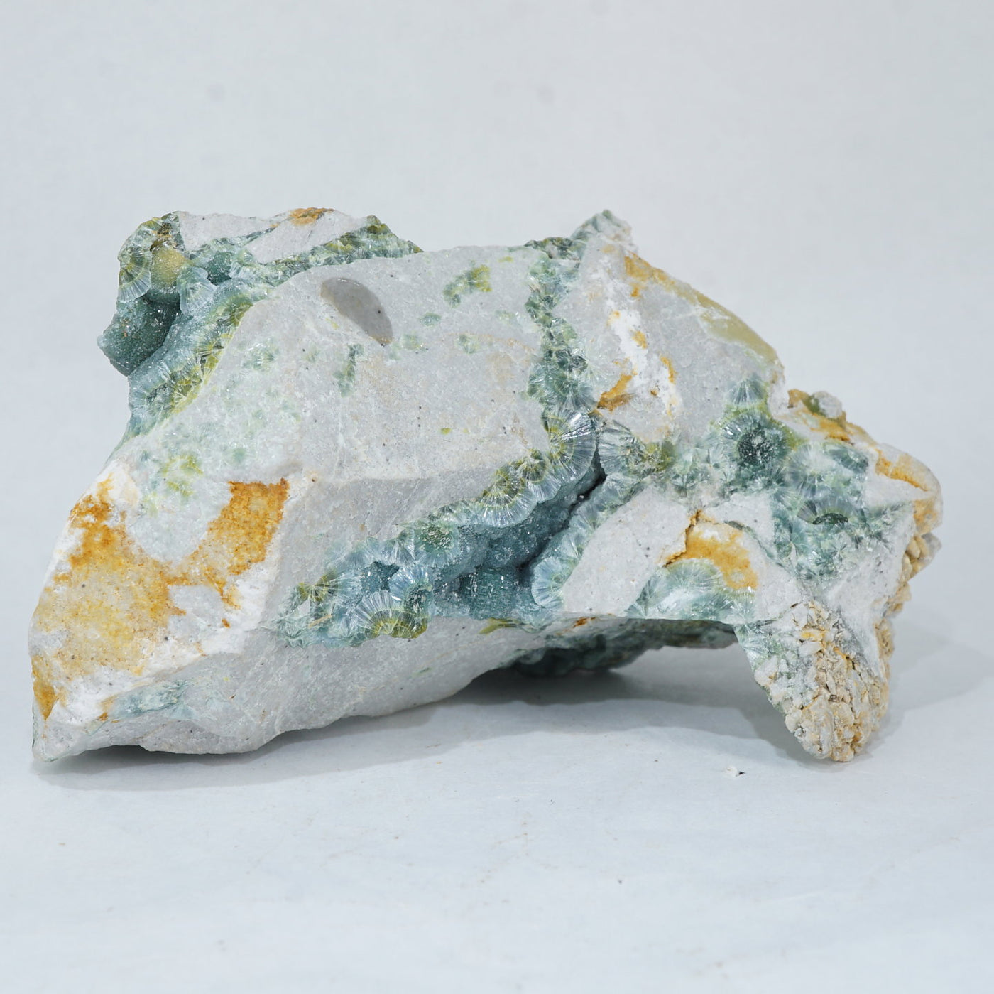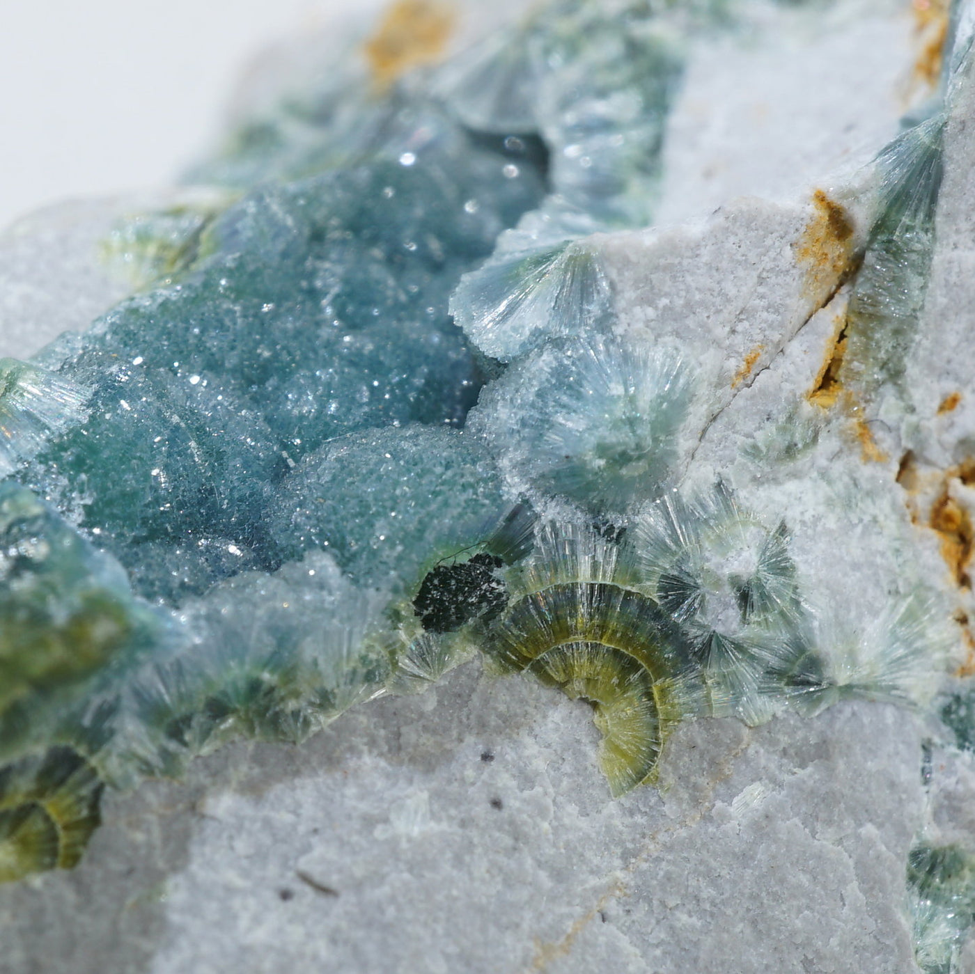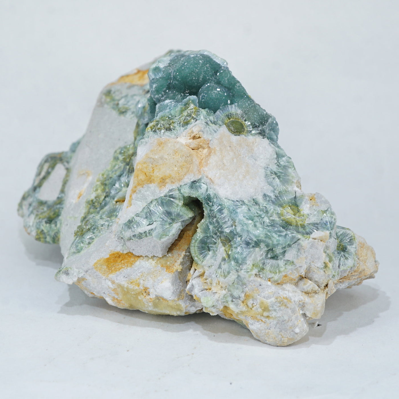 グリーンの球状の結晶が特徴です。結晶の断面はグリーンとイエローの色合いが美しく、放射状に広がっているのが特徴です。
