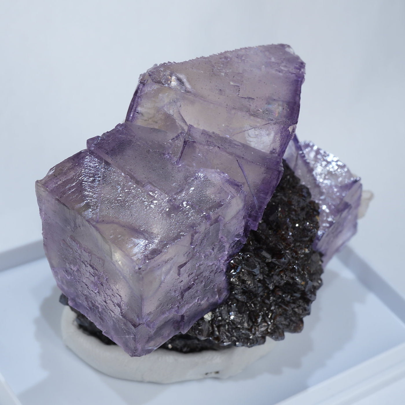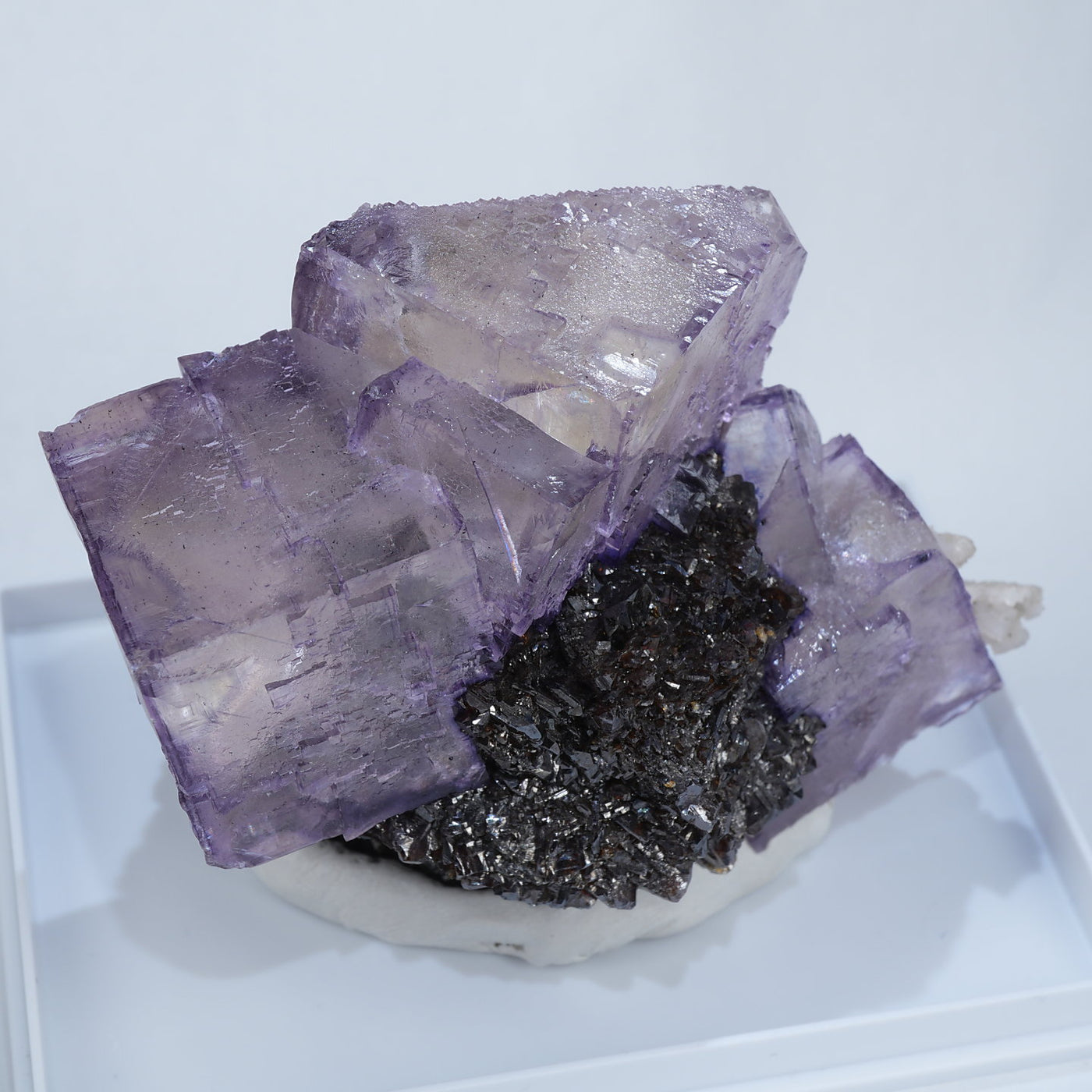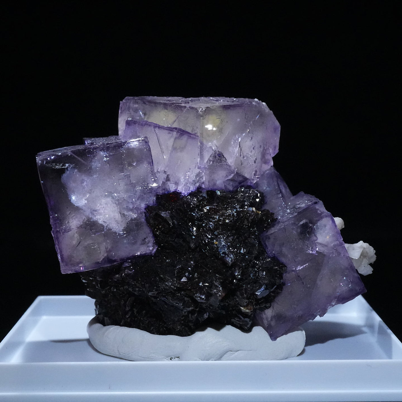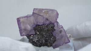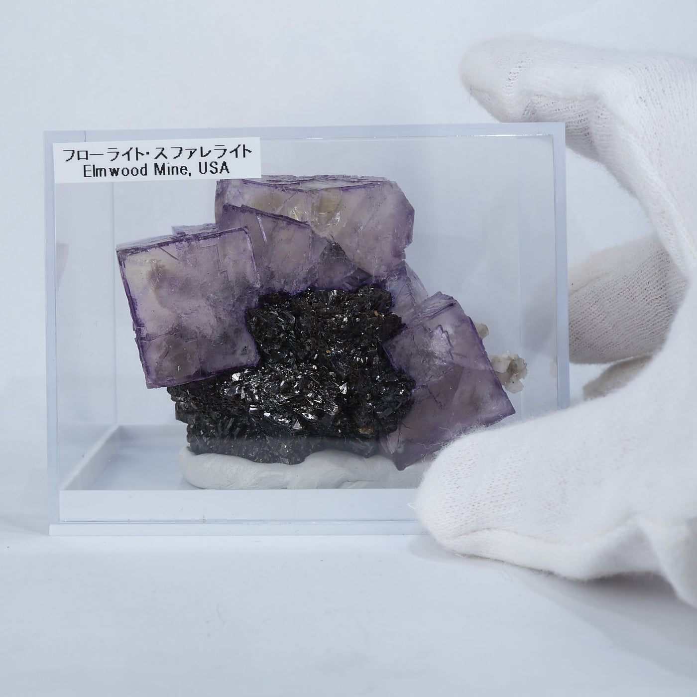 テネシー州エルムウッド鉱山産のフローライト・スファレライトです。光沢のあるスファレライトと淡いパープルのキューブ型のフローライトの共生がとても綺麗です。紫外線ライトを当てると蛍光します。
