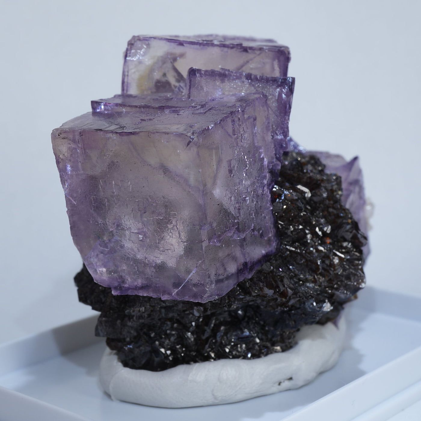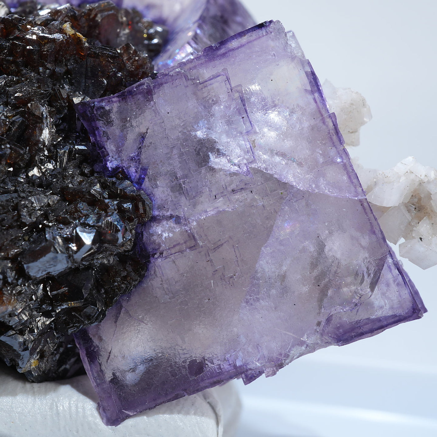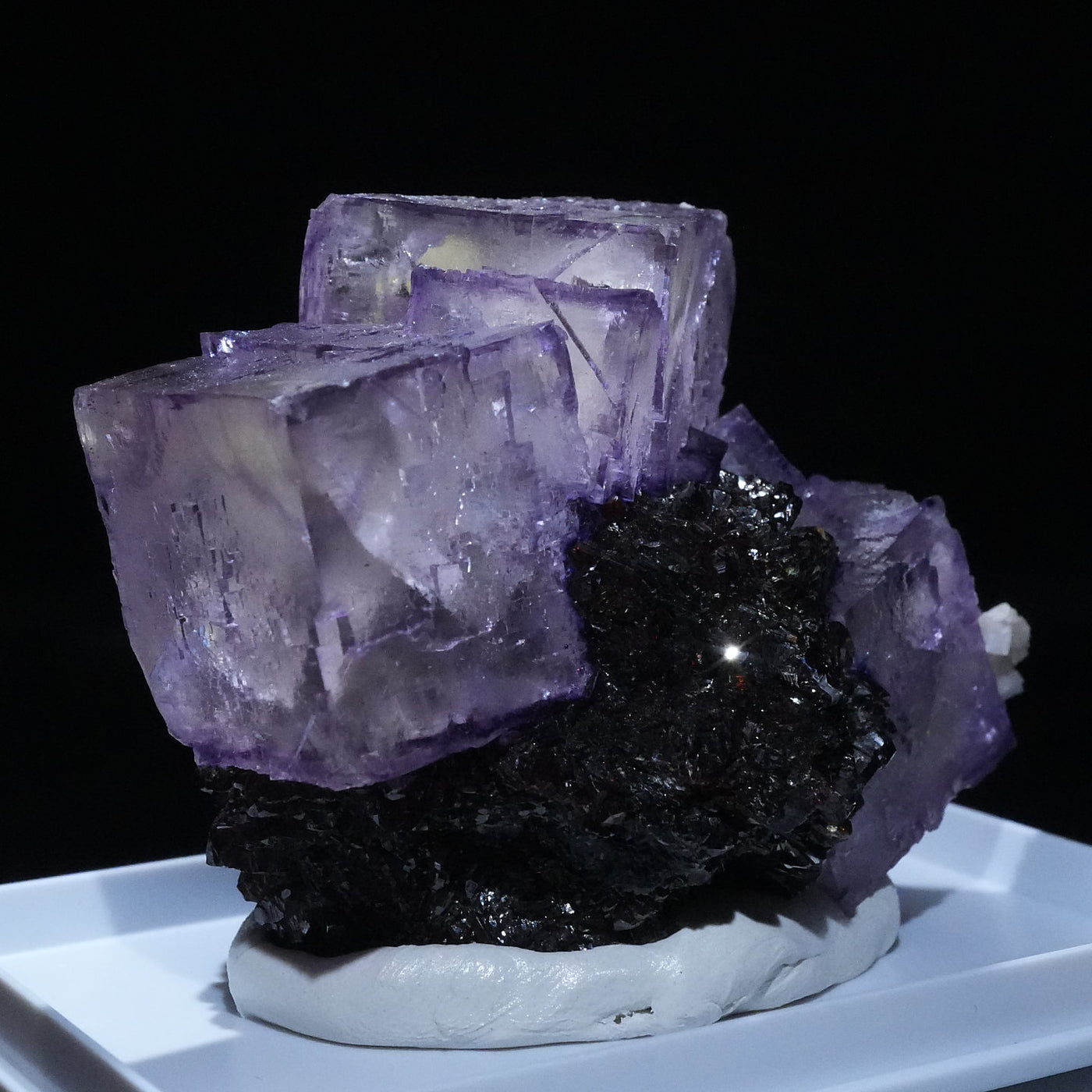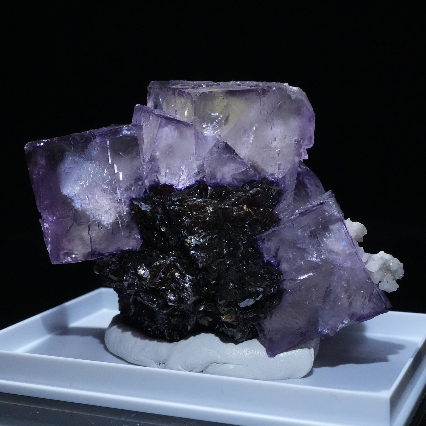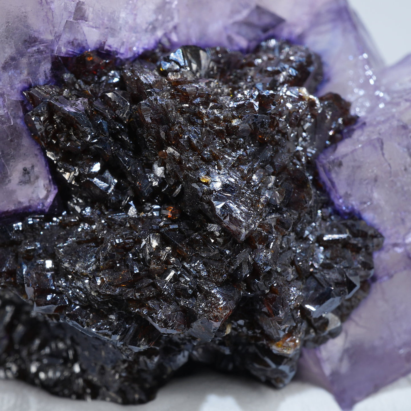 テネシー州エルムウッド鉱山産のフローライト・スファレライトです。光沢のあるスファレライトと淡いパープルのキューブ型のフローライトの共生がとても綺麗です。紫外線ライトを当てると蛍光します。