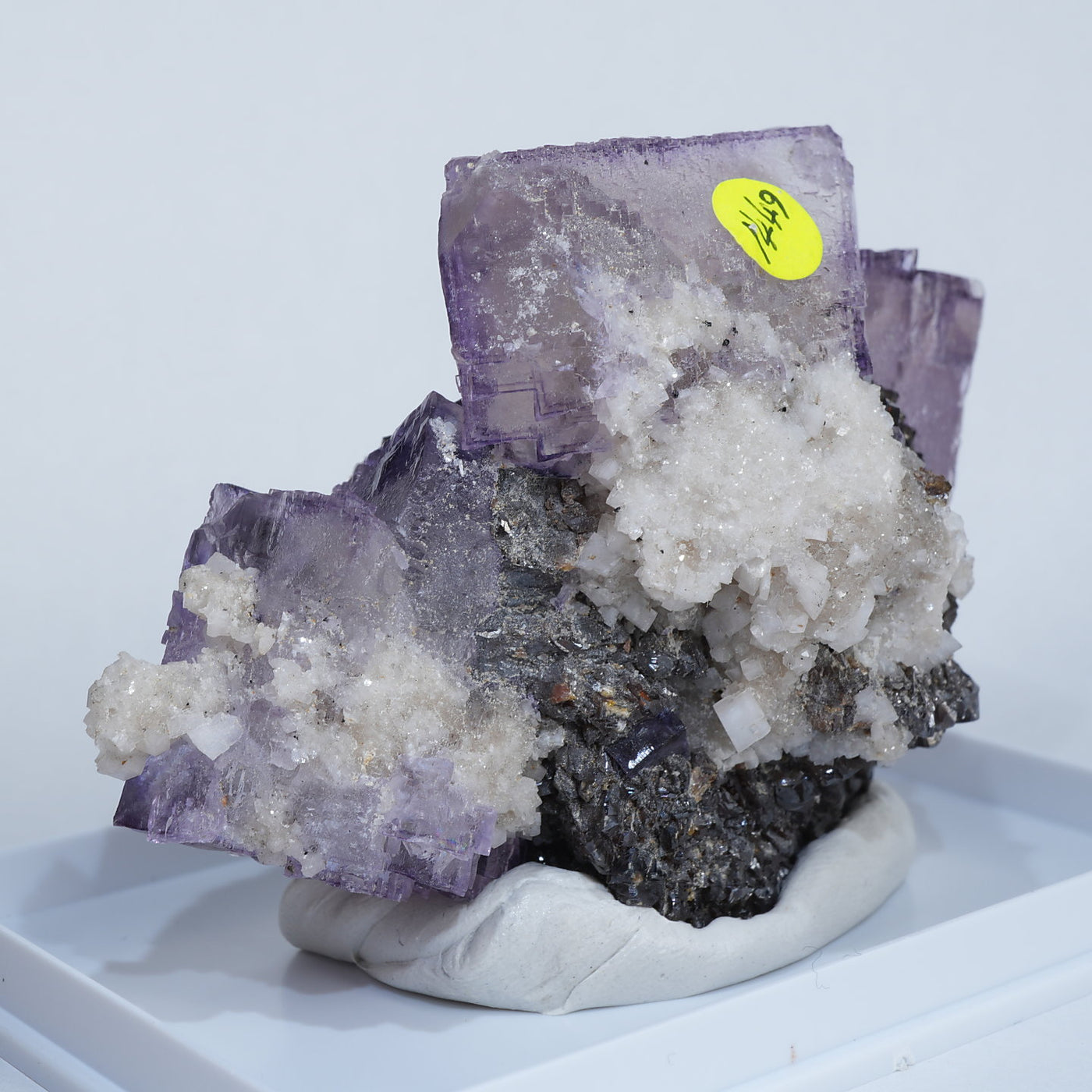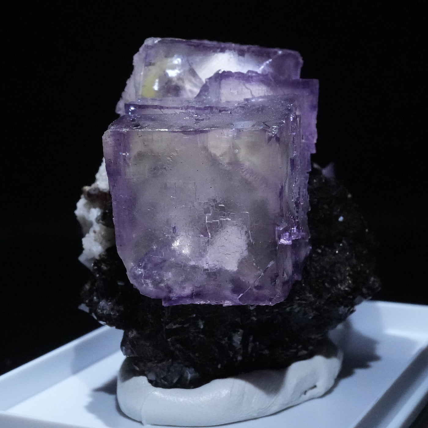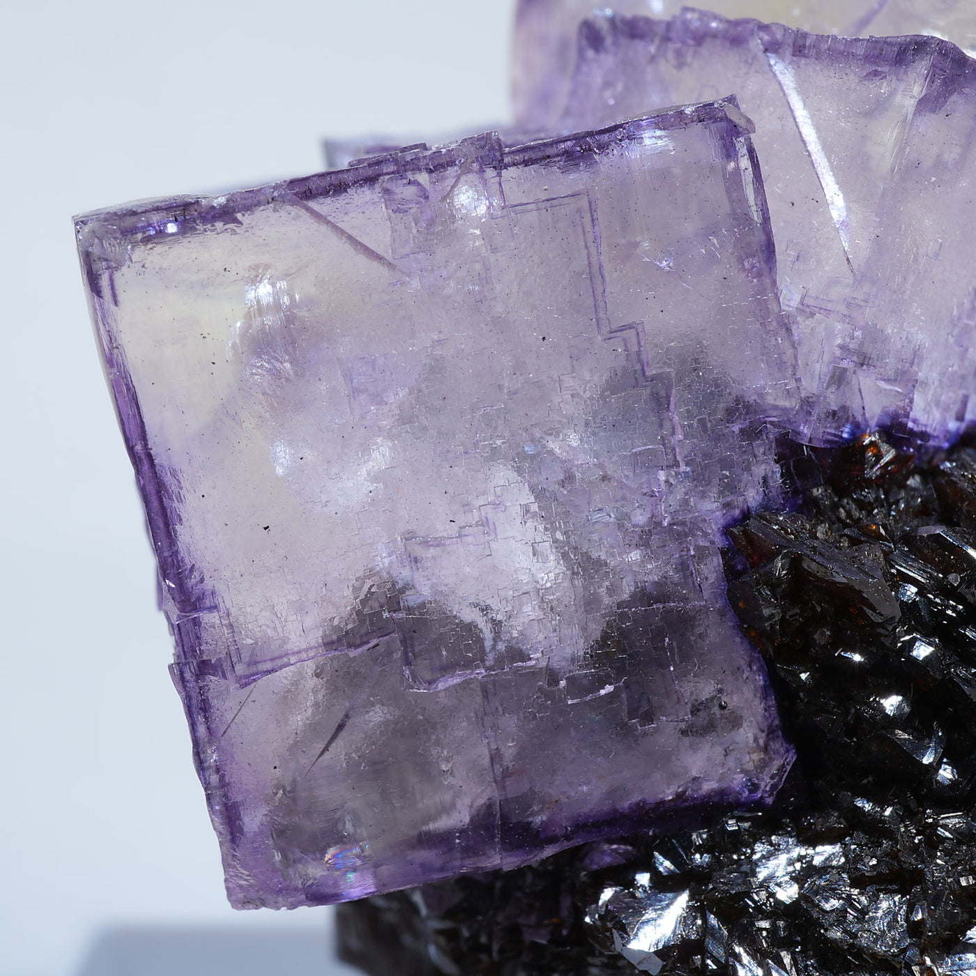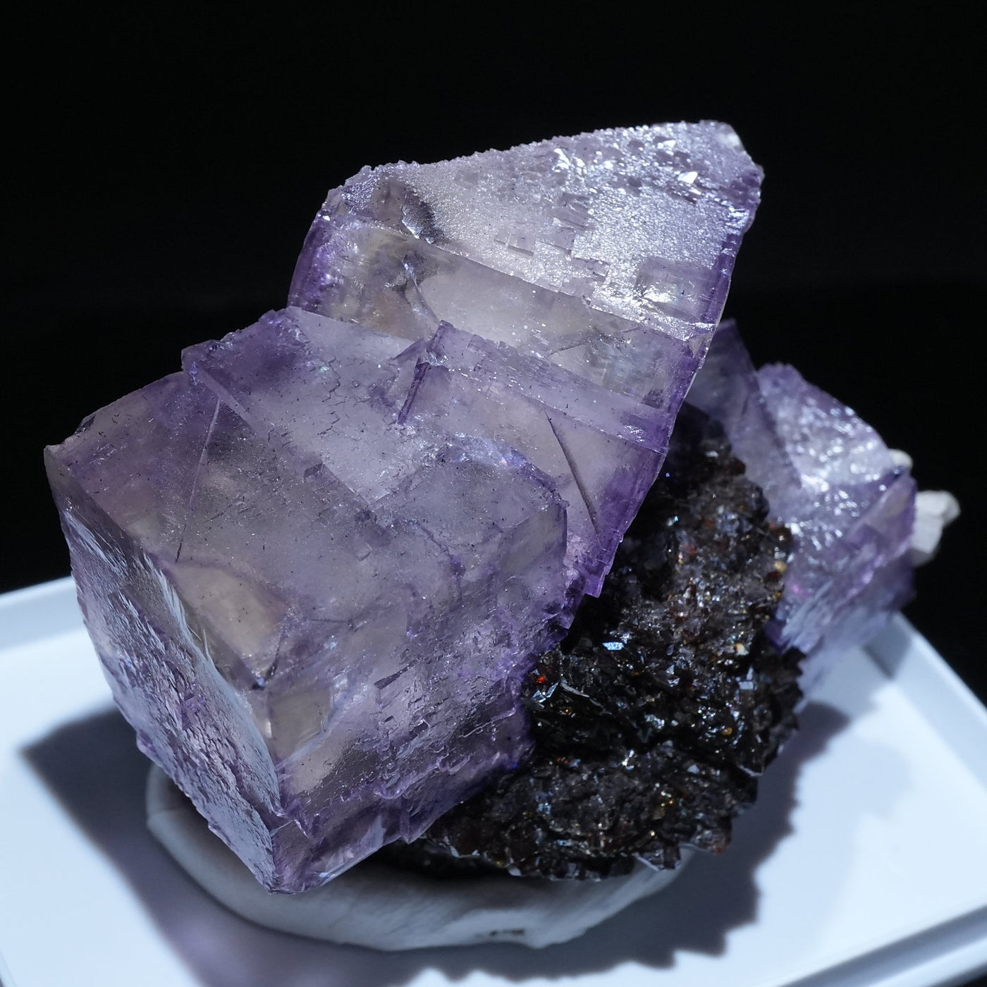 テネシー州エルムウッド鉱山産のフローライト・スファレライトです。光沢のあるスファレライトと淡いパープルのキューブ型のフローライトの共生がとても綺麗です。紫外線ライトを当てると蛍光します。