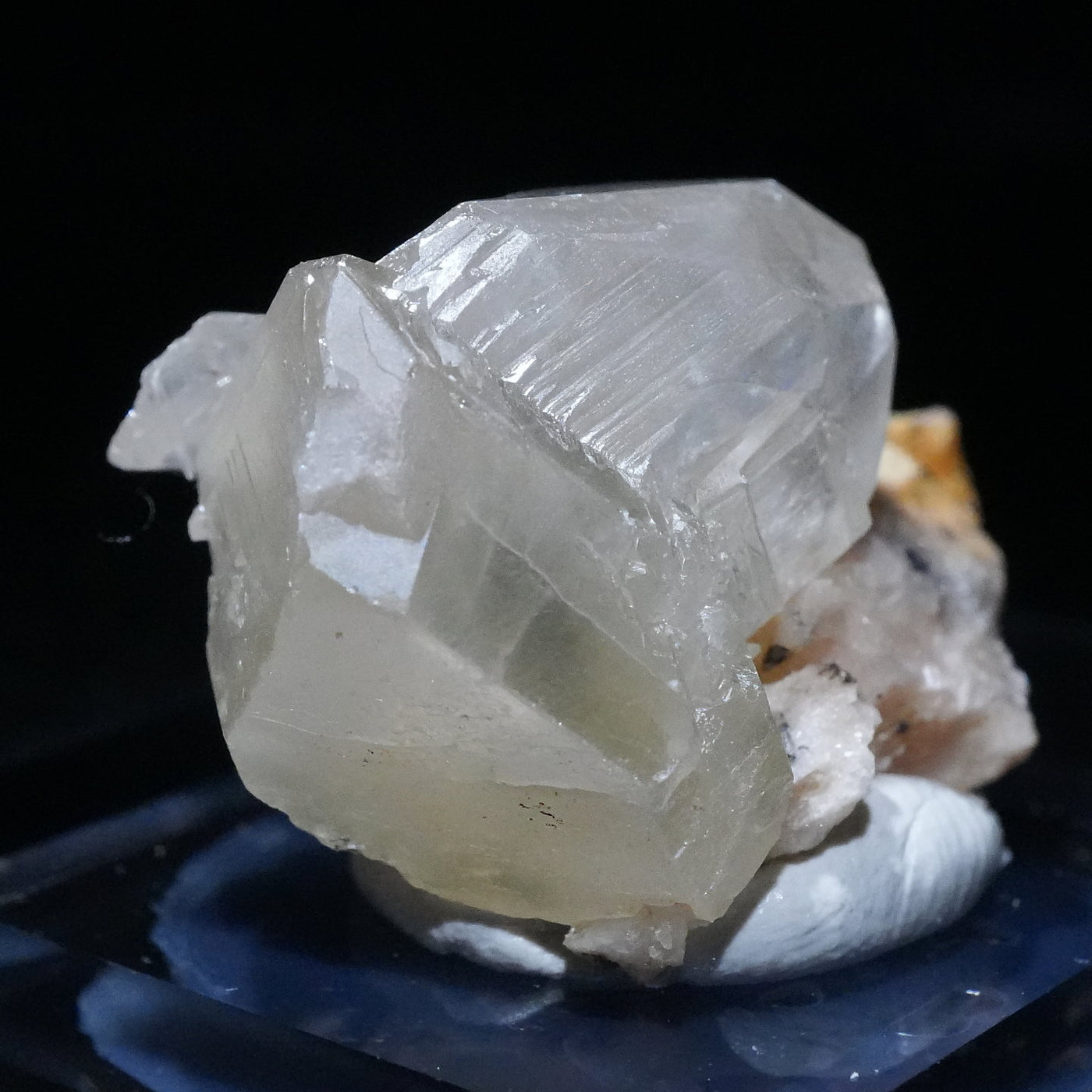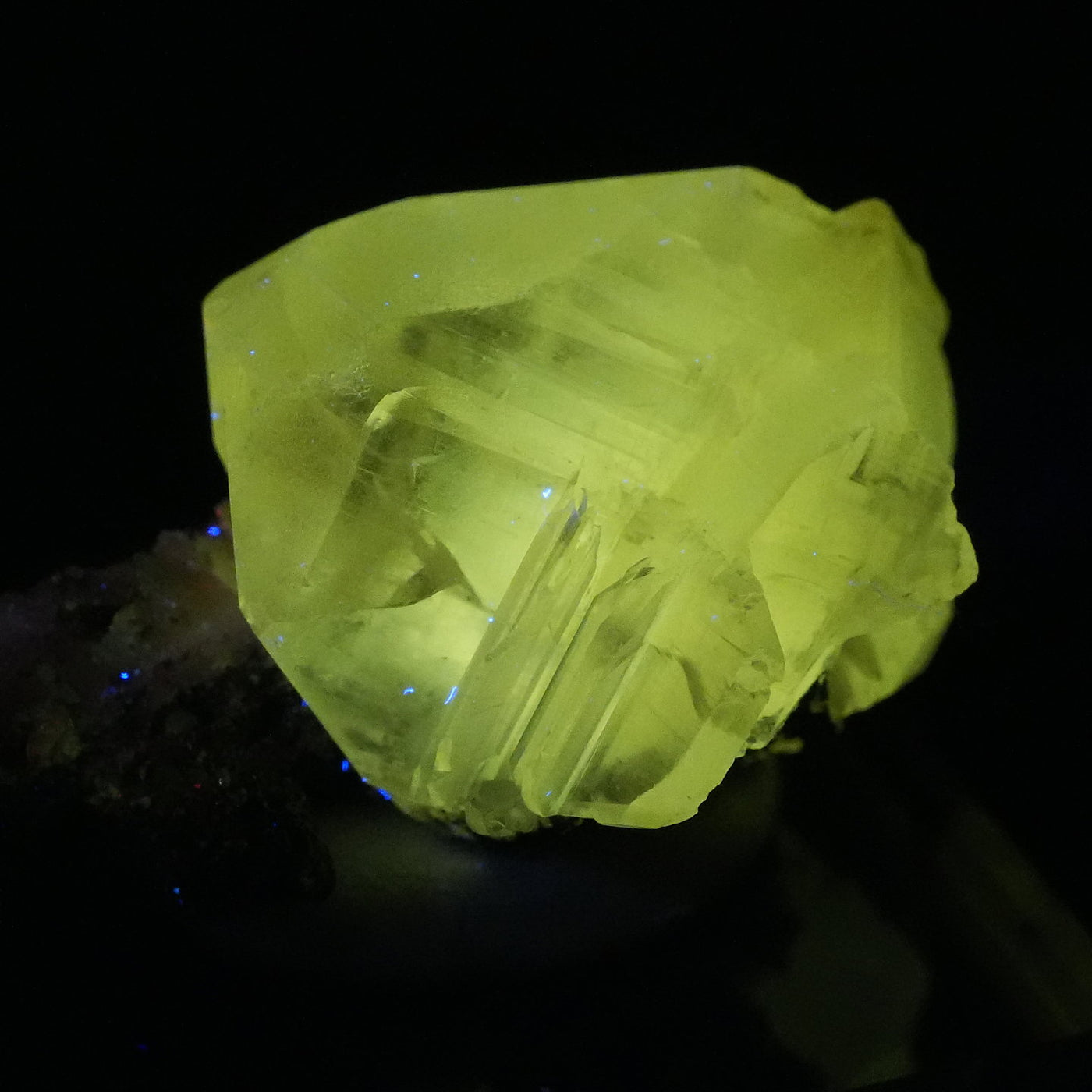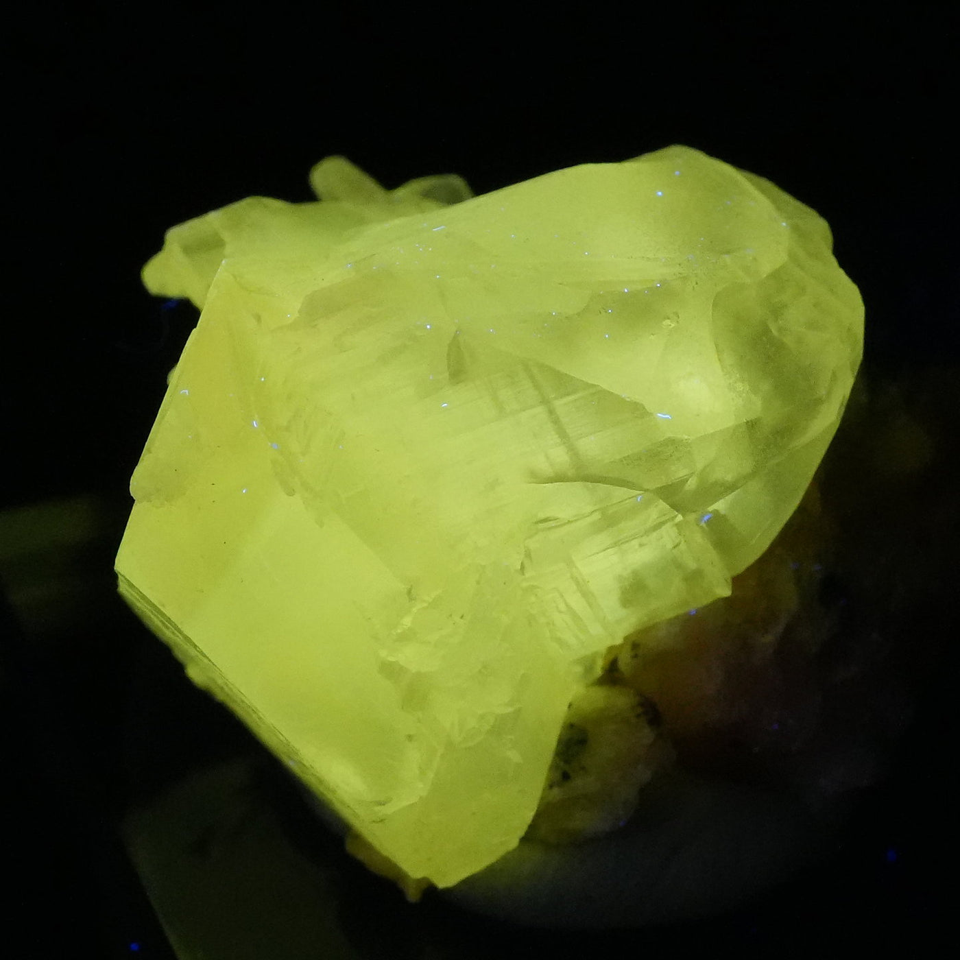 マットな質感の半透明な結晶です。紫外線ライトを当てると鮮やかなレモンイエローに蛍光するのが特徴です。