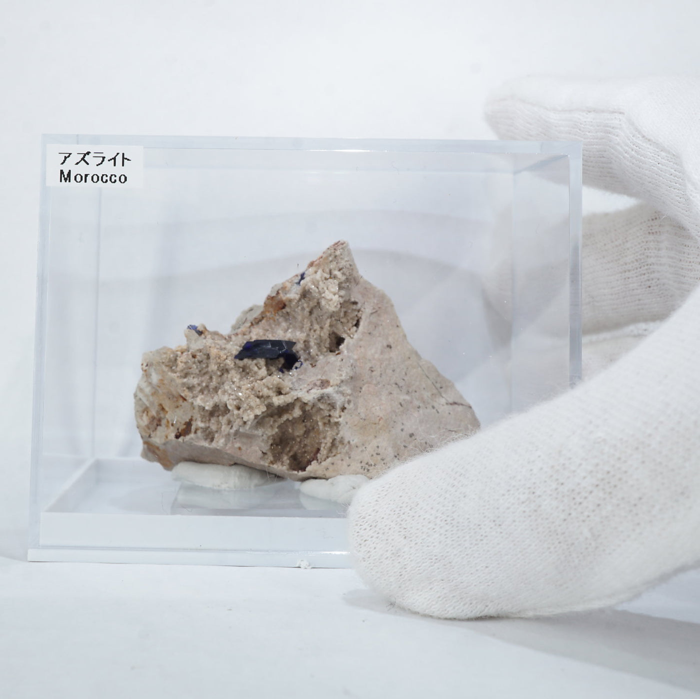 モロッコ産のアズライトです。光沢のある美しい藍色が魅力です。母岩とのバランスのよい良質な標本です。【産地】Kerrouchene, Khenifra, Morocco【サイズ】約59mm×37mm×29mm【ご注意】ライトを当てて撮影しております、またご覧になるモニター環境によっても差があり、色合いの違いを感じられる事が有ります。 商品は天然ゆえ写真では確認できない細かな傷や凹み等がある場合もございます。イメージの違いに関しての返品は受付出来かねますのでご了承ください。【その他】価格は税込表示です、送料は全国一律全て無料です。宅配便またはポスト投函便(ヤマト運輸ネコポス)にて配送いたします。発送方法の指定はできません。