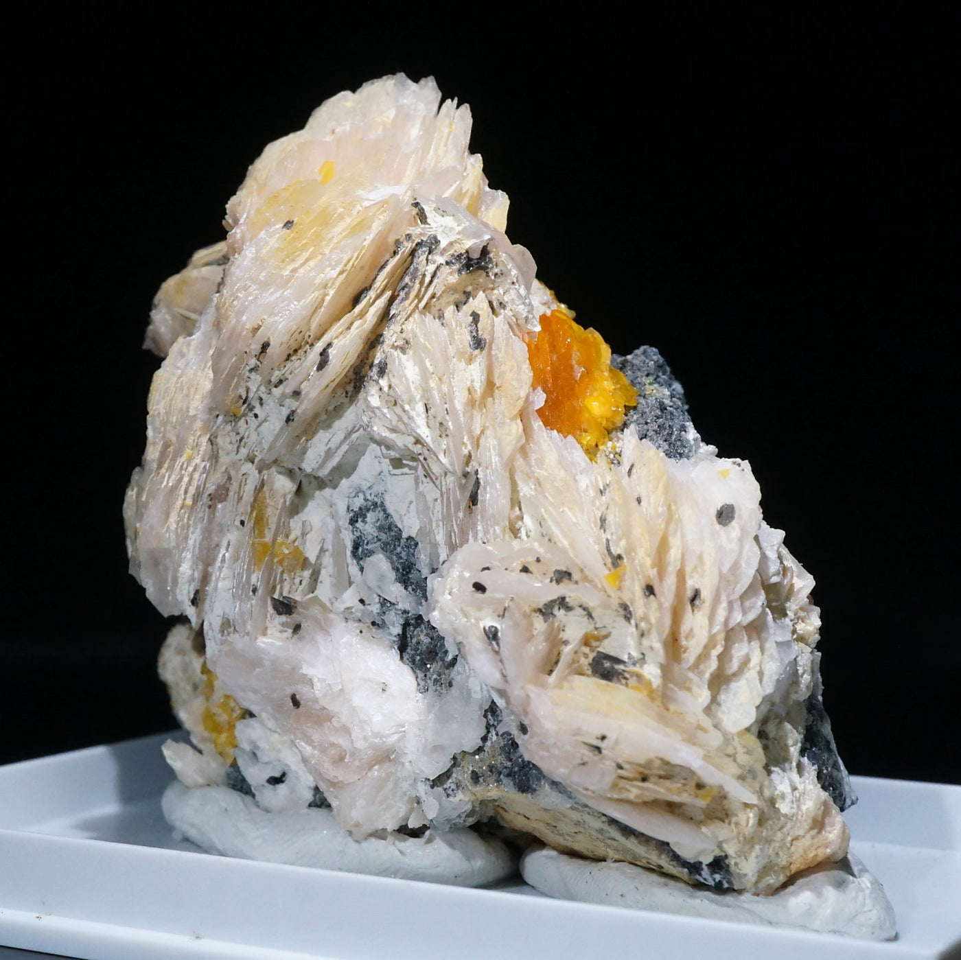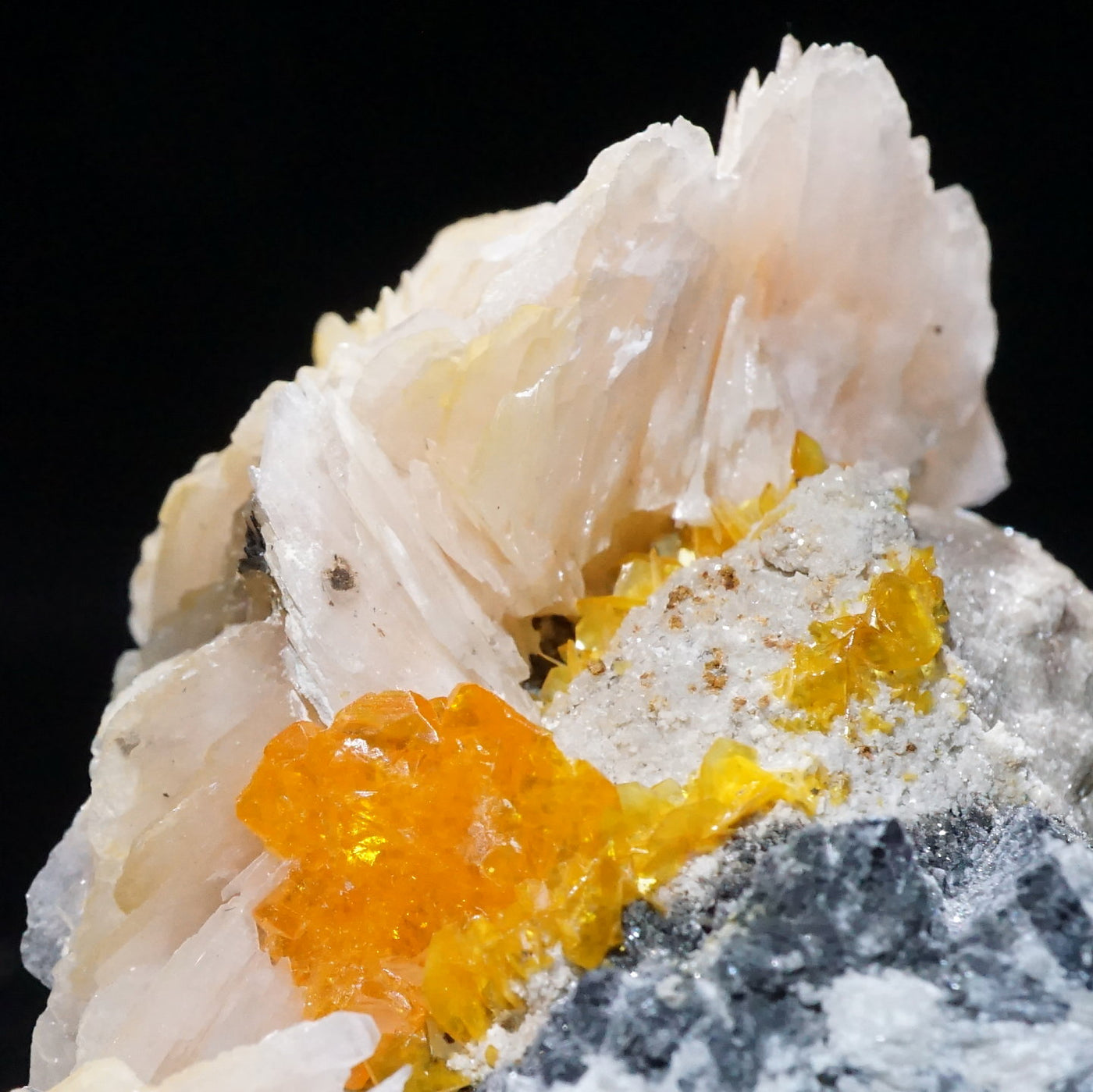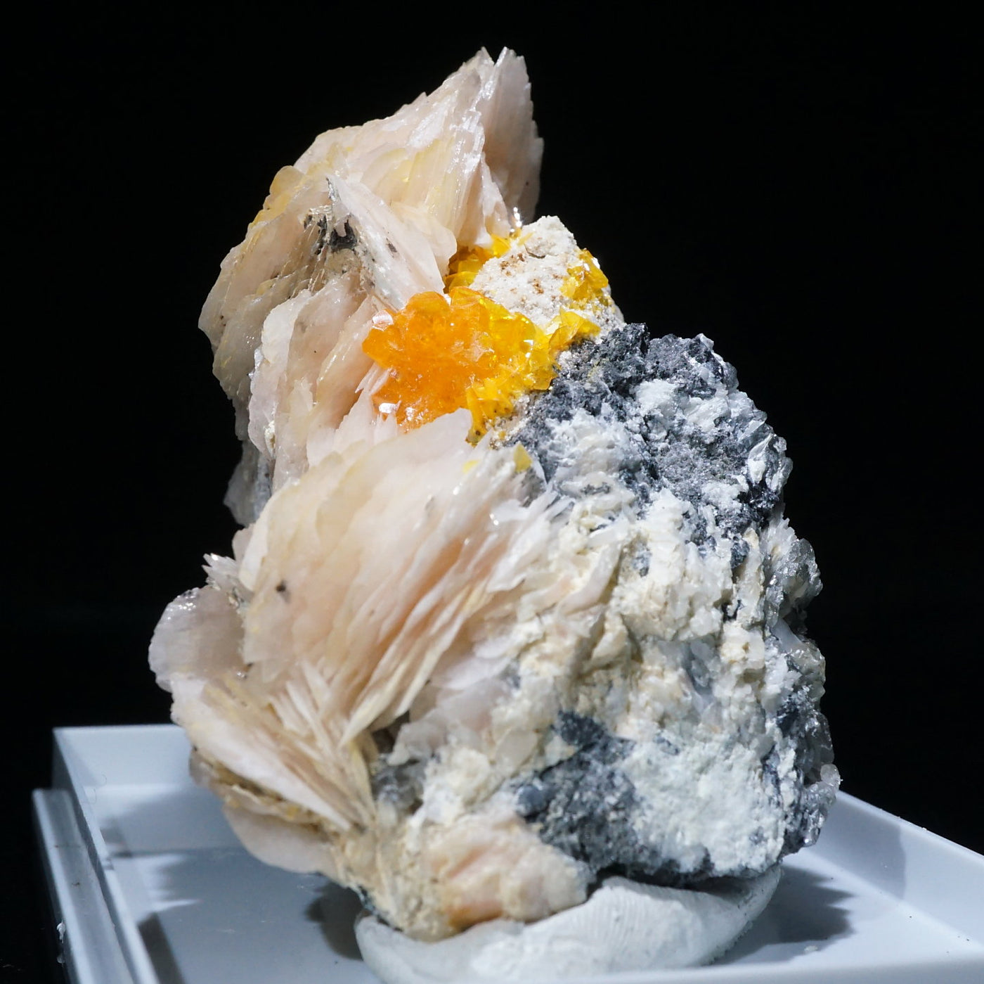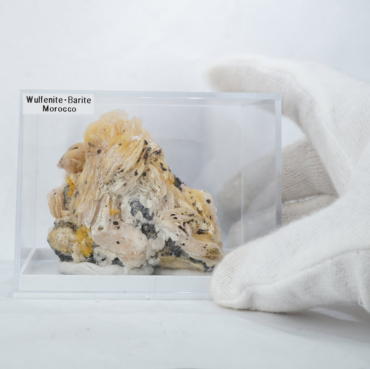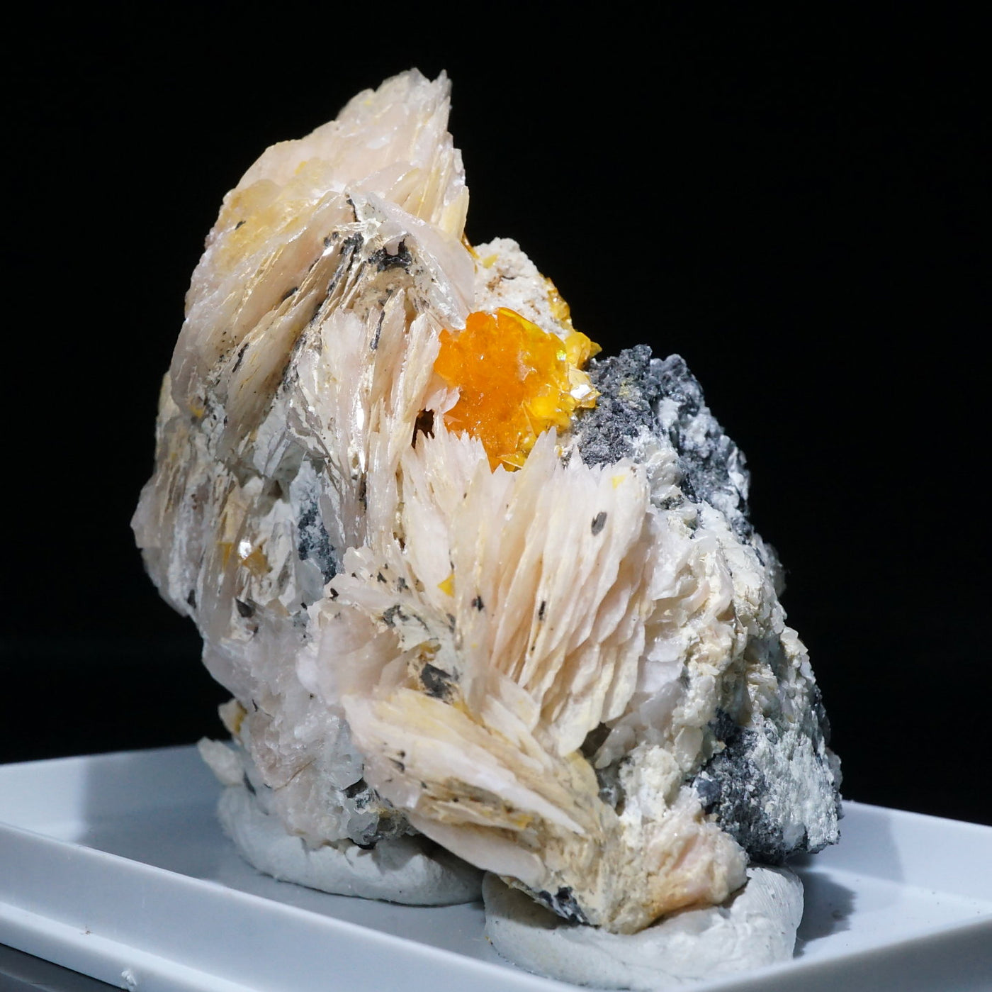 モロッコ産のWulfenite(ウルフェナイト) ・Bariteです。薄い板状の繊細な結晶と照りのある鮮やかなオレンジ色が特徴のウルフェナイトと存在感のあるバライトの共生鉱物です。