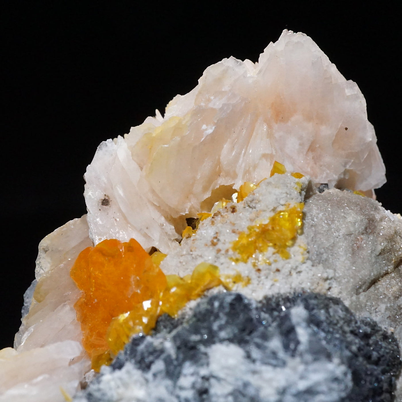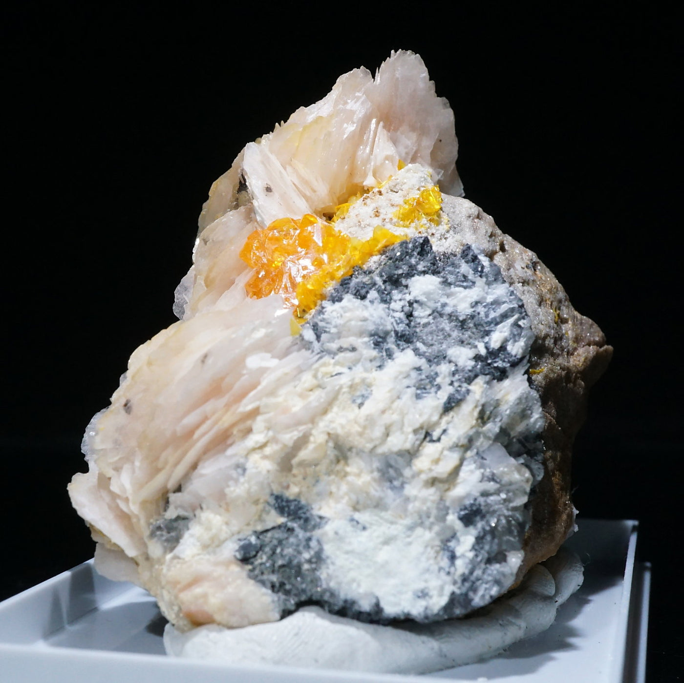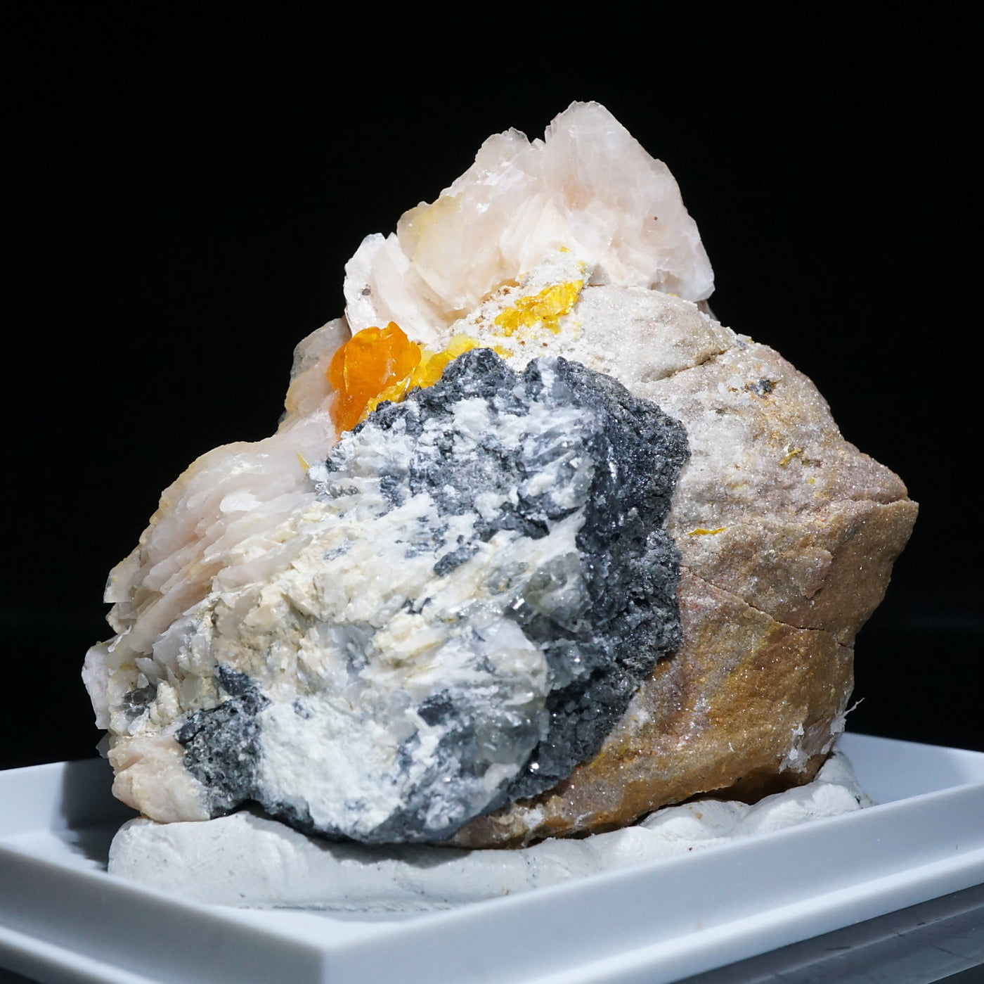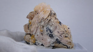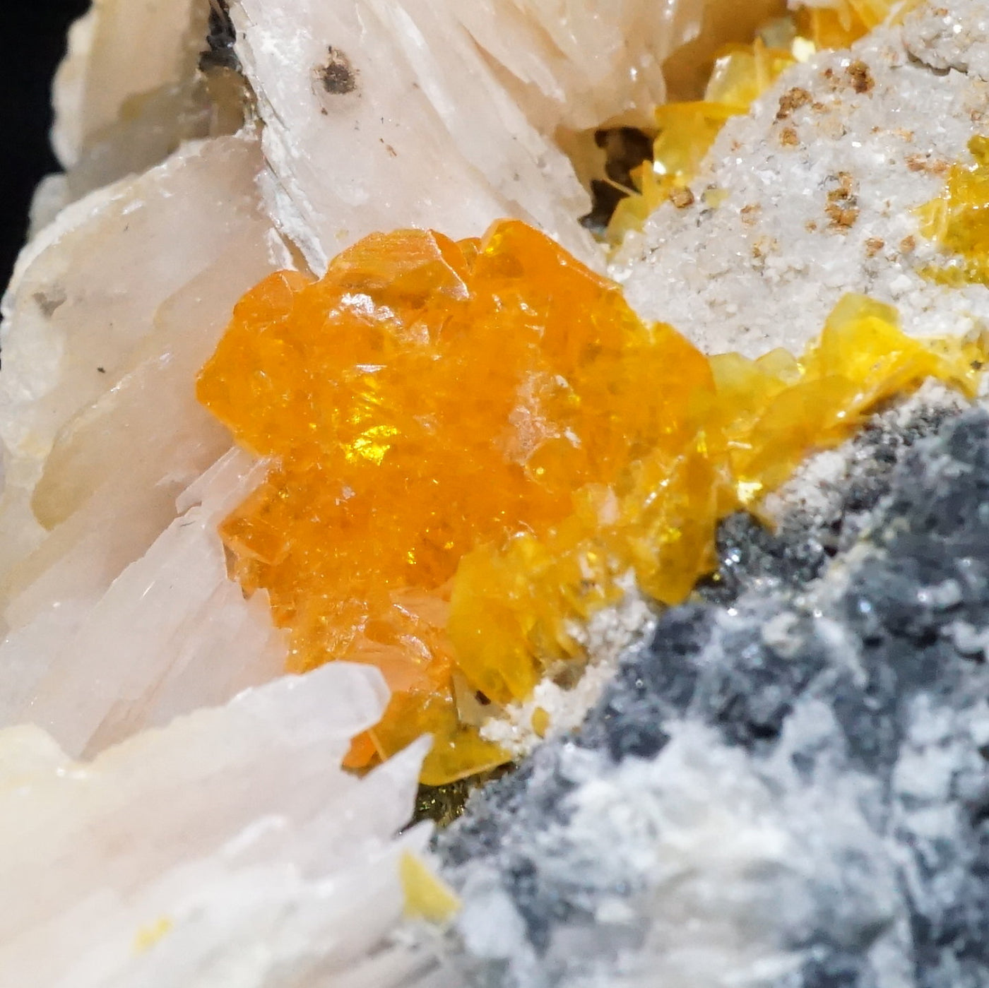 モロッコ産のWulfenite(ウルフェナイト) ・Bariteです。薄い板状の繊細な結晶と照りのある鮮やかなオレンジ色が特徴のウルフェナイトと存在感のあるバライトの共生鉱物です。
