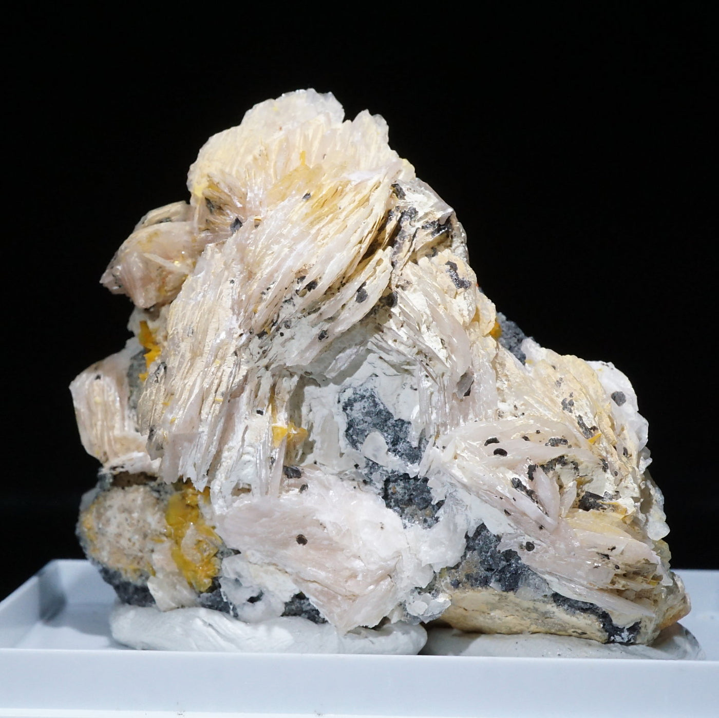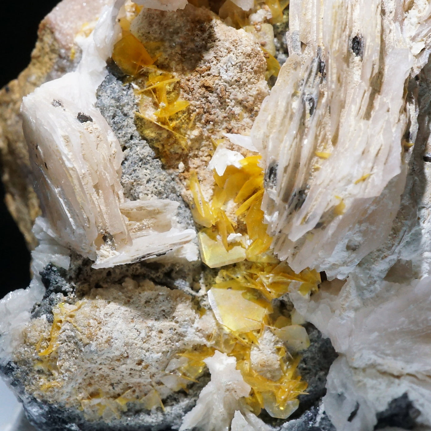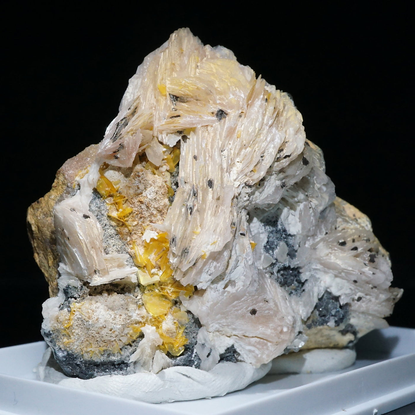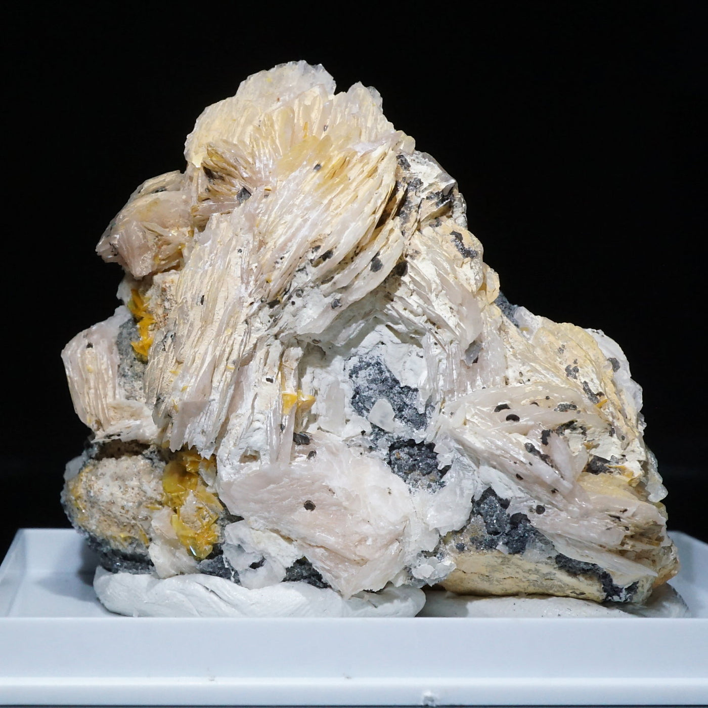 モロッコ産のWulfenite(ウルフェナイト) ・Bariteです。薄い板状の繊細な結晶と照りのある鮮やかなオレンジ色が特徴のウルフェナイトと存在感のあるバライトの共生鉱物です。