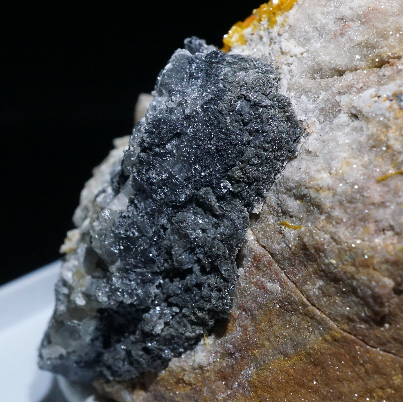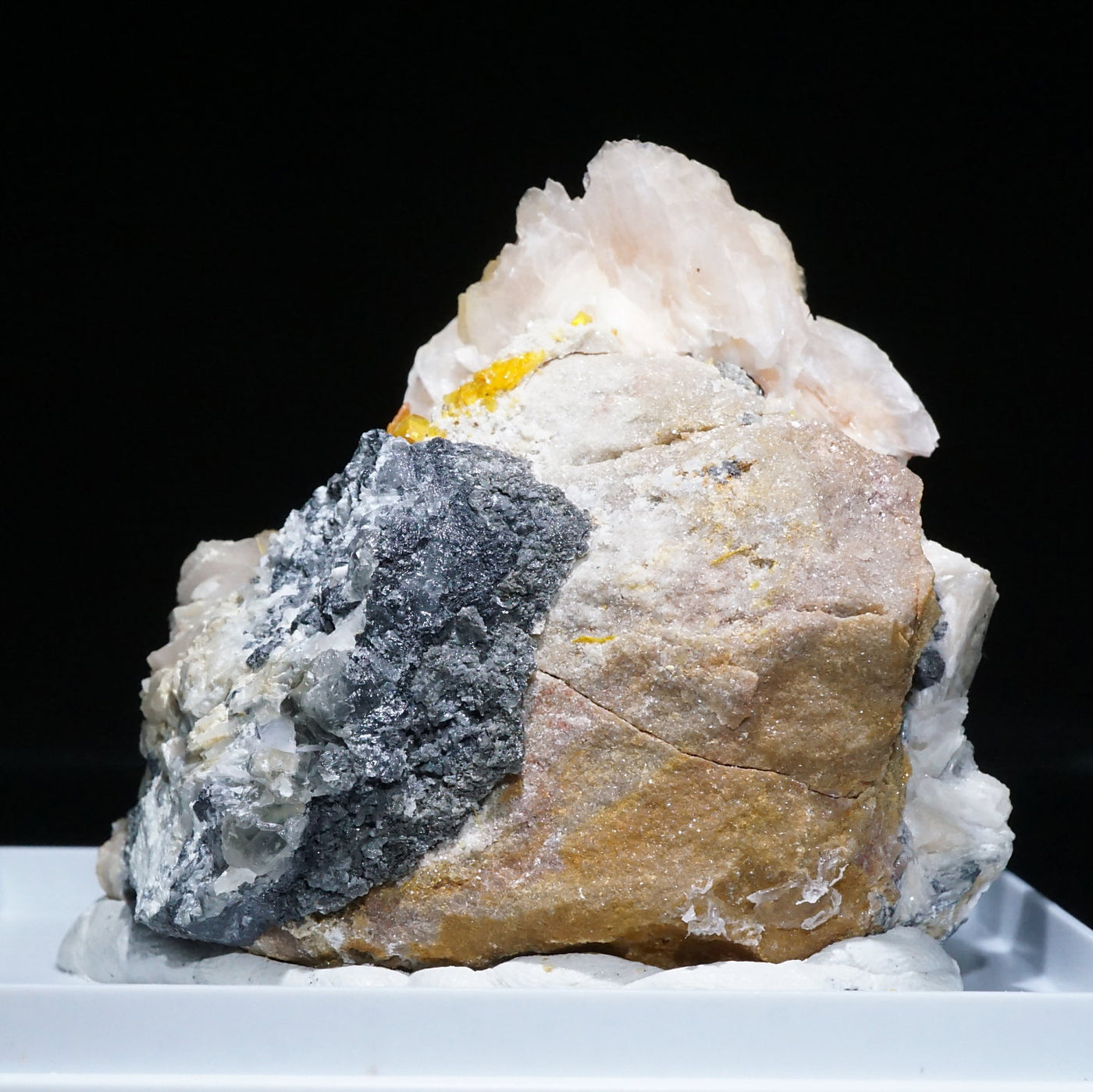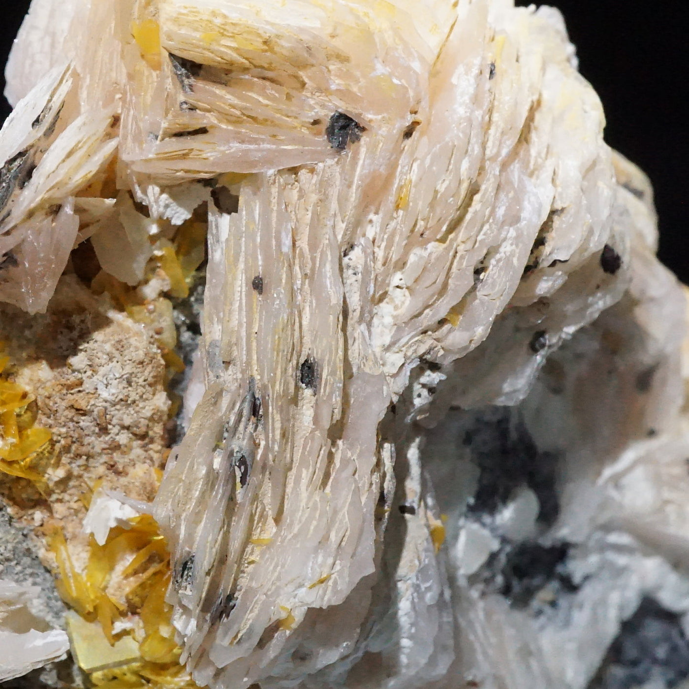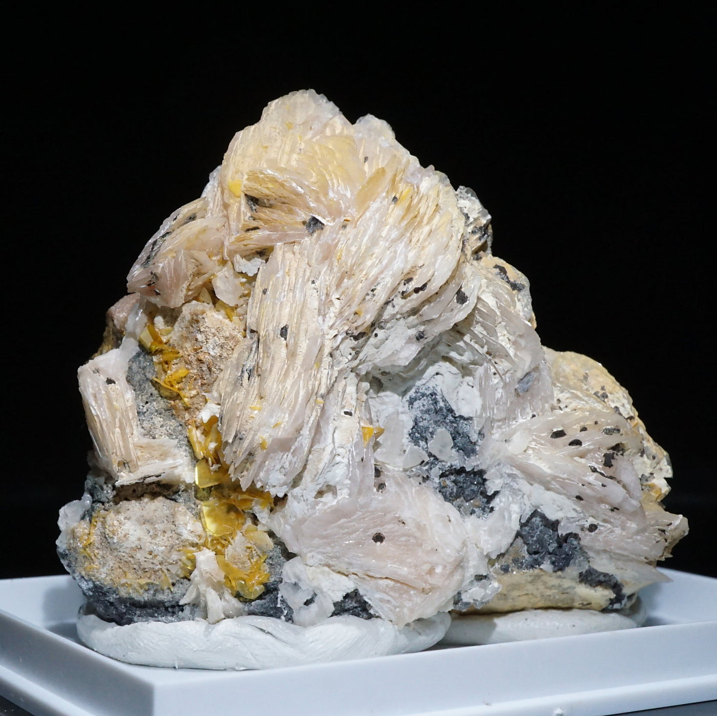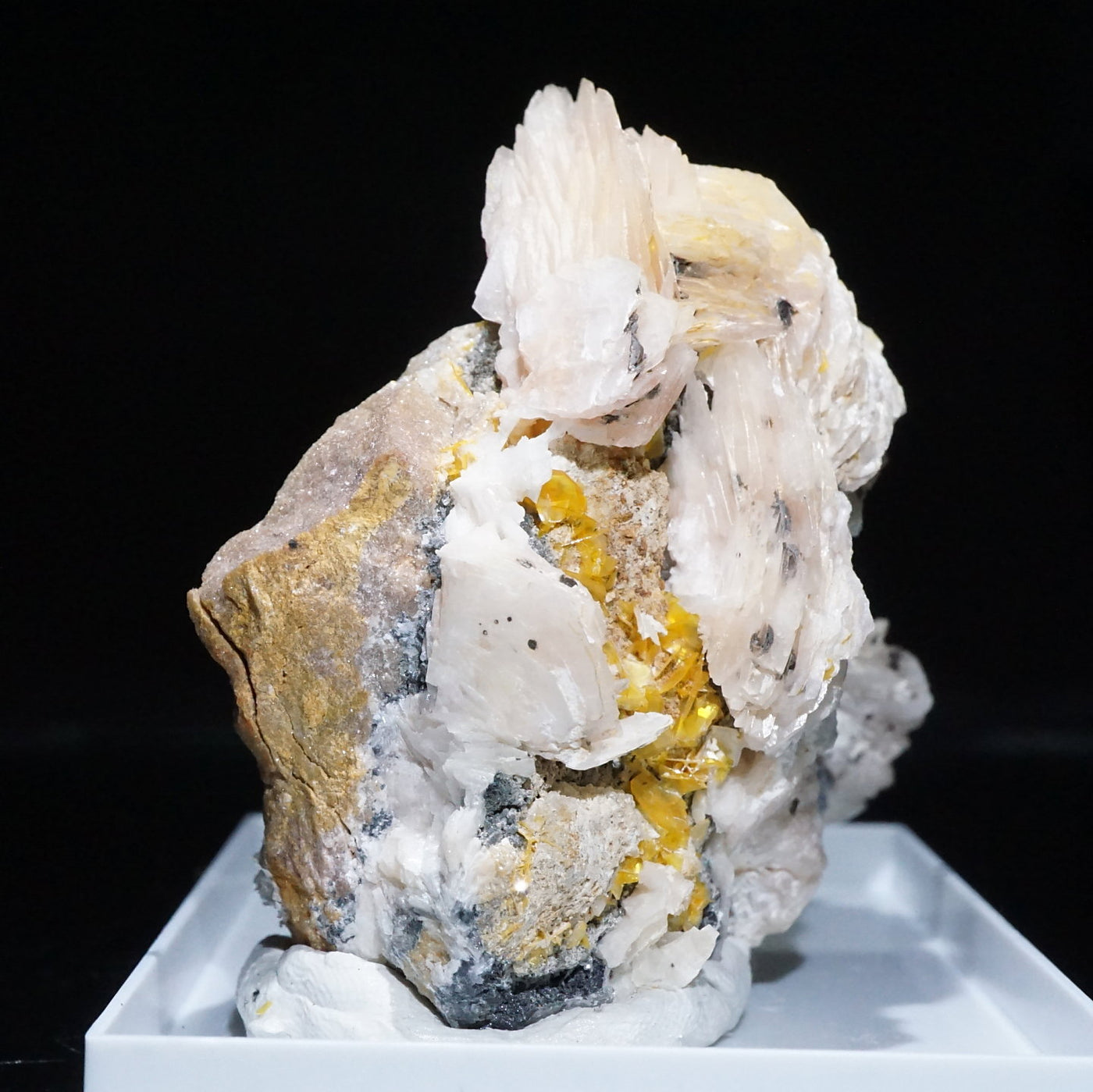モロッコ産のWulfenite(ウルフェナイト) ・Bariteです。薄い板状の繊細な結晶と照りのある鮮やかなオレンジ色が特徴のウルフェナイトと存在感のあるバライトの共生鉱物です。