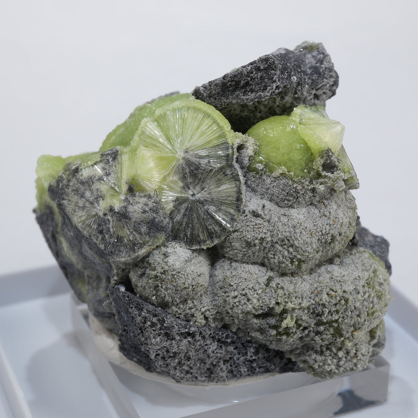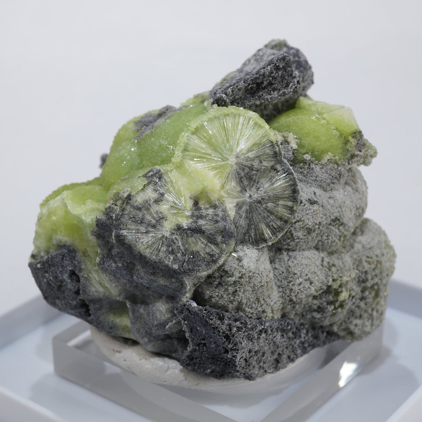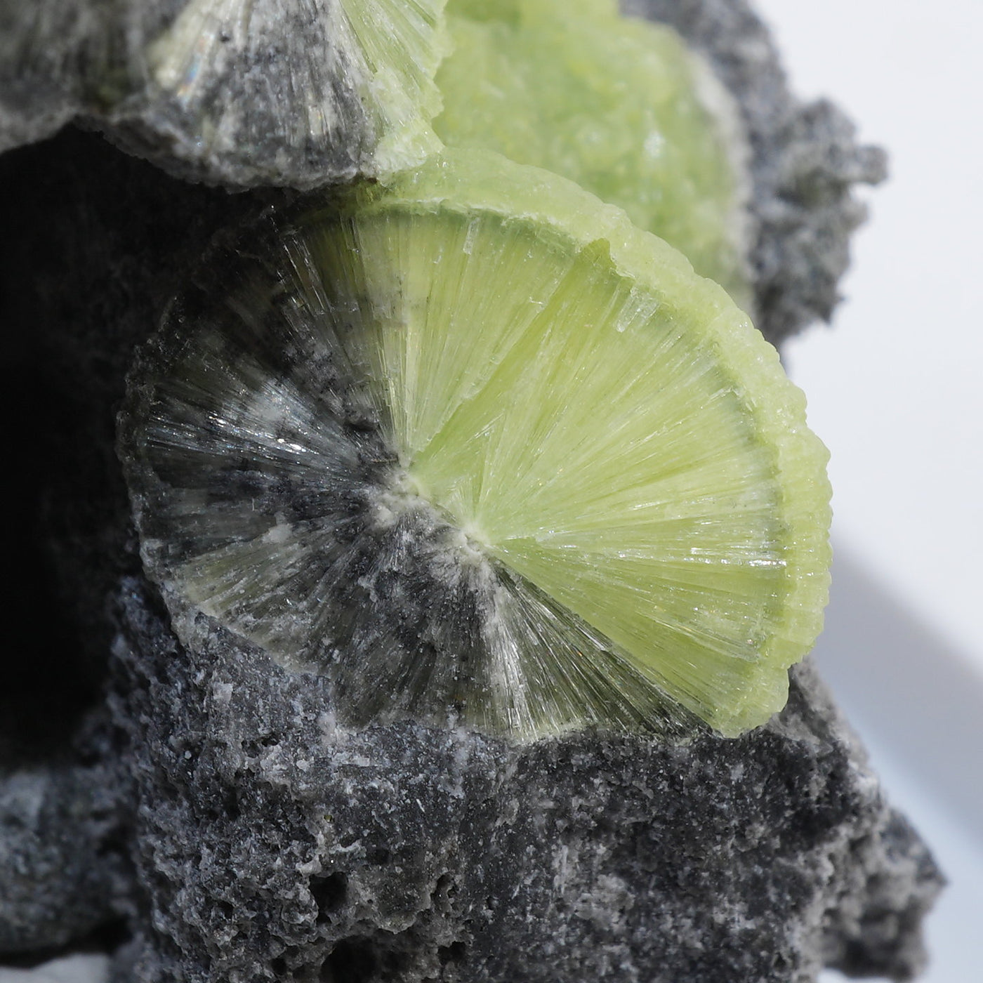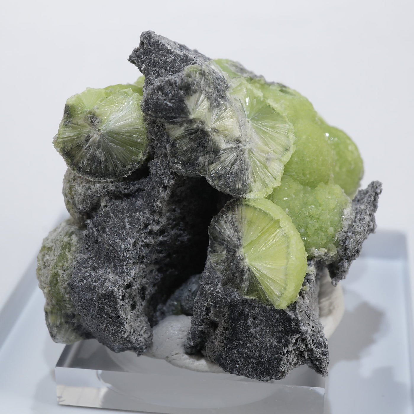鮮やかな黄緑色の球状の結晶が印象的な標本です。結晶の断面は放射状に広がっているのが特徴です。