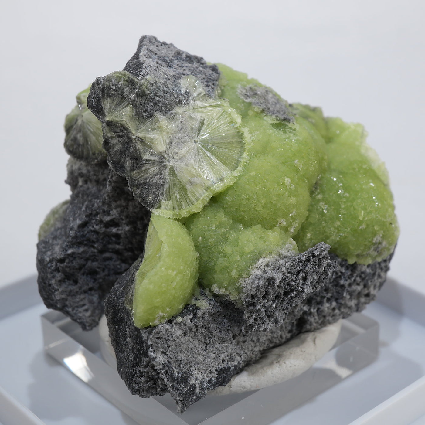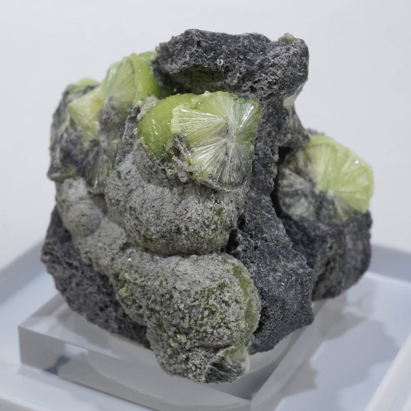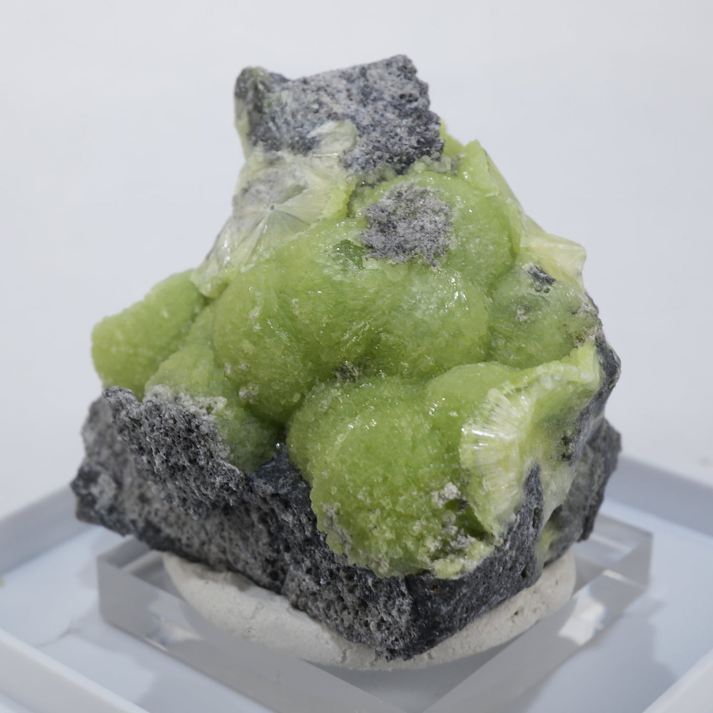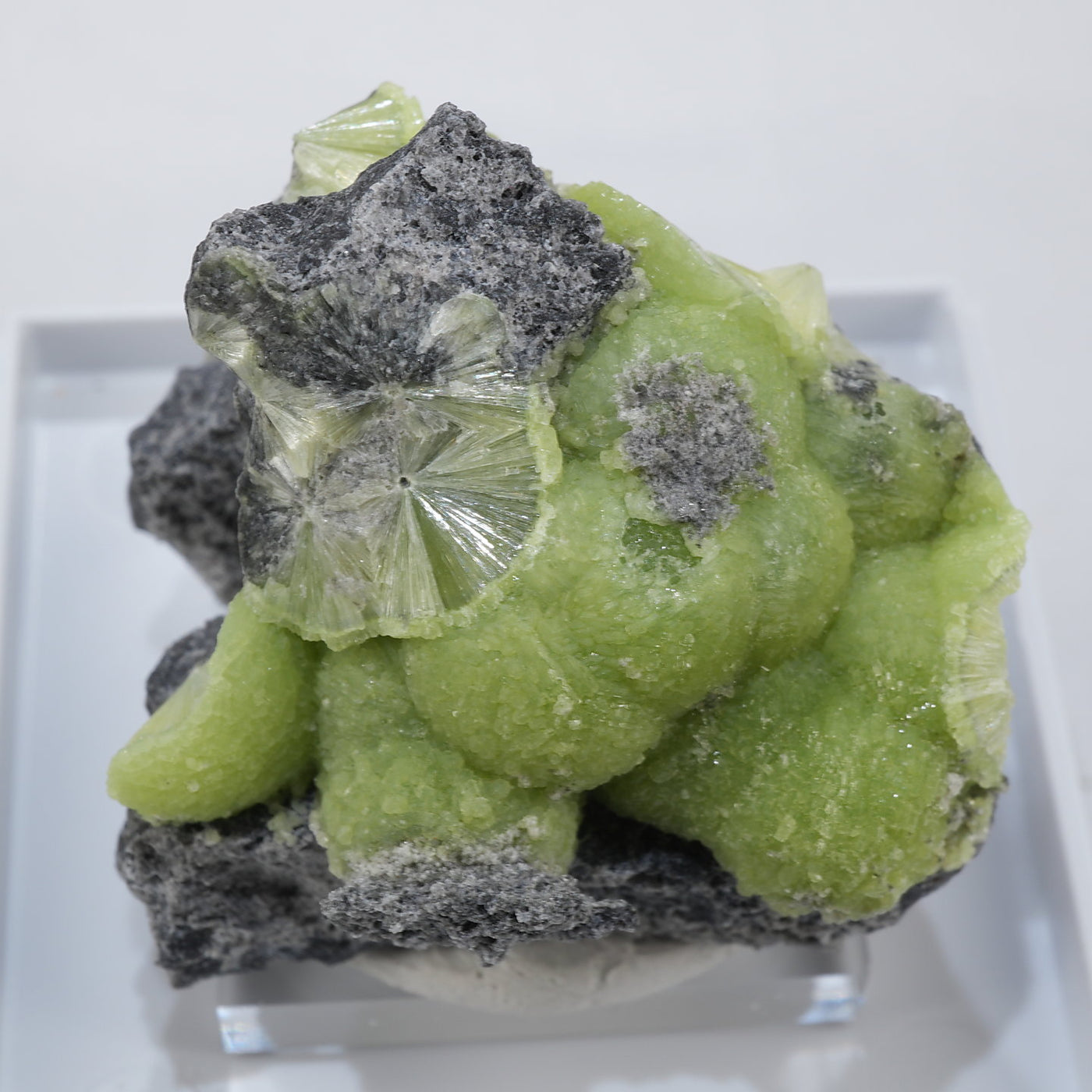 鮮やかな黄緑色の球状の結晶が印象的な標本です。結晶の断面は放射状に広がっているのが特徴です。